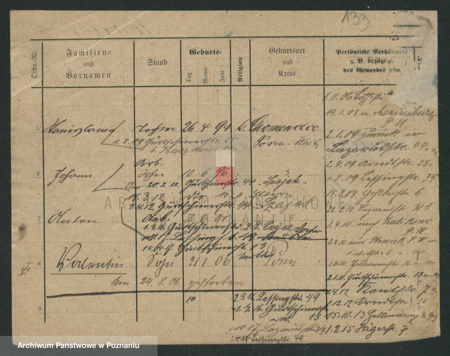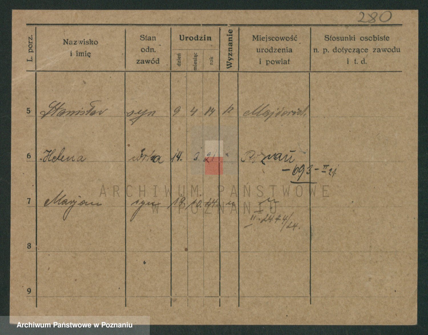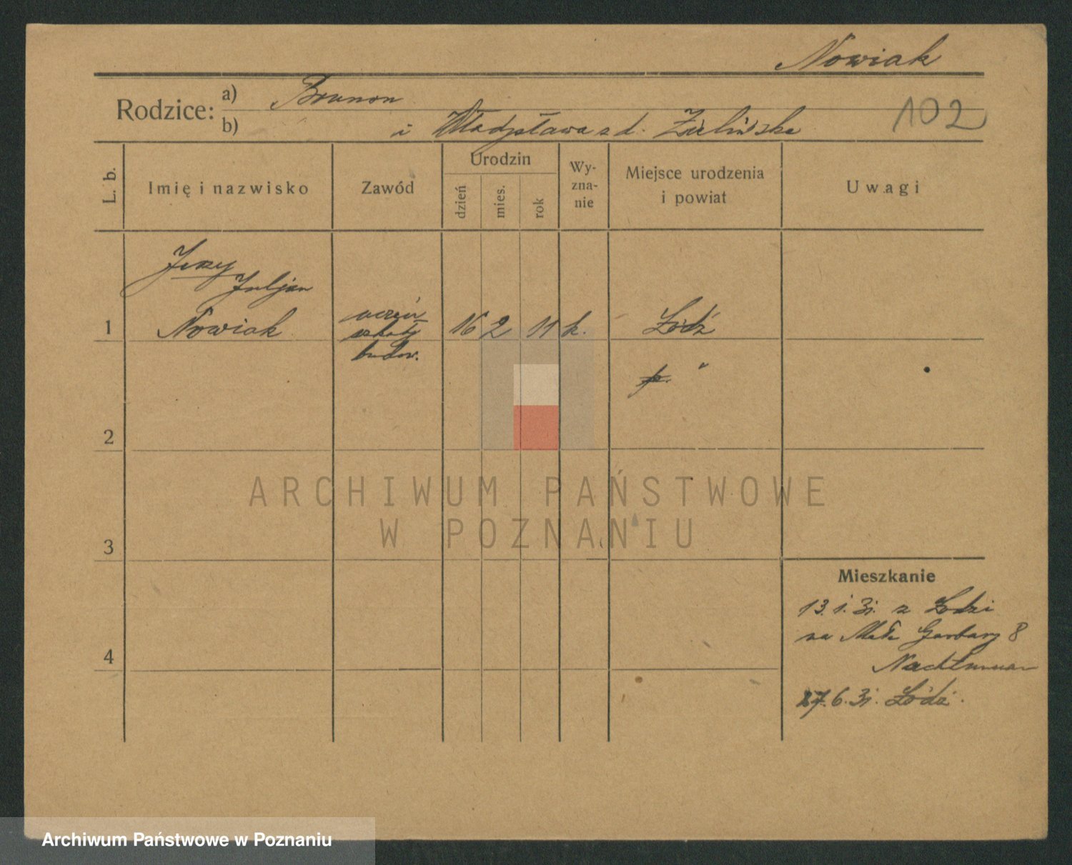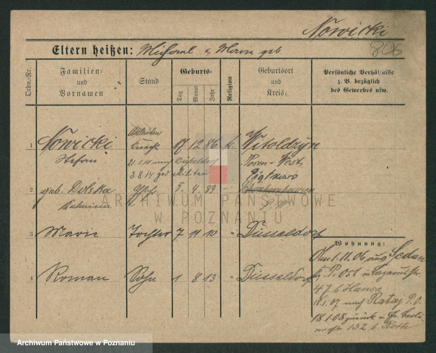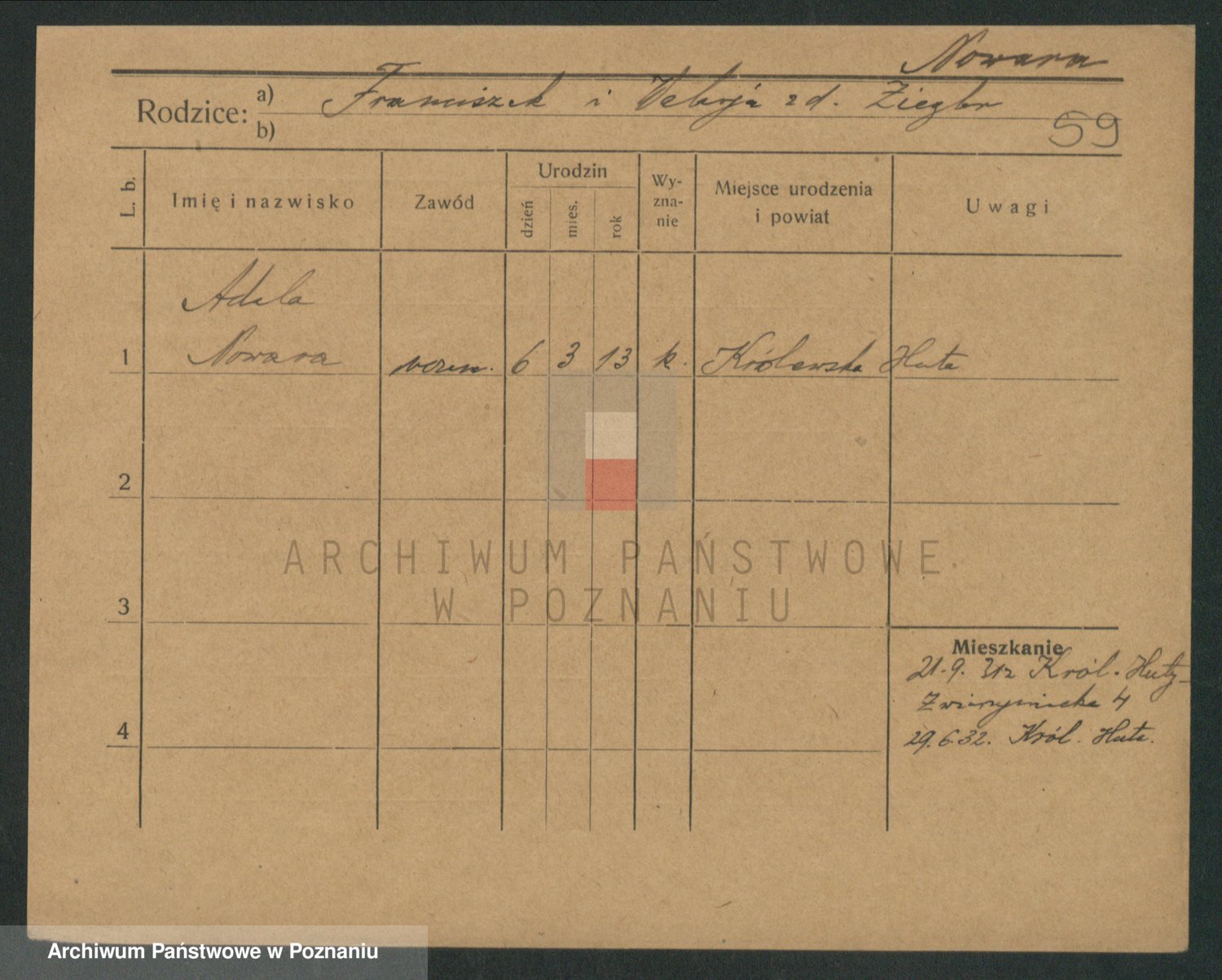 Podgląd karty osobowej dostępny jest po kliknięciu na nazwisko lub ikonkę karty. Można dokonywać powiększenia (ikony na górze) lub przechodzić między kolejnymi skanami (strzałki po bokach).