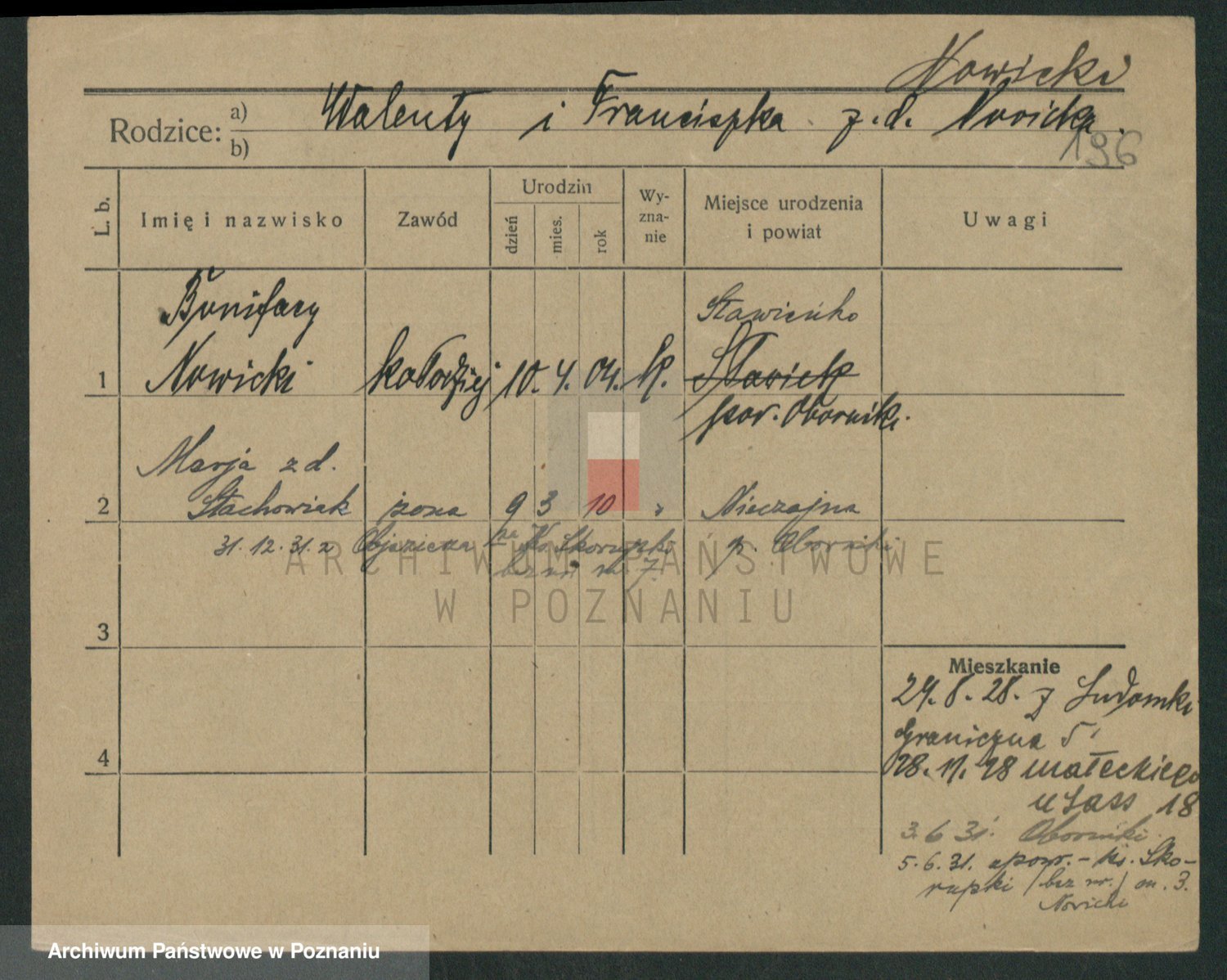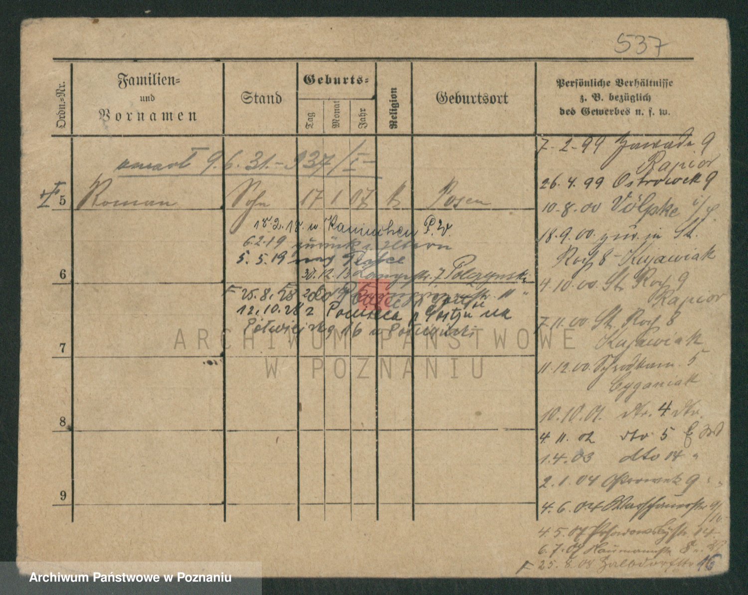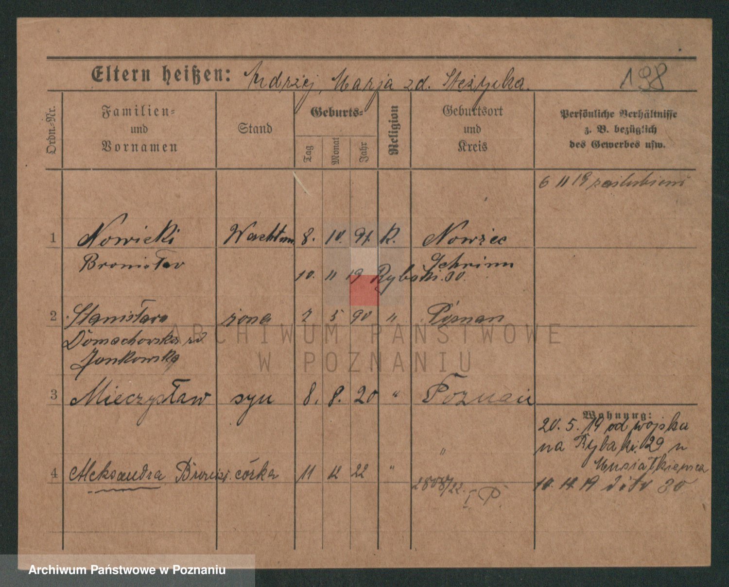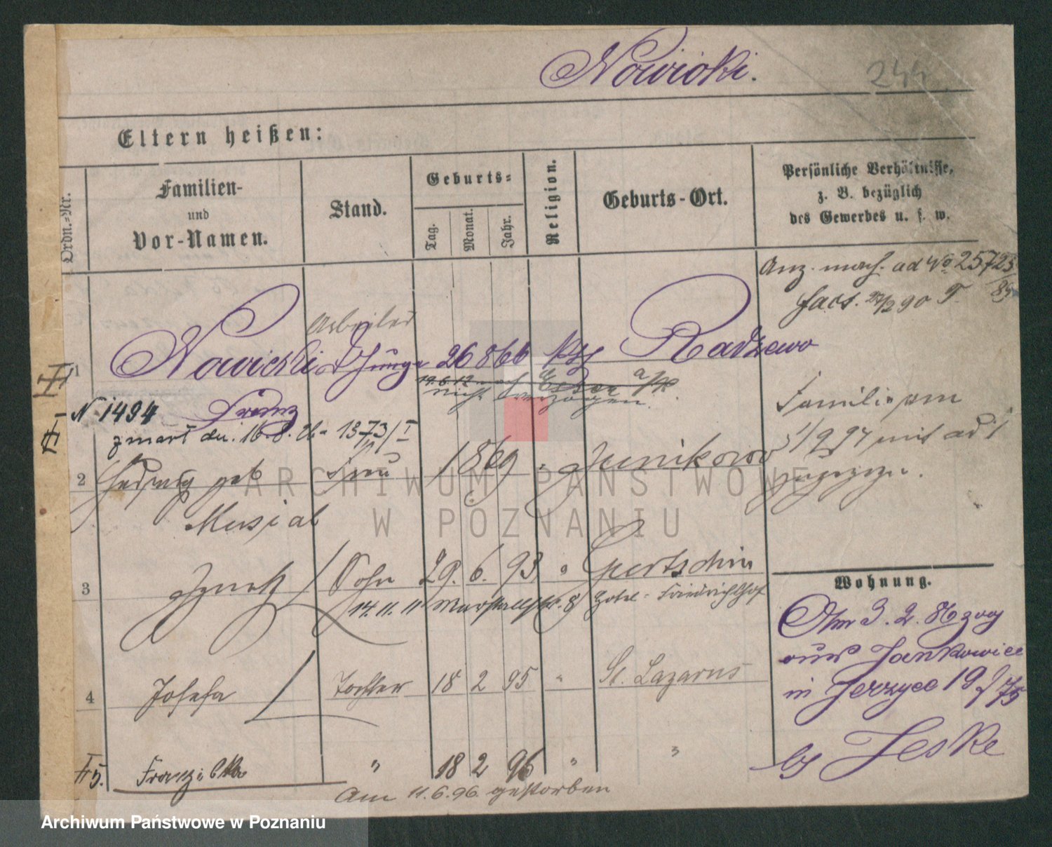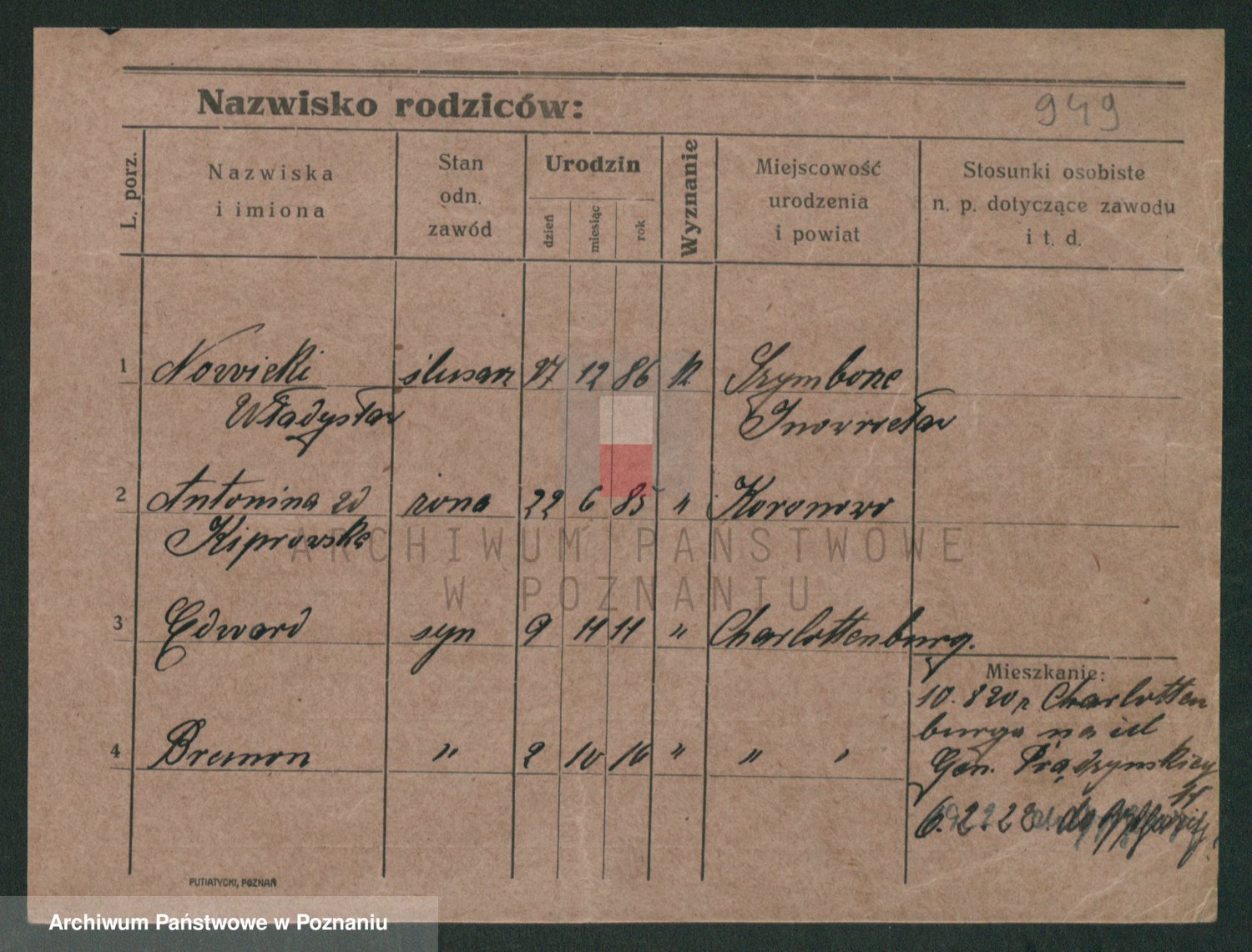 Podgląd karty osobowej dostępny jest po kliknięciu na nazwisko lub ikonkę karty. Można dokonywać powiększenia (ikony na górze) lub przechodzić między kolejnymi skanami (strzałki po bokach).
