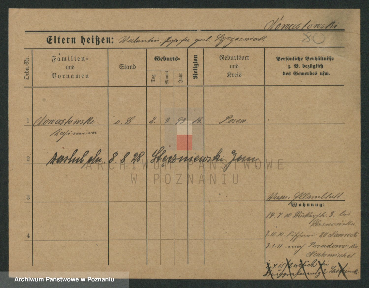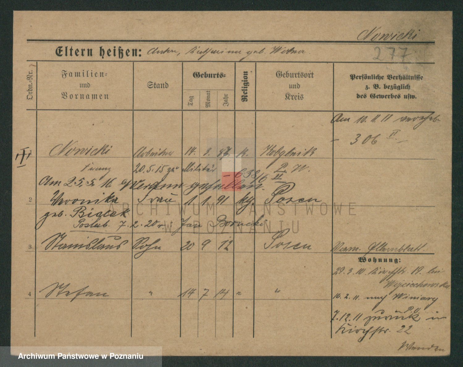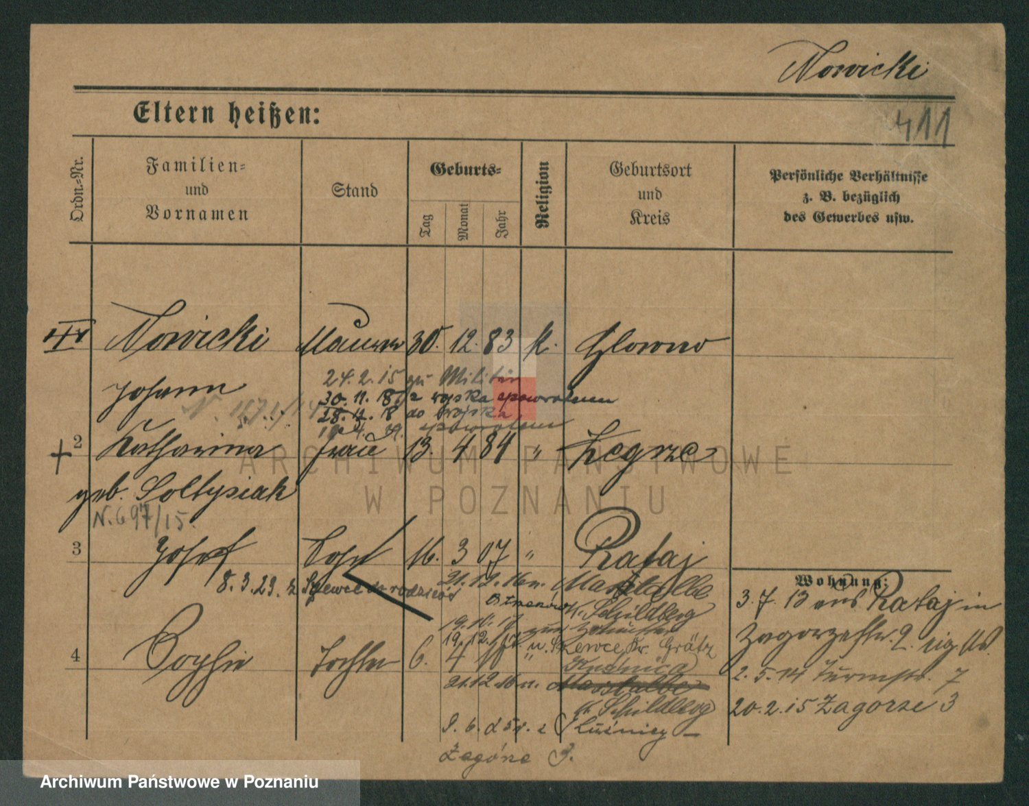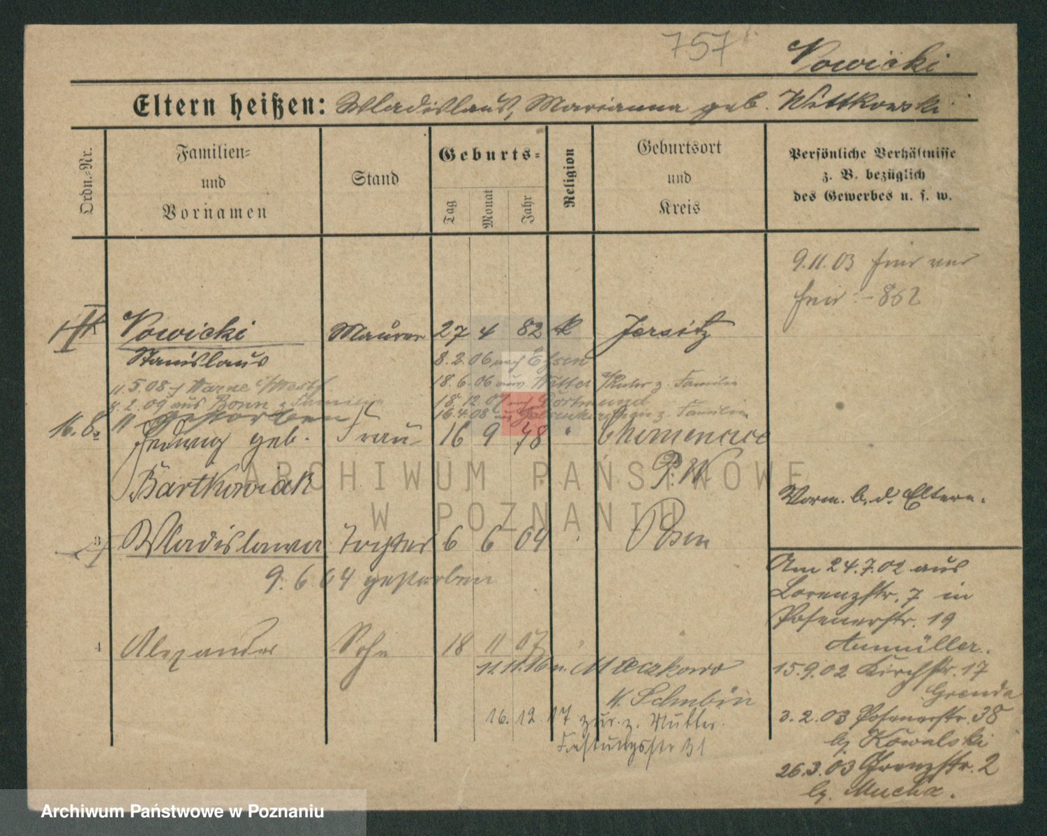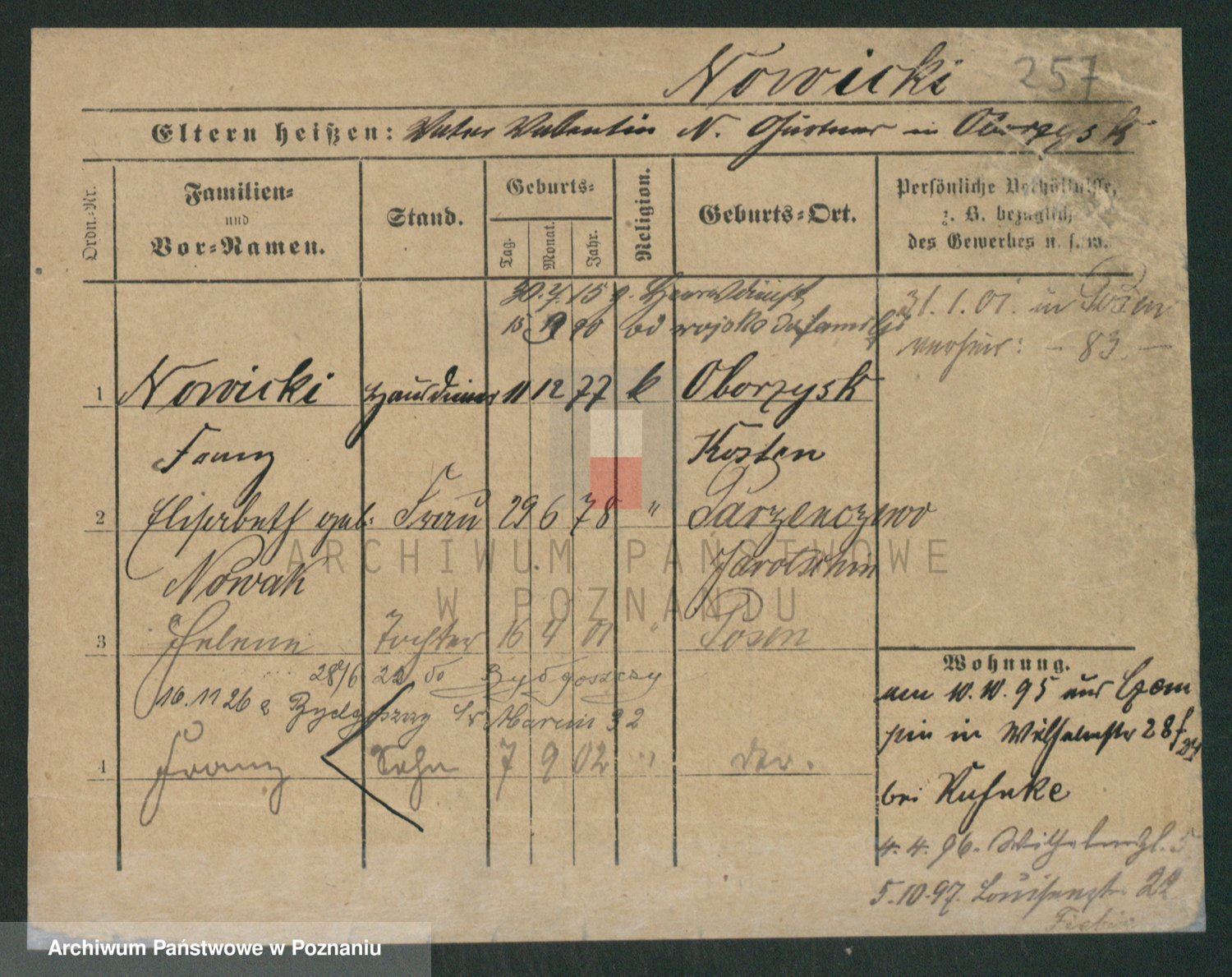 Podgląd karty osobowej dostępny jest po kliknięciu na nazwisko lub ikonkę karty. Można dokonywać powiększenia (ikony na górze) lub przechodzić między kolejnymi skanami (strzałki po bokach).