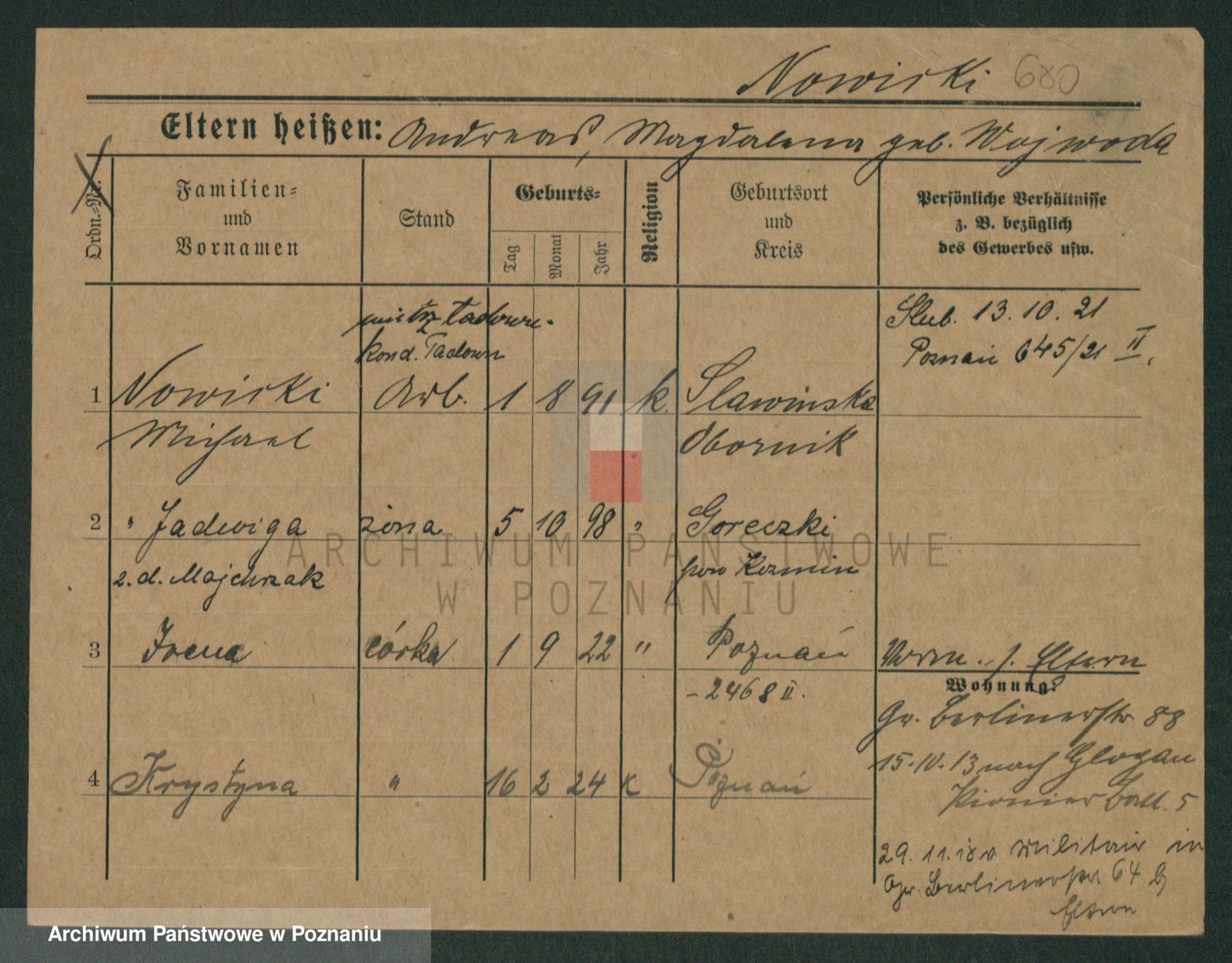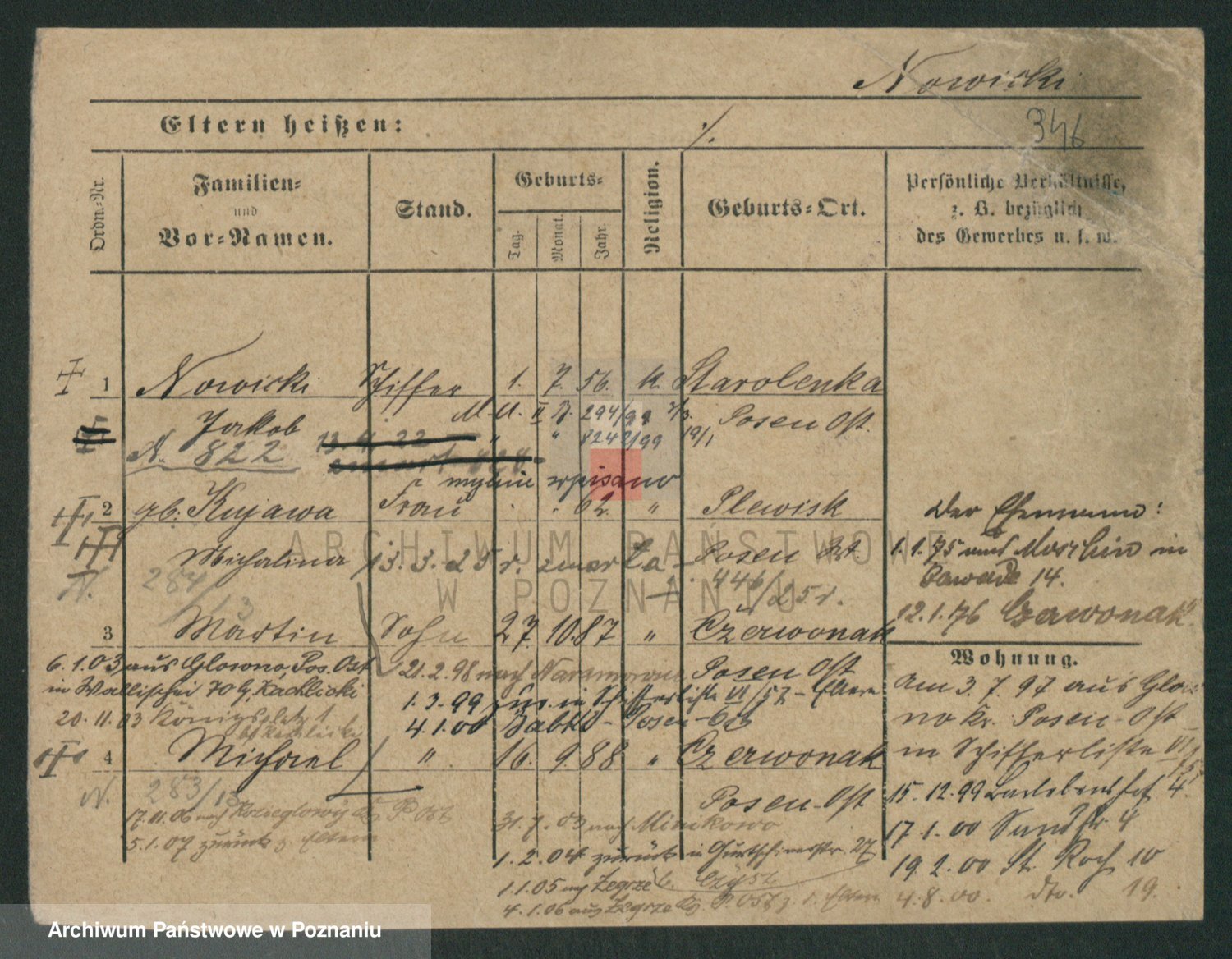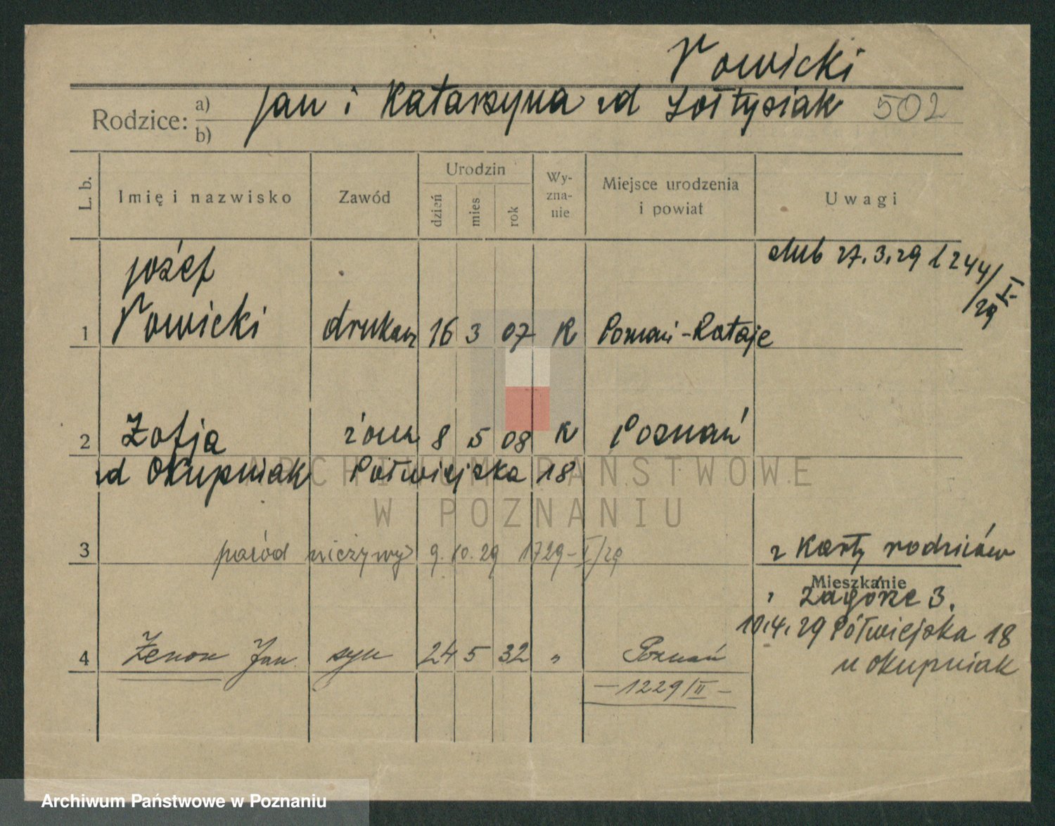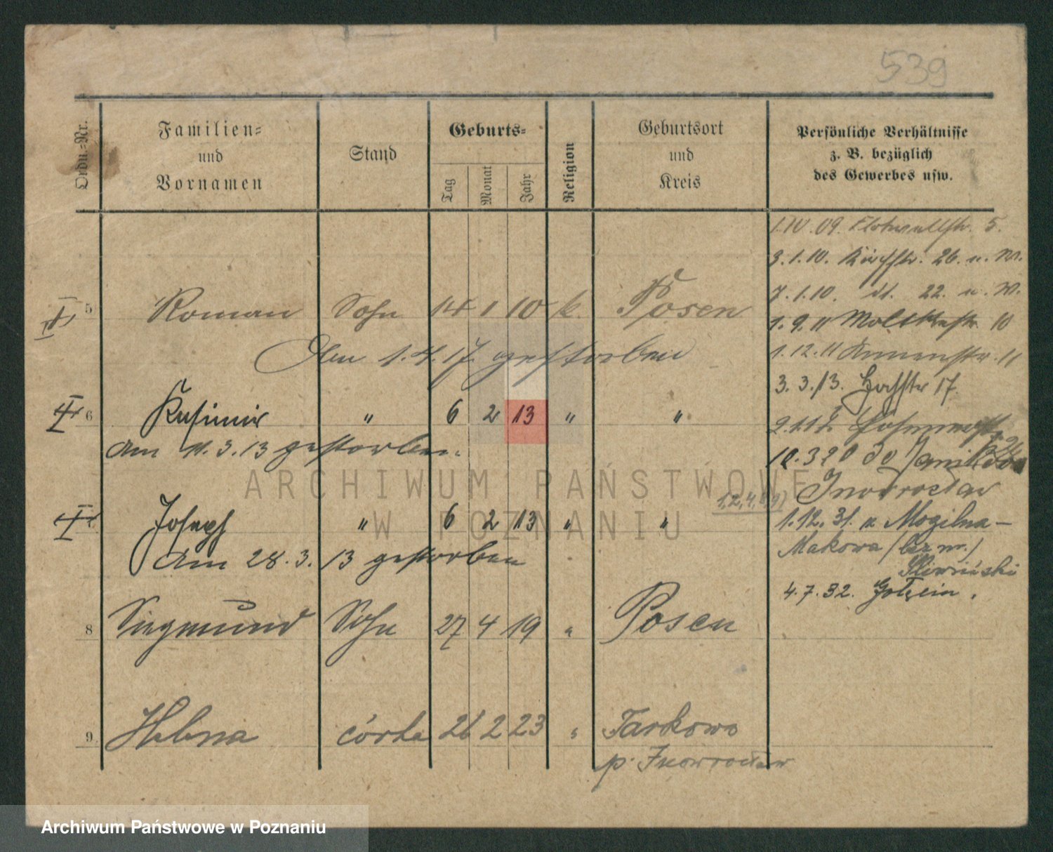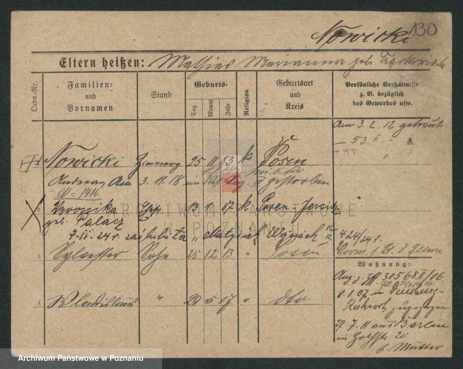 Podgląd karty osobowej dostępny jest po kliknięciu na nazwisko lub ikonkę karty. Można dokonywać powiększenia (ikony na górze) lub przechodzić między kolejnymi skanami (strzałki po bokach).