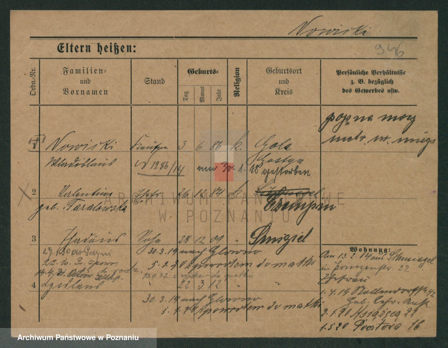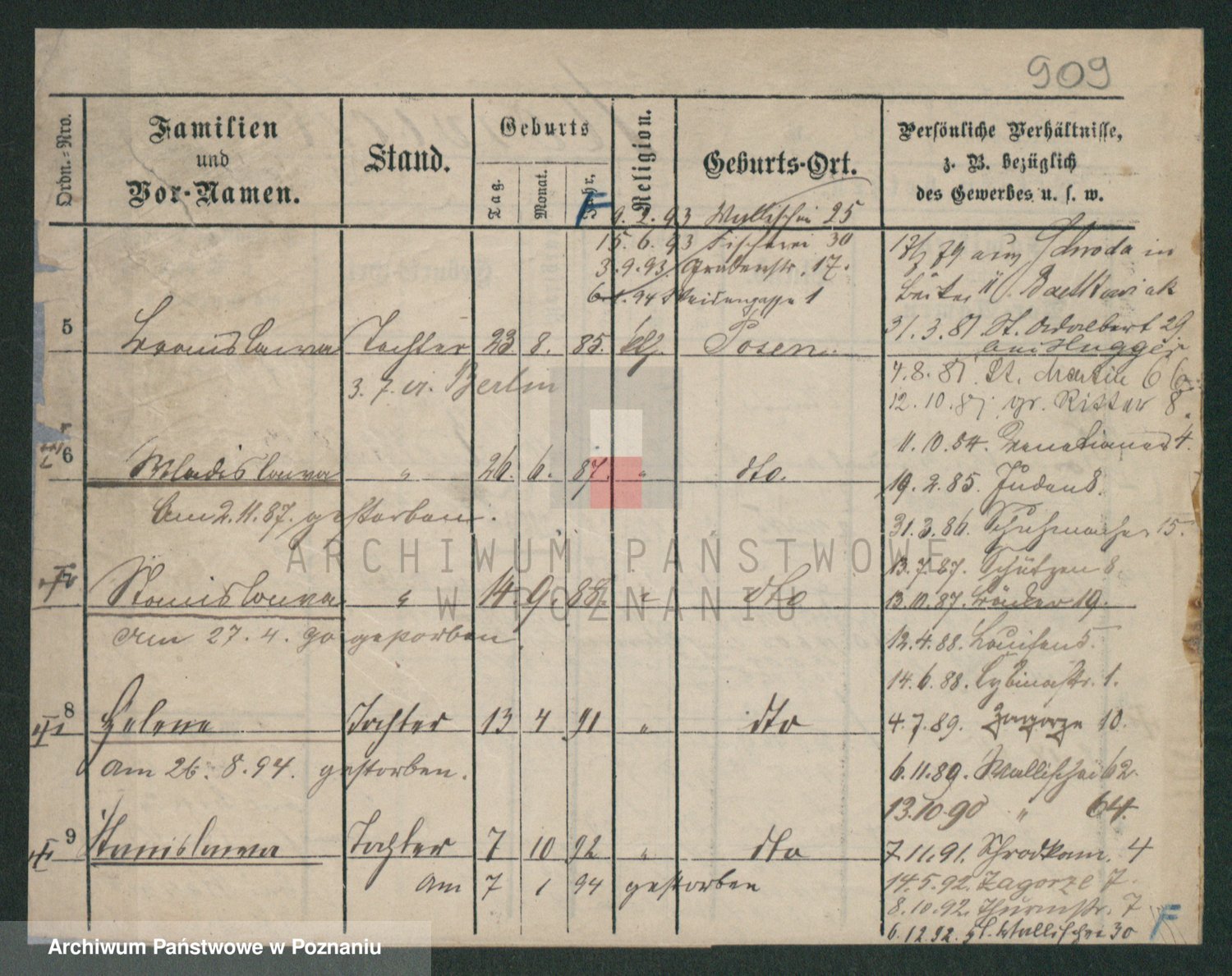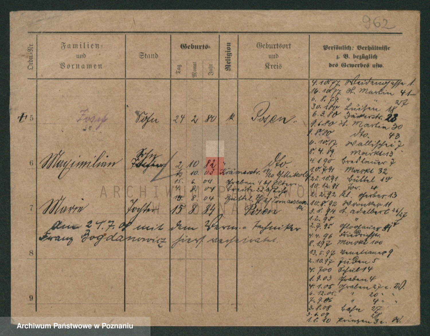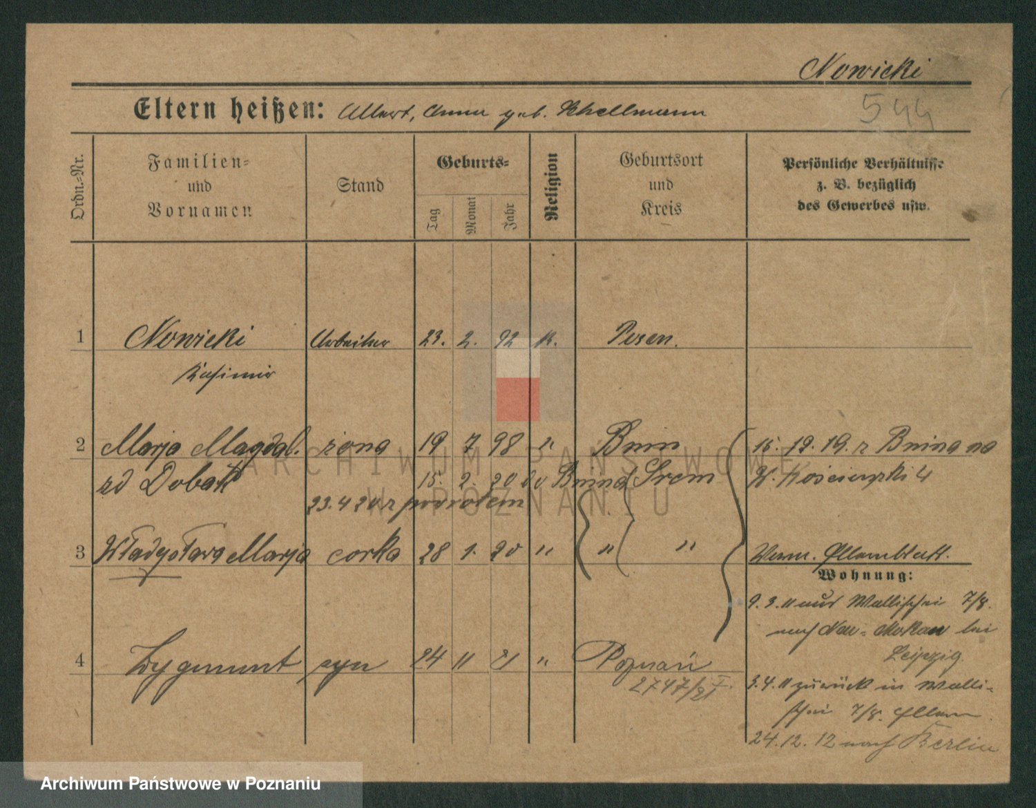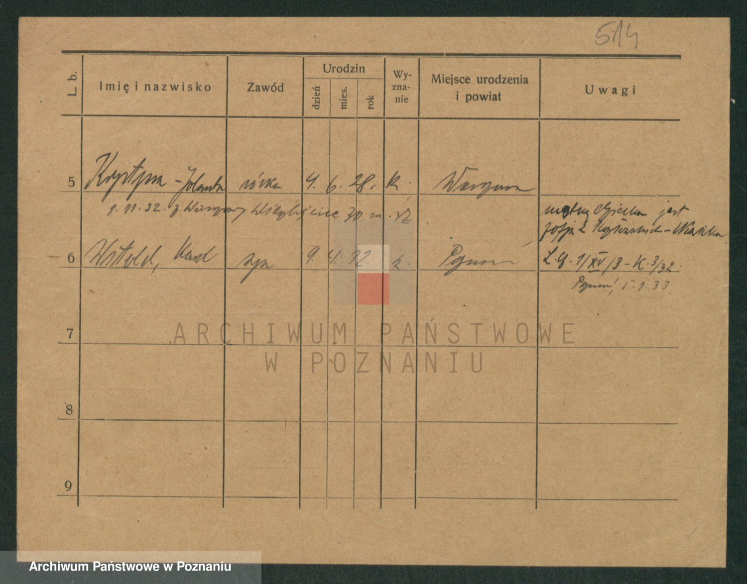 Podgląd karty osobowej dostępny jest po kliknięciu na nazwisko lub ikonkę karty. Można dokonywać powiększenia (ikony na górze) lub przechodzić między kolejnymi skanami (strzałki po bokach).