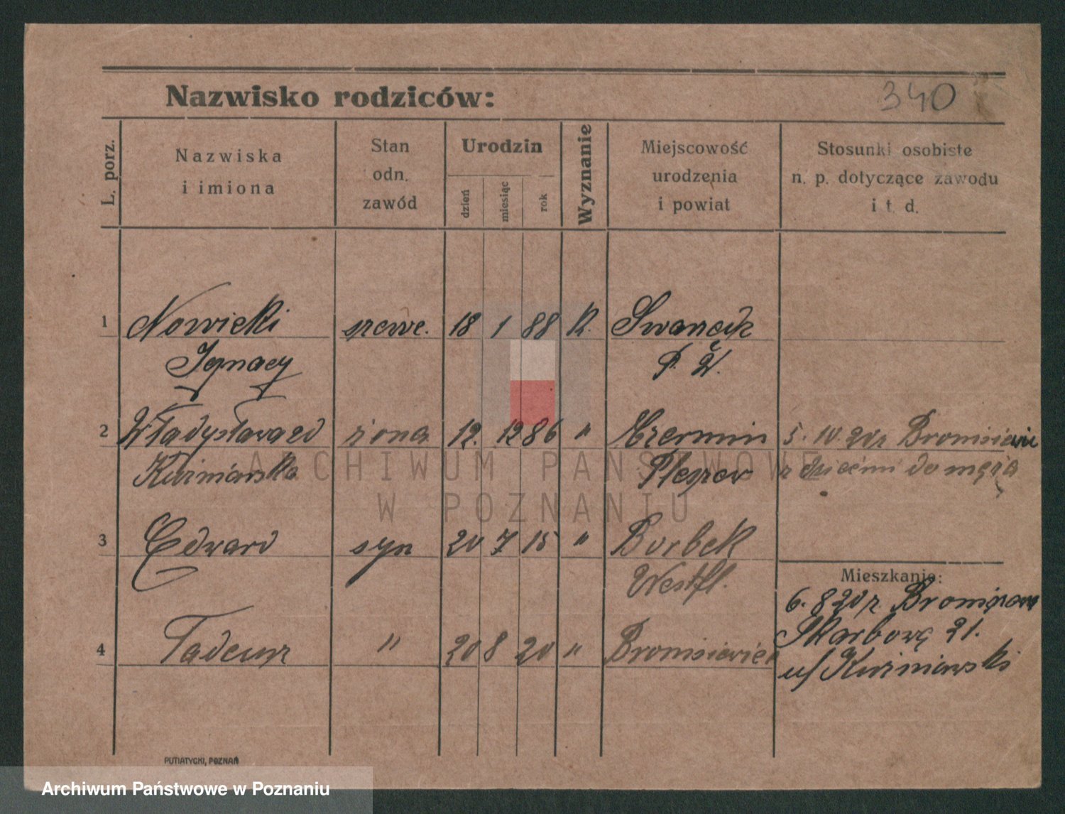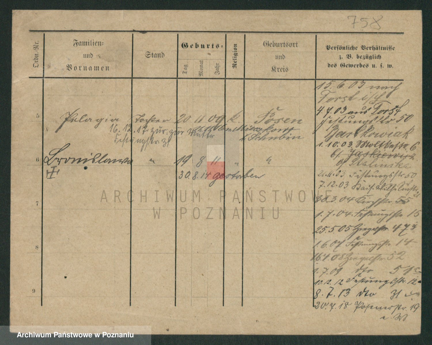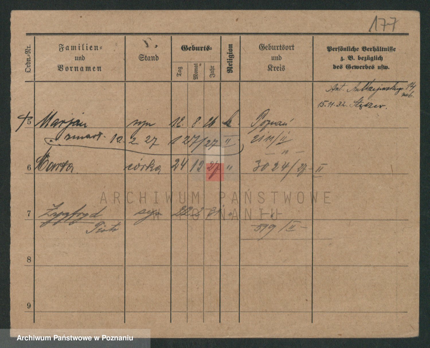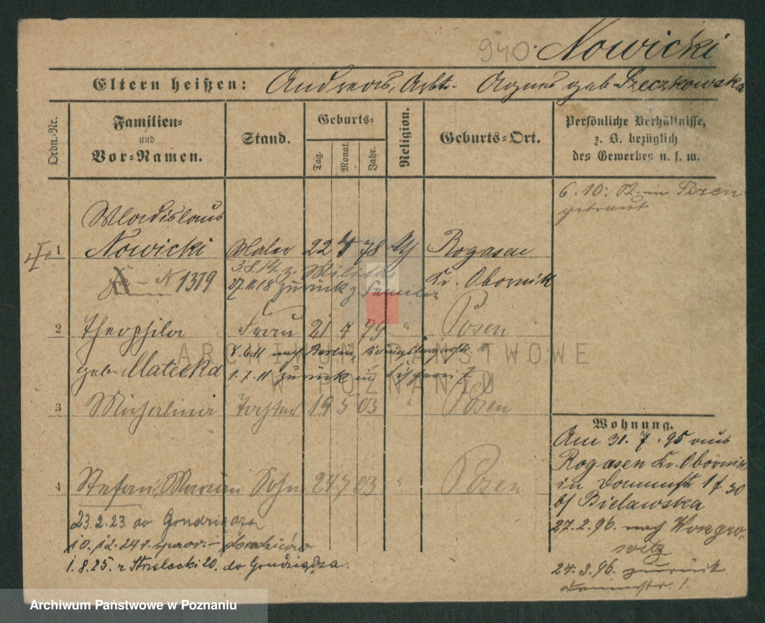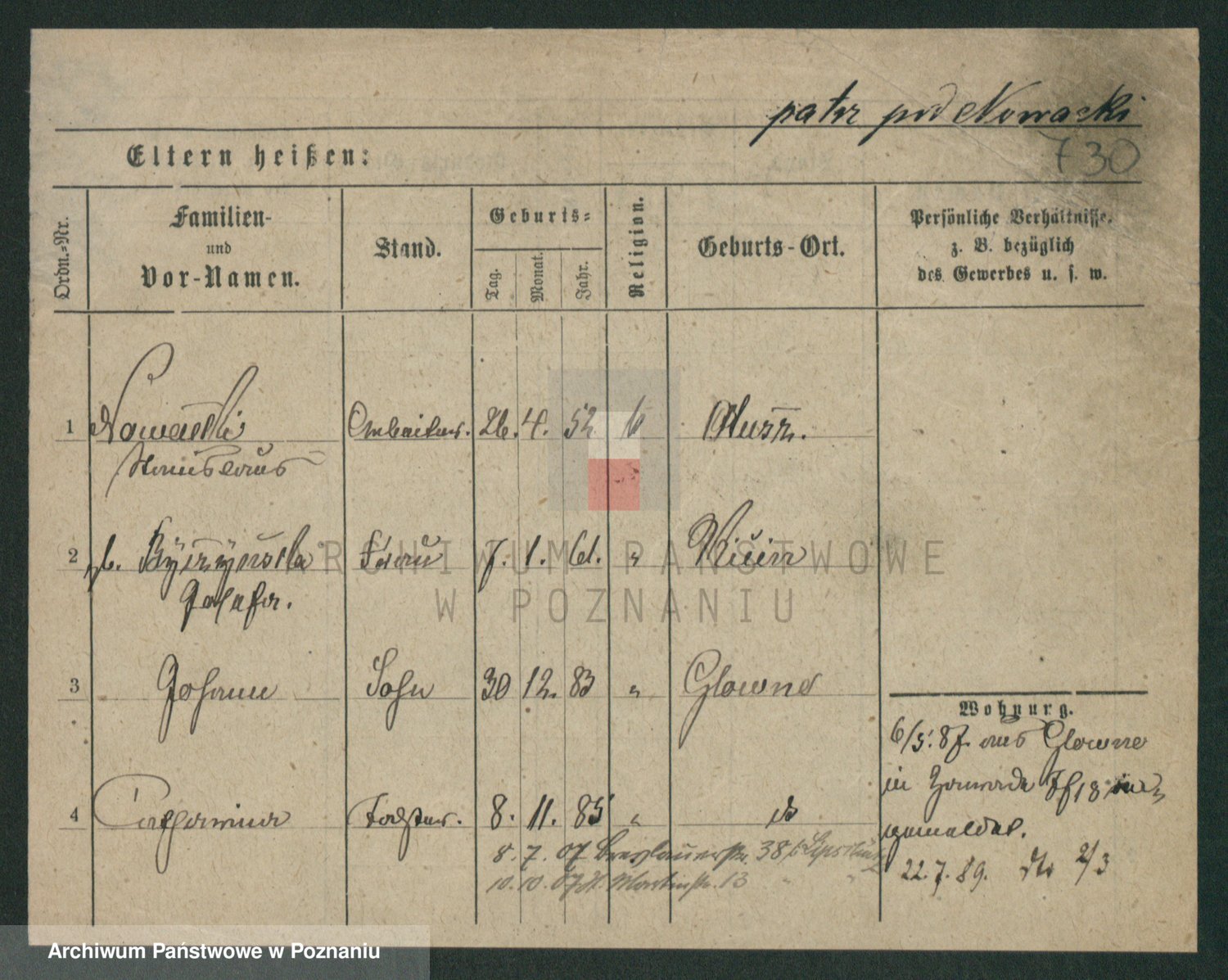 Podgląd karty osobowej dostępny jest po kliknięciu na nazwisko lub ikonkę karty. Można dokonywać powiększenia (ikony na górze) lub przechodzić między kolejnymi skanami (strzałki po bokach).