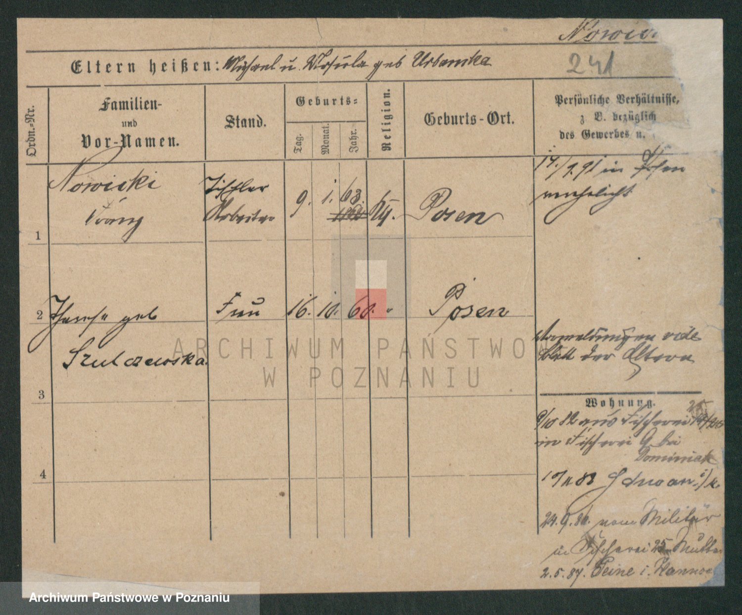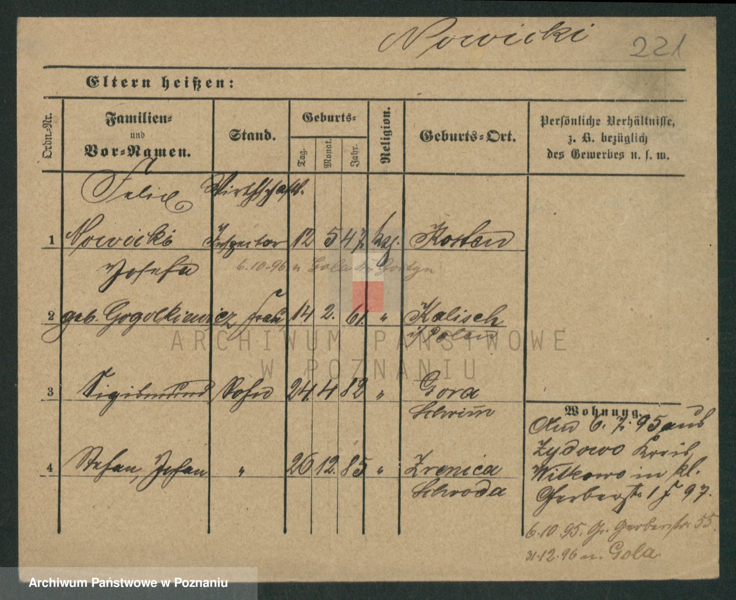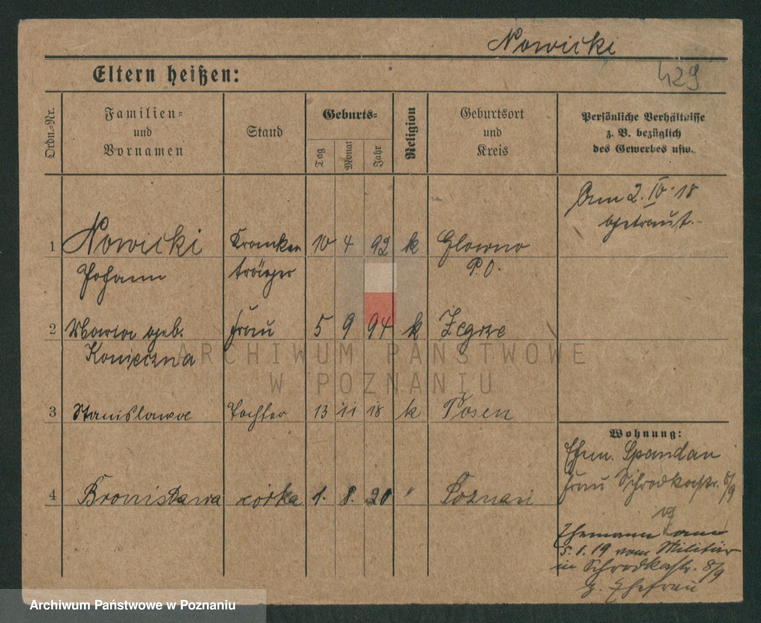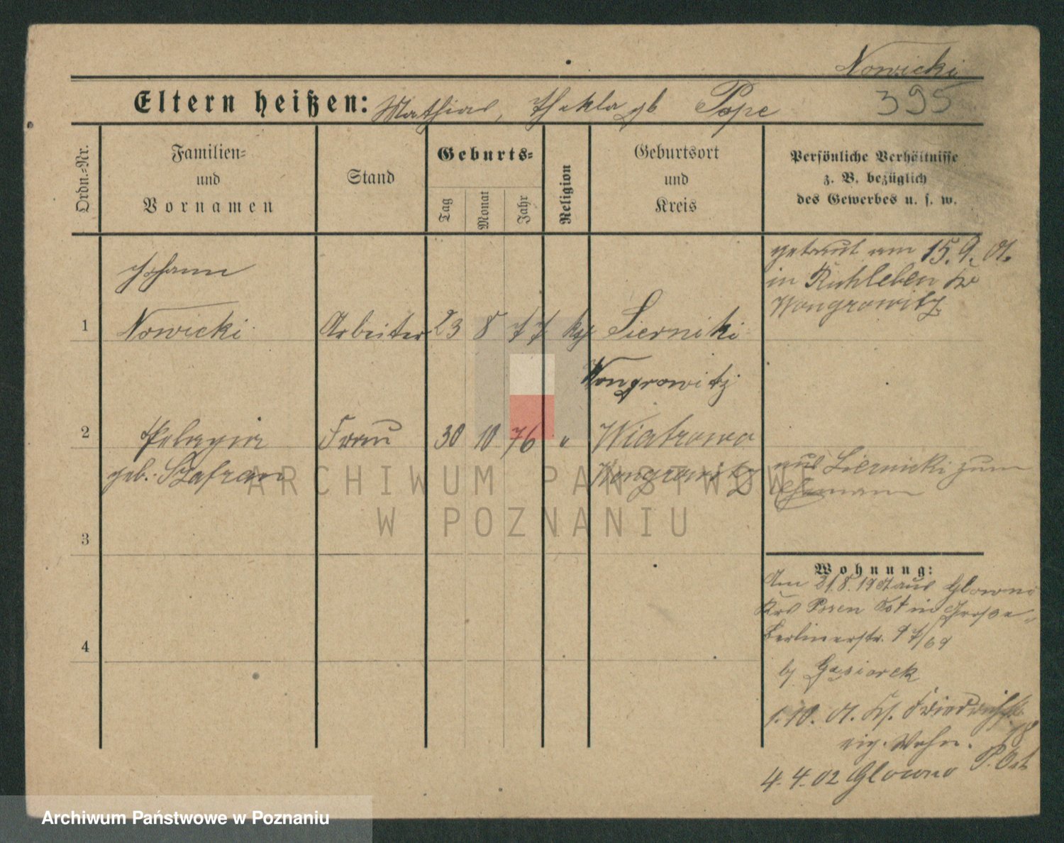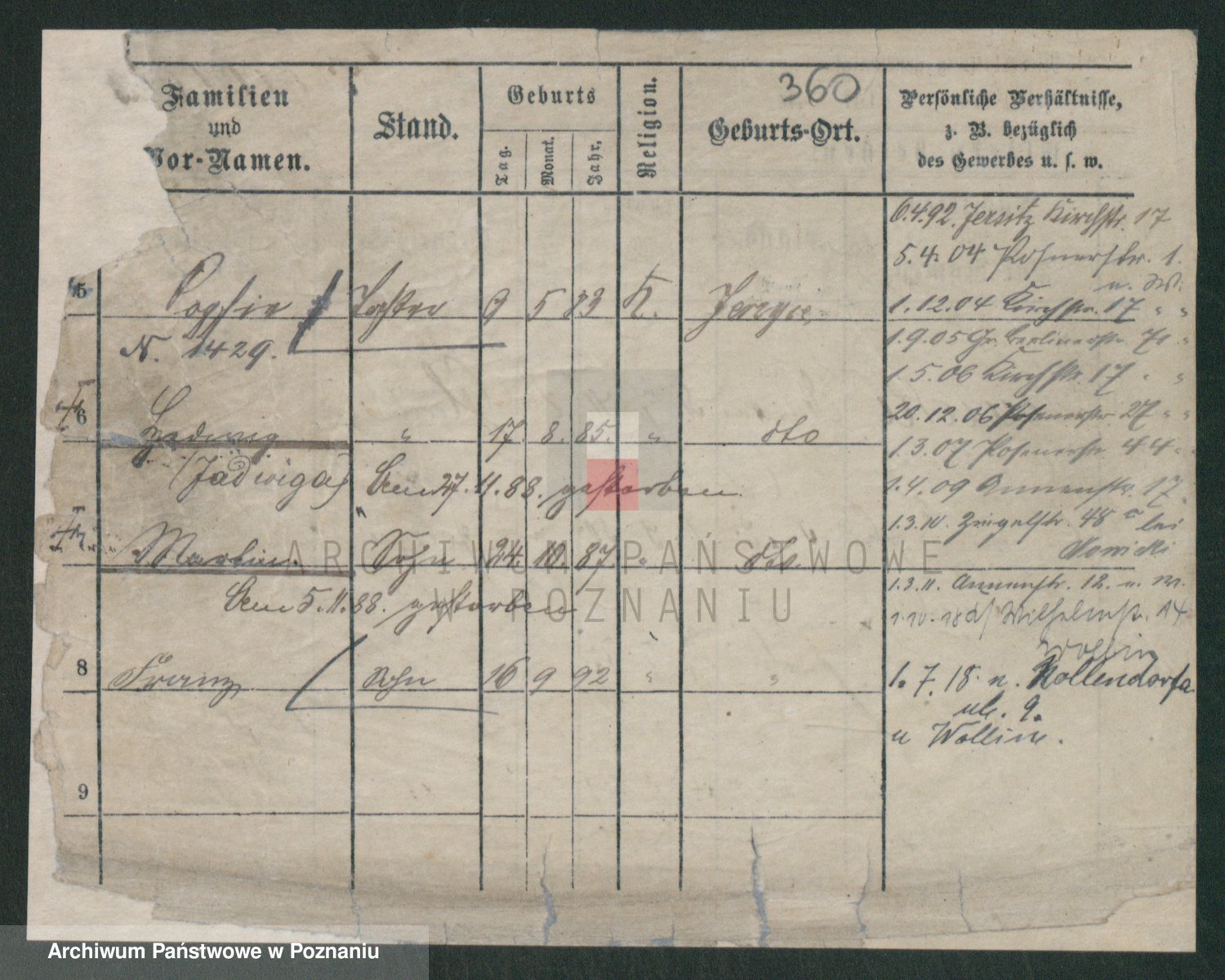Podgląd karty osobowej dostępny jest po kliknięciu na nazwisko lub ikonkę karty. Można dokonywać powiększenia (ikony na górze) lub przechodzić między kolejnymi skanami (strzałki po bokach).