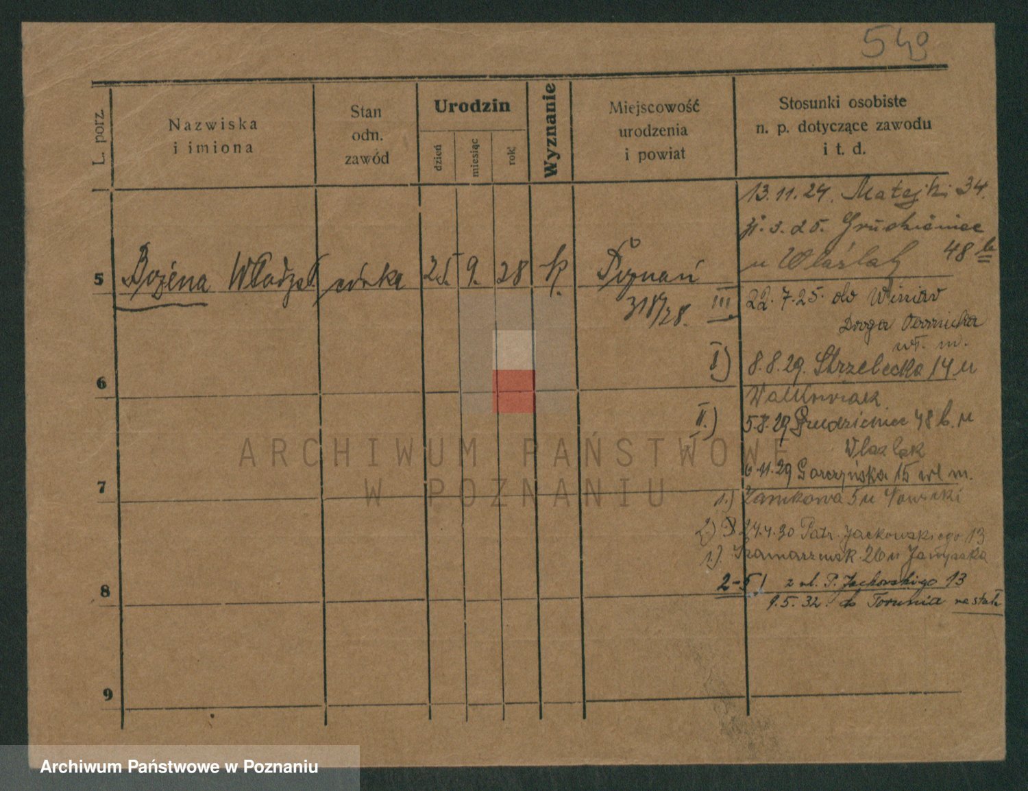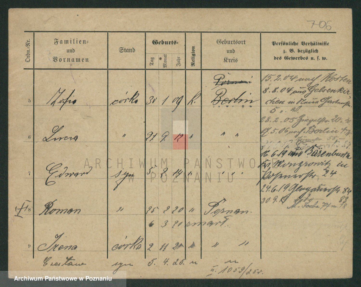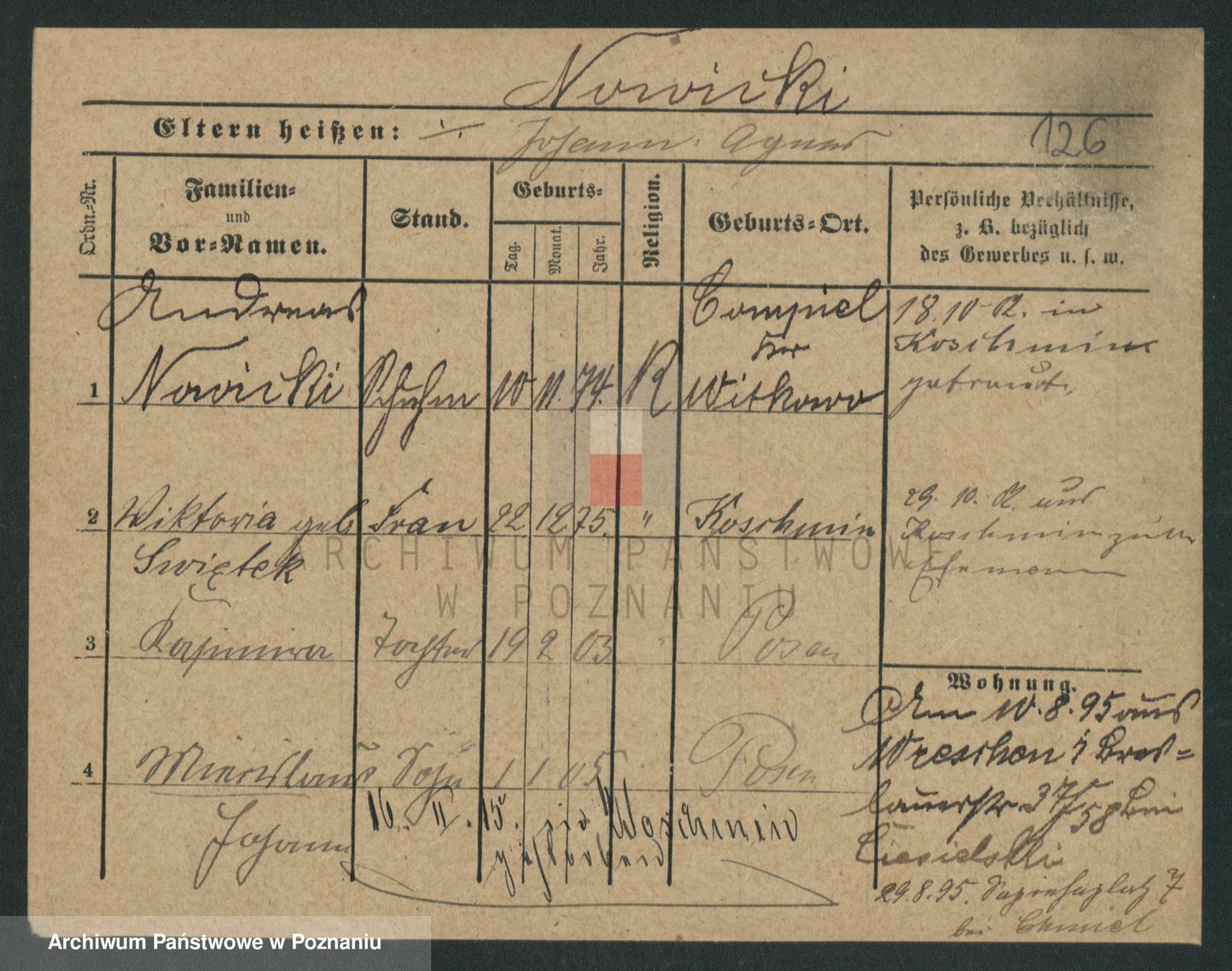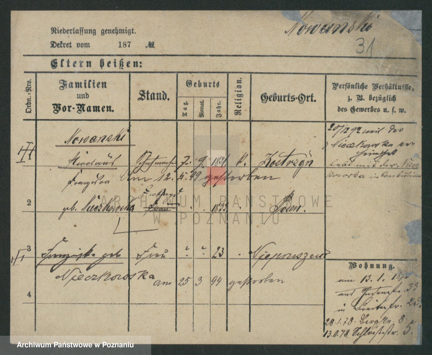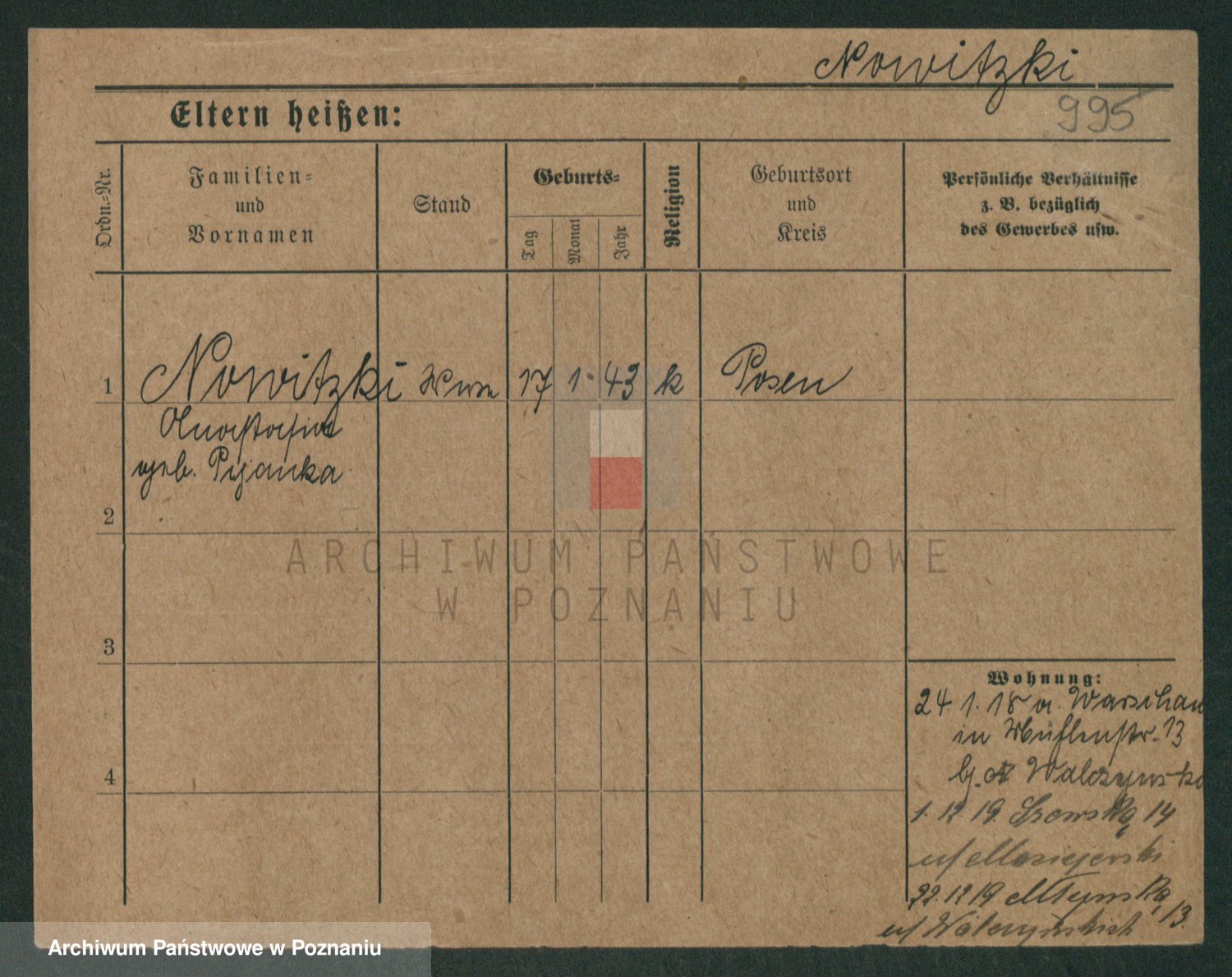 Podgląd karty osobowej dostępny jest po kliknięciu na nazwisko lub ikonkę karty. Można dokonywać powiększenia (ikony na górze) lub przechodzić między kolejnymi skanami (strzałki po bokach).