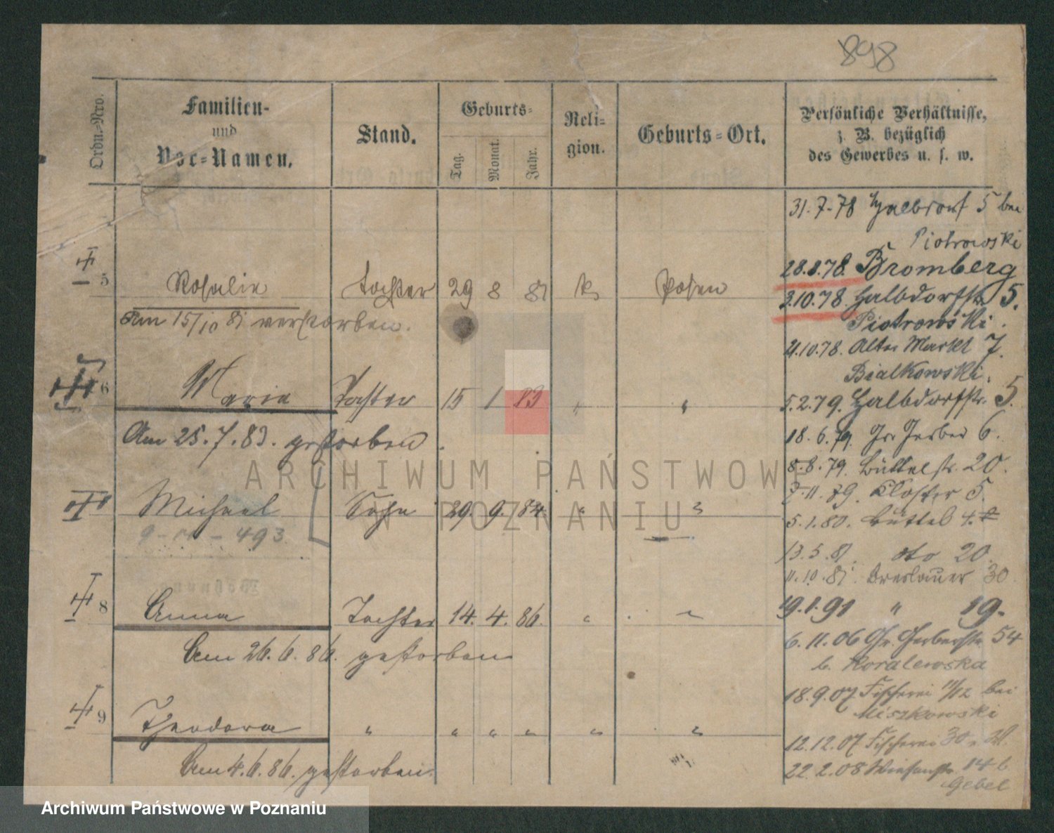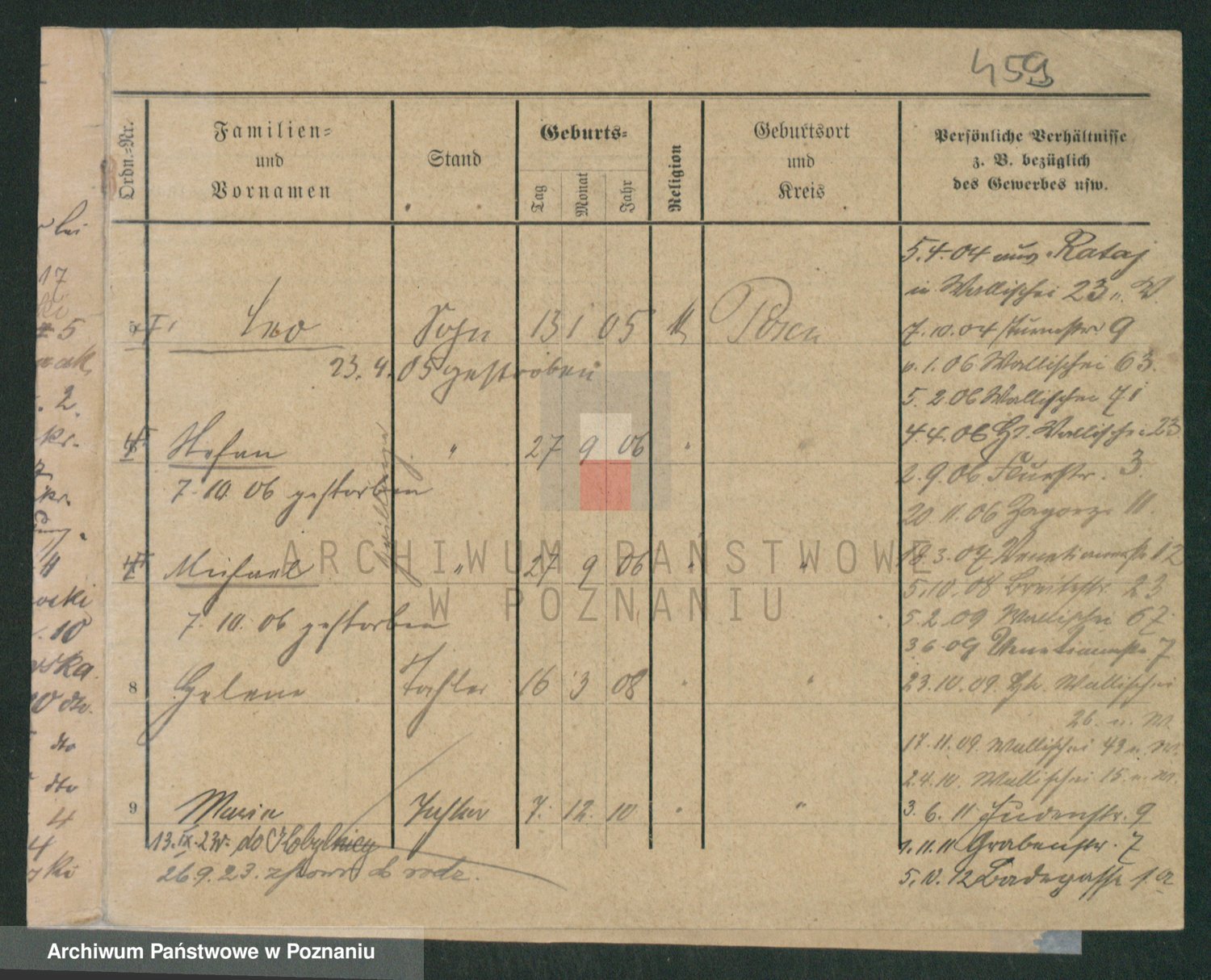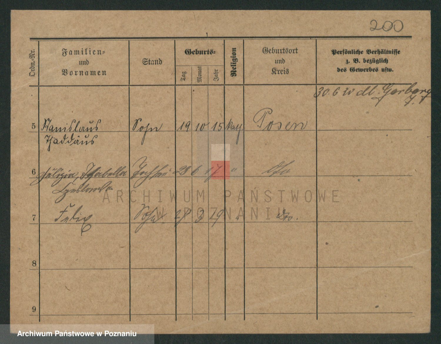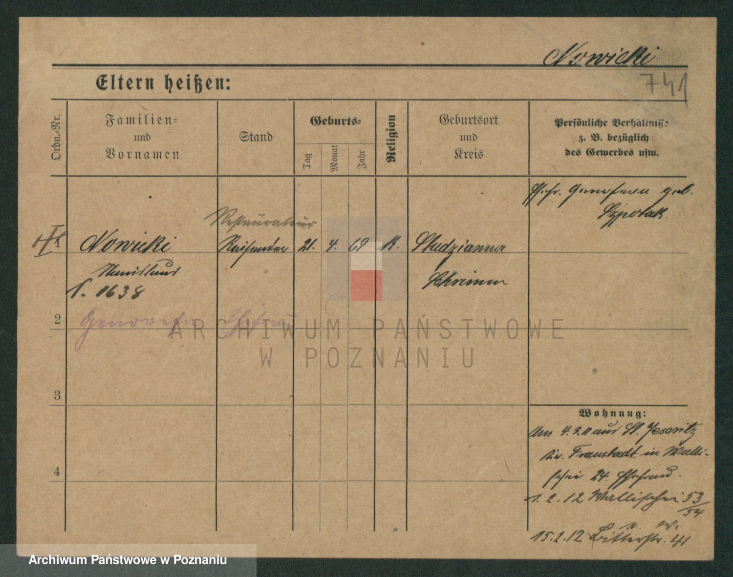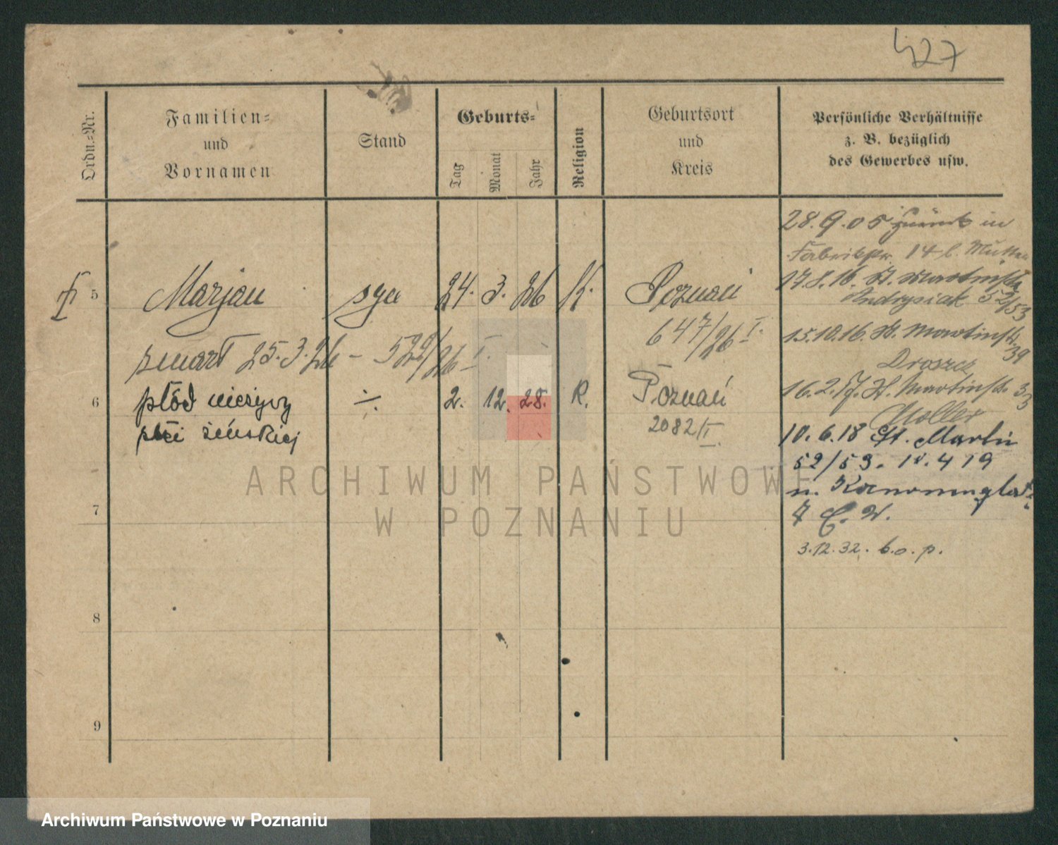 Podgląd karty osobowej dostępny jest po kliknięciu na nazwisko lub ikonkę karty. Można dokonywać powiększenia (ikony na górze) lub przechodzić między kolejnymi skanami (strzałki po bokach).