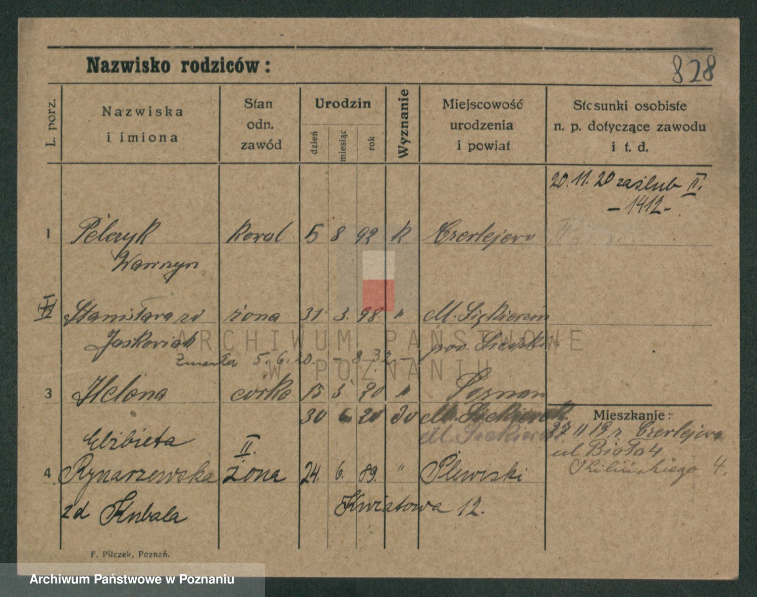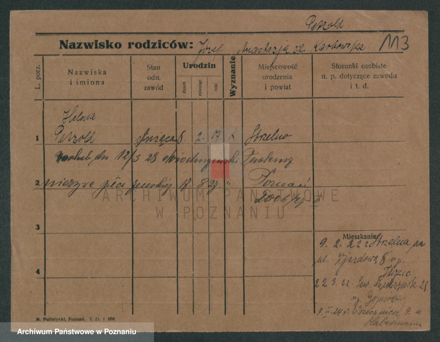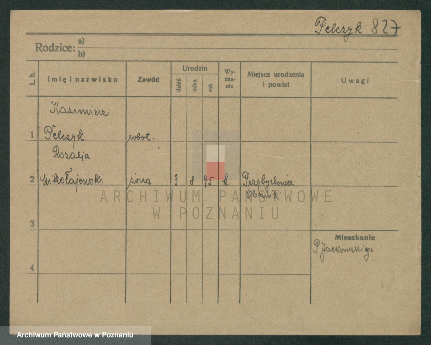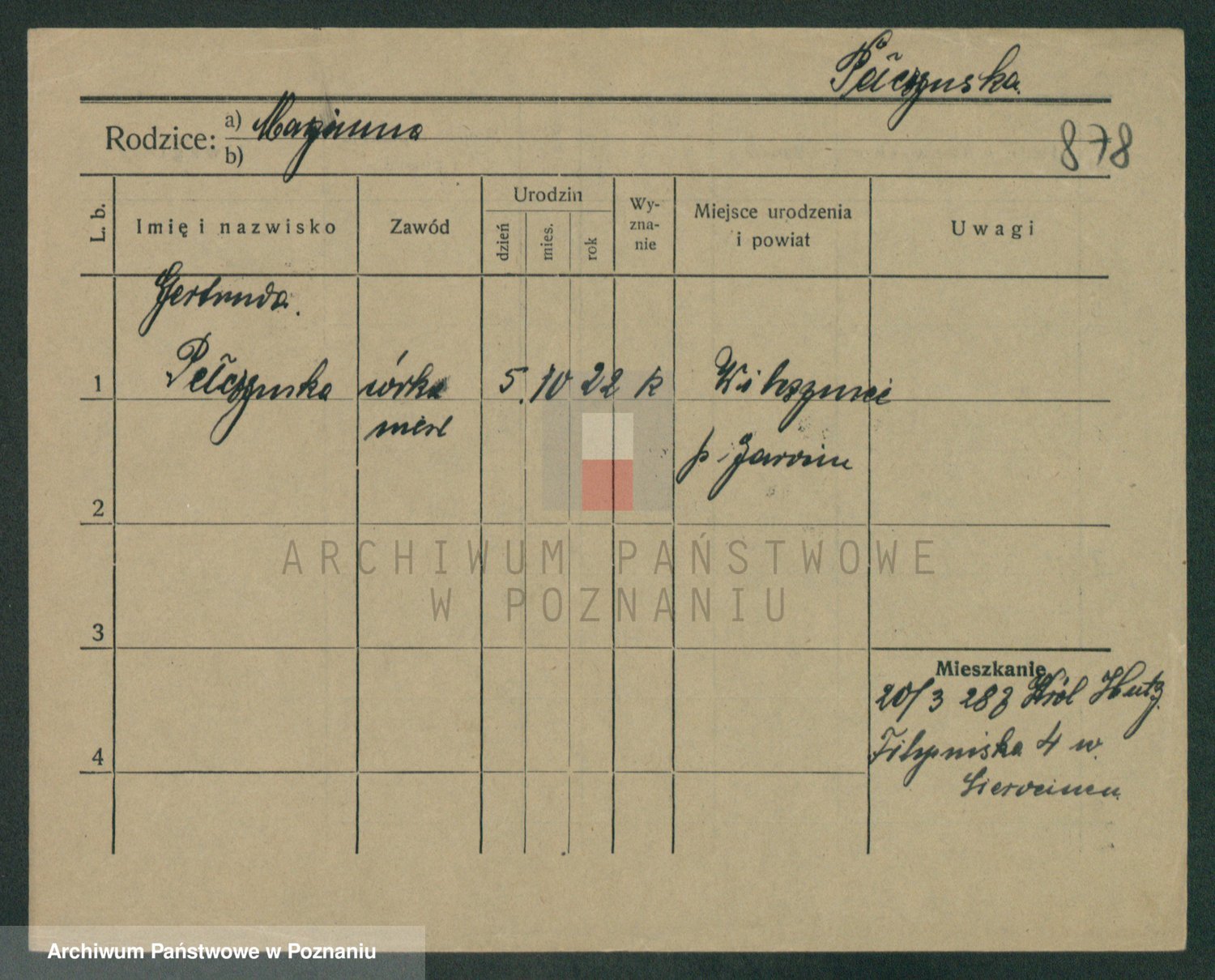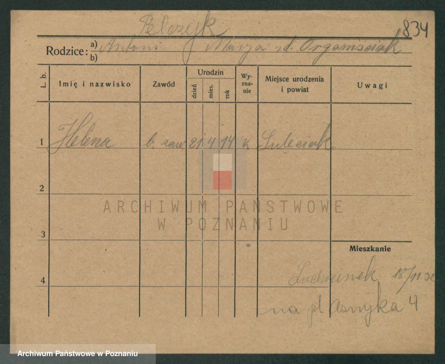 Podgląd karty osobowej dostępny jest po kliknięciu na nazwisko lub ikonkę karty. Można dokonywać powiększenia (ikony na górze) lub przechodzić między kolejnymi skanami (strzałki po bokach).