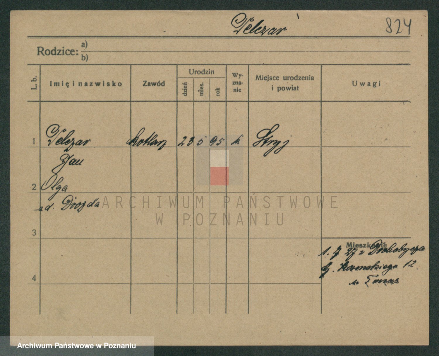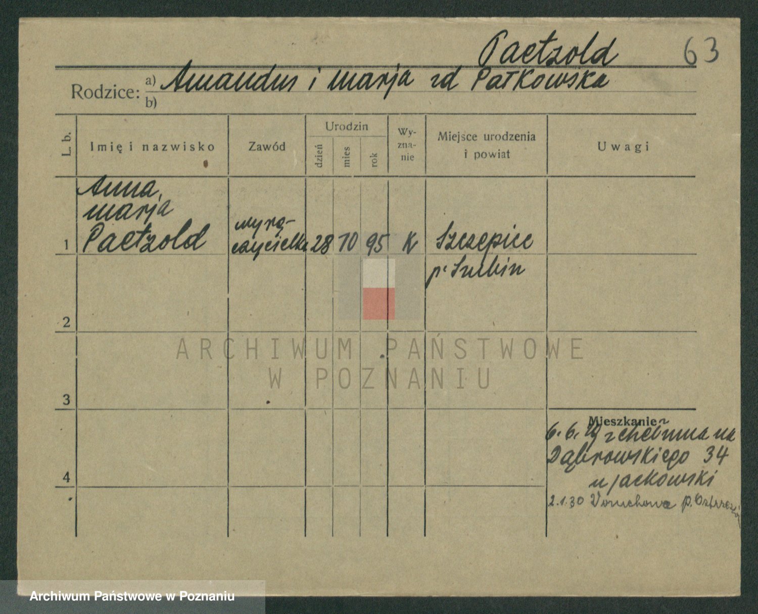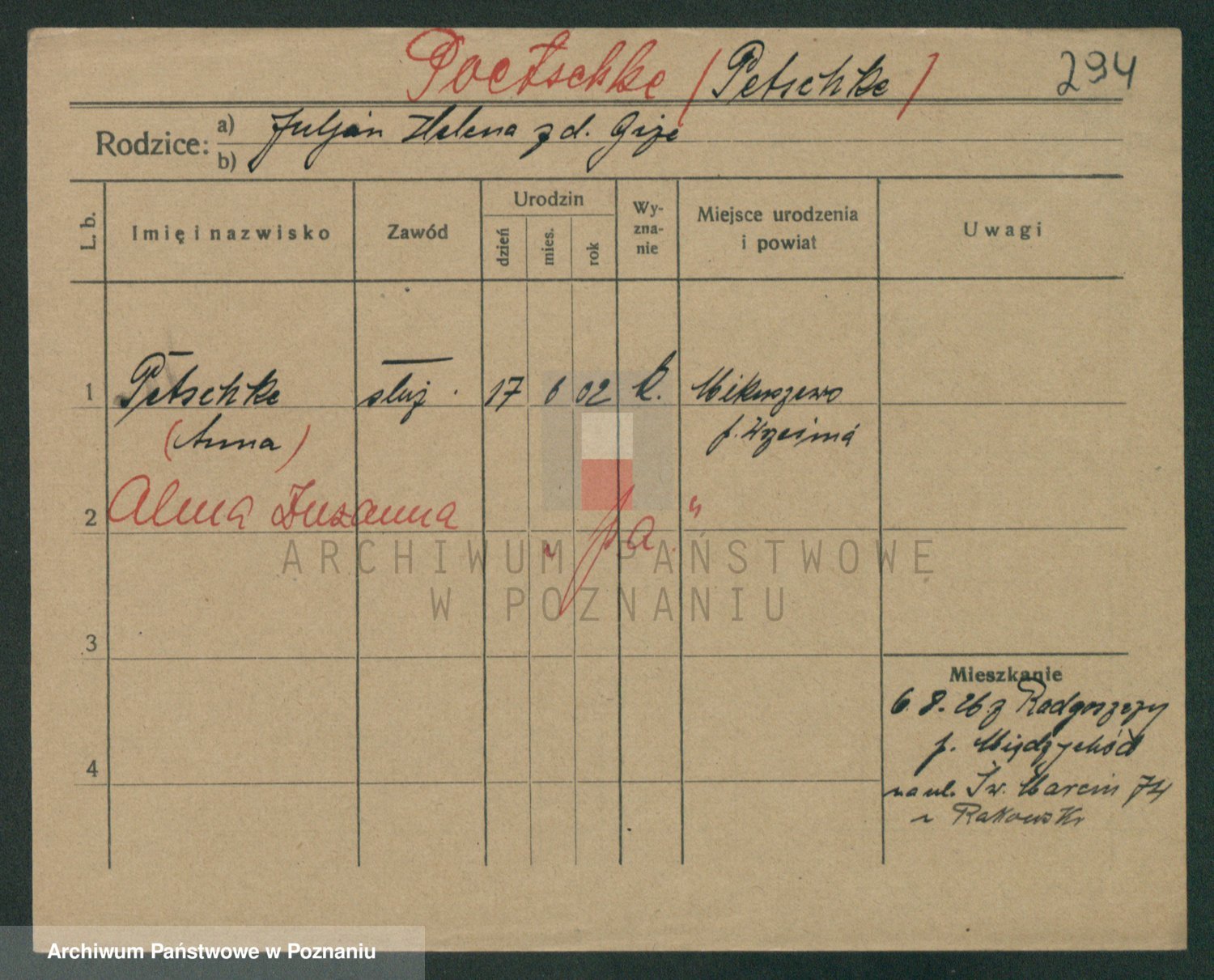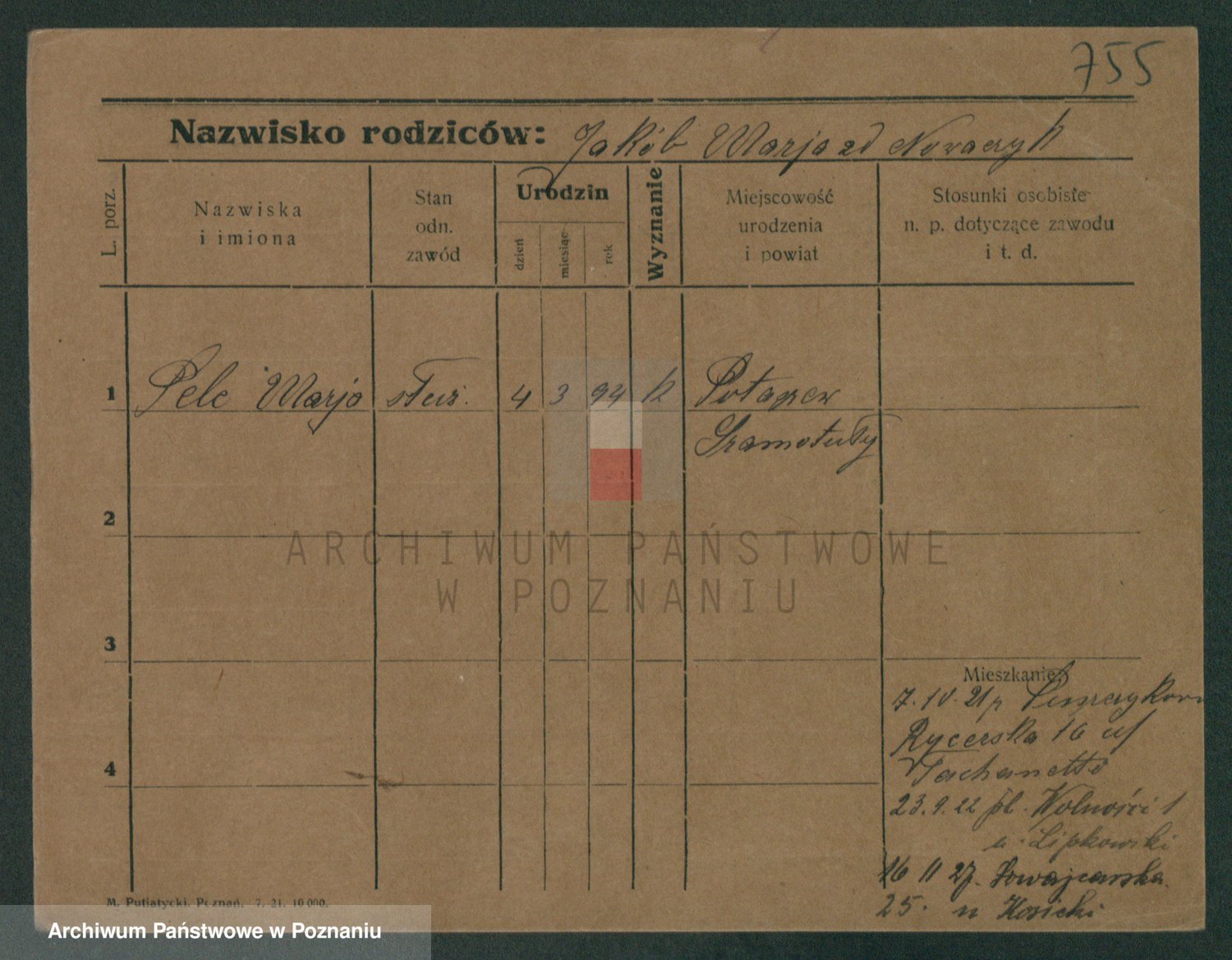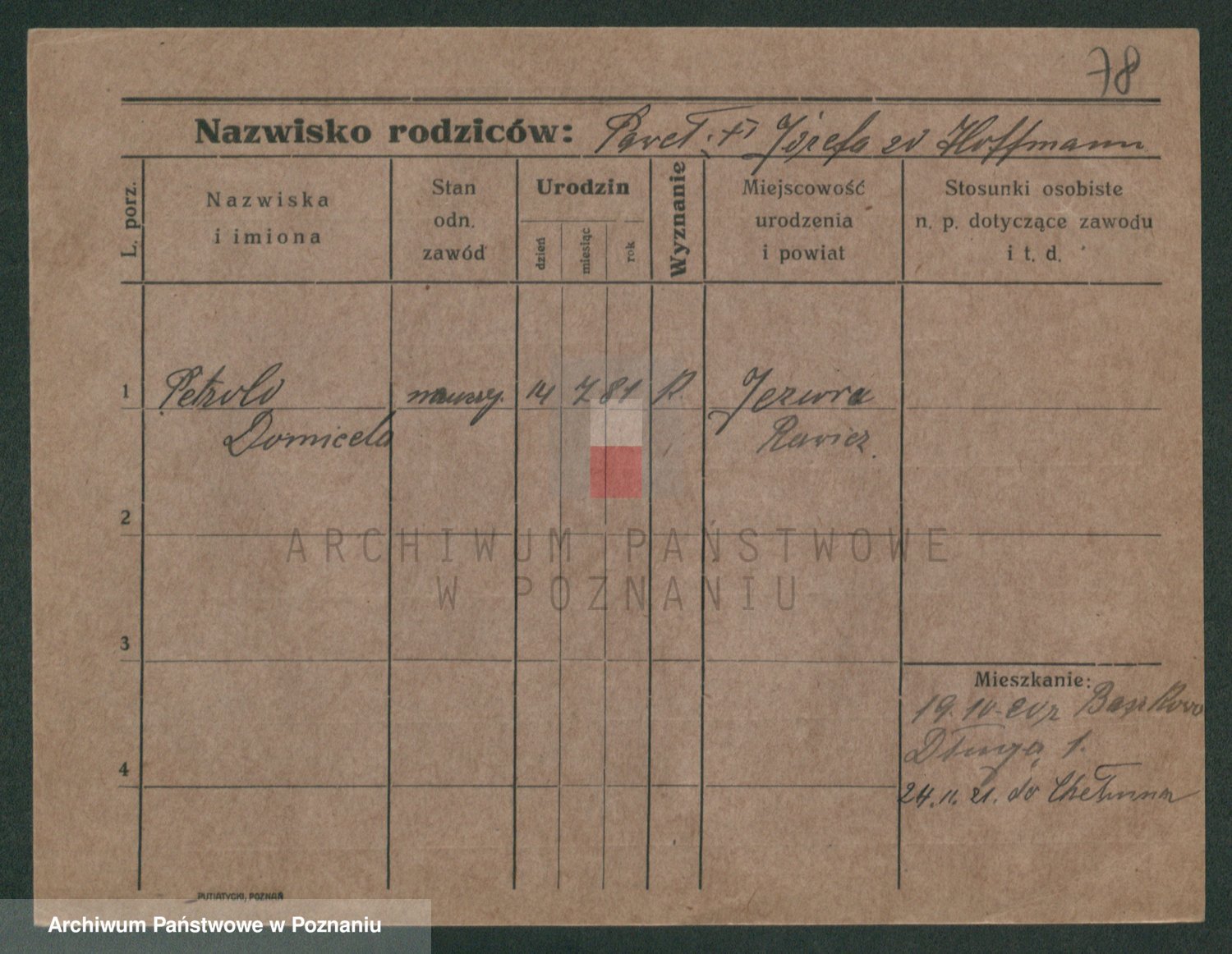 Podgląd karty osobowej dostępny jest po kliknięciu na nazwisko lub ikonkę karty. Można dokonywać powiększenia (ikony na górze) lub przechodzić między kolejnymi skanami (strzałki po bokach).