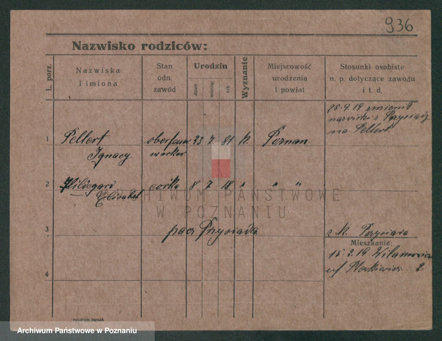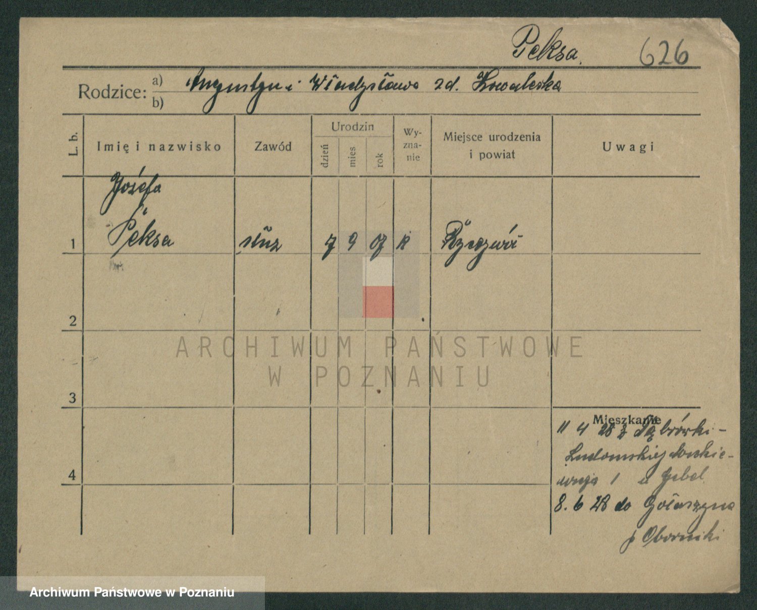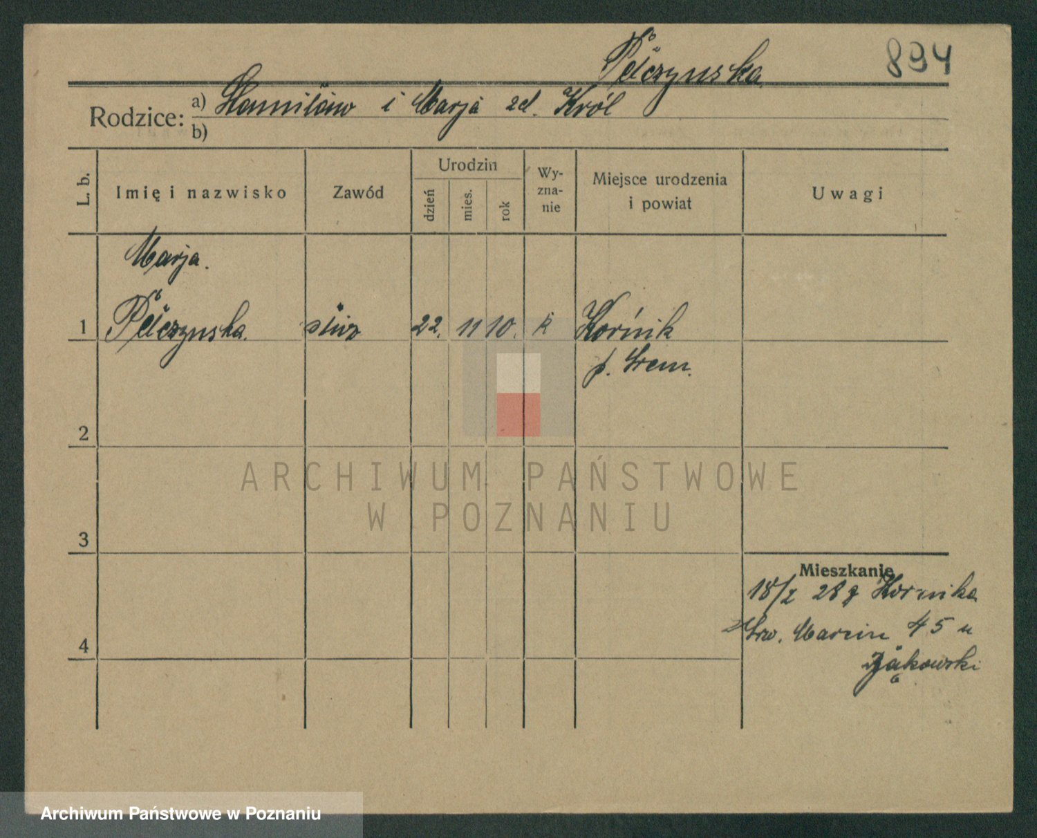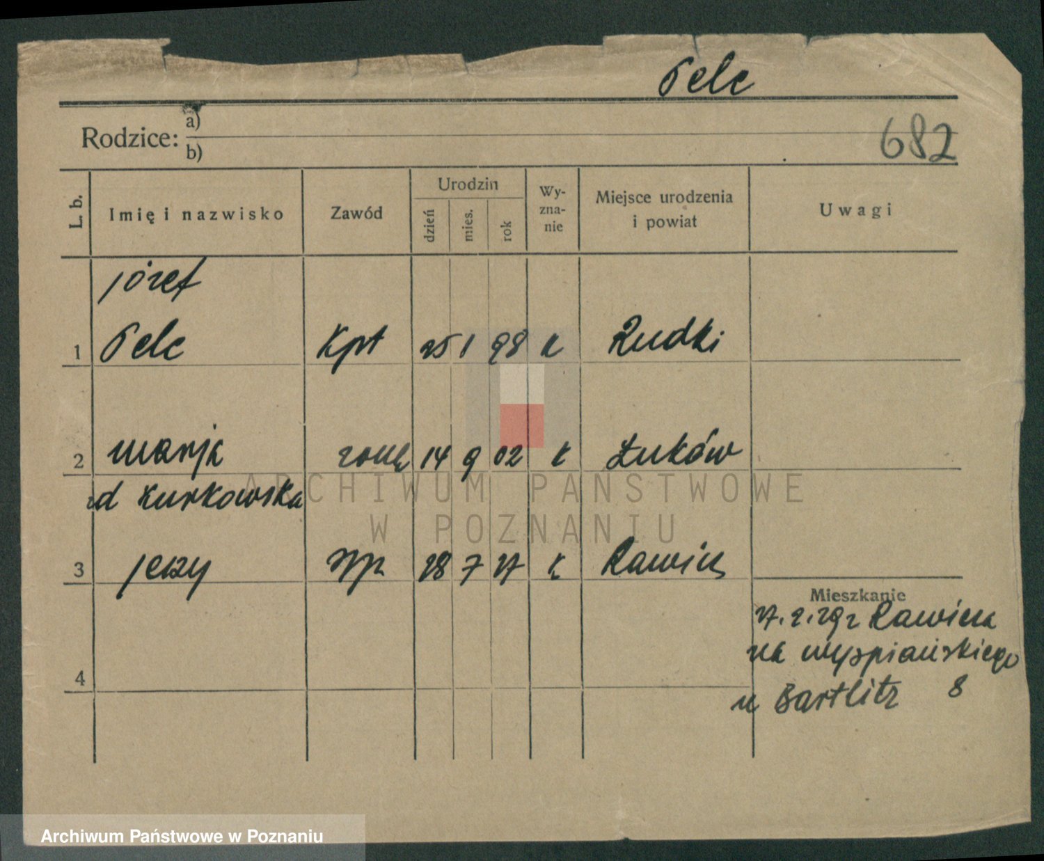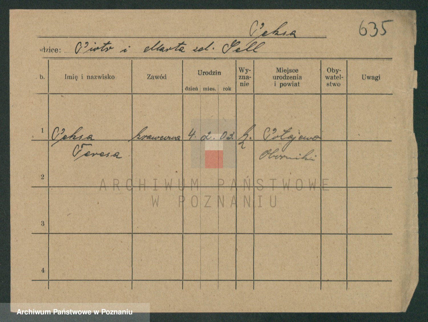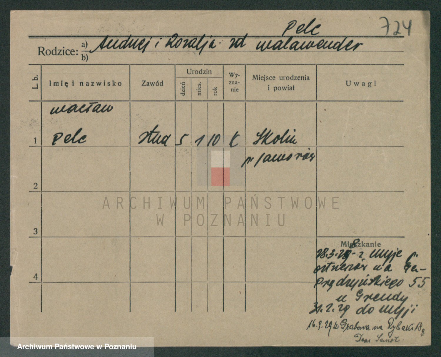Podgląd karty osobowej dostępny jest po kliknięciu na nazwisko lub ikonkę karty. Można dokonywać powiększenia (ikony na górze) lub przechodzić między kolejnymi skanami (strzałki po bokach).