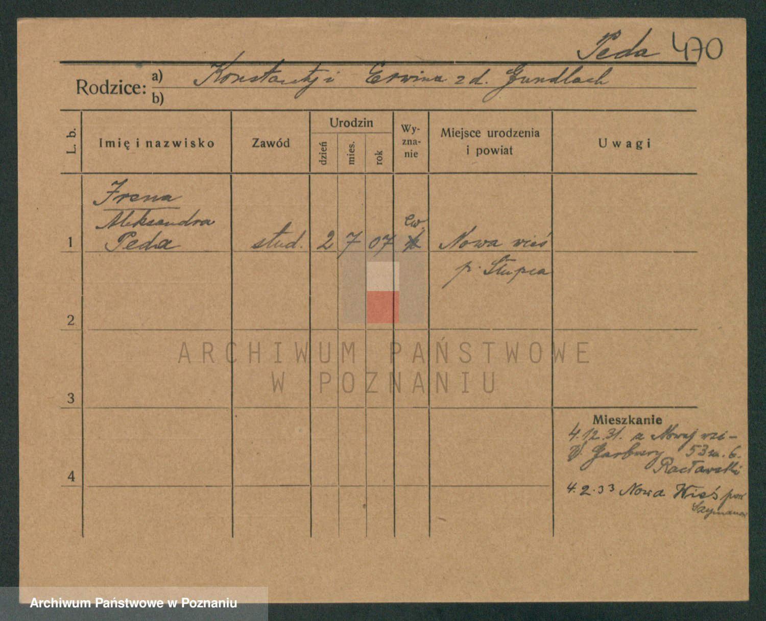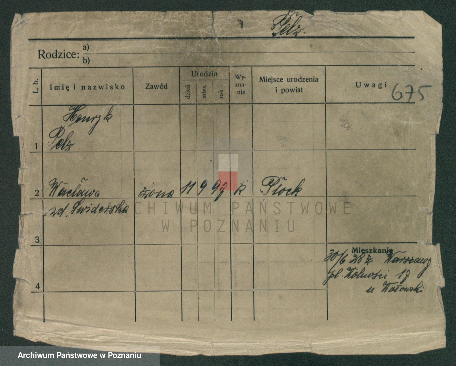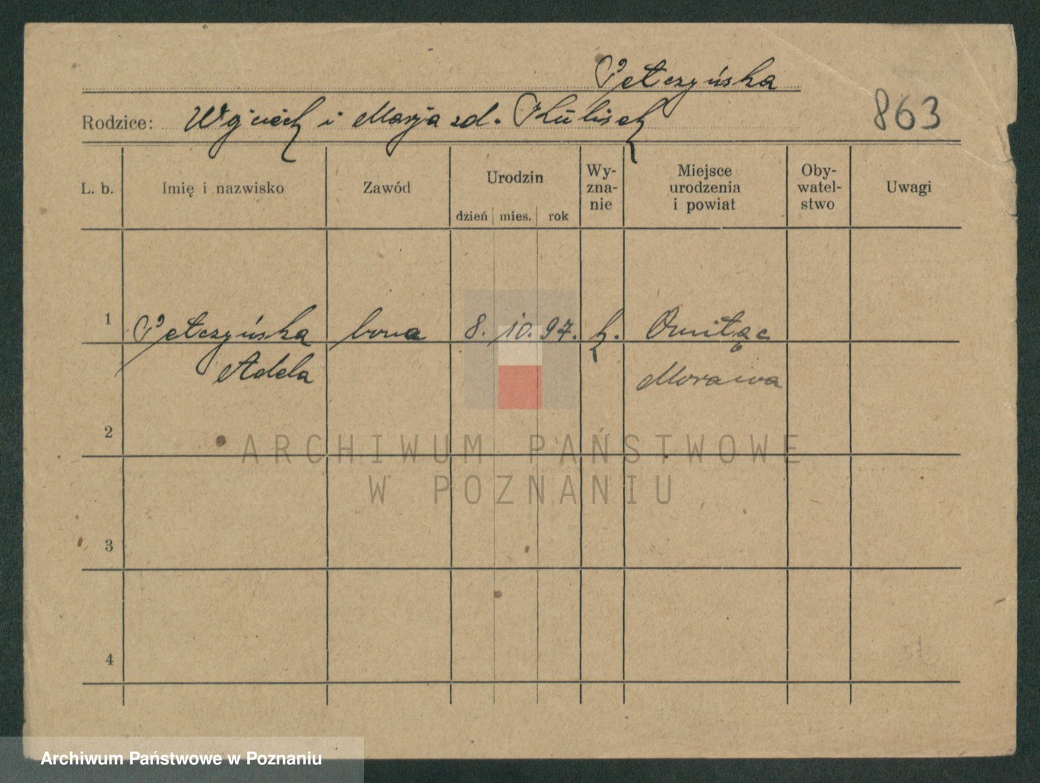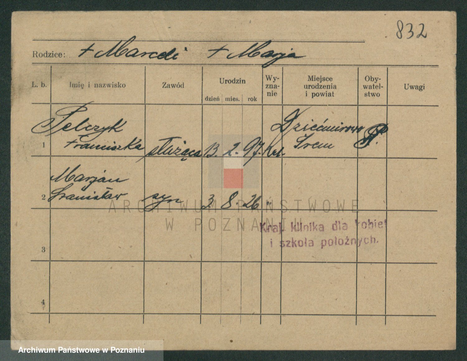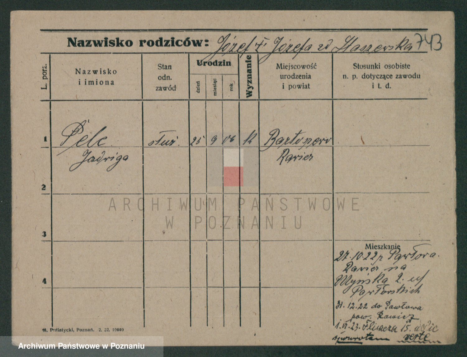 Podgląd karty osobowej dostępny jest po kliknięciu na nazwisko lub ikonkę karty. Można dokonywać powiększenia (ikony na górze) lub przechodzić między kolejnymi skanami (strzałki po bokach).