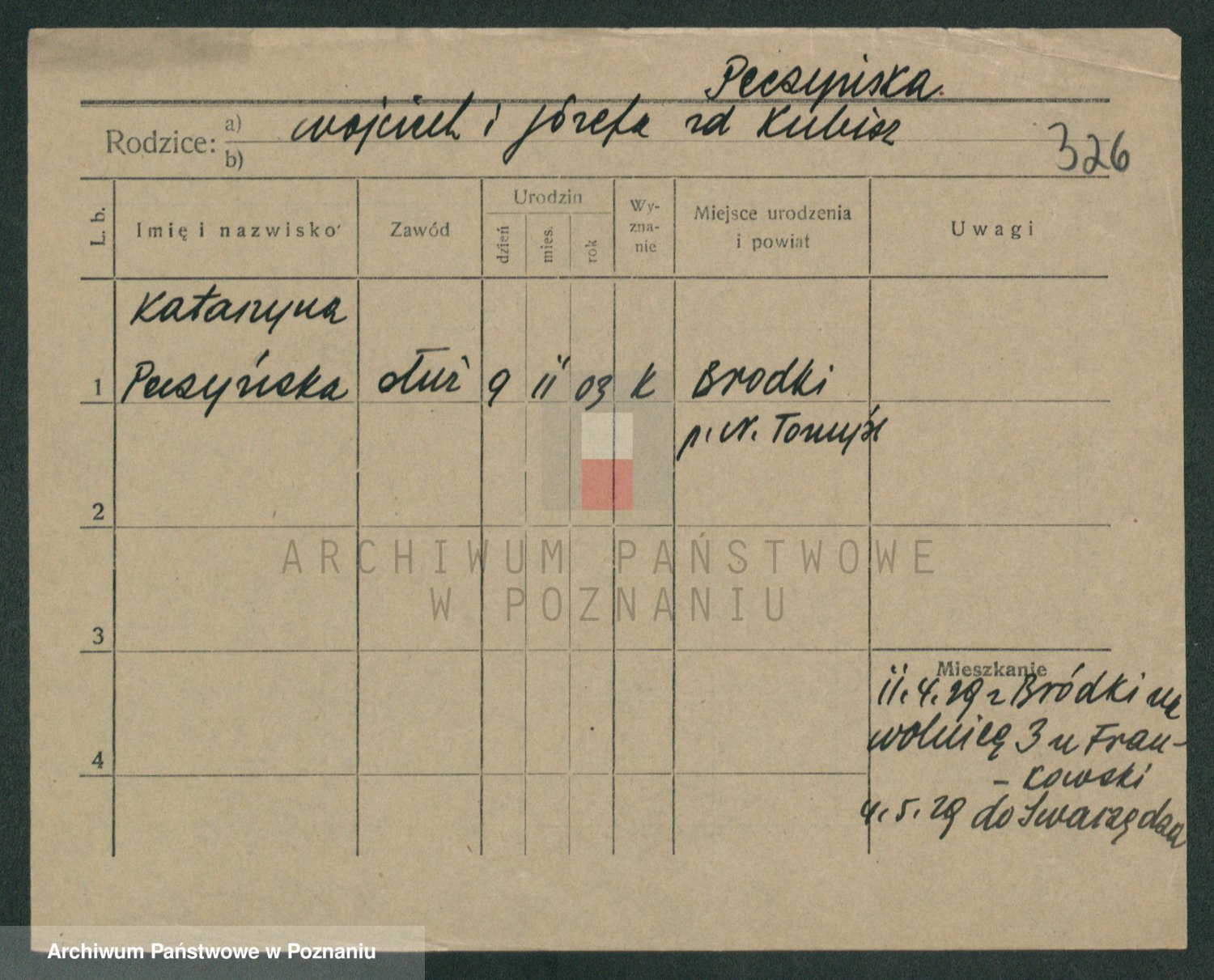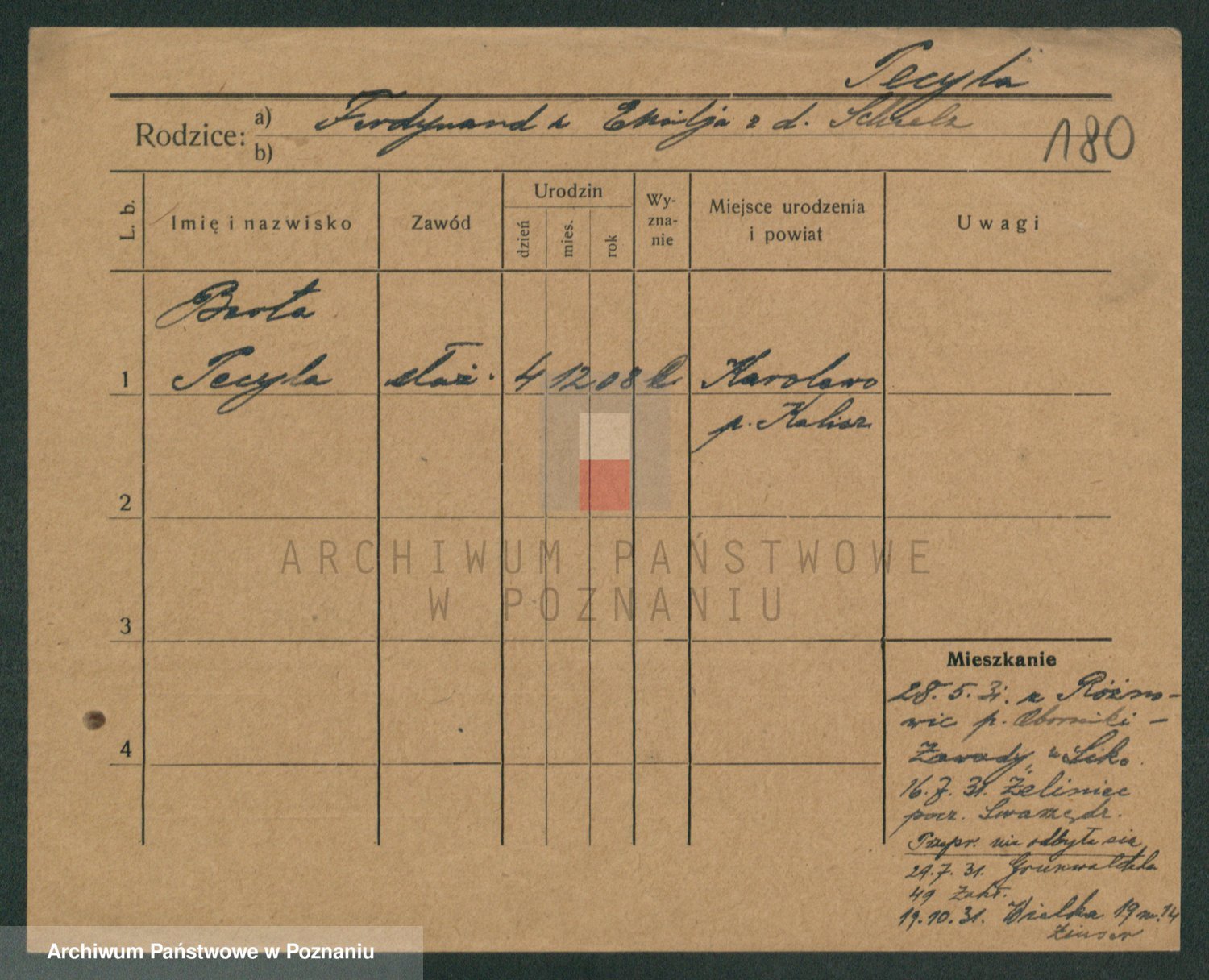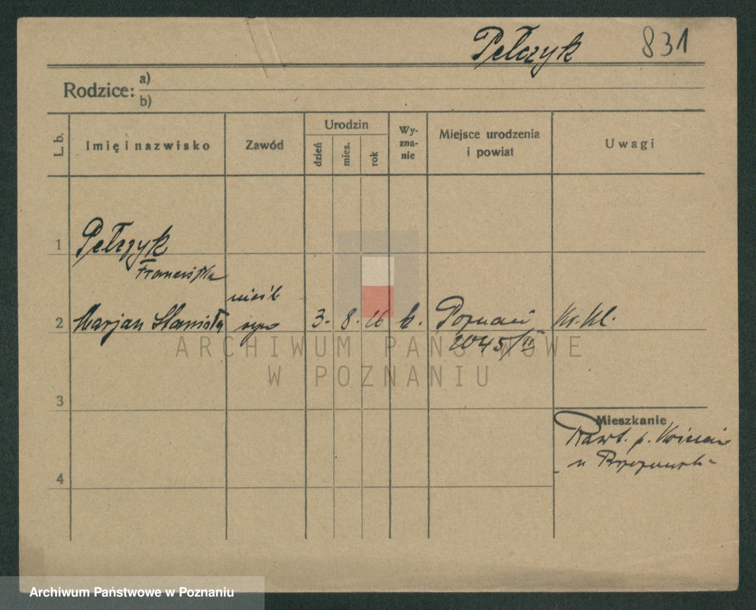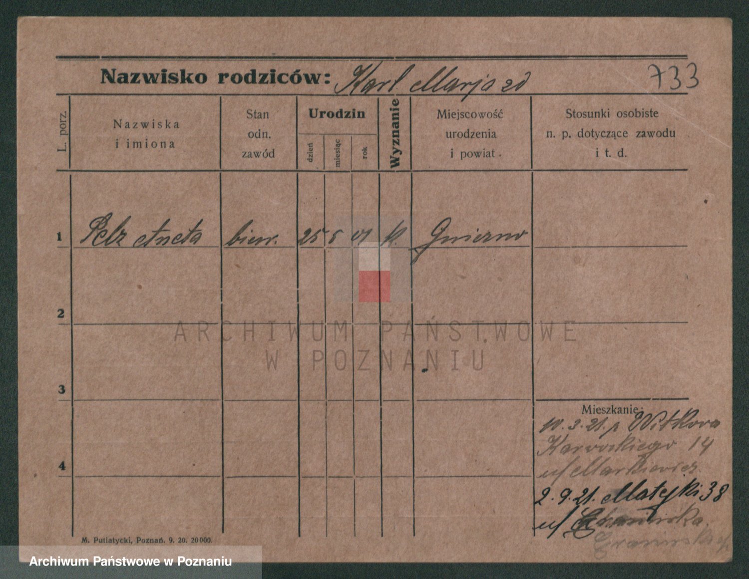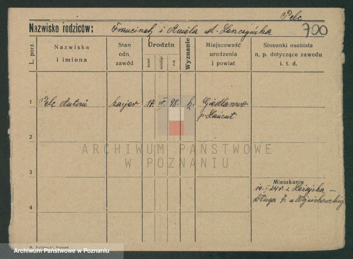 Podgląd karty osobowej dostępny jest po kliknięciu na nazwisko lub ikonkę karty. Można dokonywać powiększenia (ikony na górze) lub przechodzić między kolejnymi skanami (strzałki po bokach).