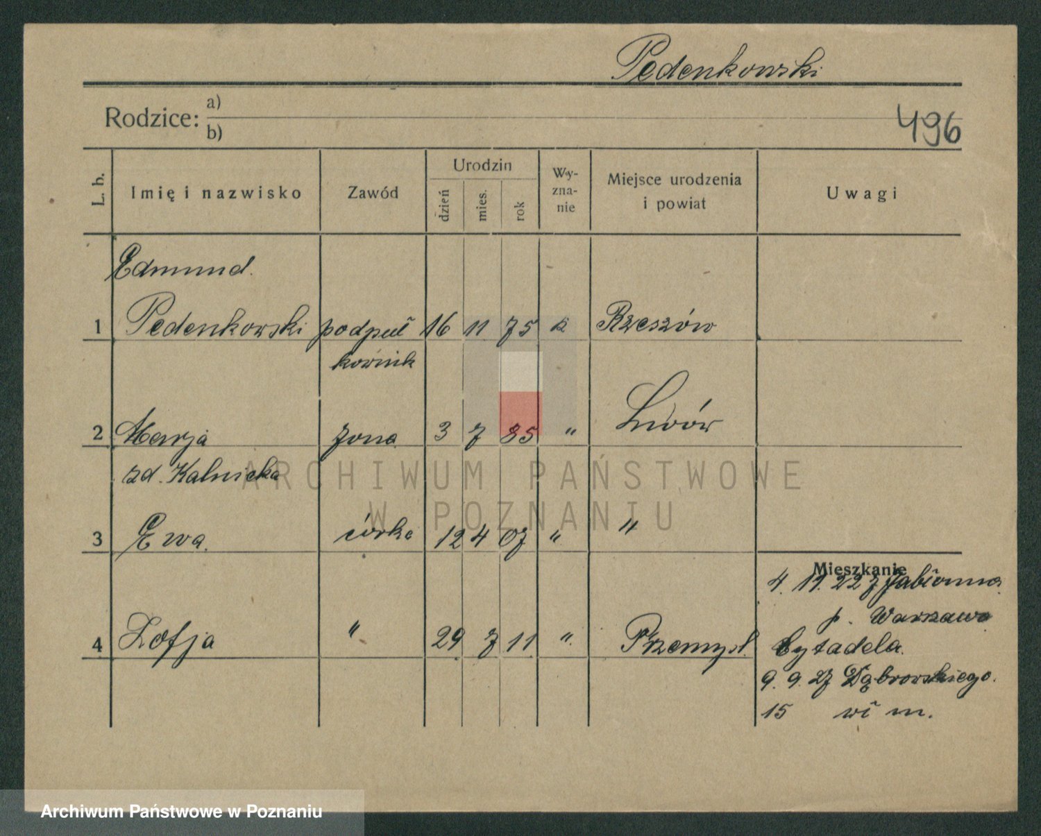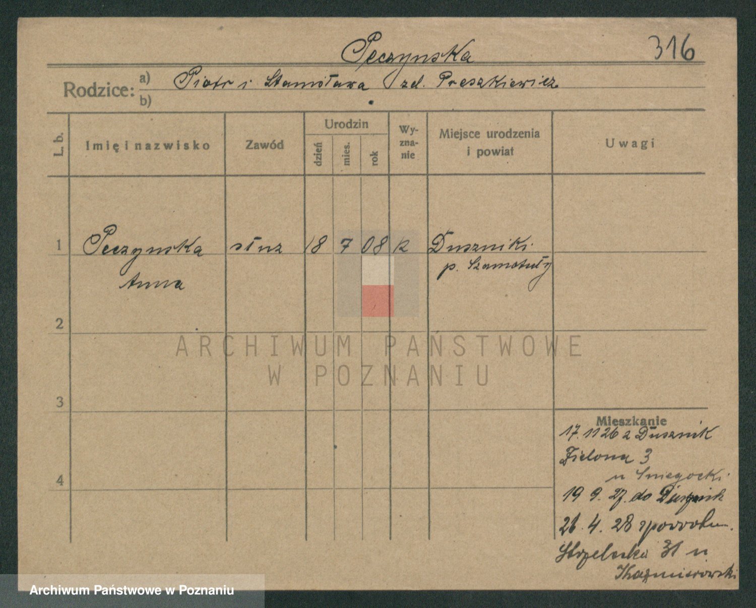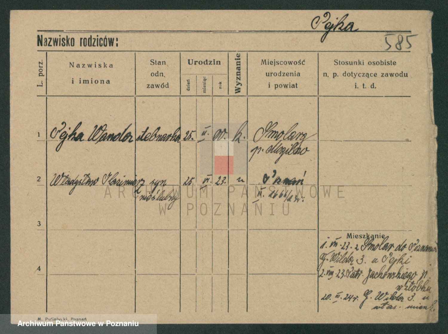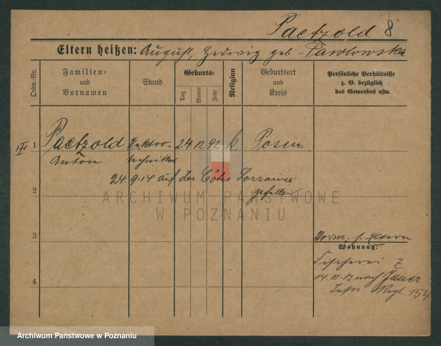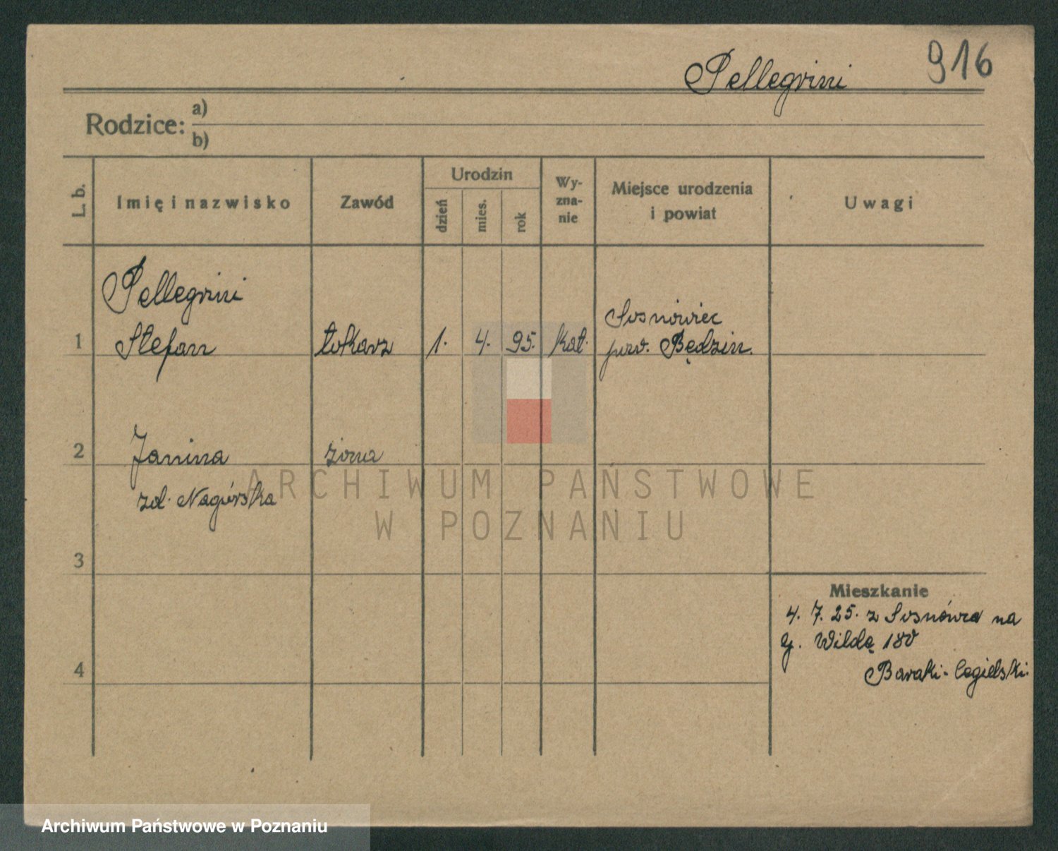 Podgląd karty osobowej dostępny jest po kliknięciu na nazwisko lub ikonkę karty. Można dokonywać powiększenia (ikony na górze) lub przechodzić między kolejnymi skanami (strzałki po bokach).