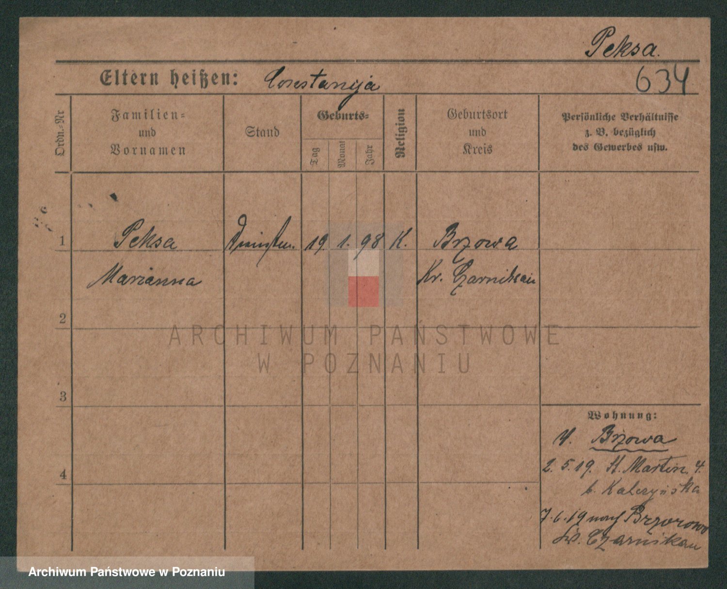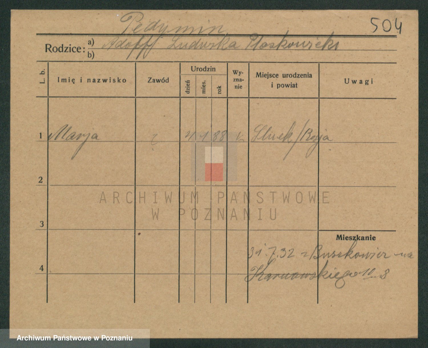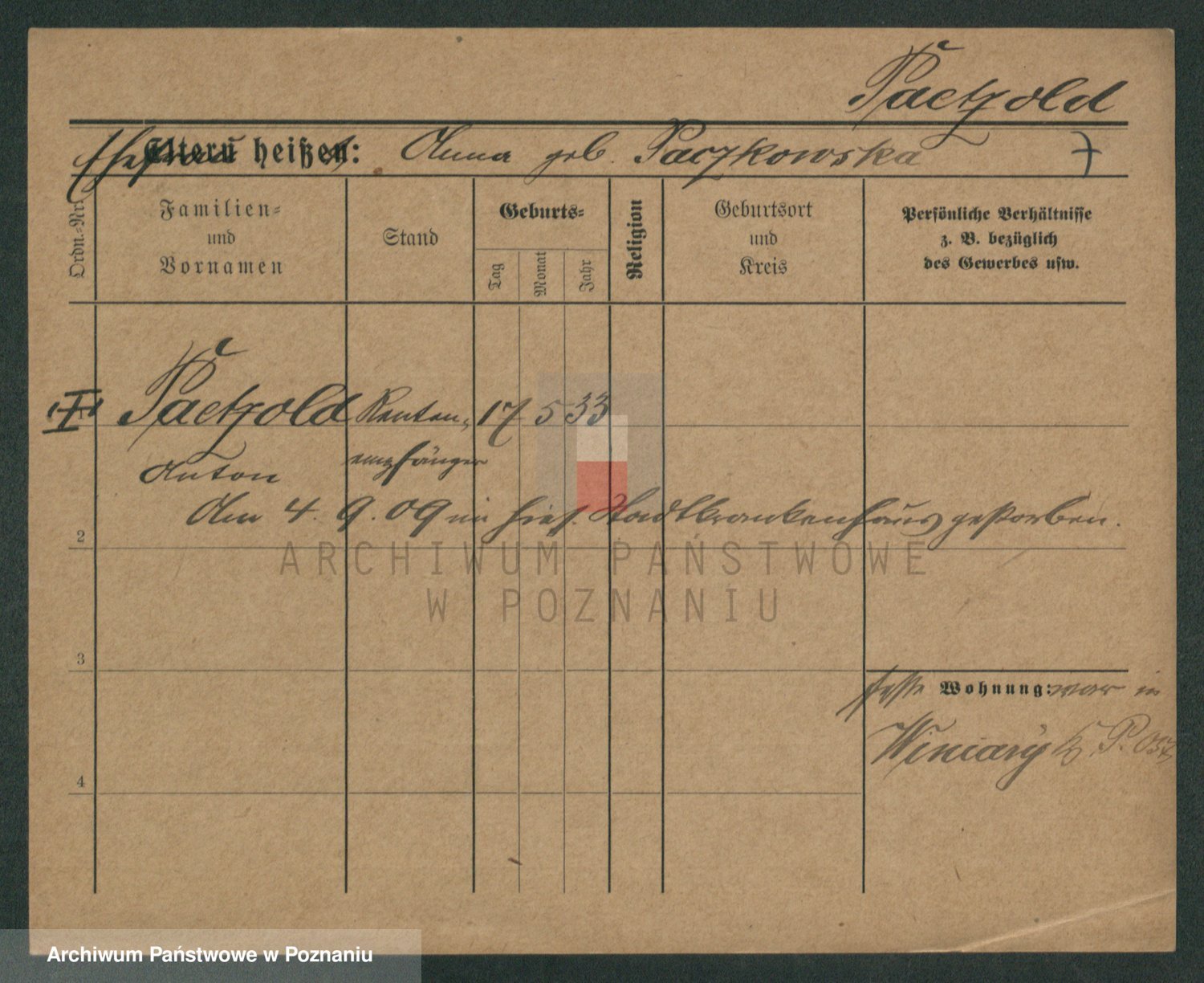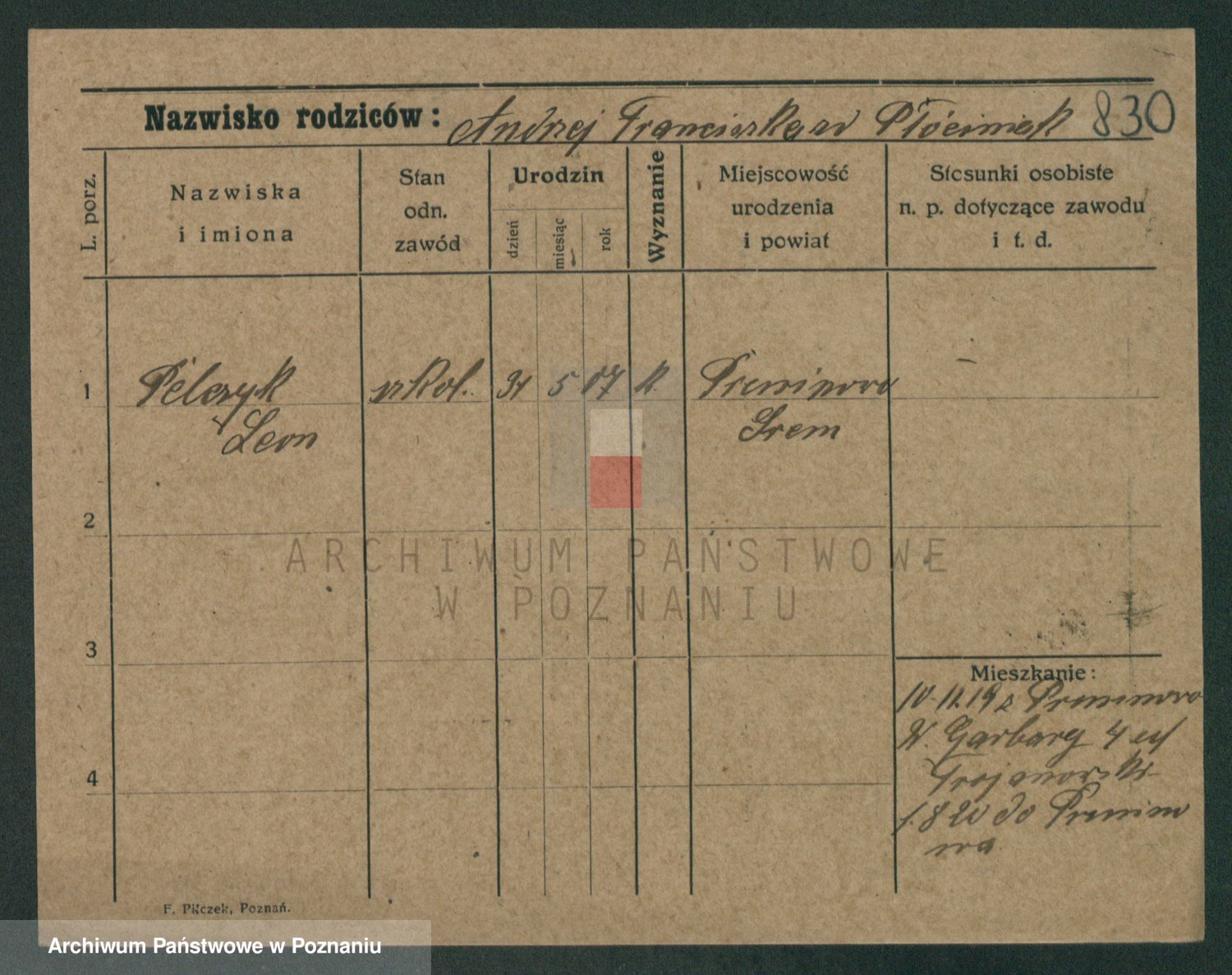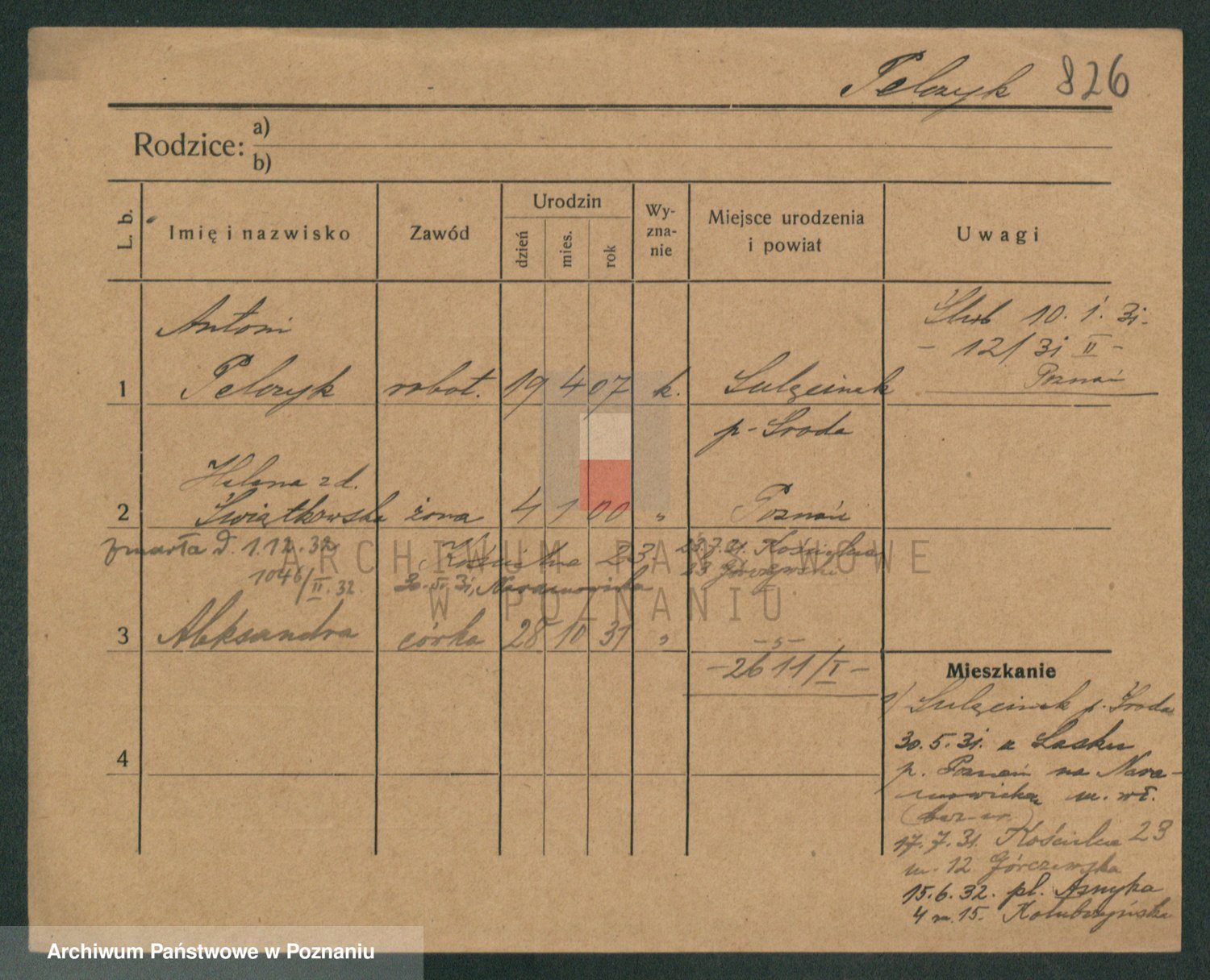 Podgląd karty osobowej dostępny jest po kliknięciu na nazwisko lub ikonkę karty. Można dokonywać powiększenia (ikony na górze) lub przechodzić między kolejnymi skanami (strzałki po bokach).