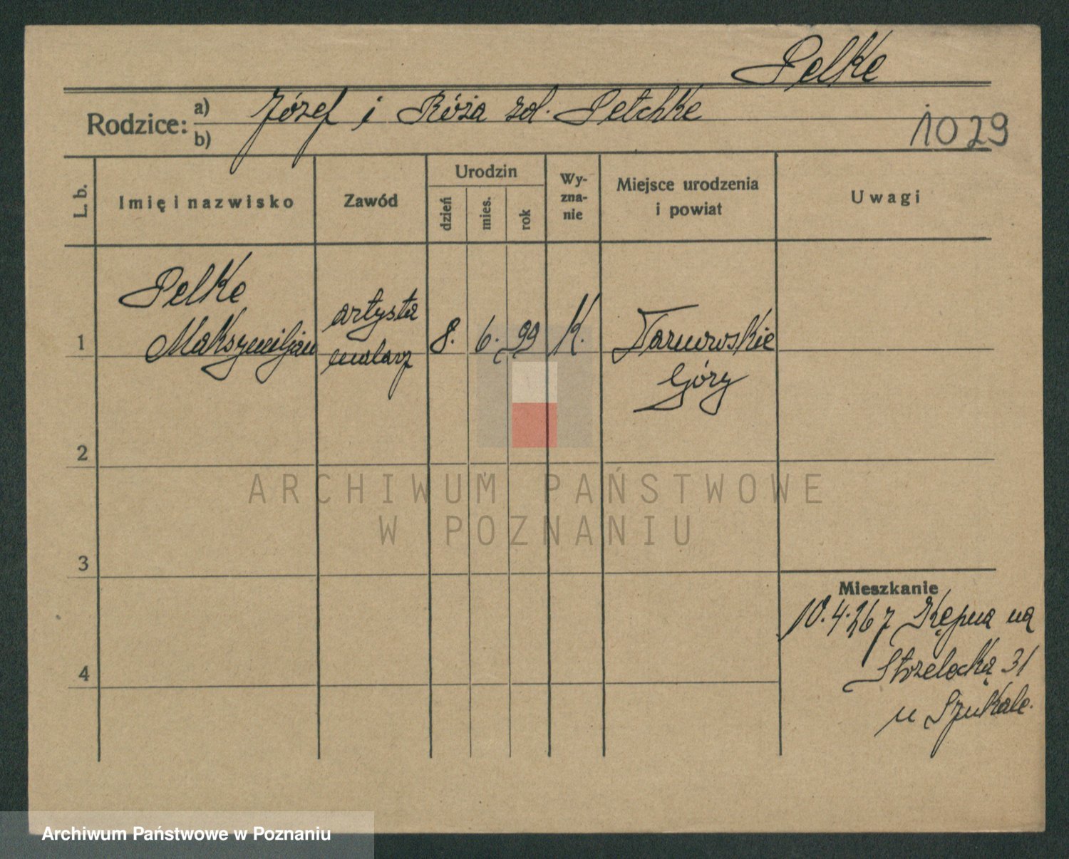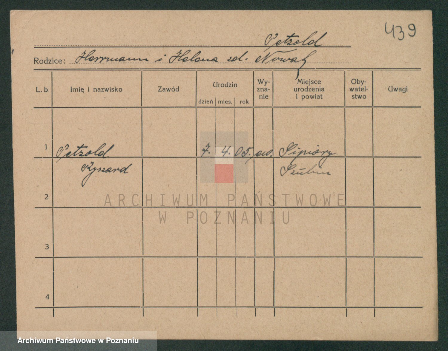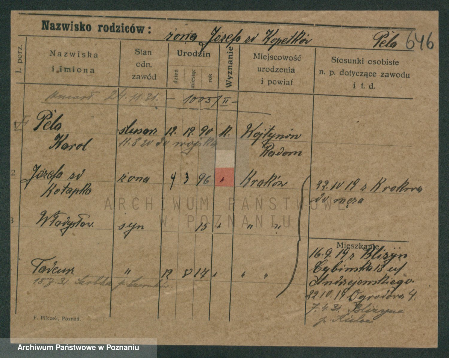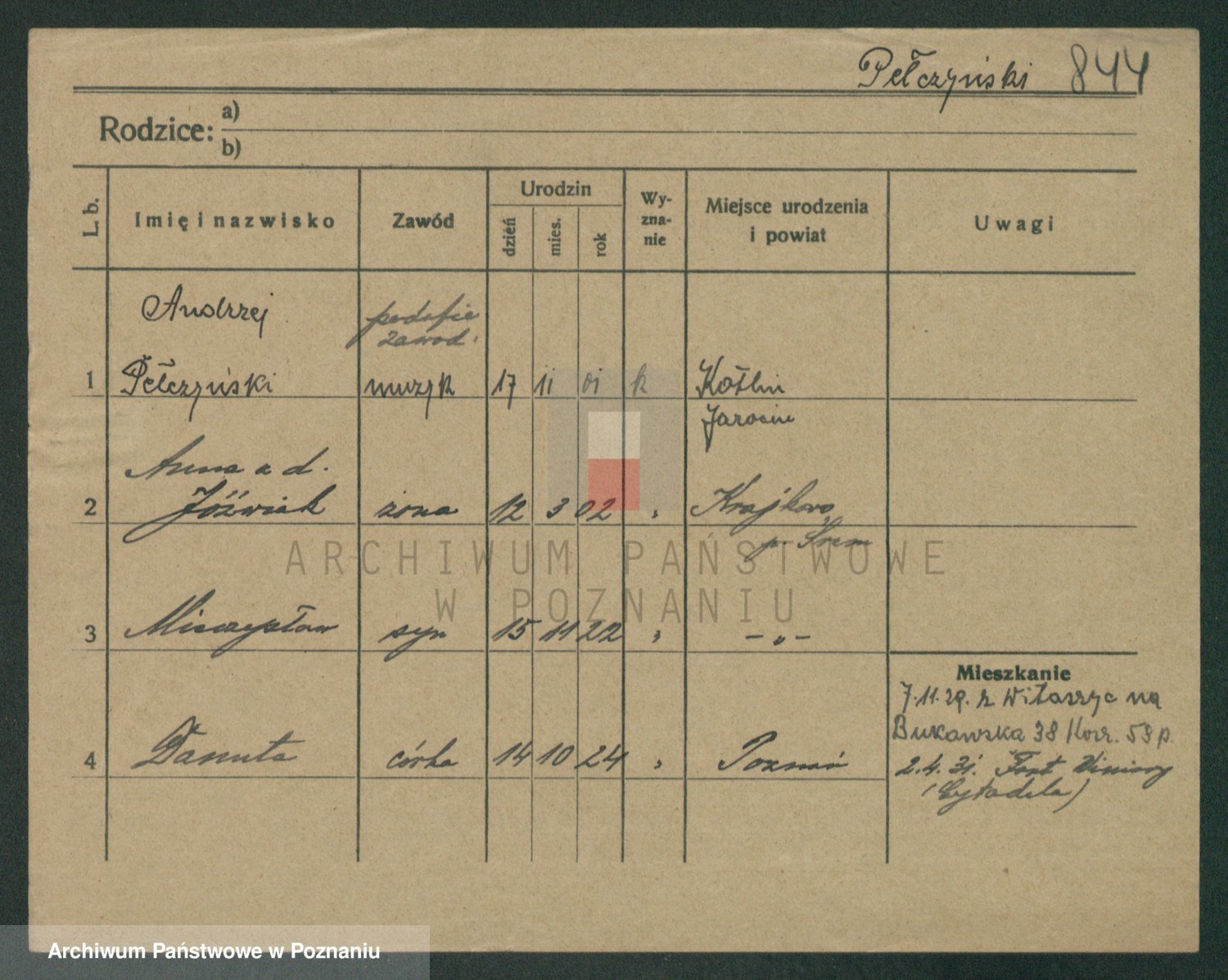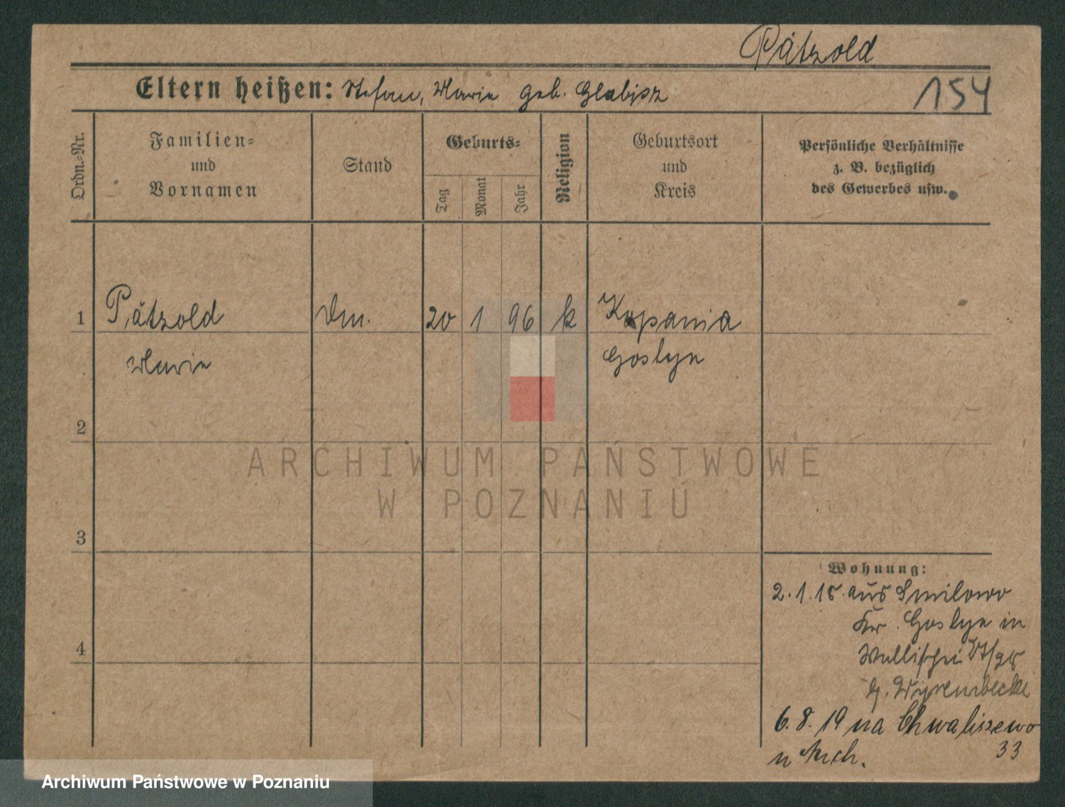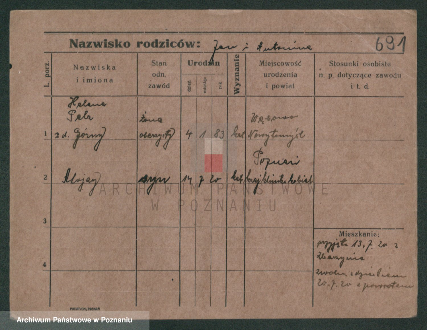 Podgląd karty osobowej dostępny jest po kliknięciu na nazwisko lub ikonkę karty. Można dokonywać powiększenia (ikony na górze) lub przechodzić między kolejnymi skanami (strzałki po bokach).