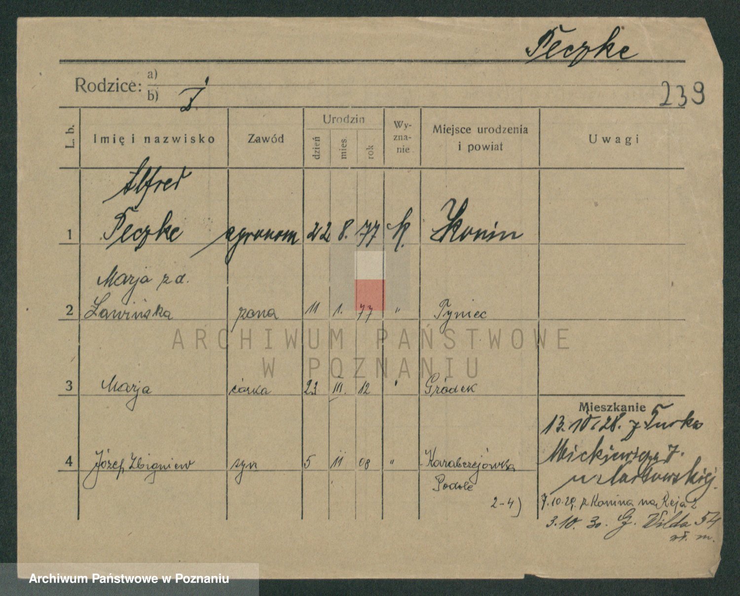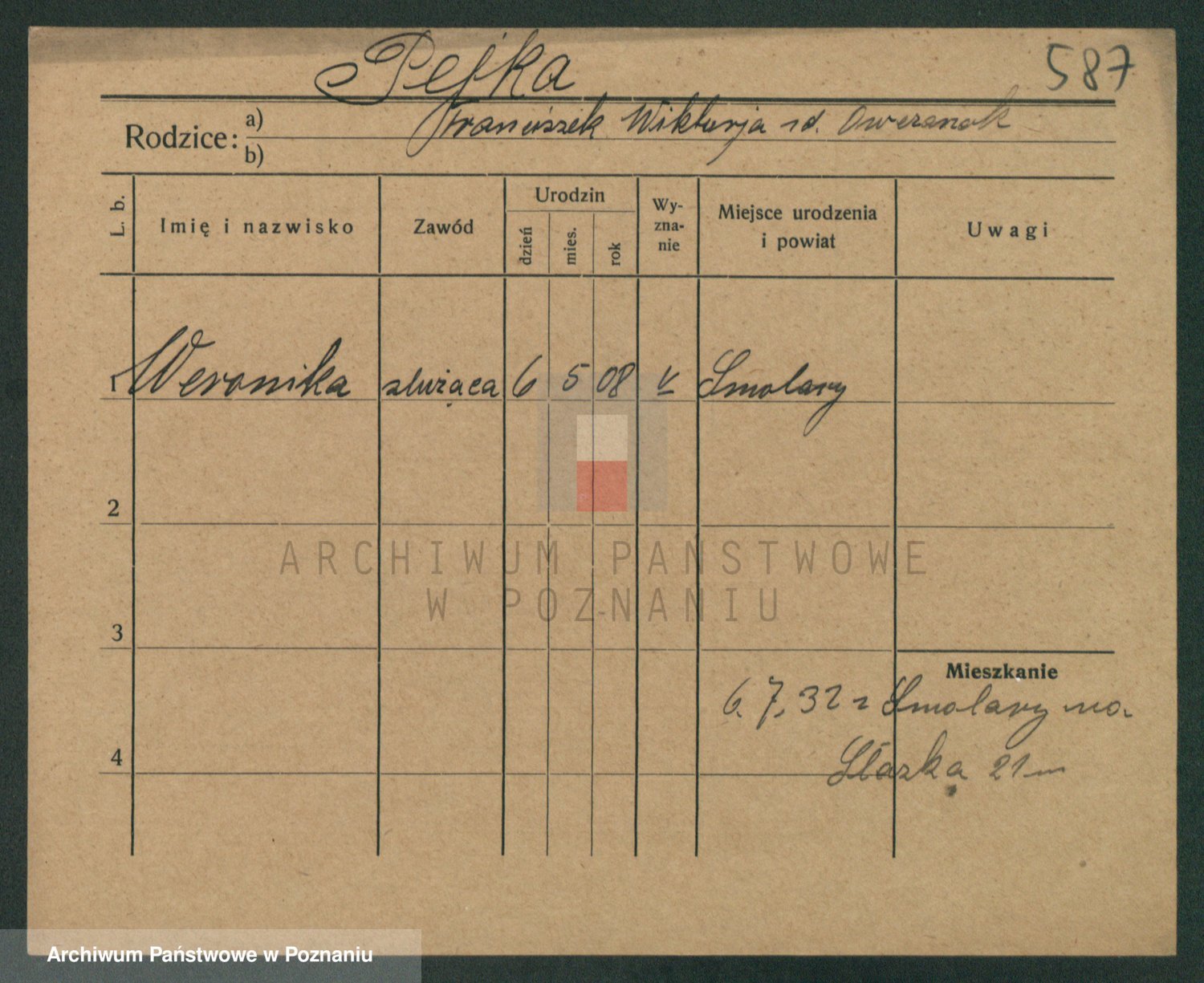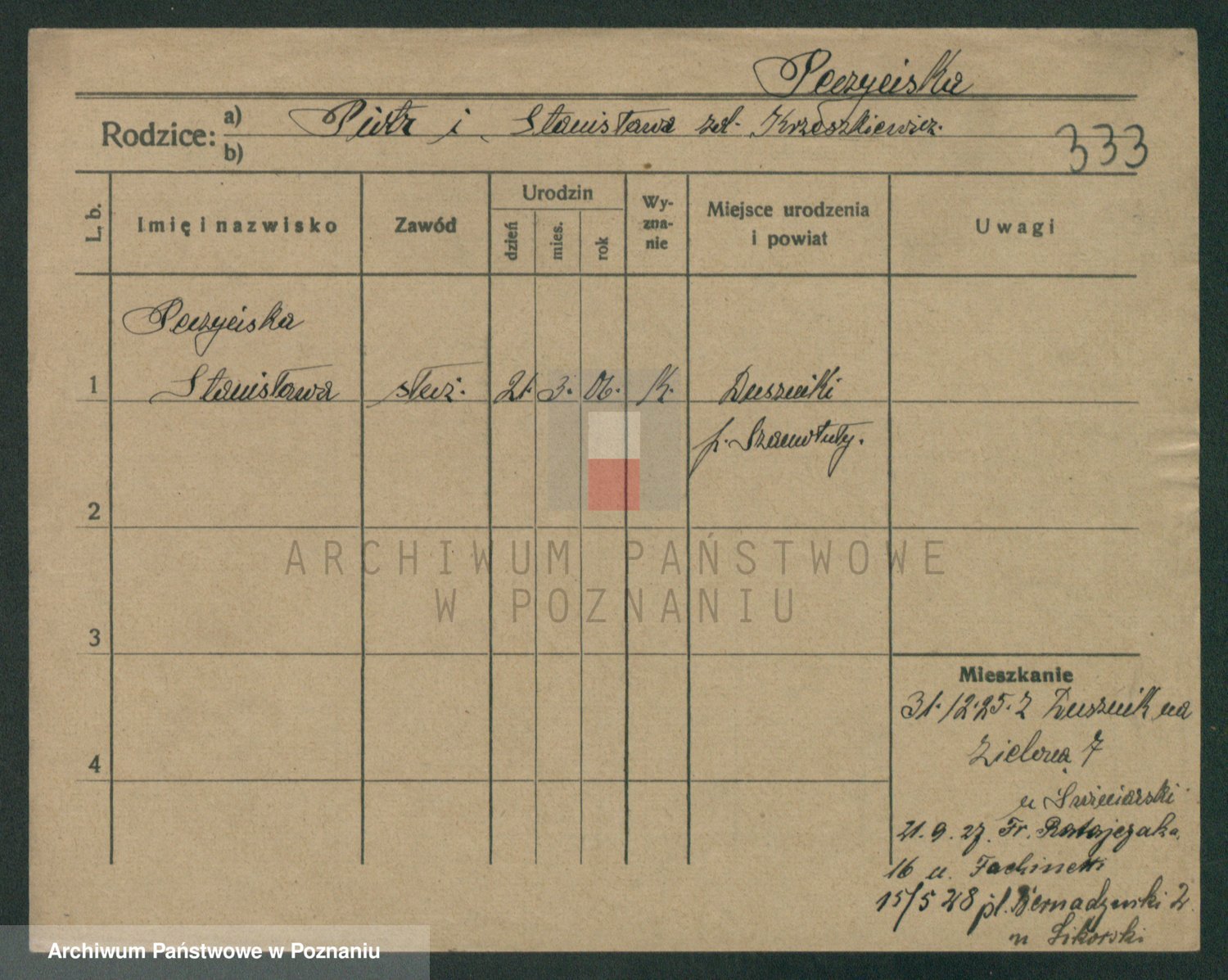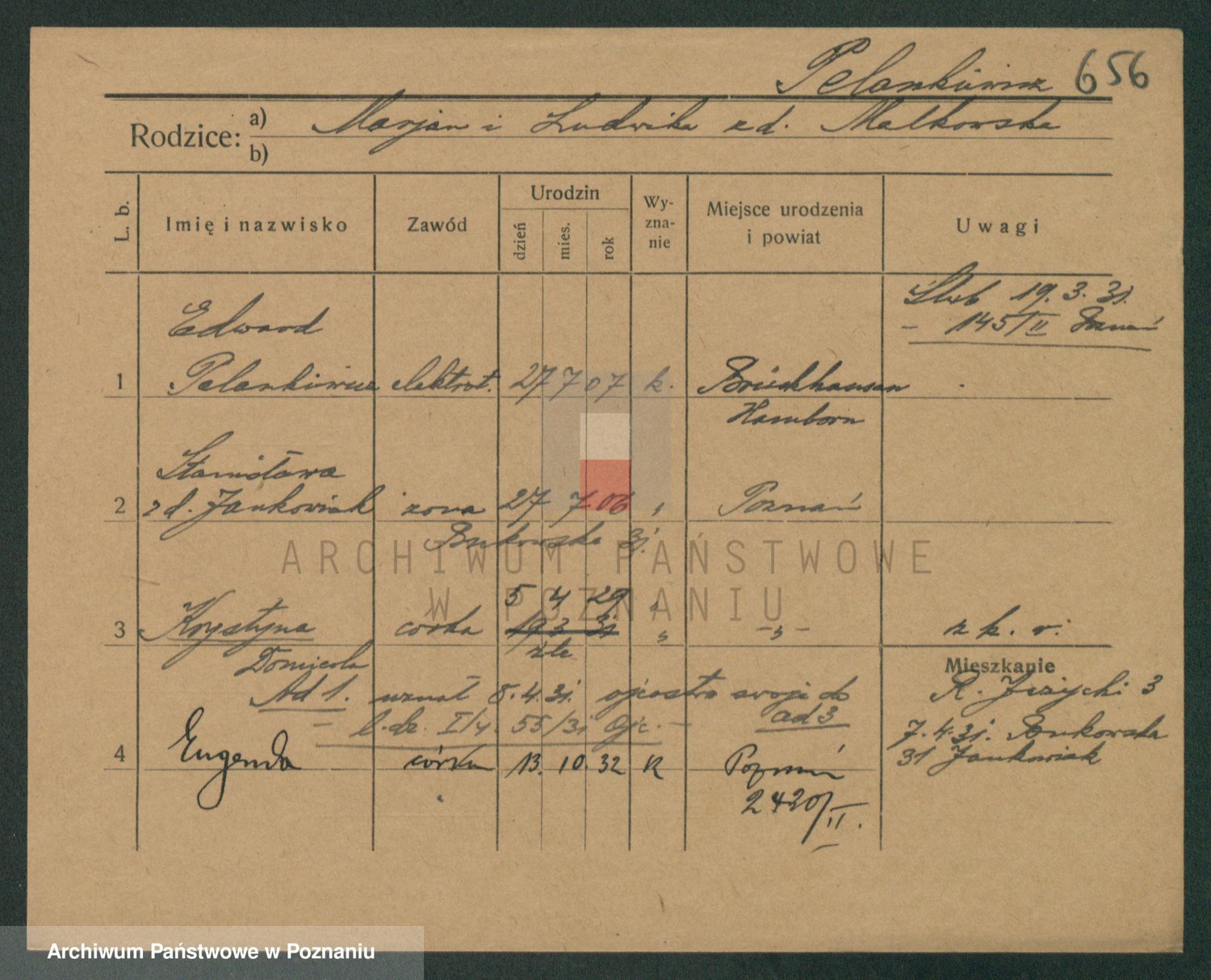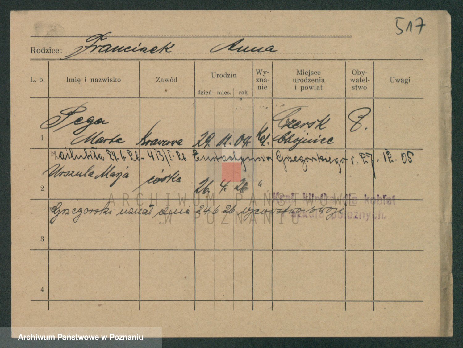 Podgląd karty osobowej dostępny jest po kliknięciu na nazwisko lub ikonkę karty. Można dokonywać powiększenia (ikony na górze) lub przechodzić między kolejnymi skanami (strzałki po bokach).
