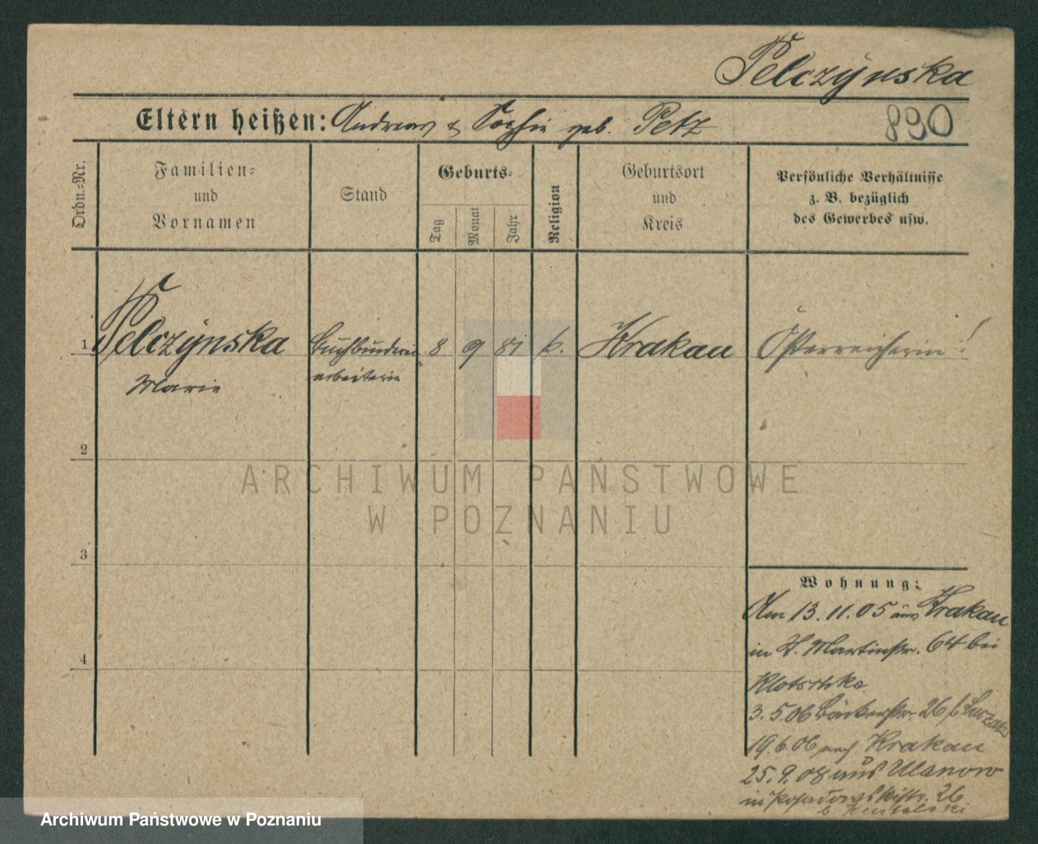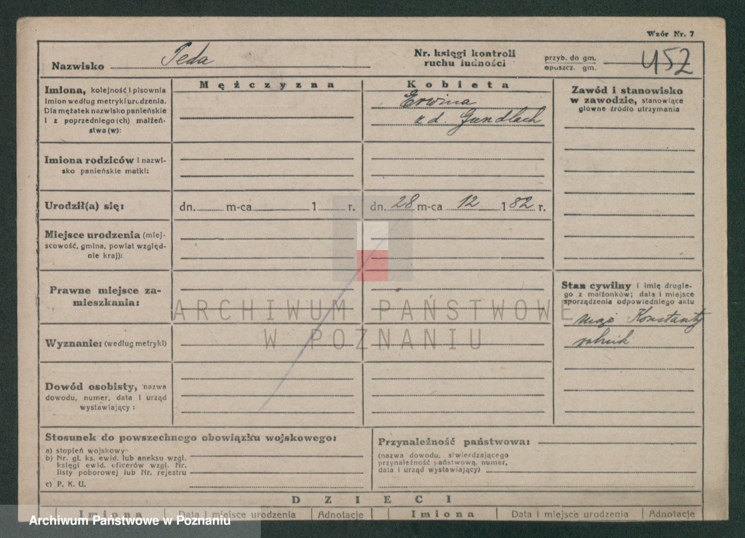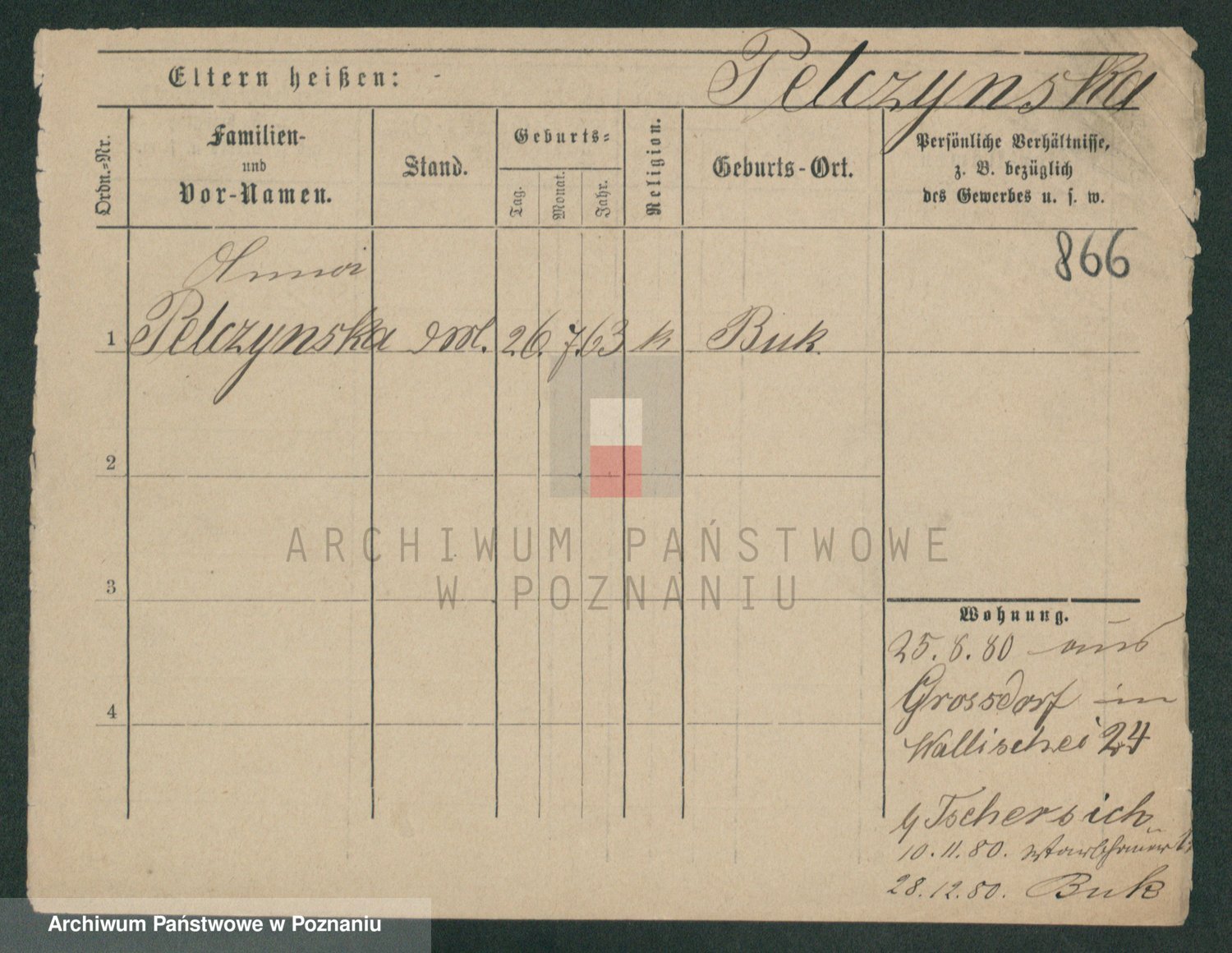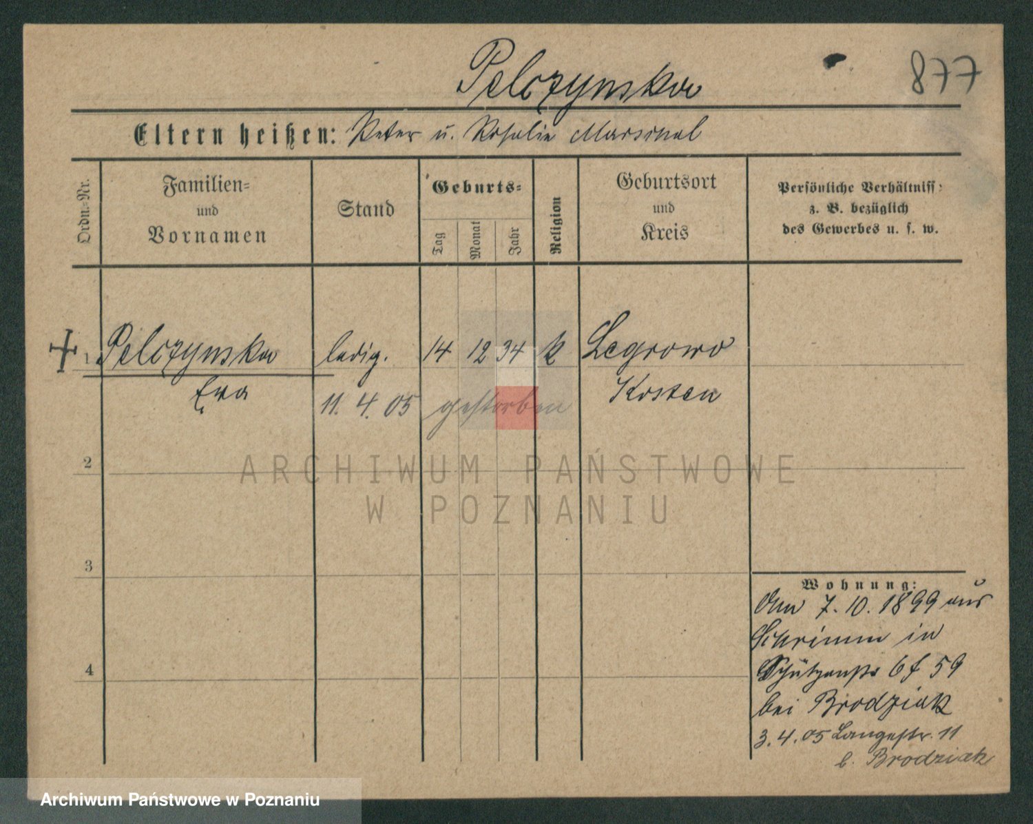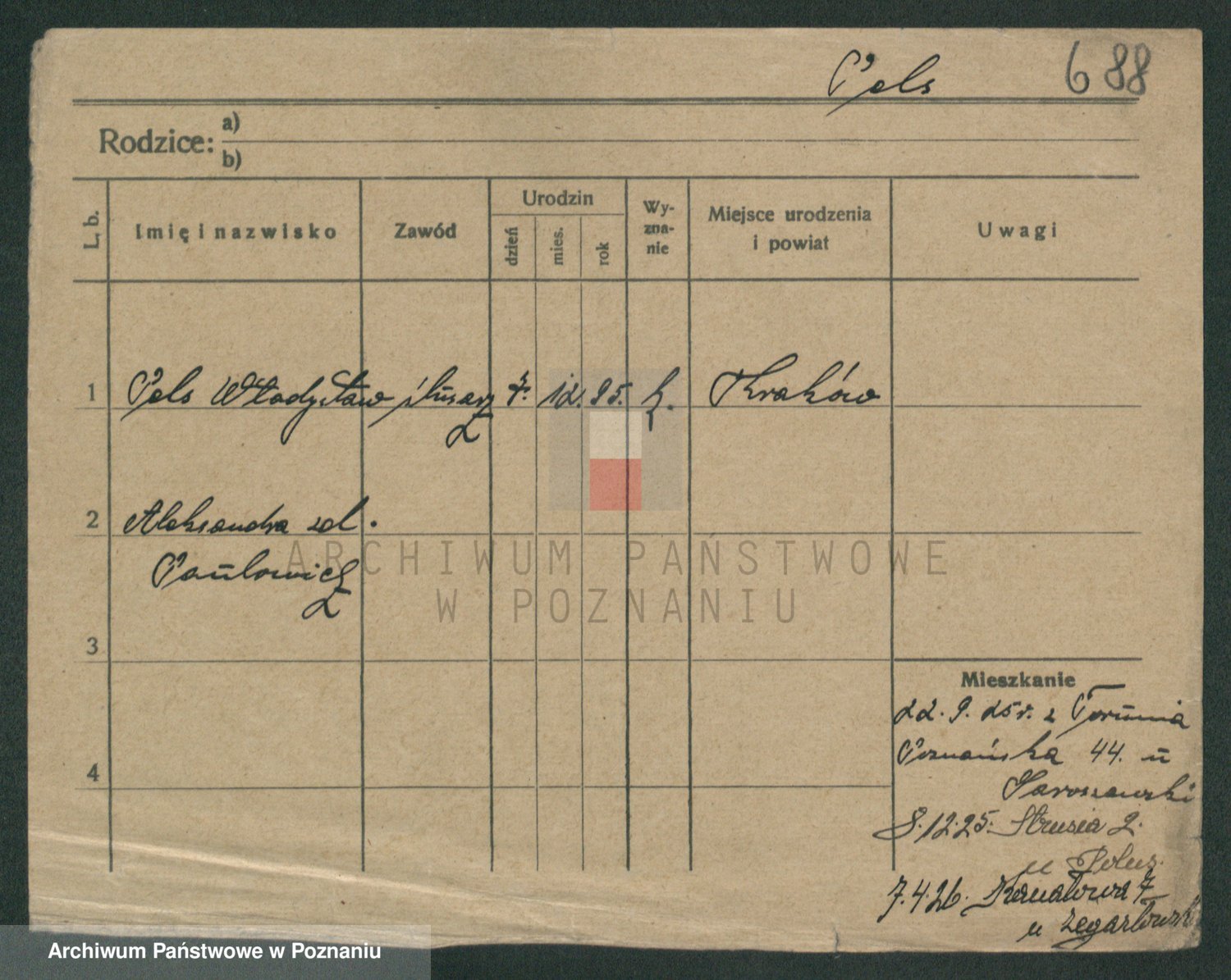 Podgląd karty osobowej dostępny jest po kliknięciu na nazwisko lub ikonkę karty. Można dokonywać powiększenia (ikony na górze) lub przechodzić między kolejnymi skanami (strzałki po bokach).