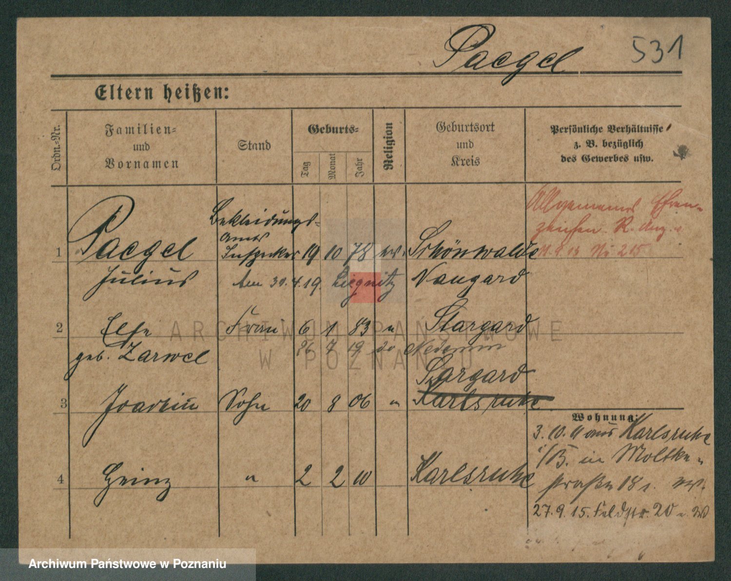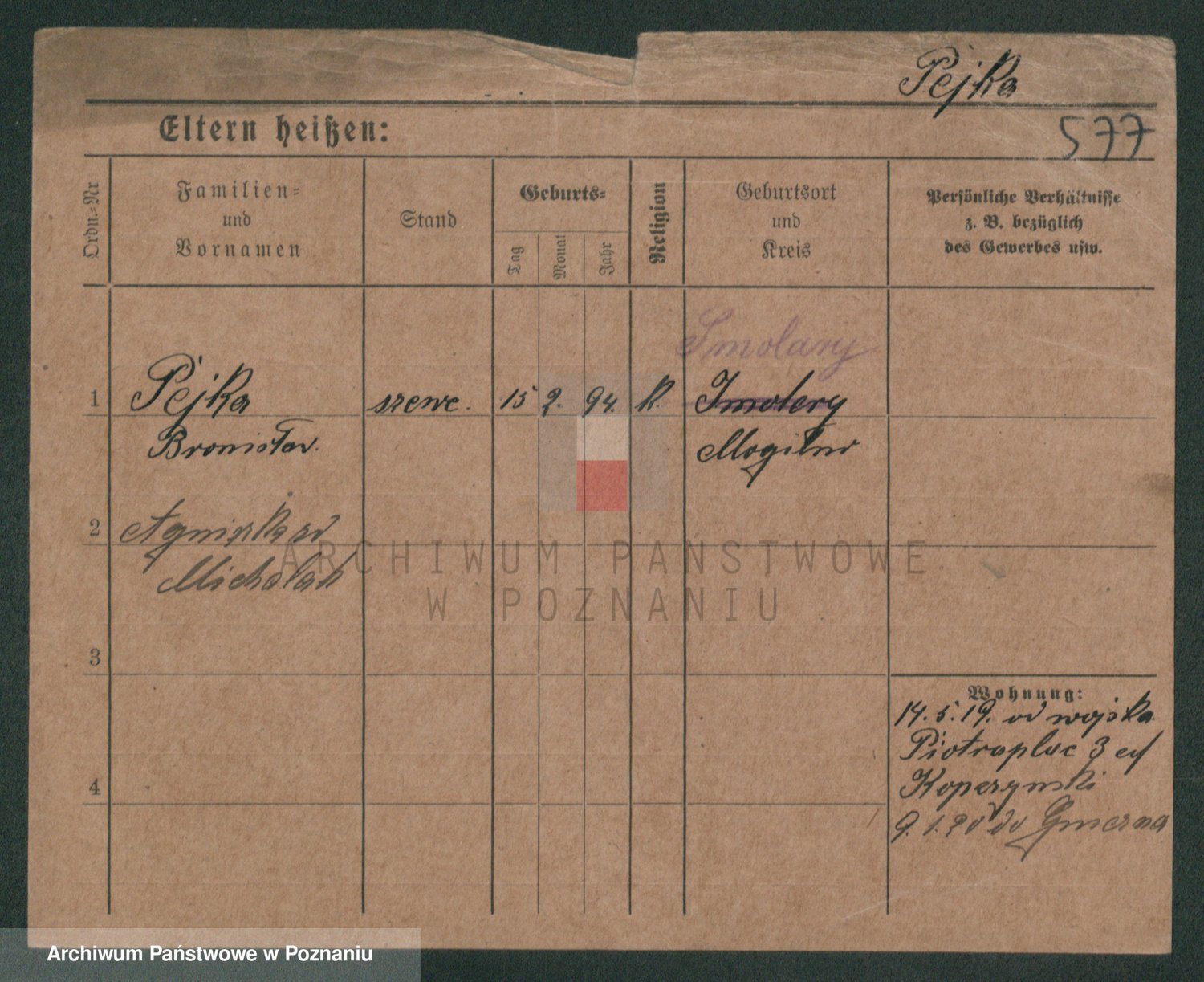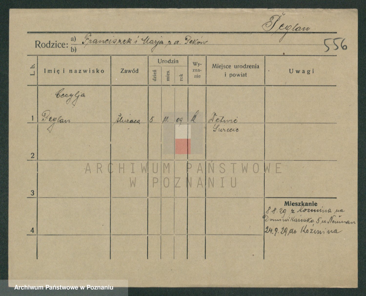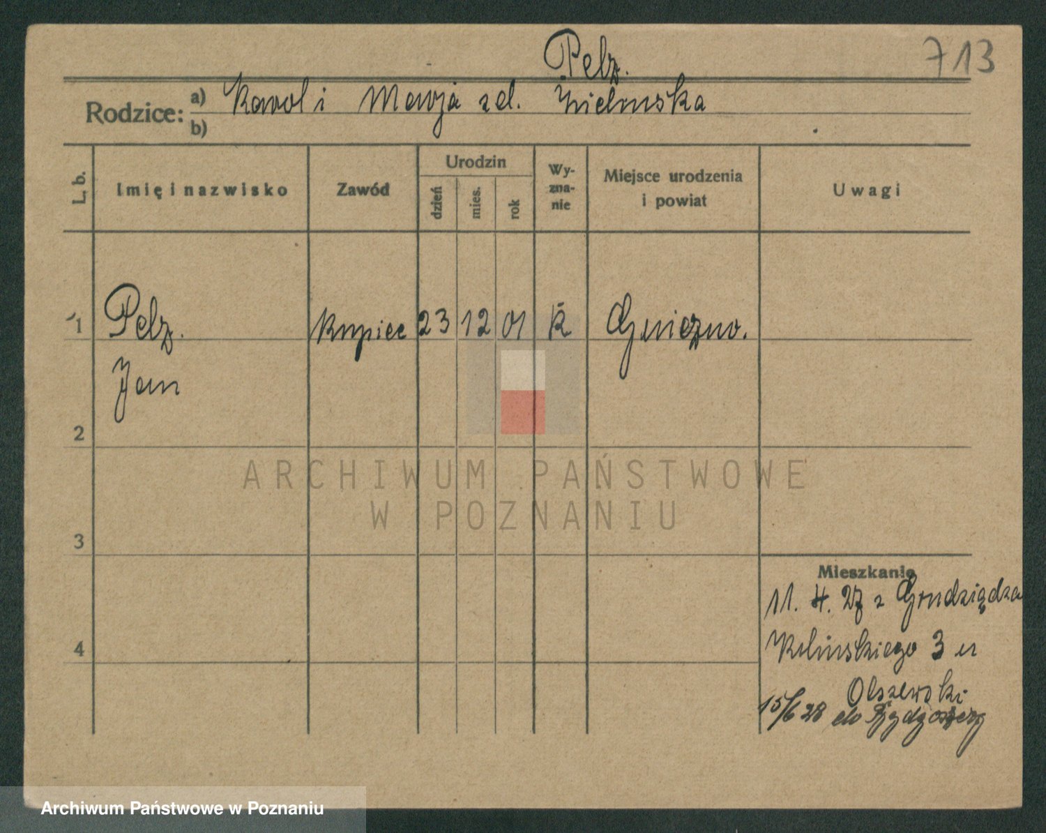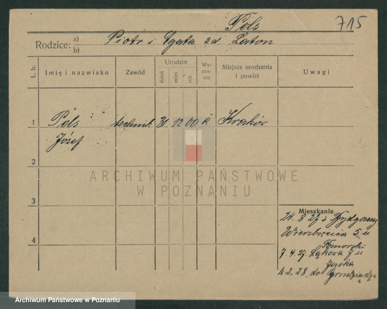 Podgląd karty osobowej dostępny jest po kliknięciu na nazwisko lub ikonkę karty. Można dokonywać powiększenia (ikony na górze) lub przechodzić między kolejnymi skanami (strzałki po bokach).