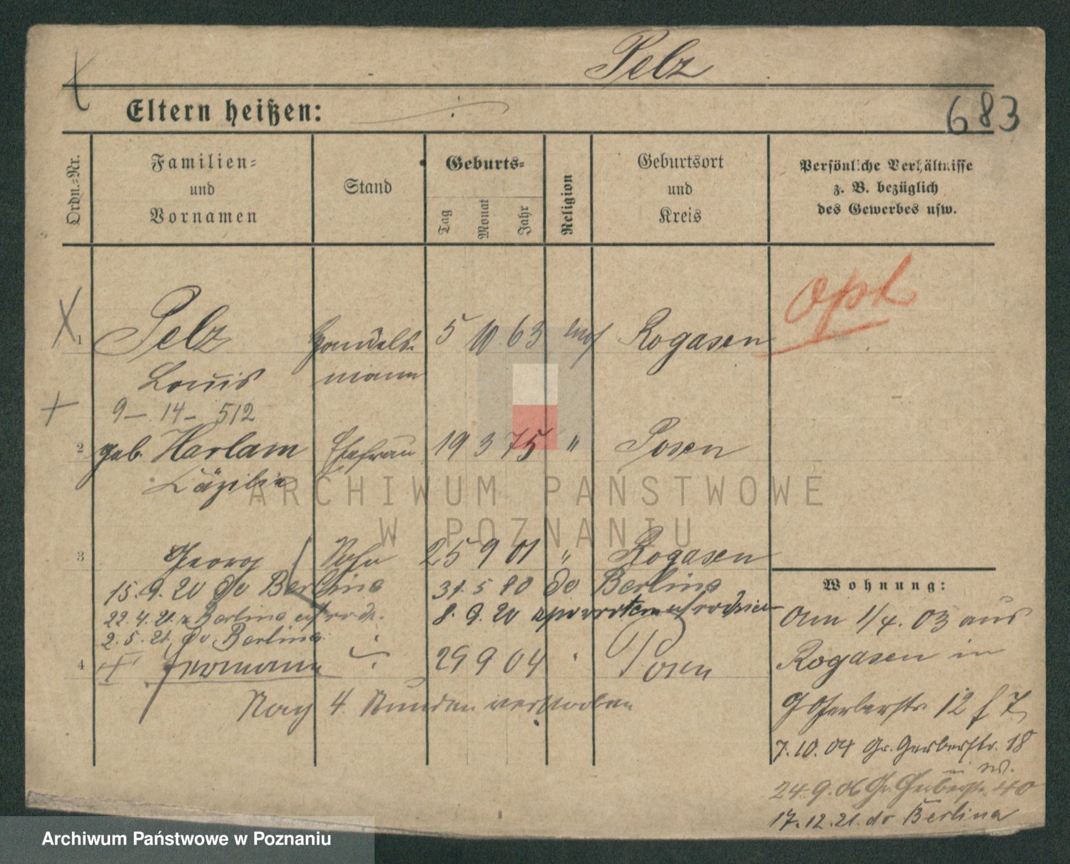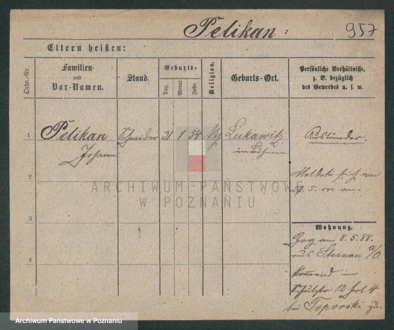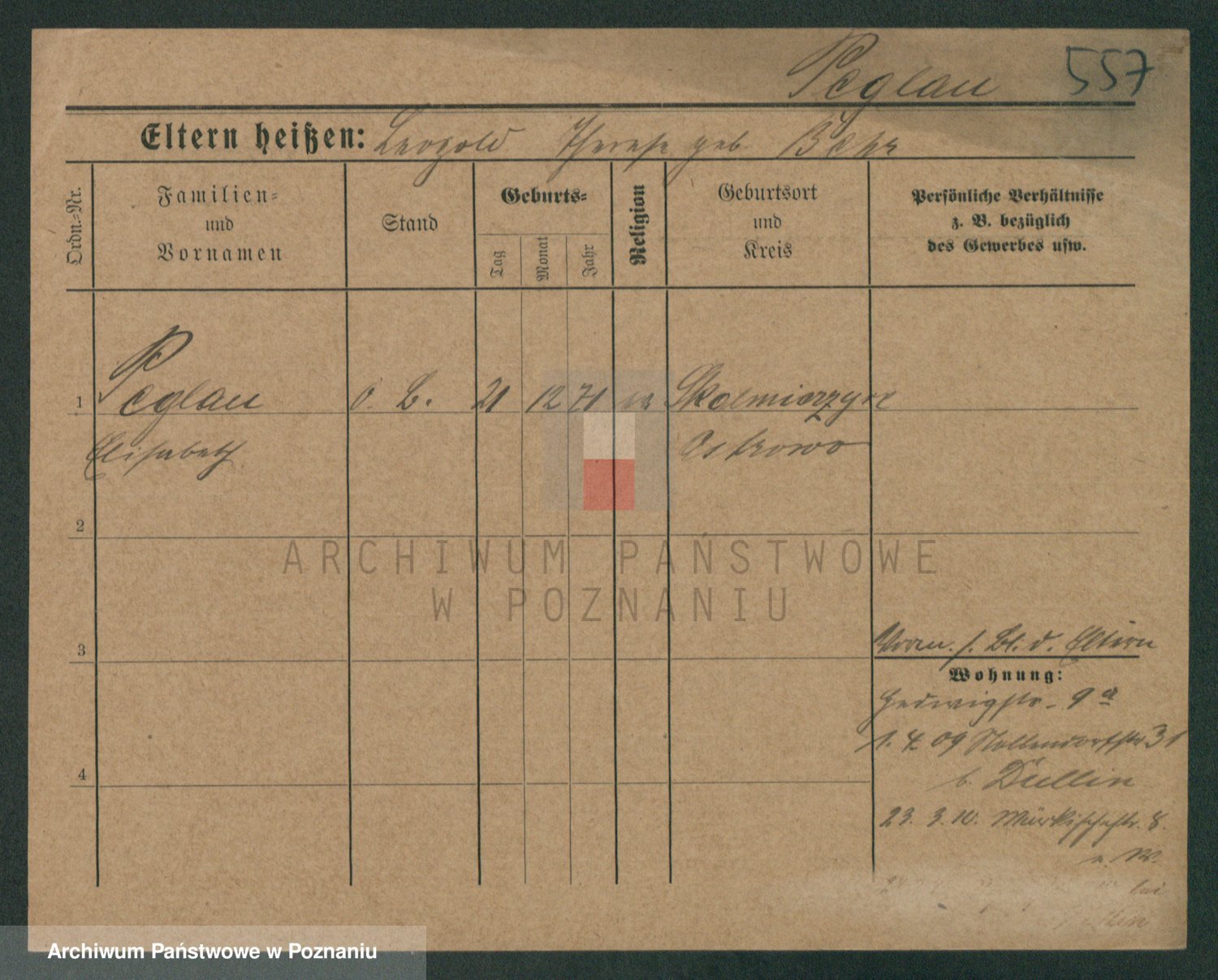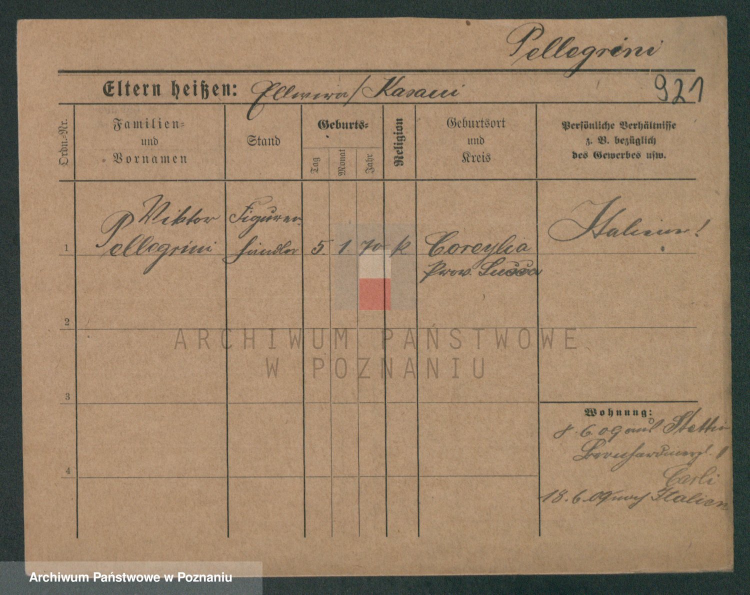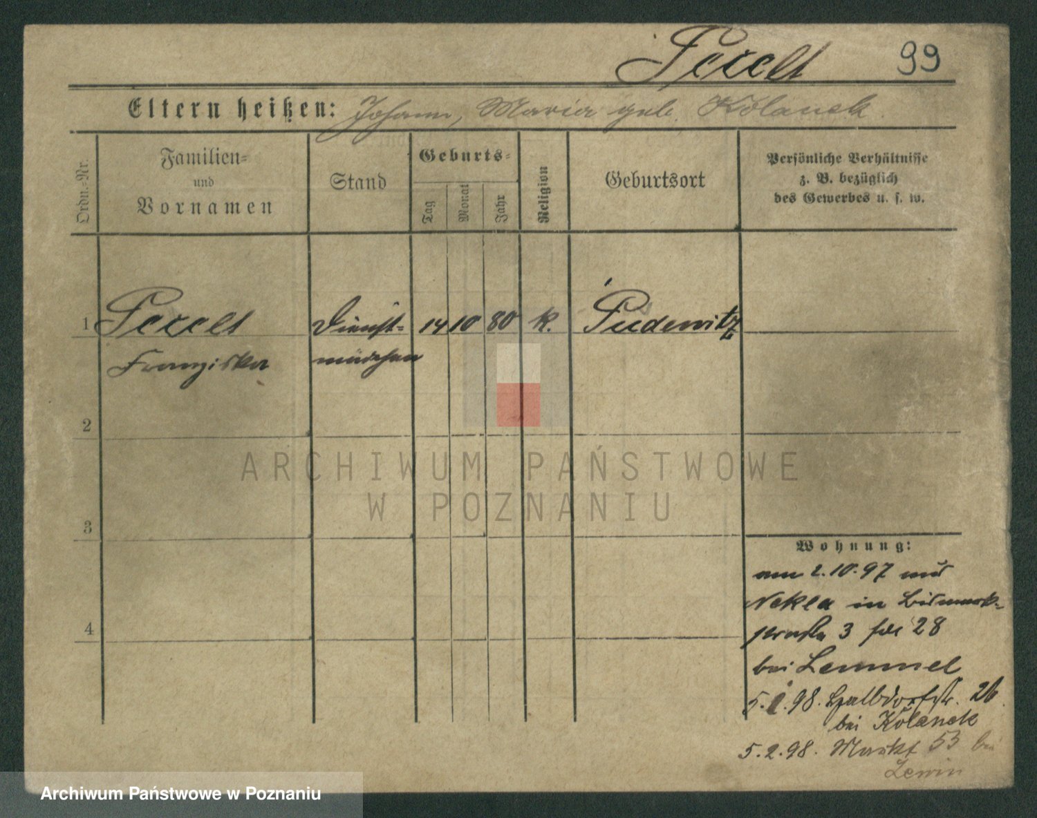 Podgląd karty osobowej dostępny jest po kliknięciu na nazwisko lub ikonkę karty. Można dokonywać powiększenia (ikony na górze) lub przechodzić między kolejnymi skanami (strzałki po bokach).