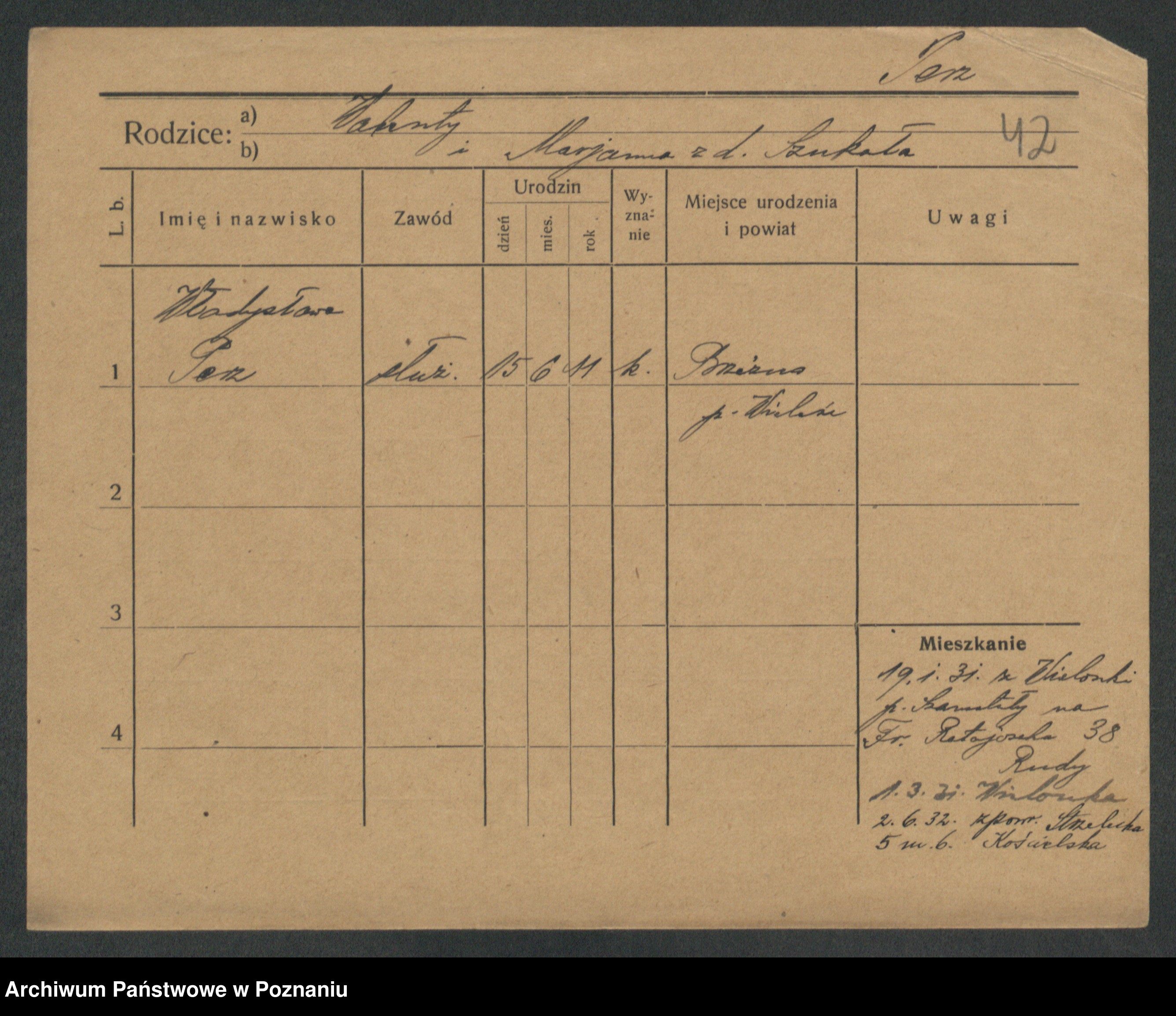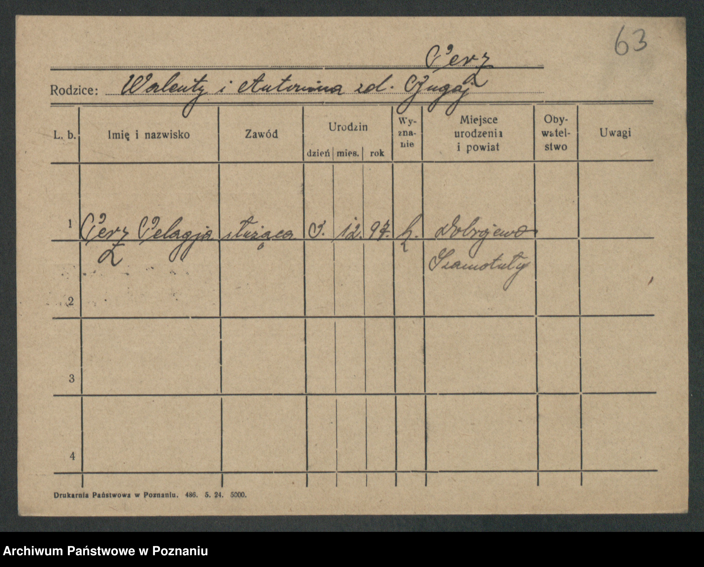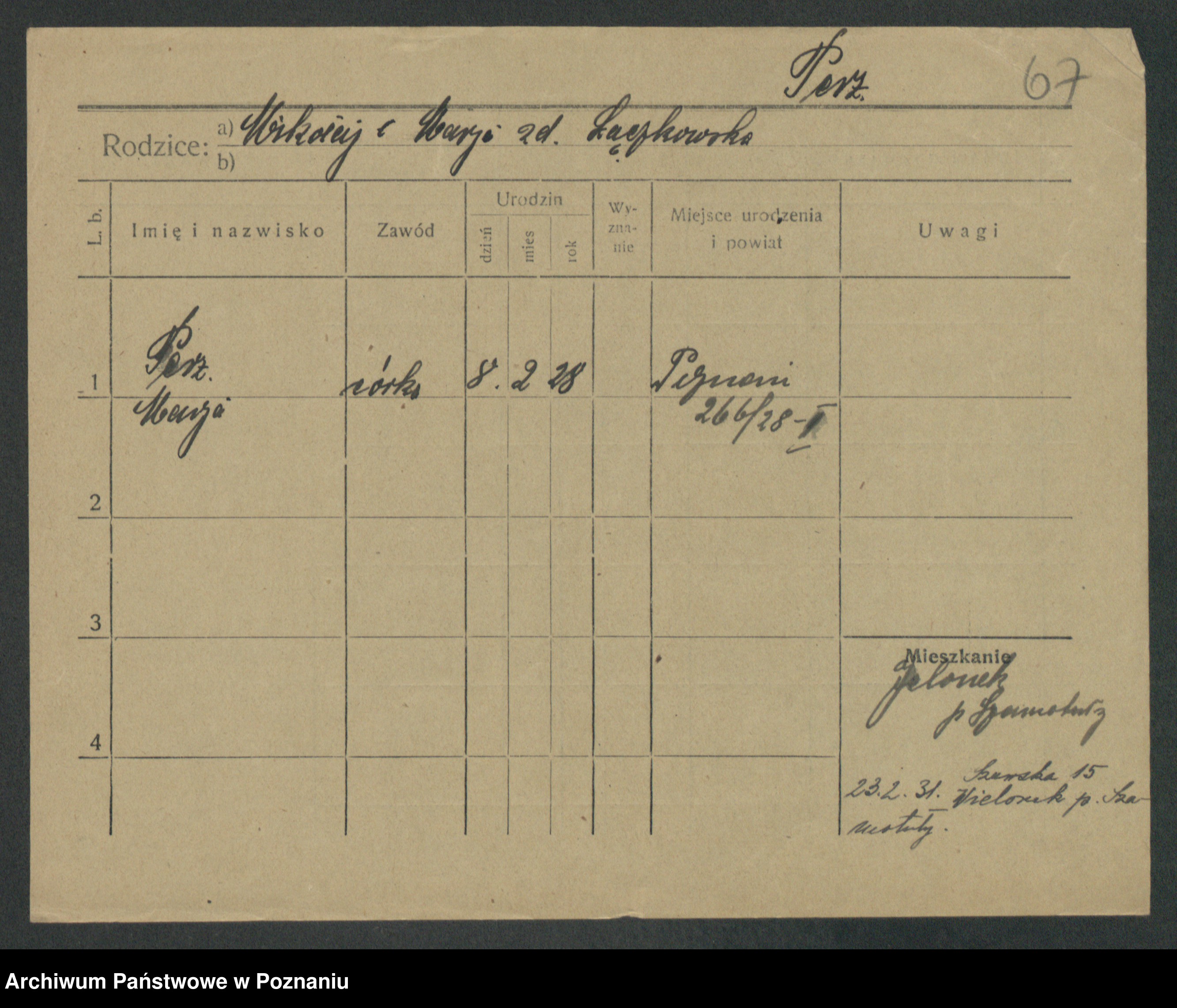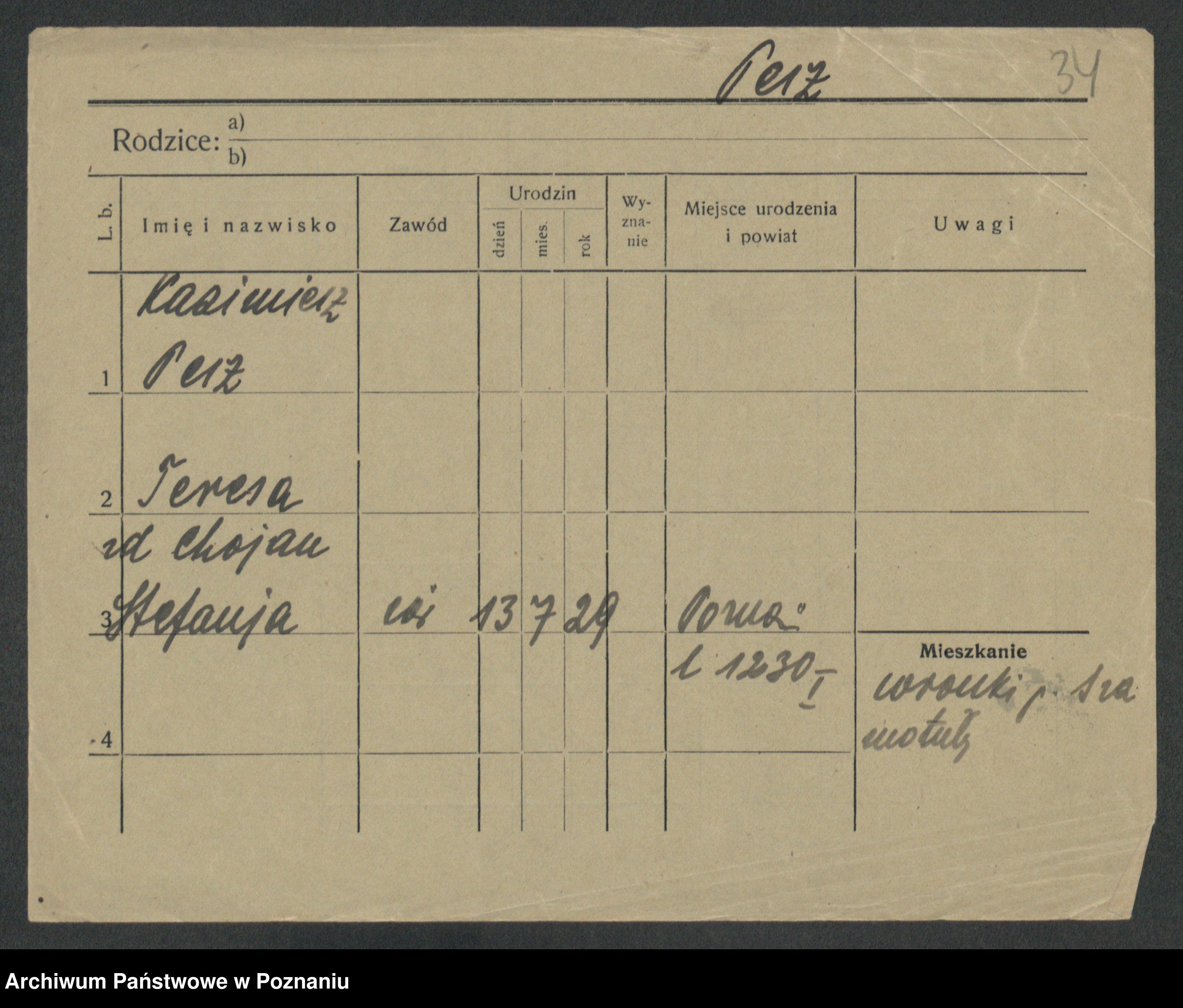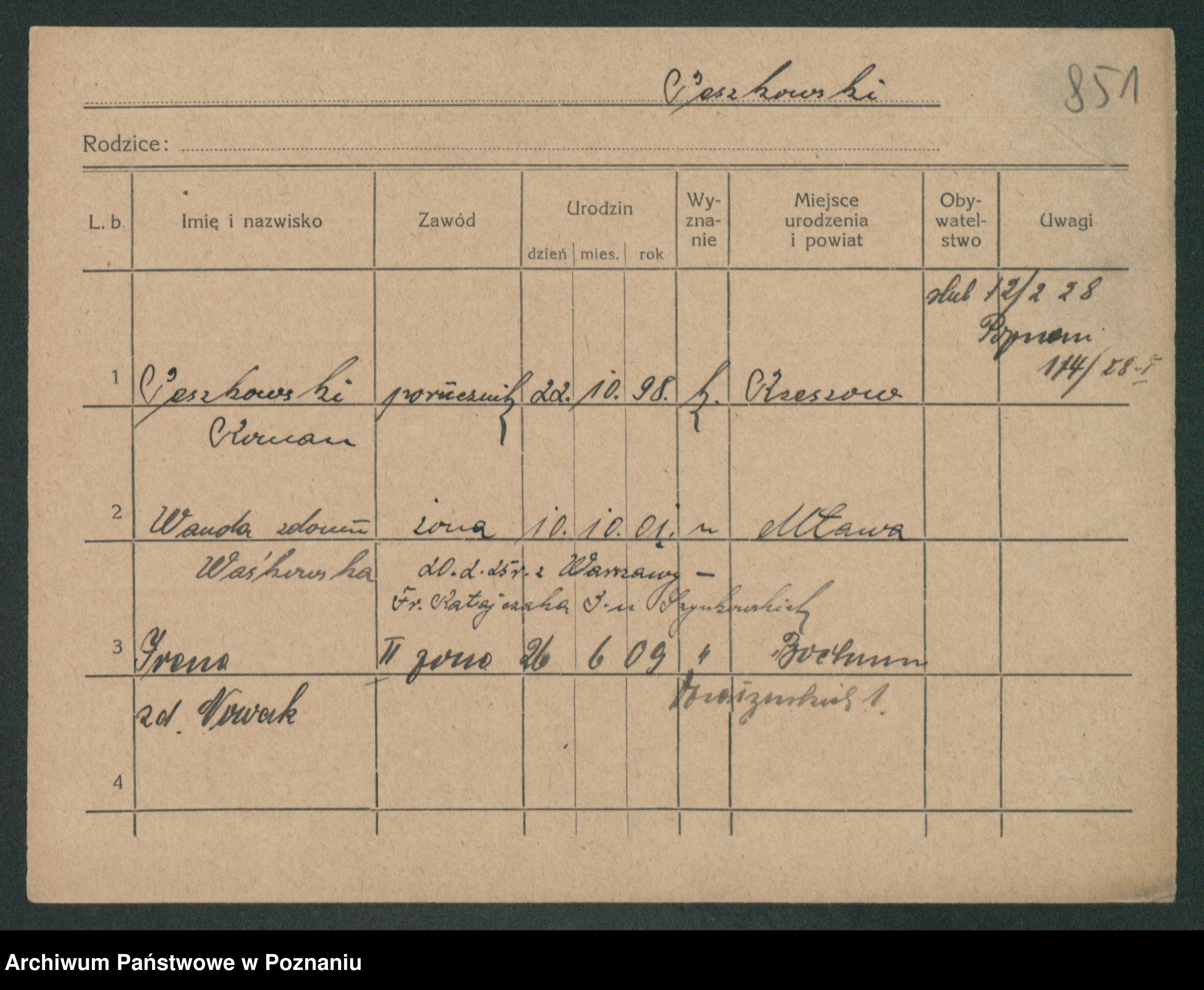 Podgląd karty osobowej dostępny jest po kliknięciu na nazwisko lub ikonkę karty. Można dokonywać powiększenia (ikony na górze) lub przechodzić między kolejnymi skanami (strzałki po bokach).