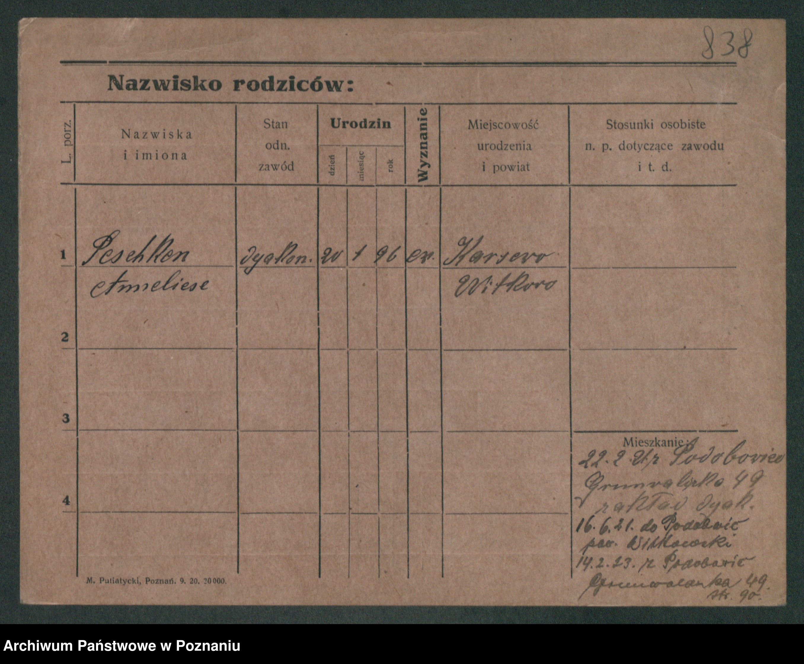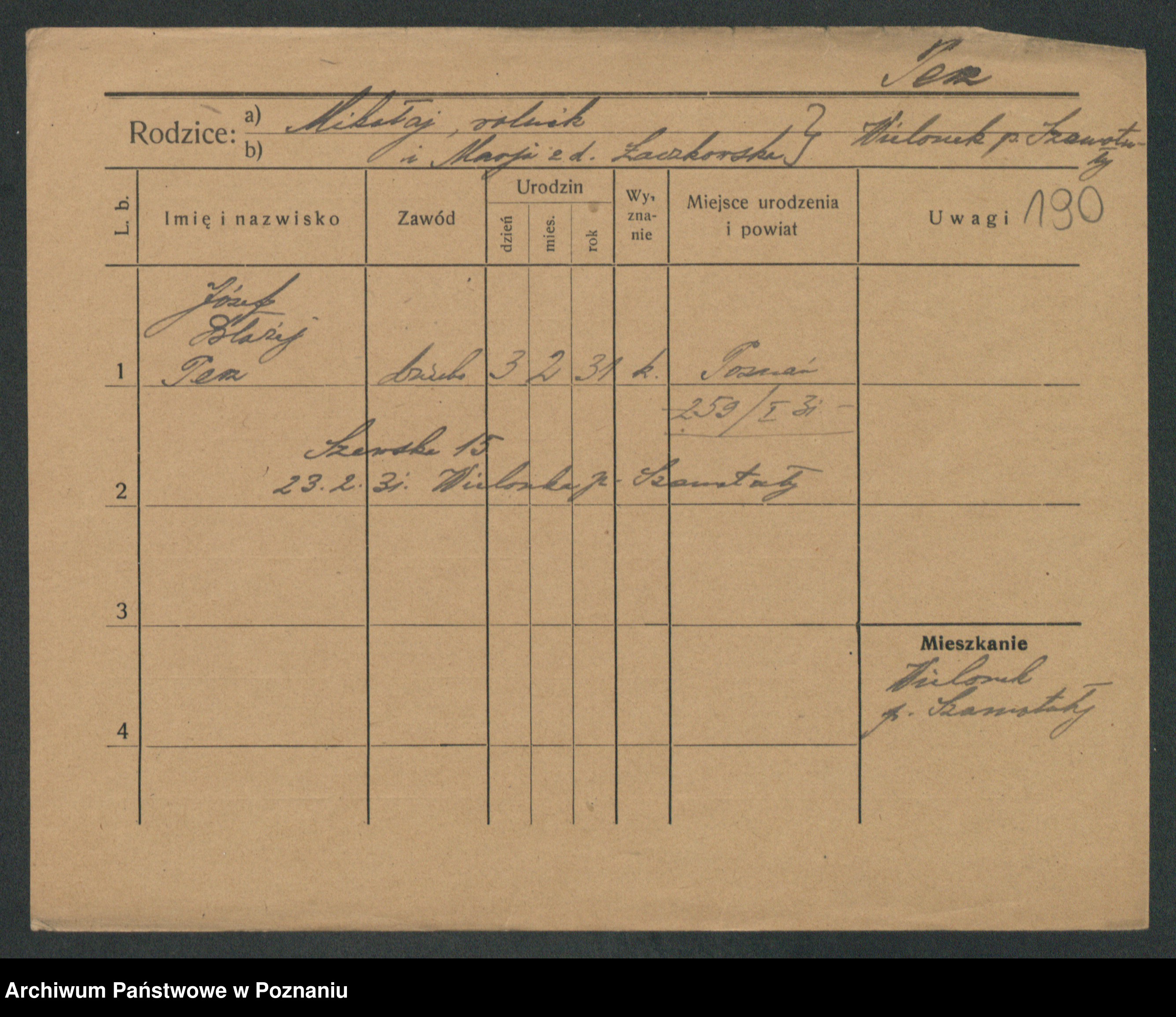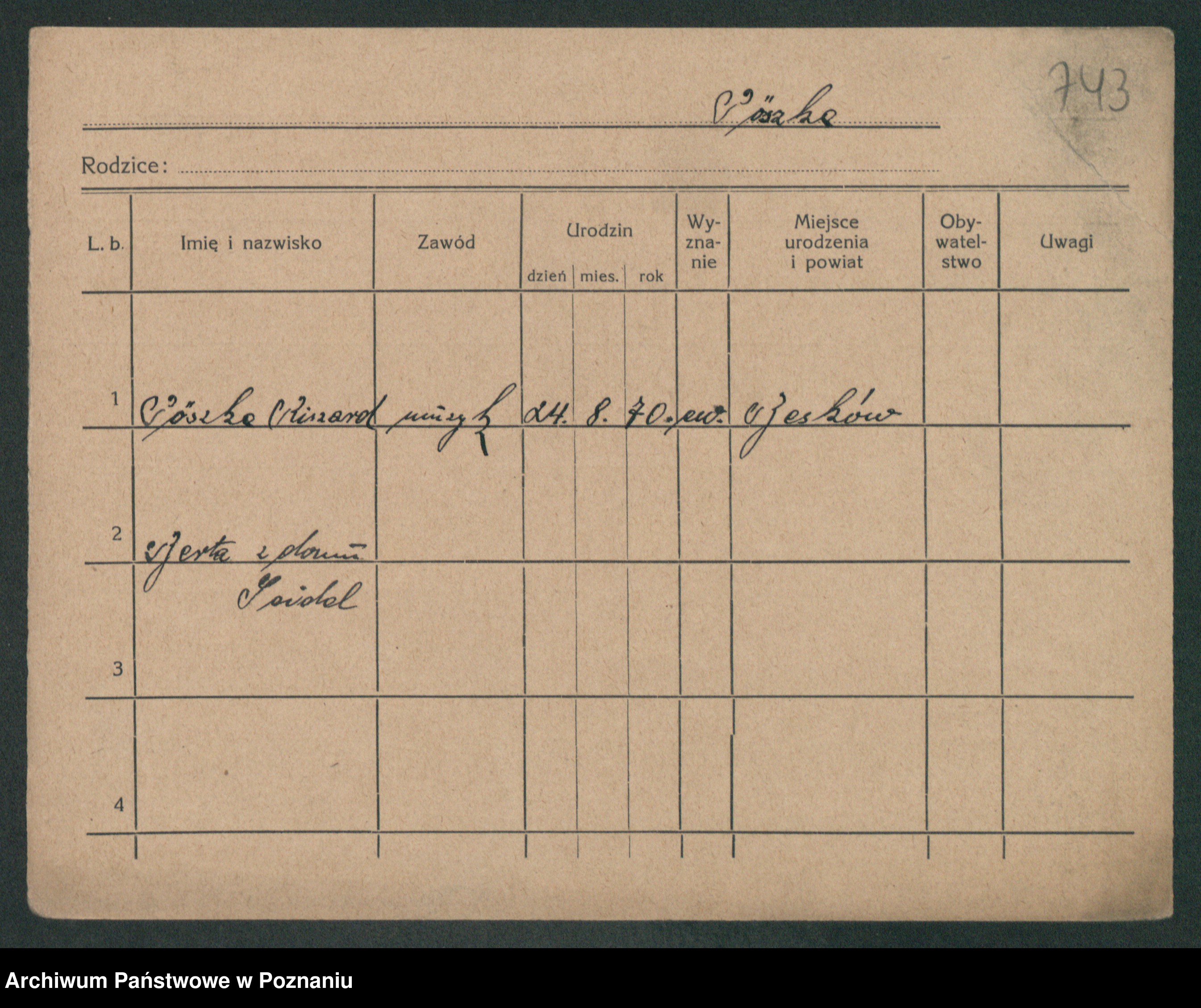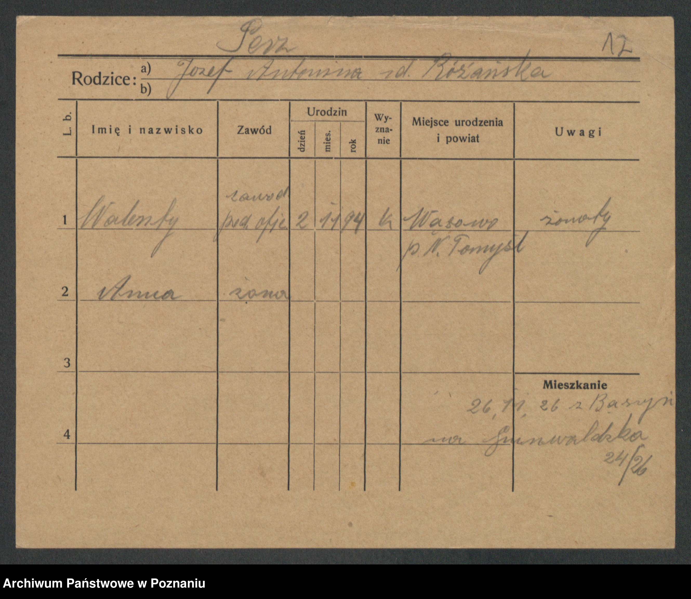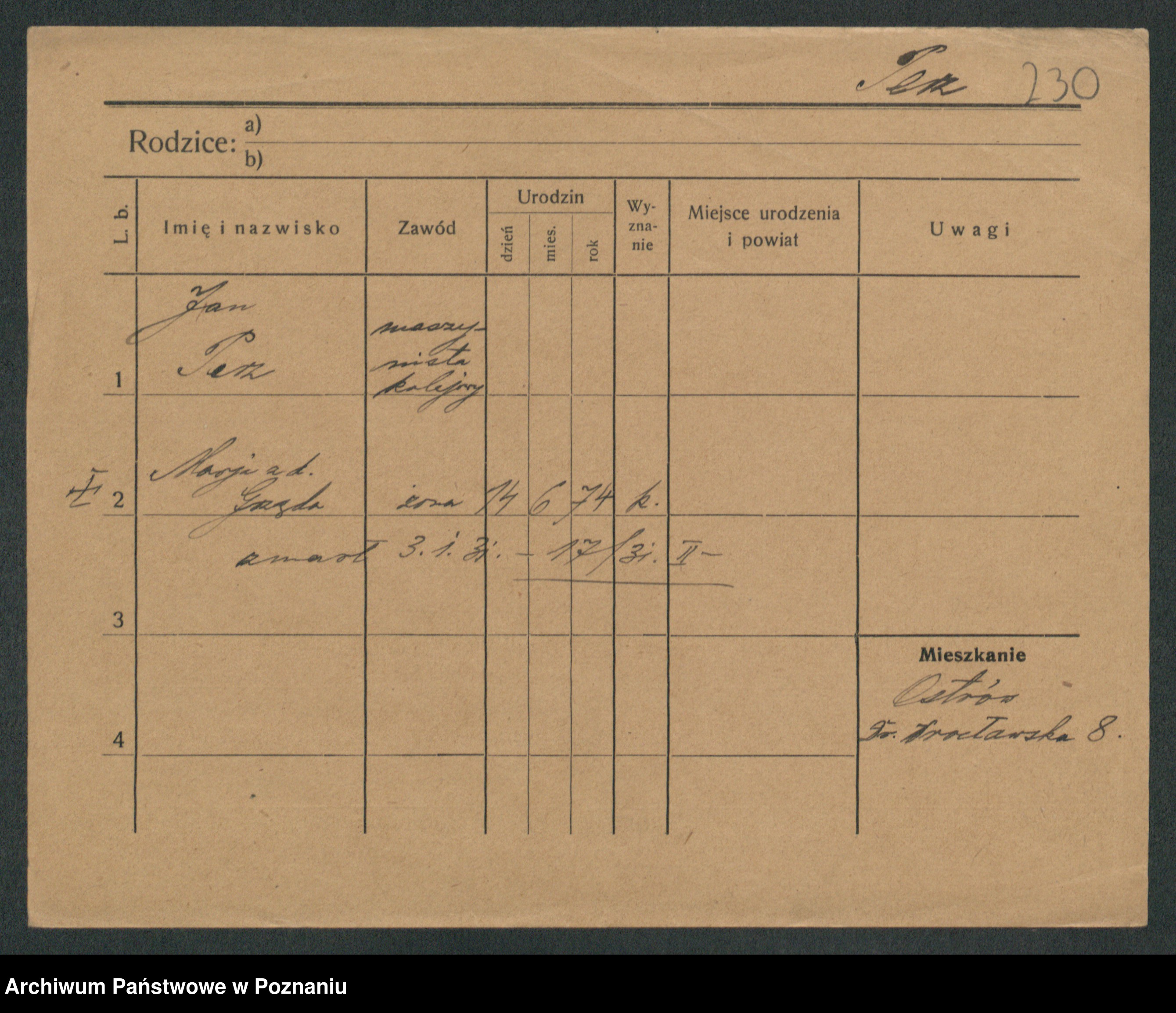 Podgląd karty osobowej dostępny jest po kliknięciu na nazwisko lub ikonkę karty. Można dokonywać powiększenia (ikony na górze) lub przechodzić między kolejnymi skanami (strzałki po bokach).