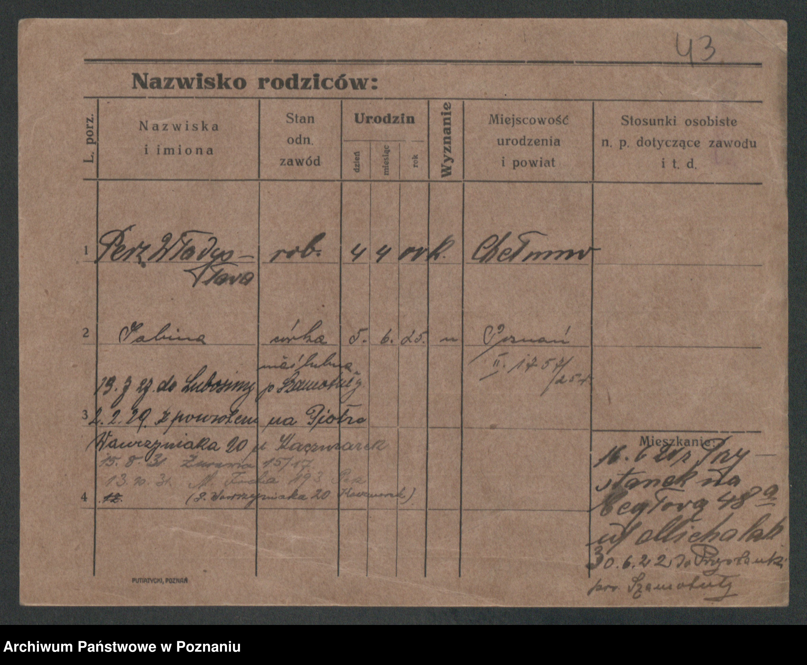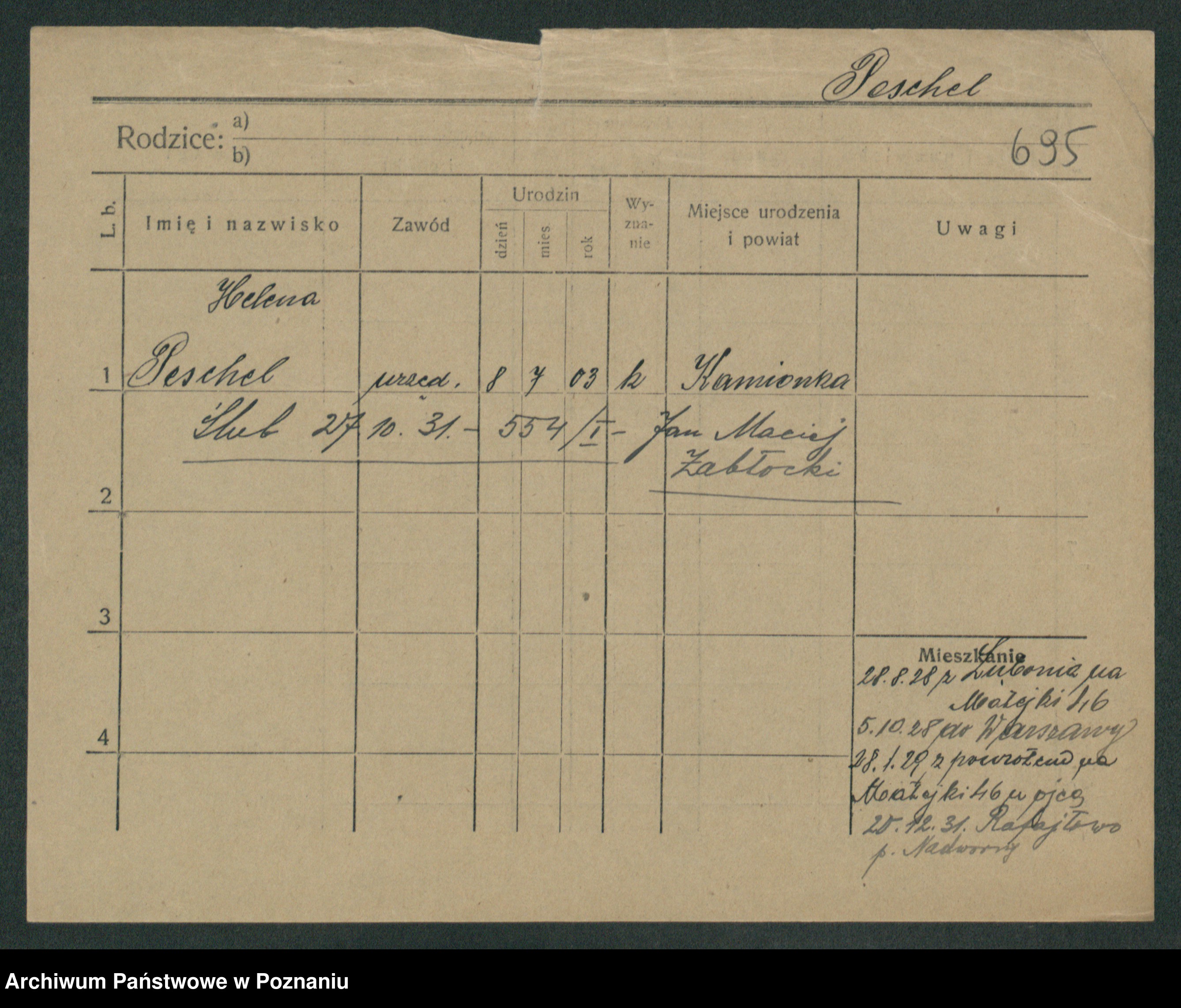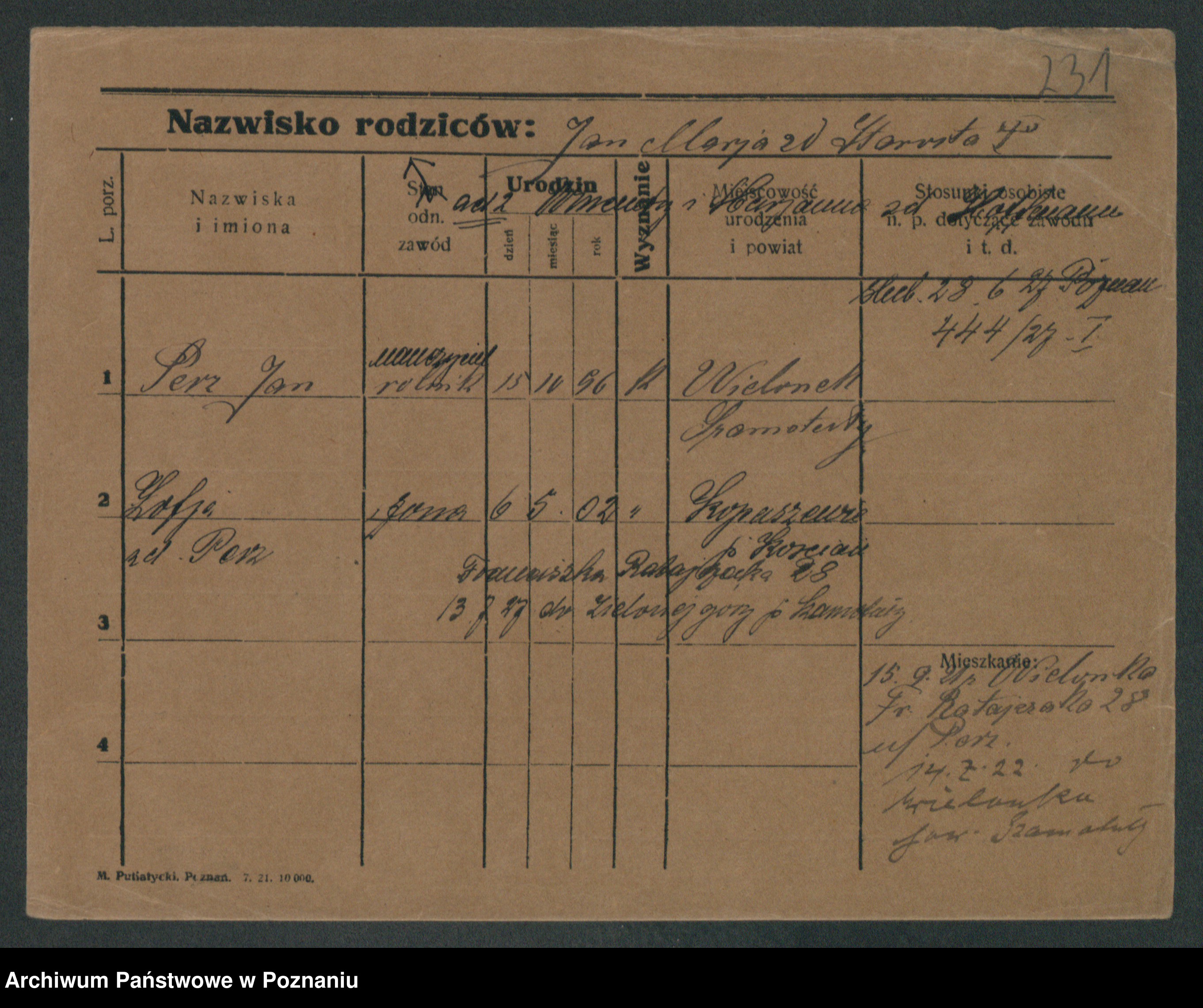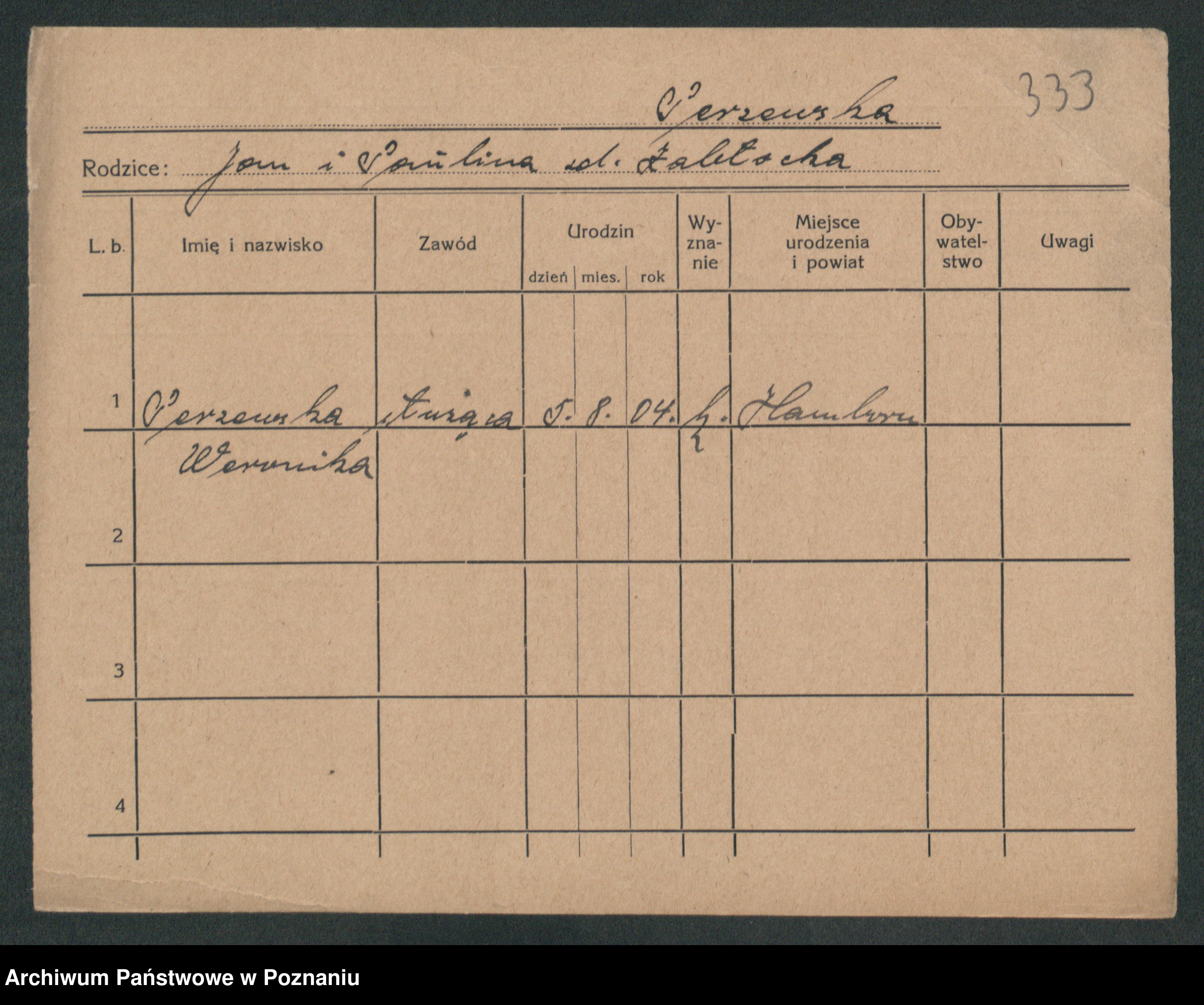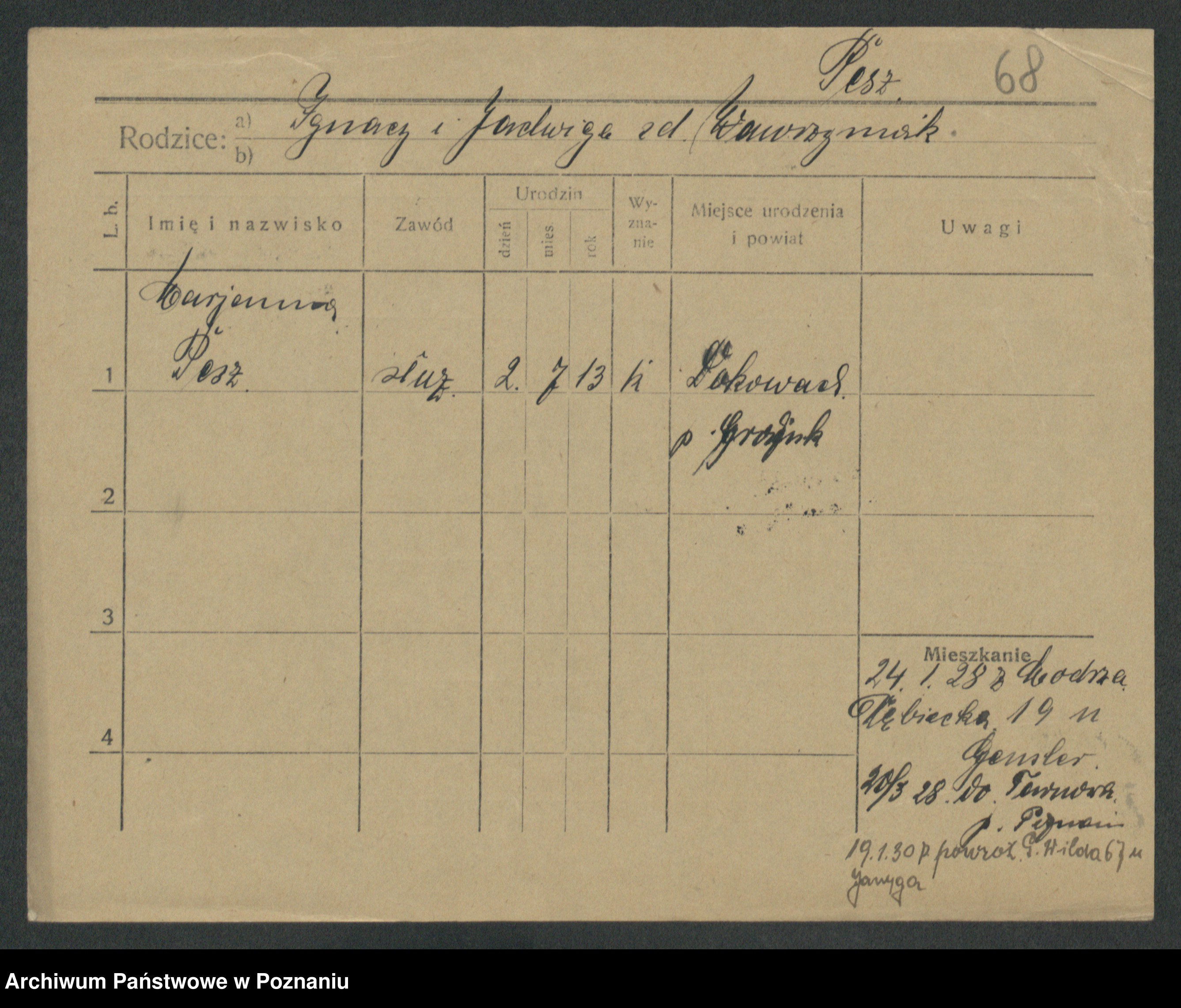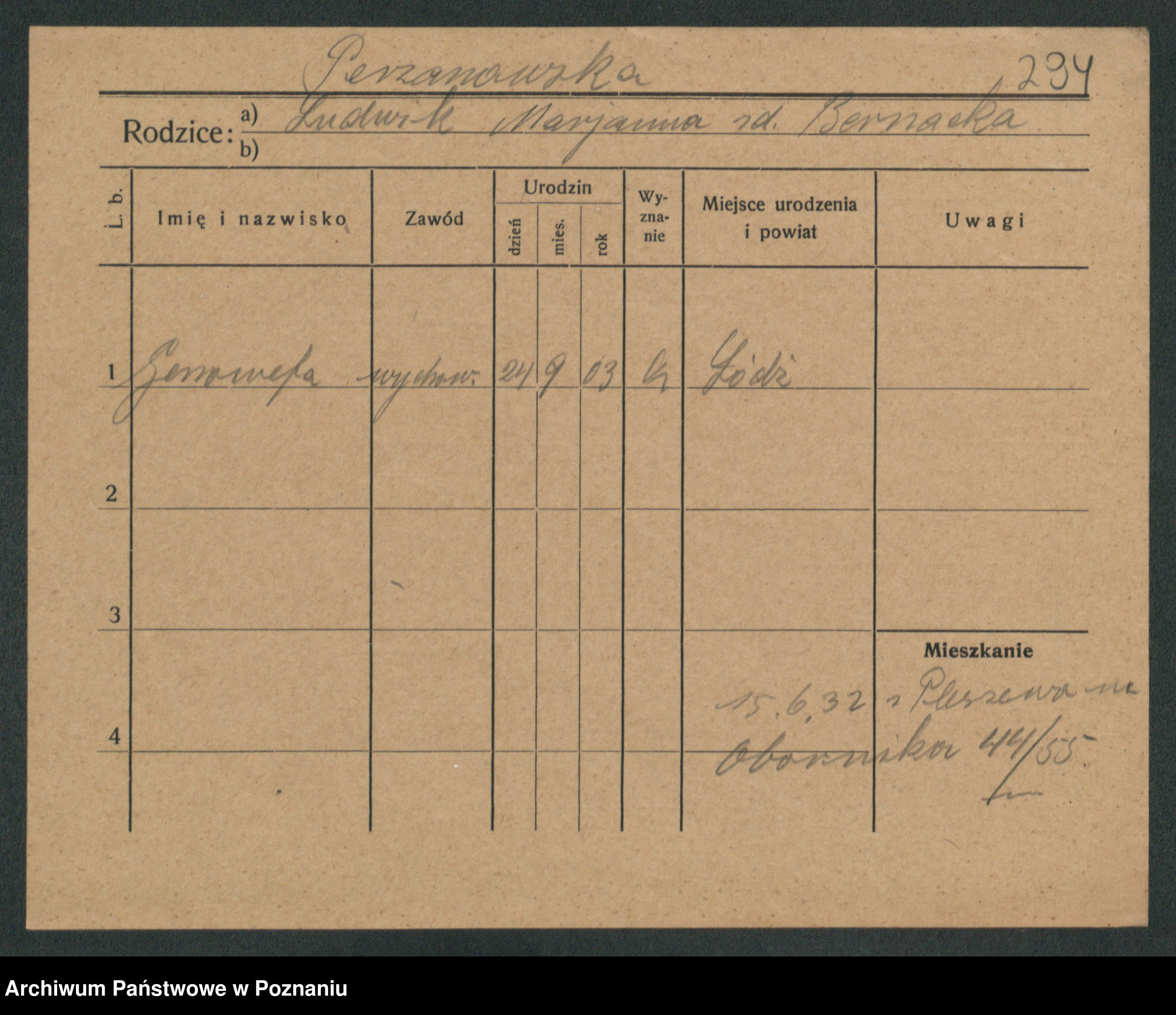 Podgląd karty osobowej dostępny jest po kliknięciu na nazwisko lub ikonkę karty. Można dokonywać powiększenia (ikony na górze) lub przechodzić między kolejnymi skanami (strzałki po bokach).