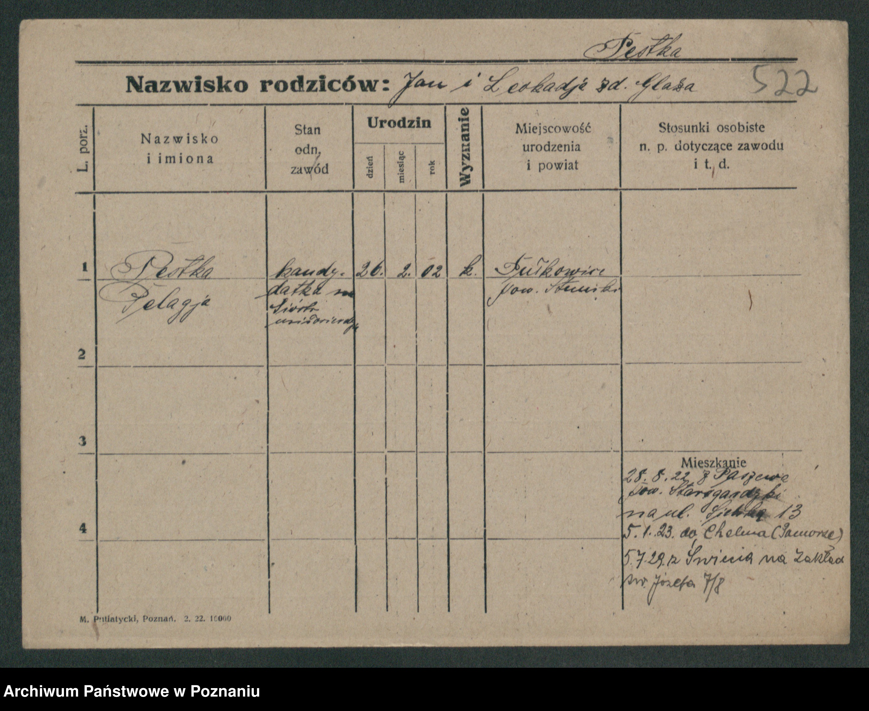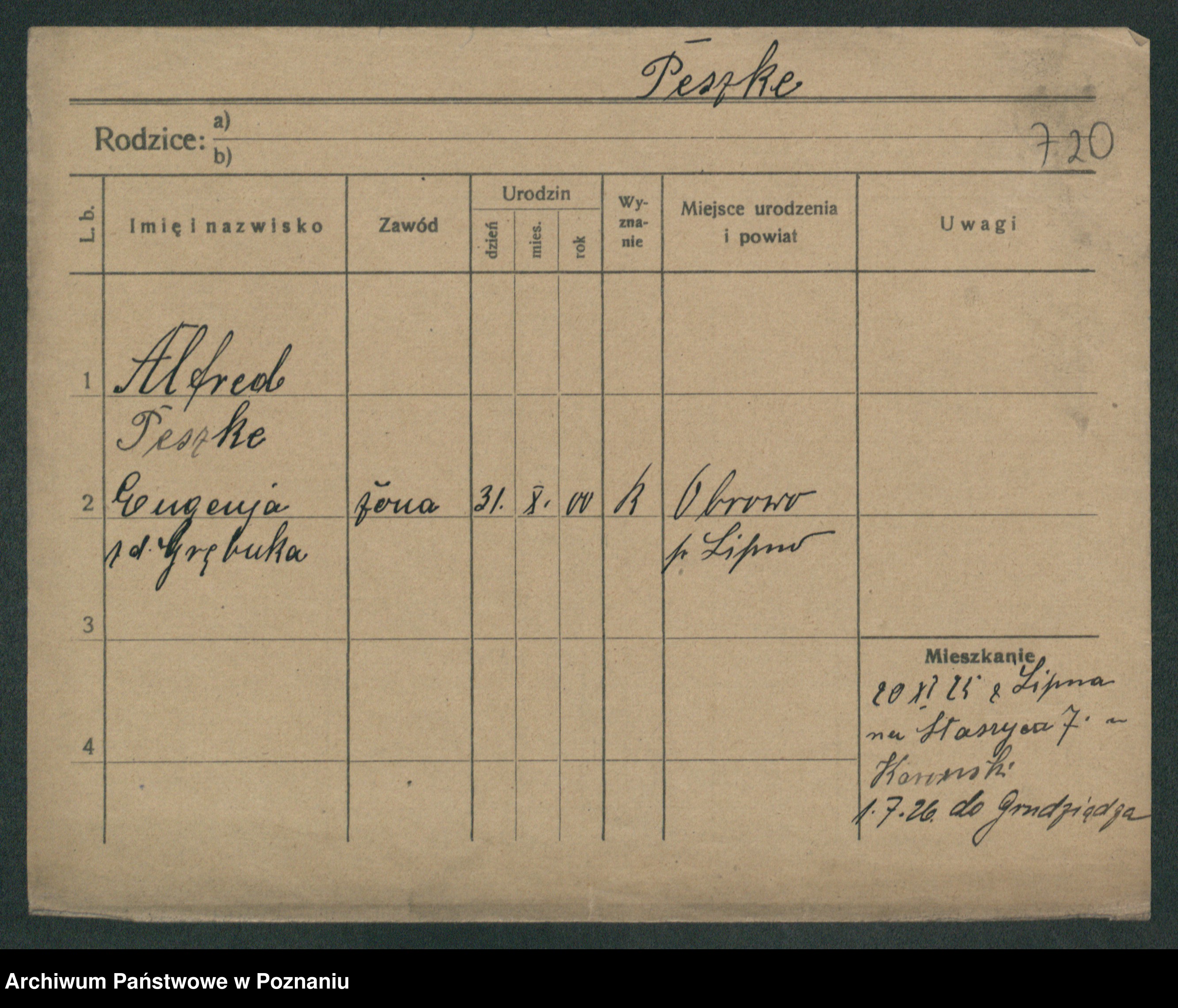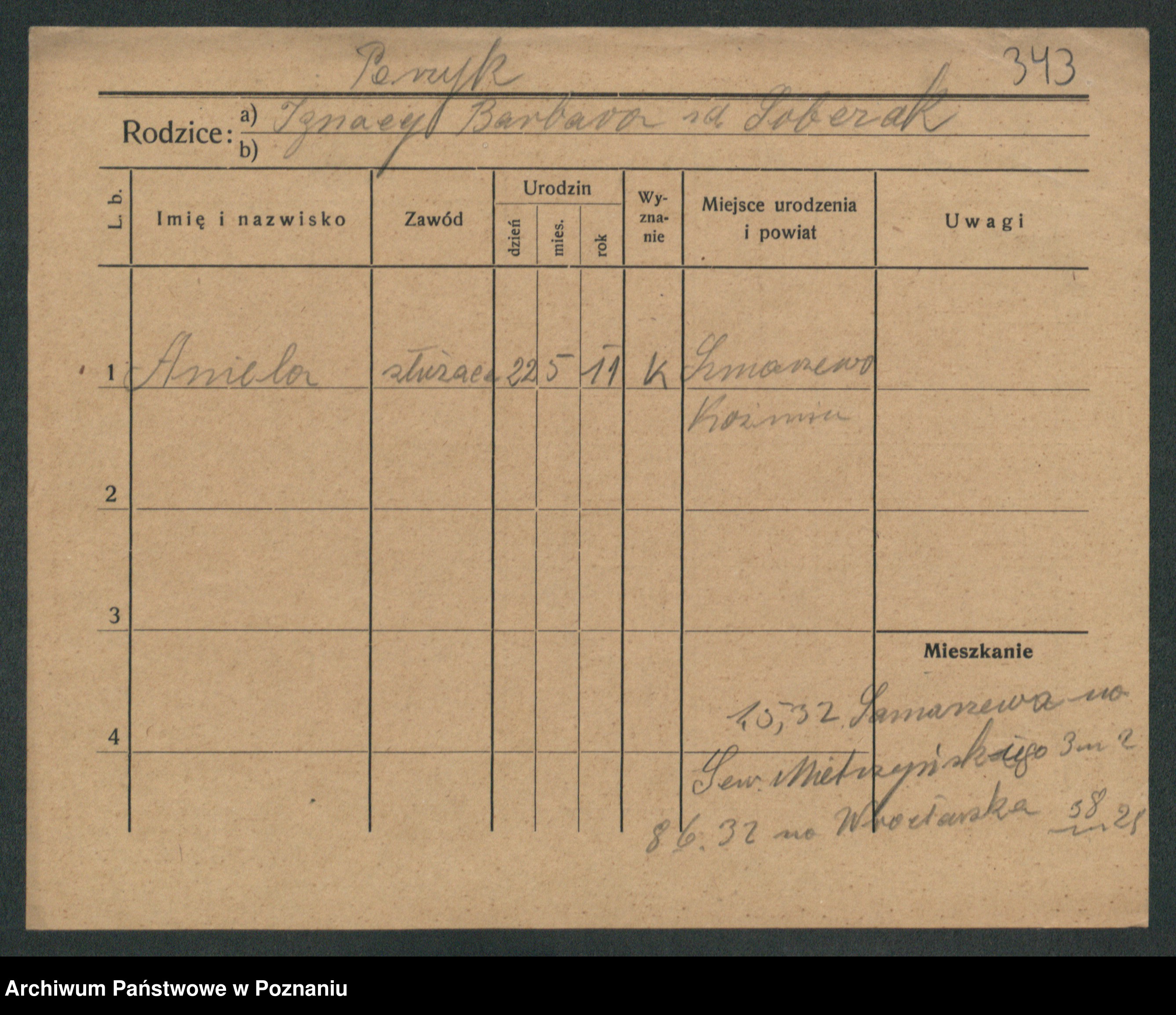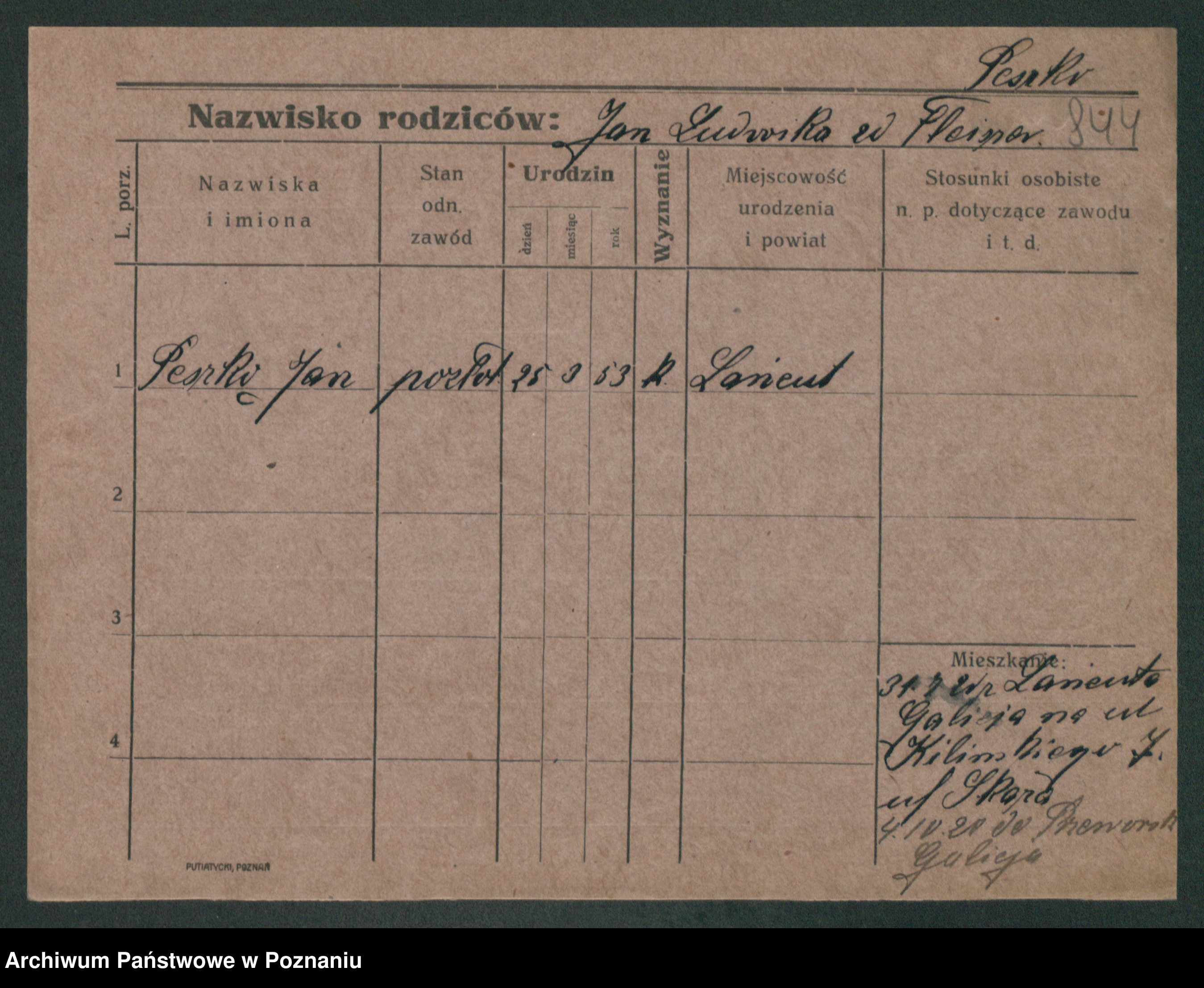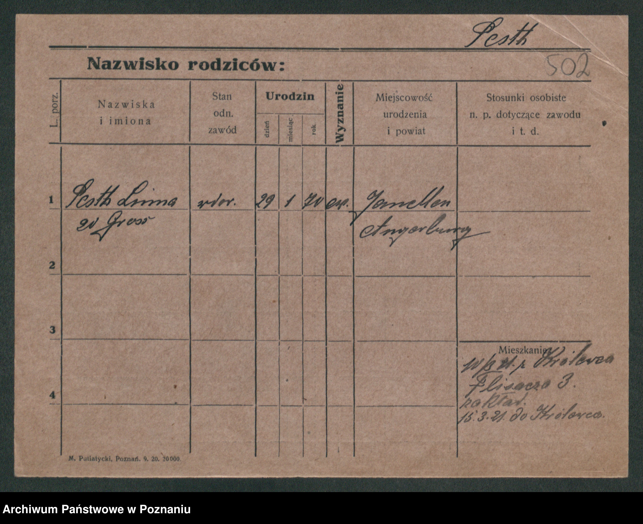Podgląd karty osobowej dostępny jest po kliknięciu na nazwisko lub ikonkę karty. Można dokonywać powiększenia (ikony na górze) lub przechodzić między kolejnymi skanami (strzałki po bokach).
