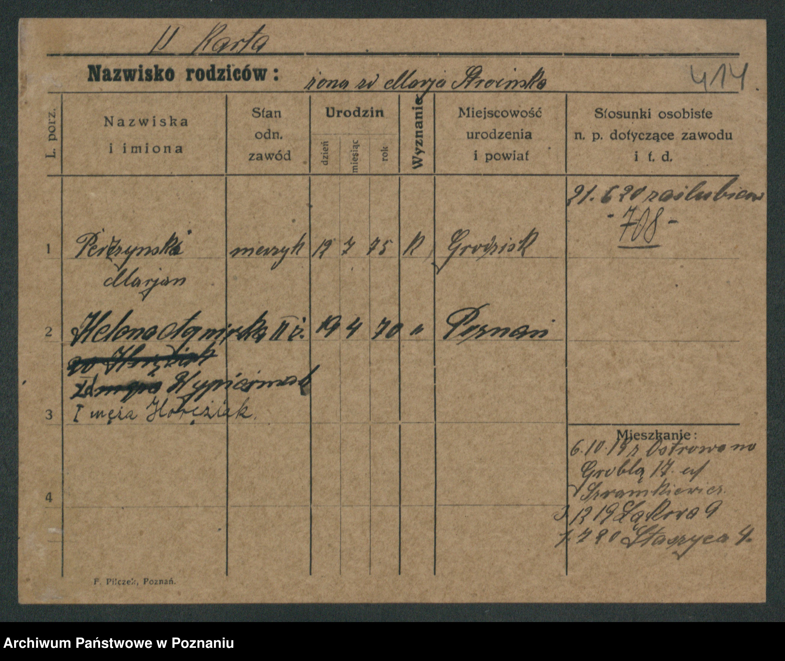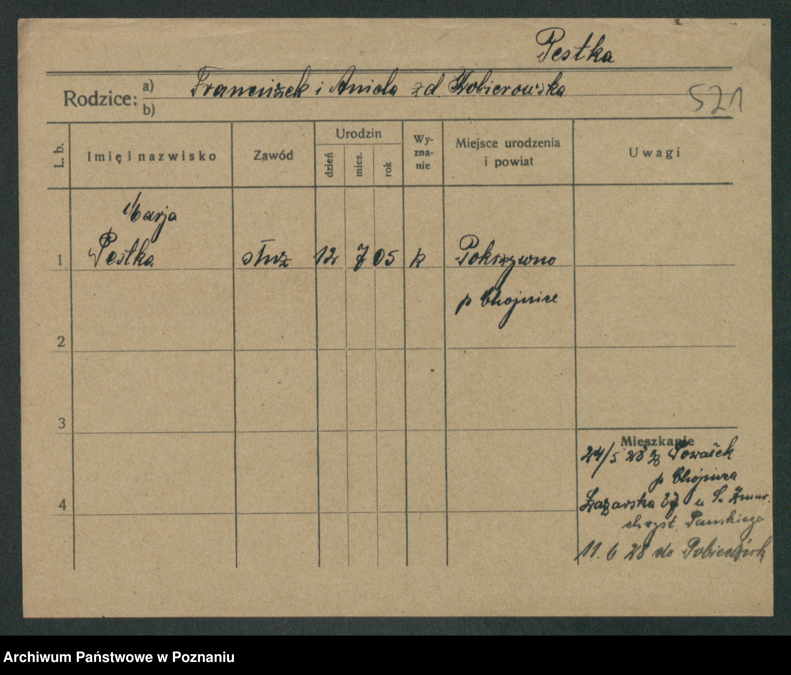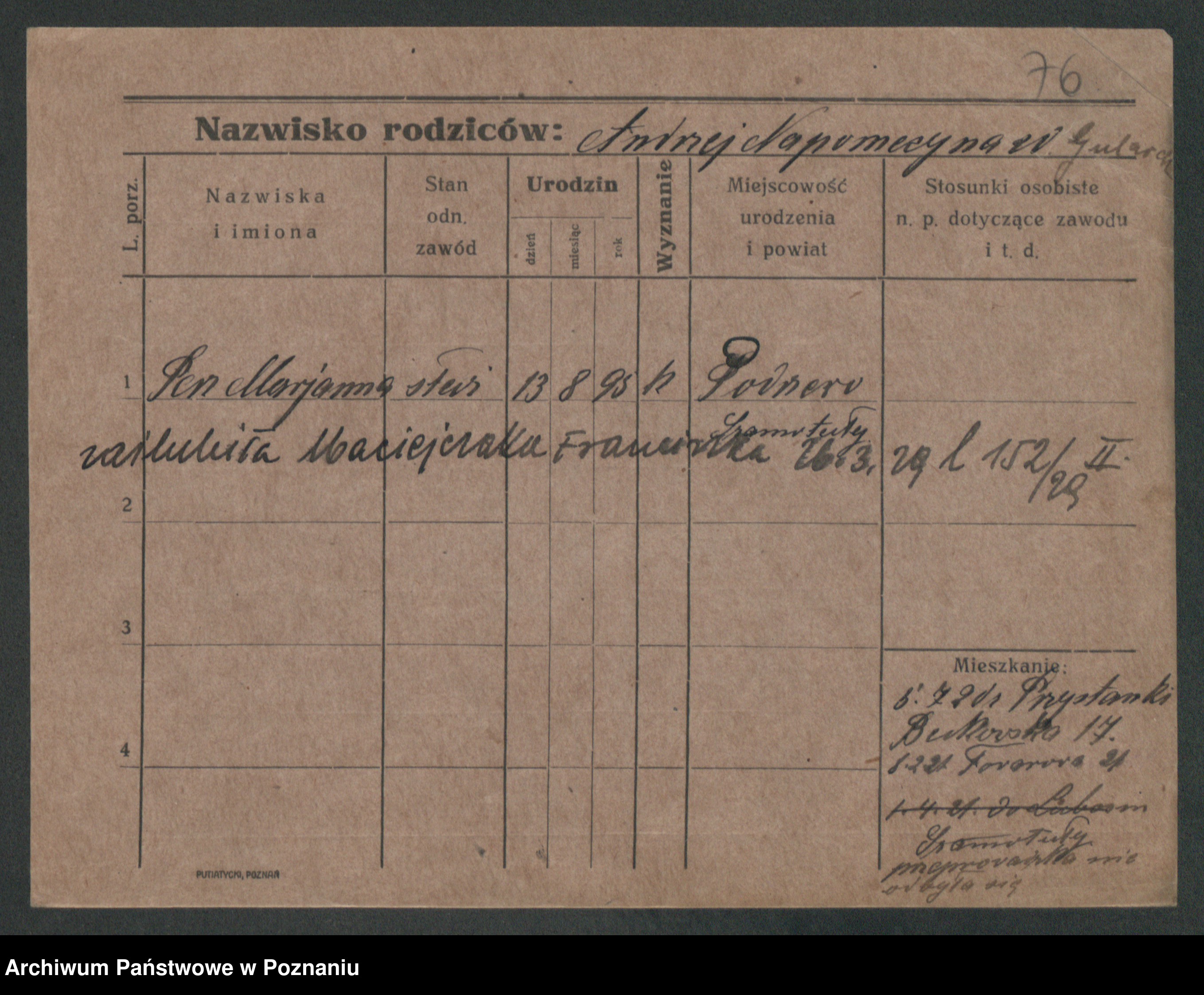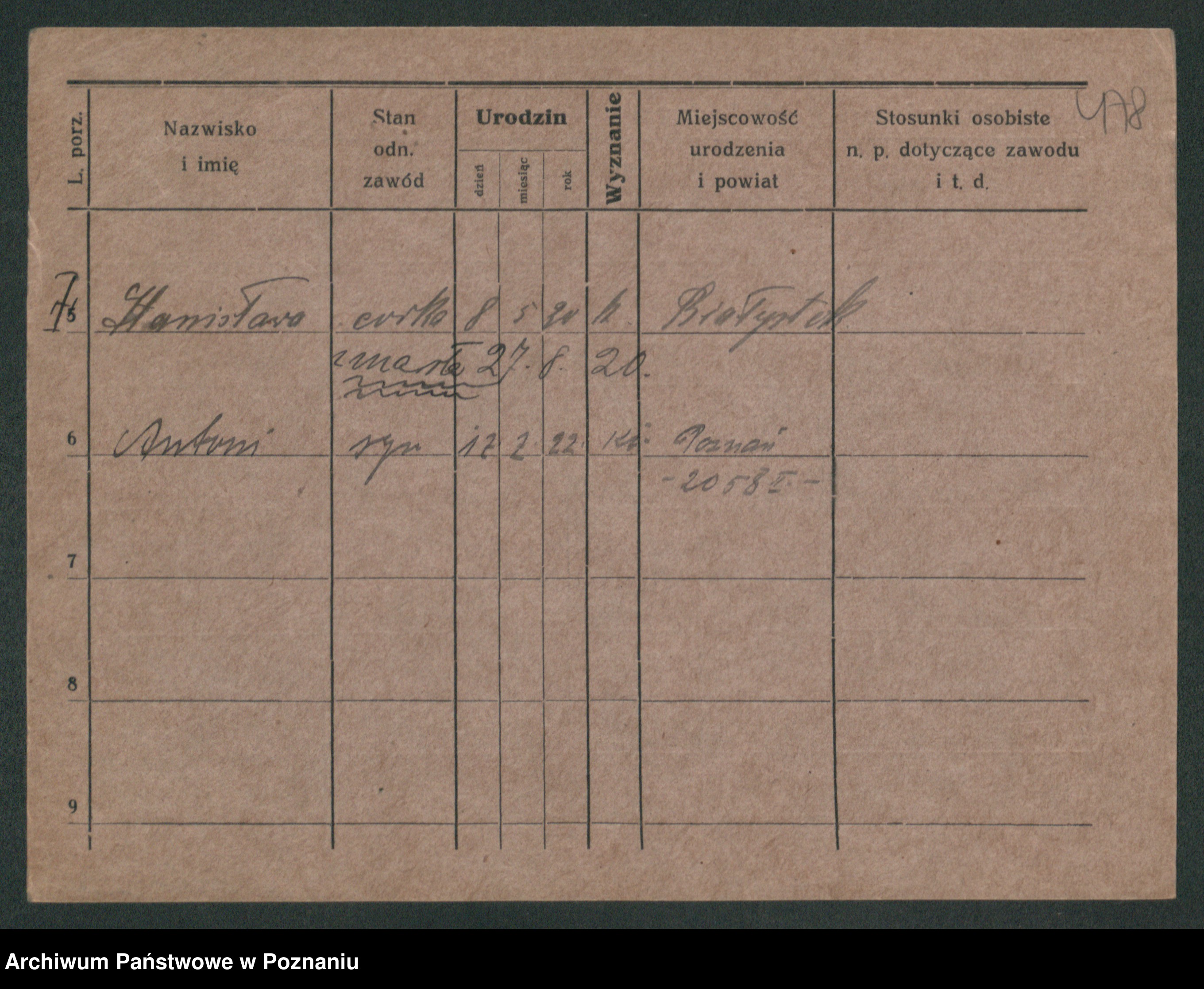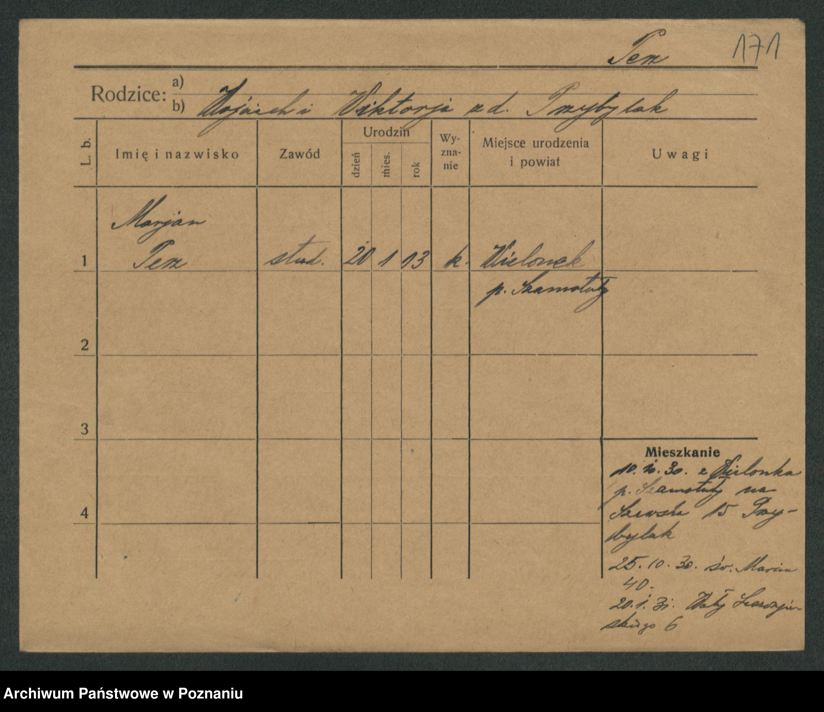 Podgląd karty osobowej dostępny jest po kliknięciu na nazwisko lub ikonkę karty. Można dokonywać powiększenia (ikony na górze) lub przechodzić między kolejnymi skanami (strzałki po bokach).