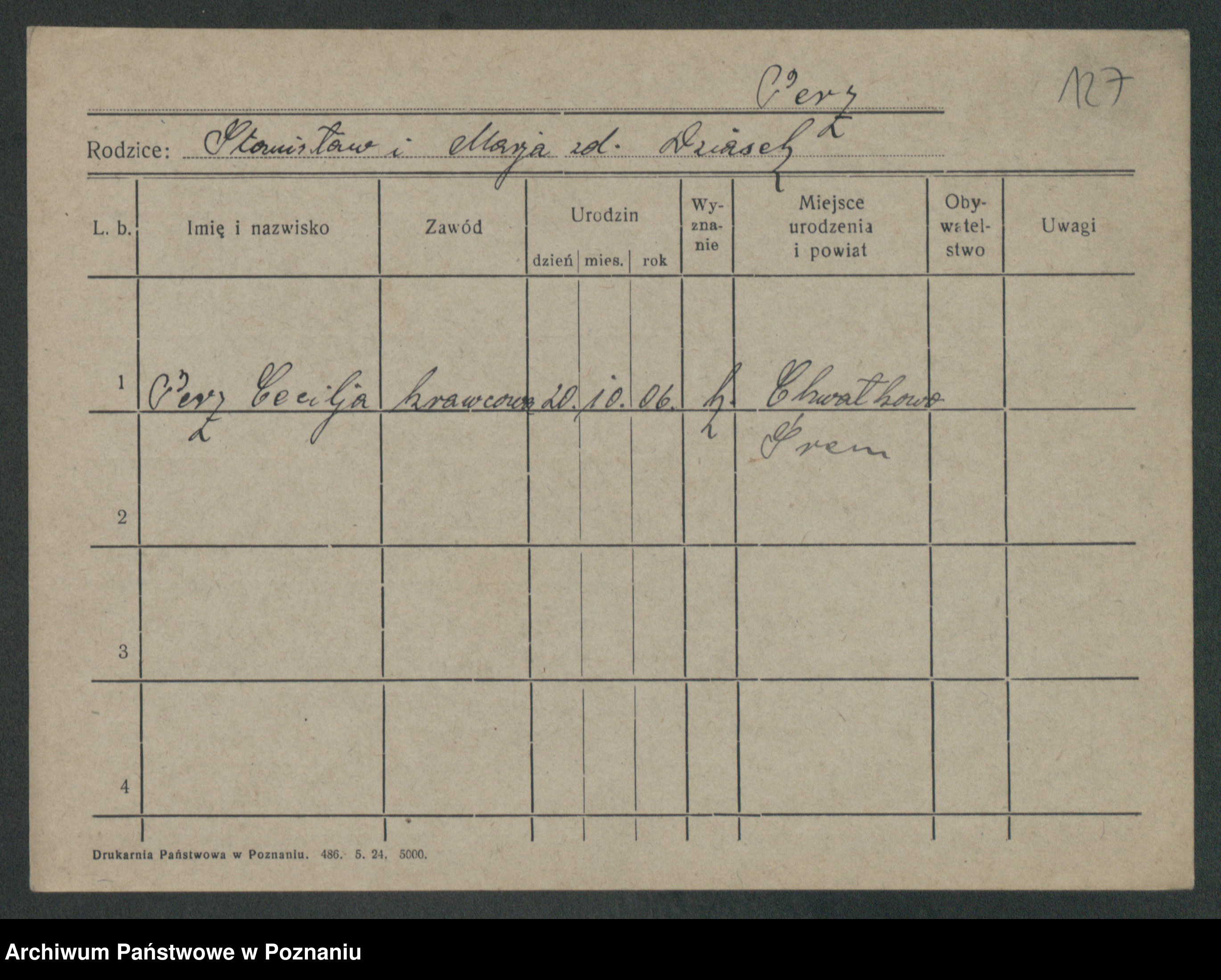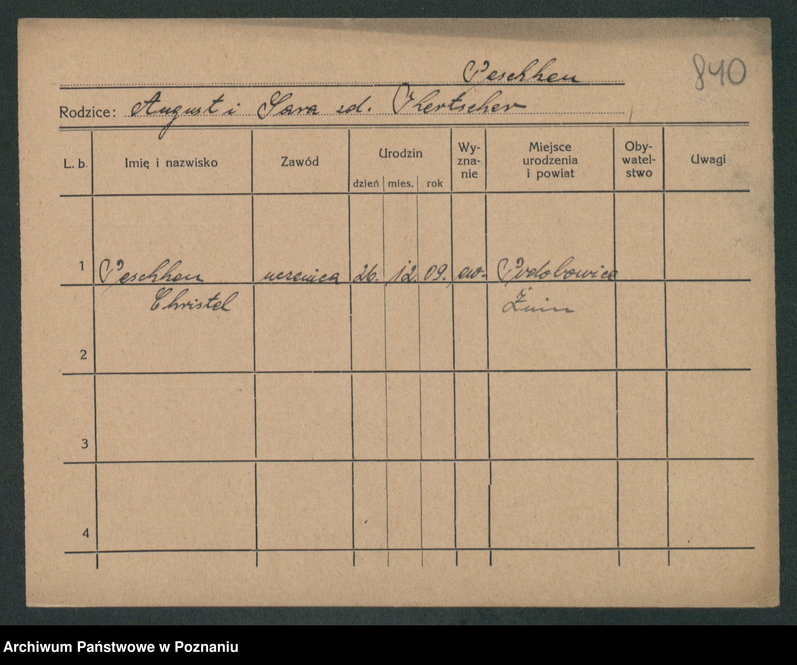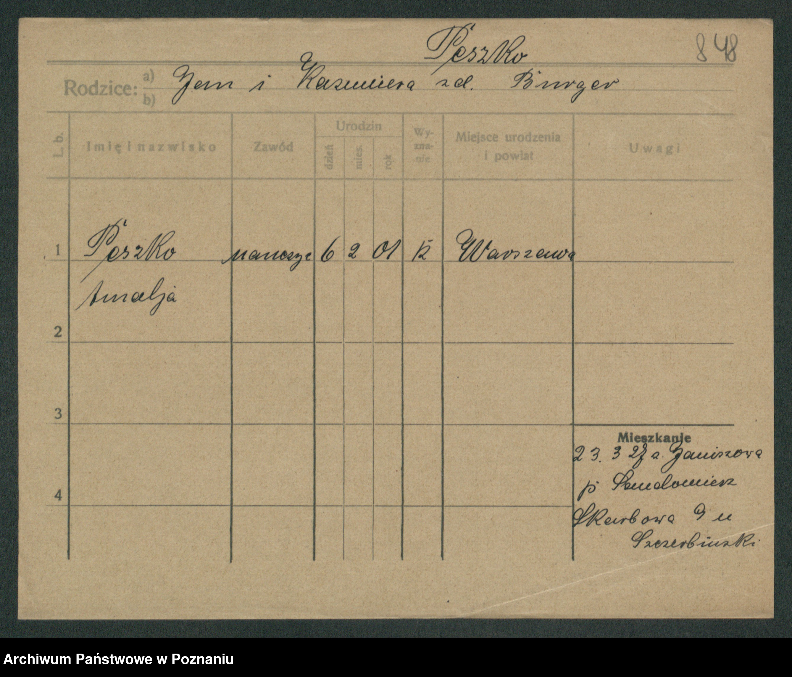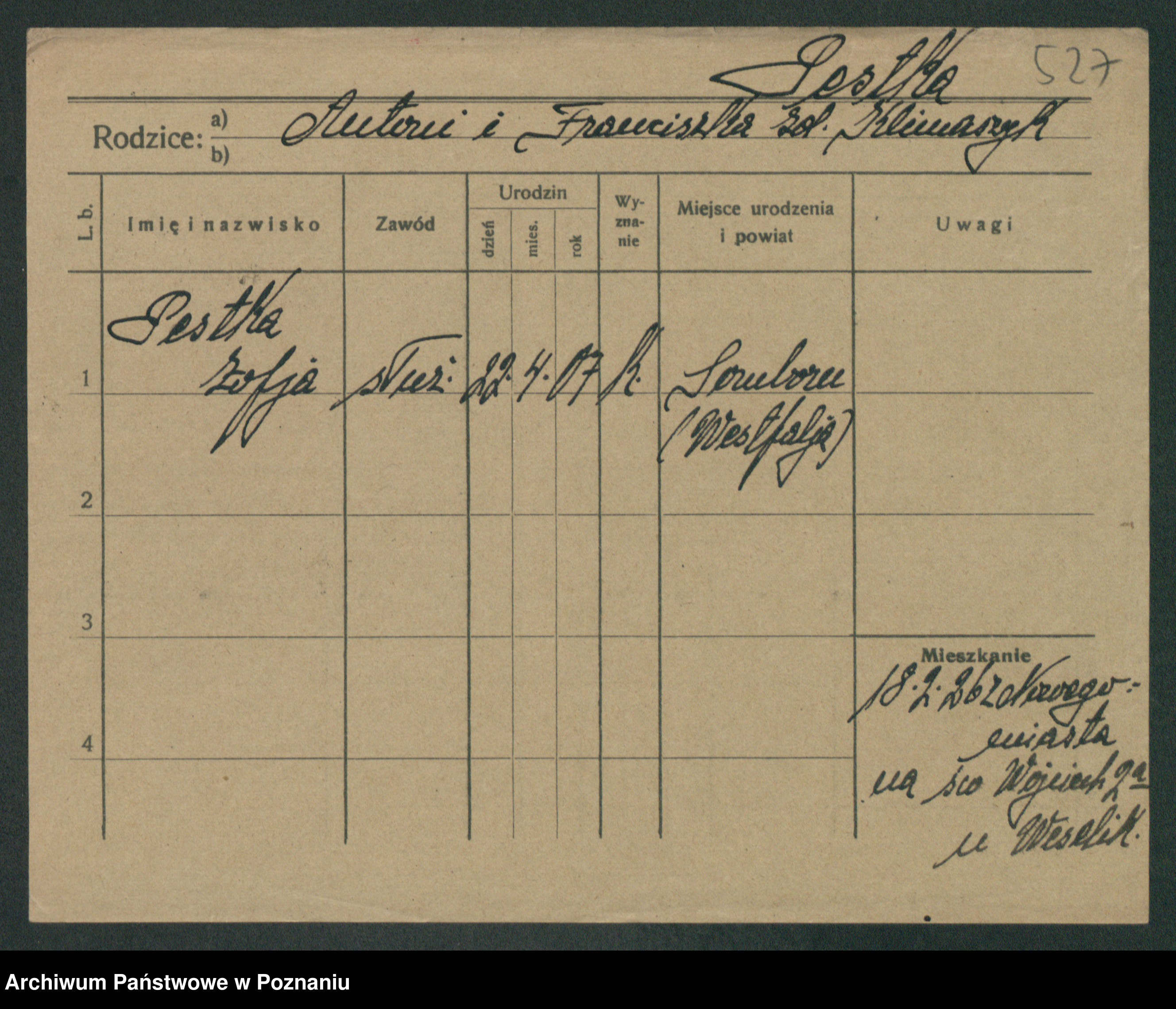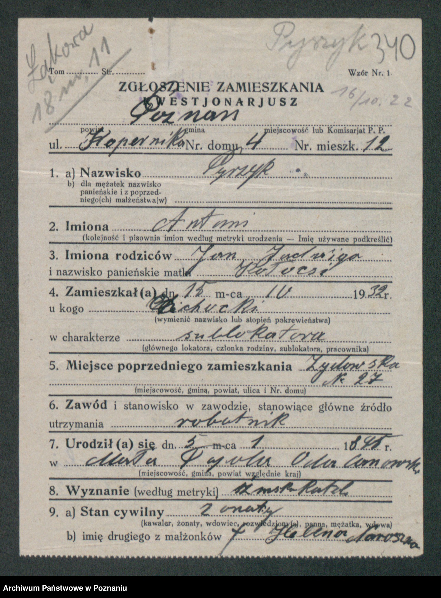 Podgląd karty osobowej dostępny jest po kliknięciu na nazwisko lub ikonkę karty. Można dokonywać powiększenia (ikony na górze) lub przechodzić między kolejnymi skanami (strzałki po bokach).