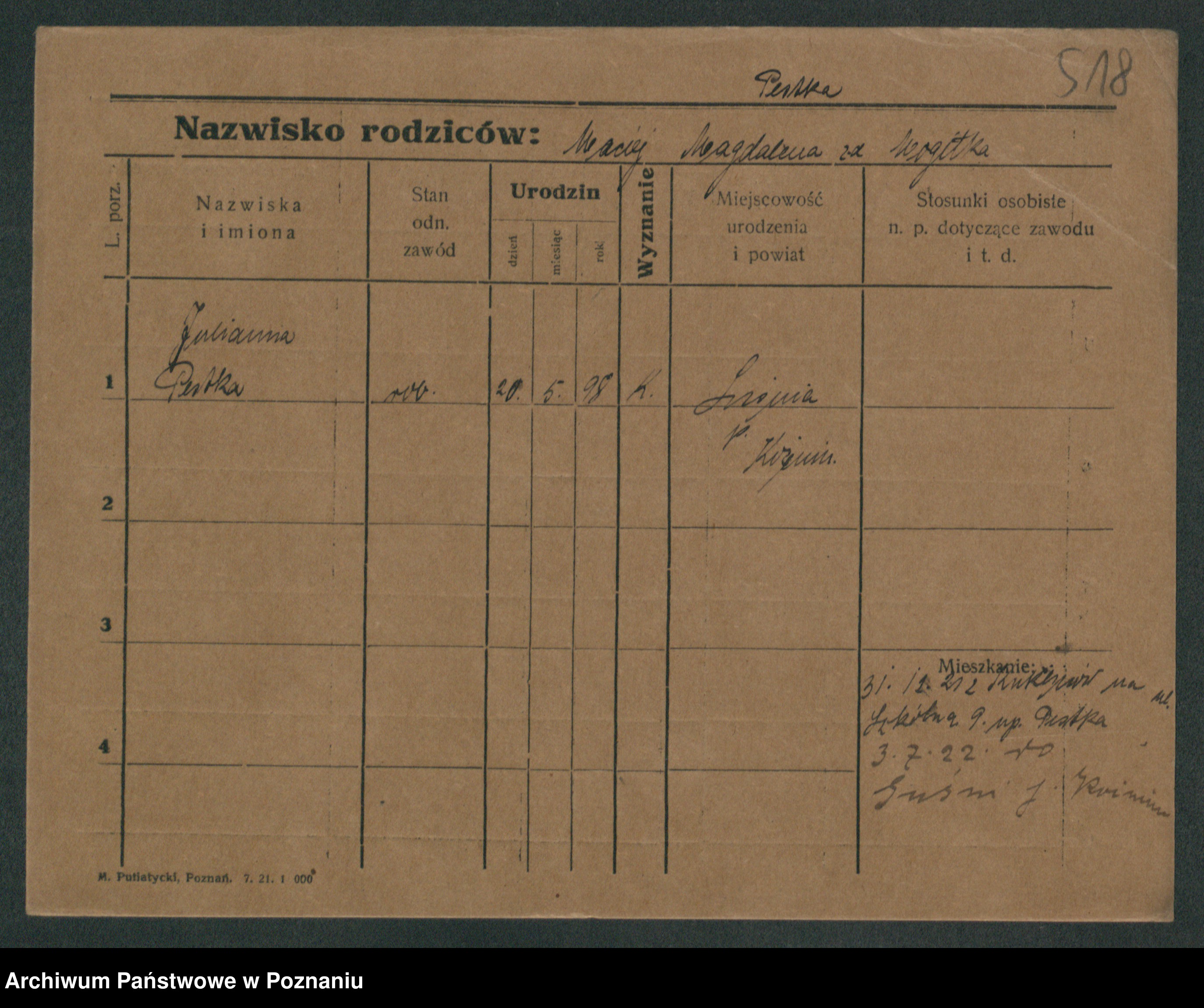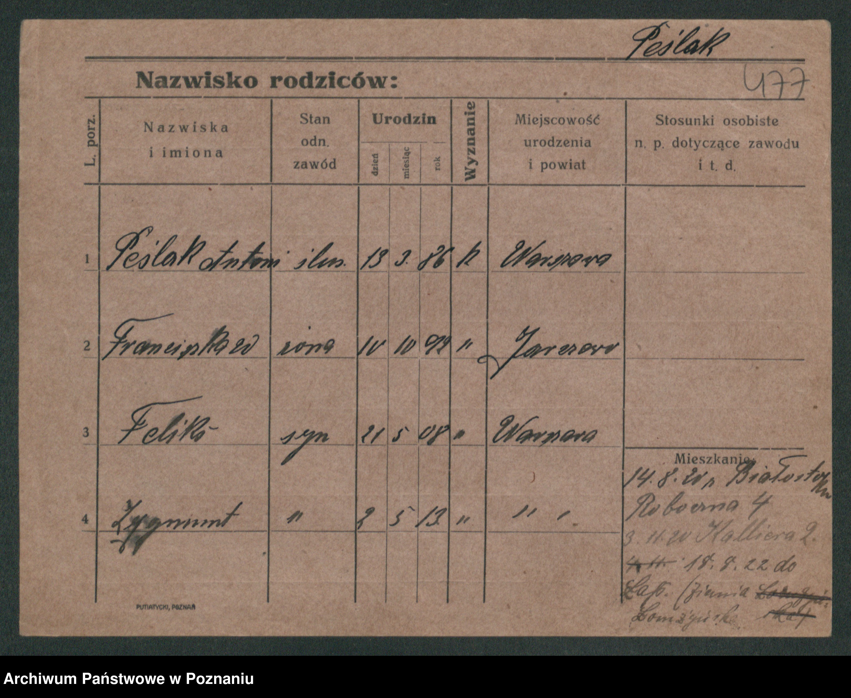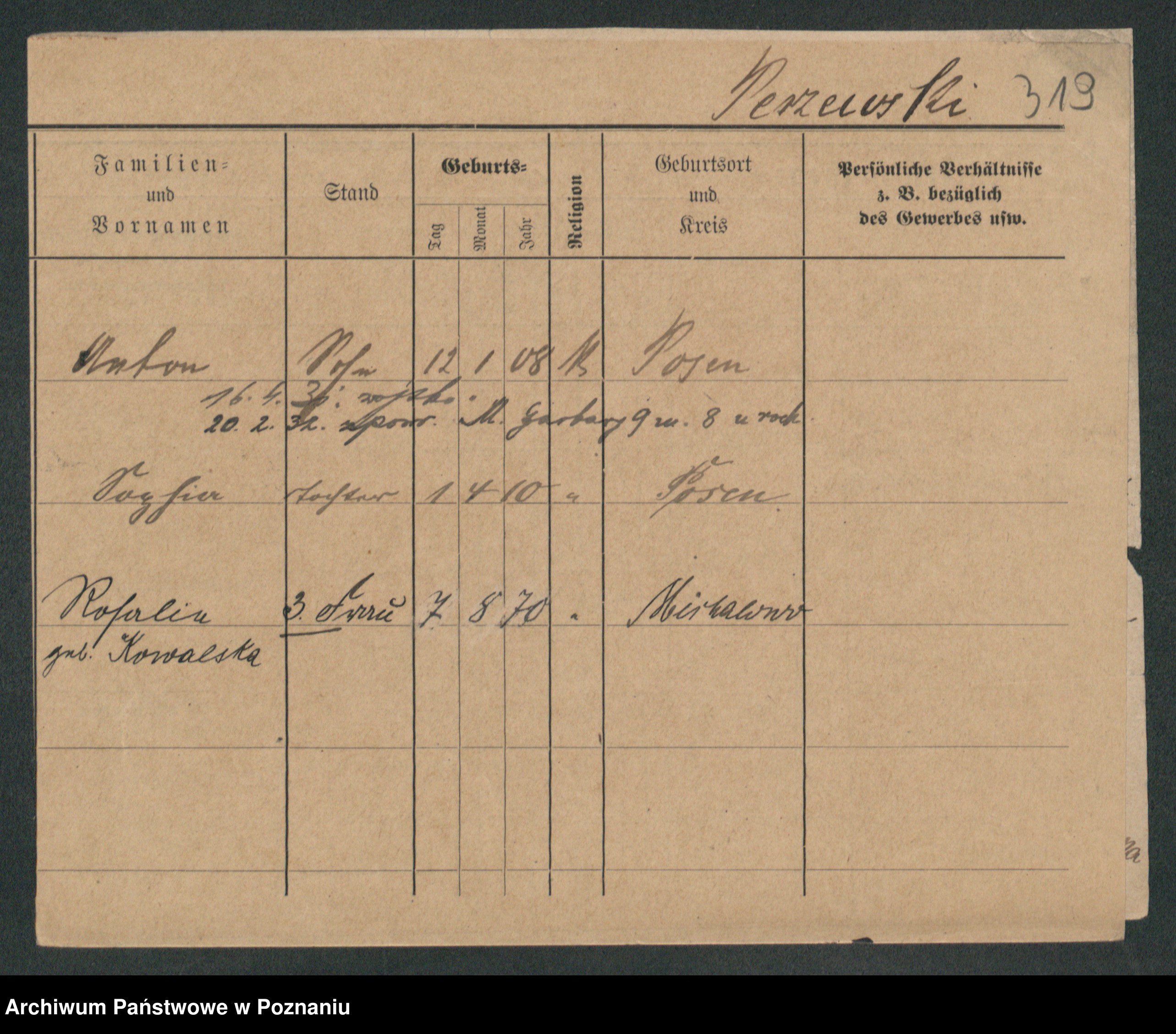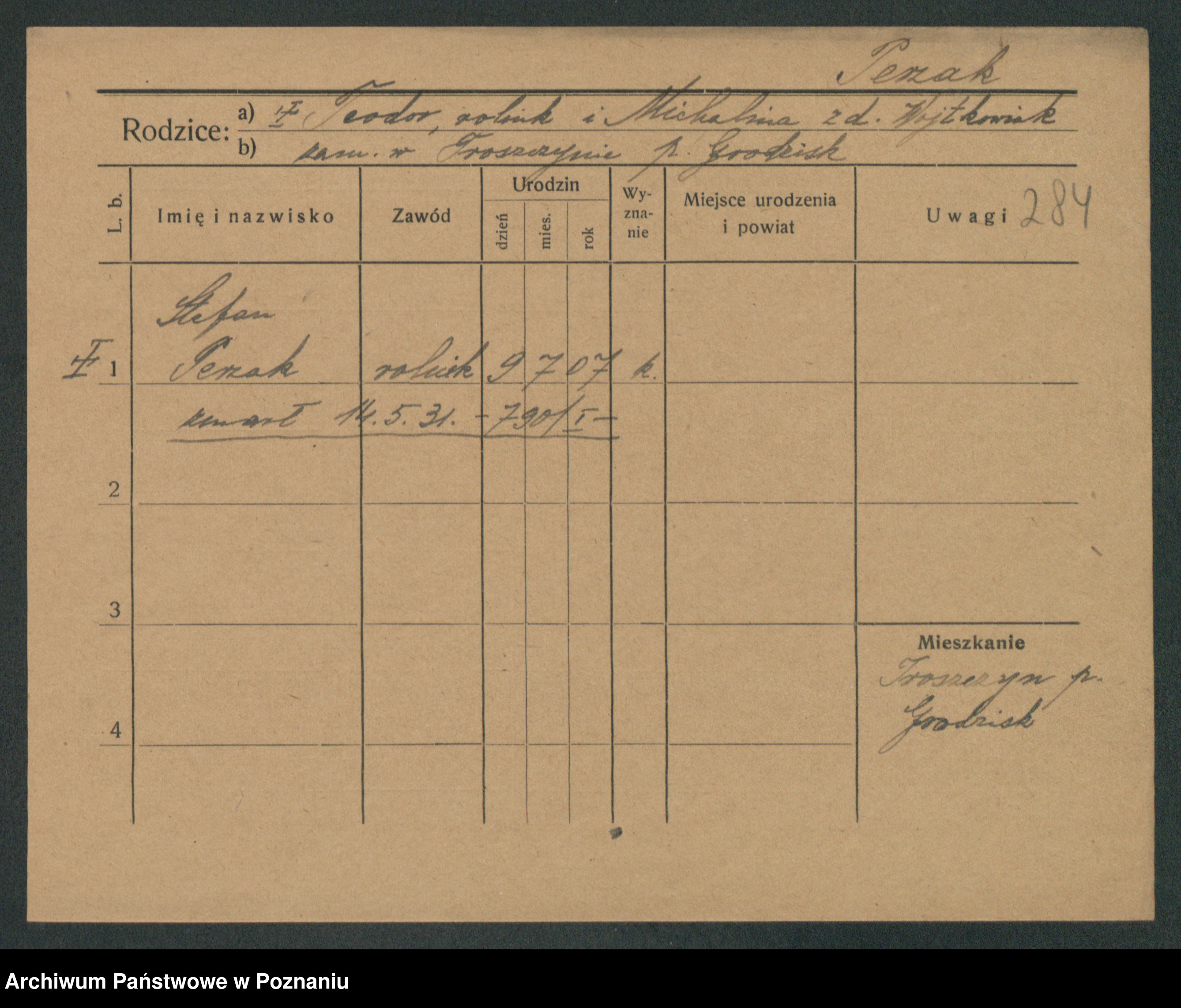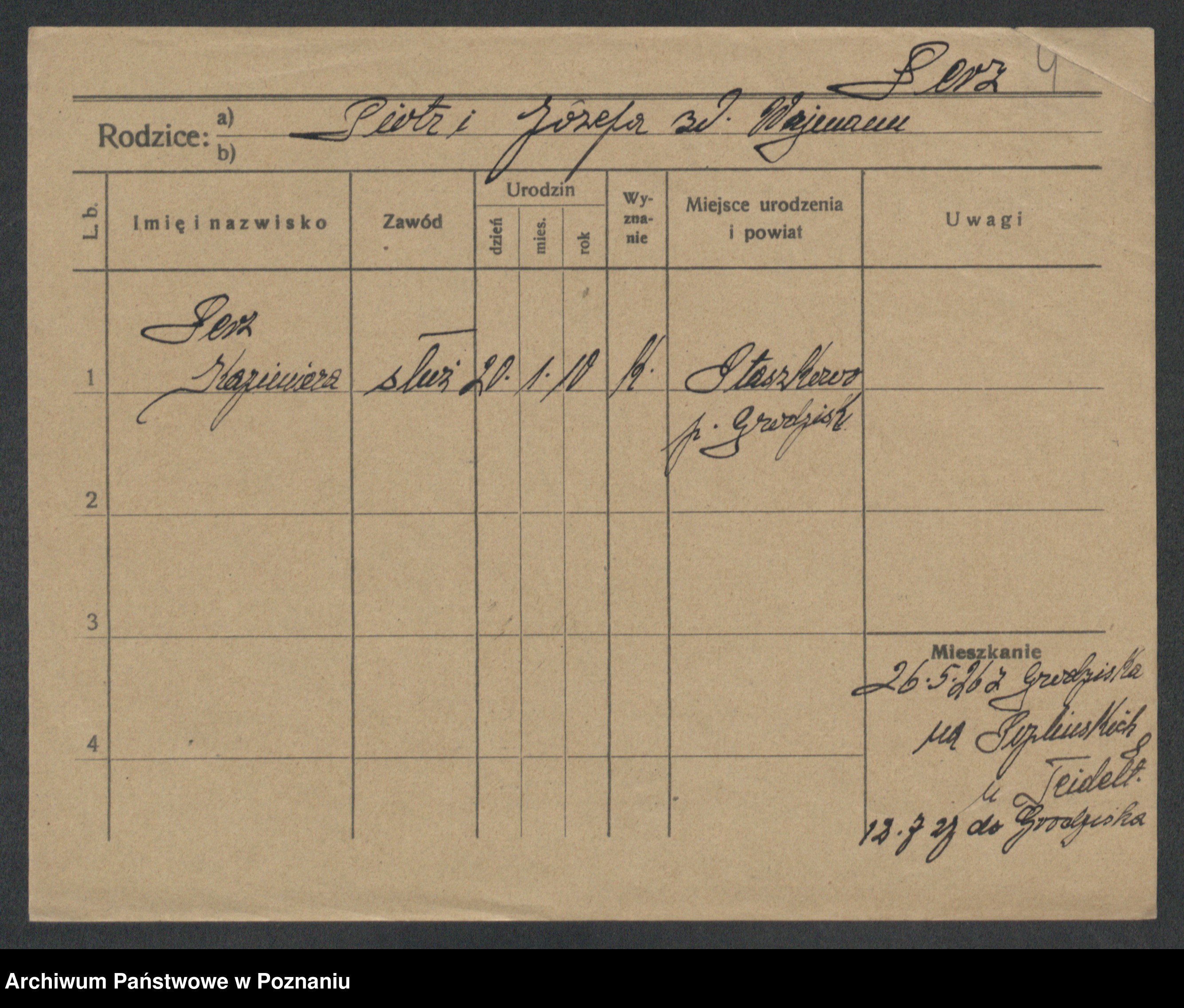 Podgląd karty osobowej dostępny jest po kliknięciu na nazwisko lub ikonkę karty. Można dokonywać powiększenia (ikony na górze) lub przechodzić między kolejnymi skanami (strzałki po bokach).