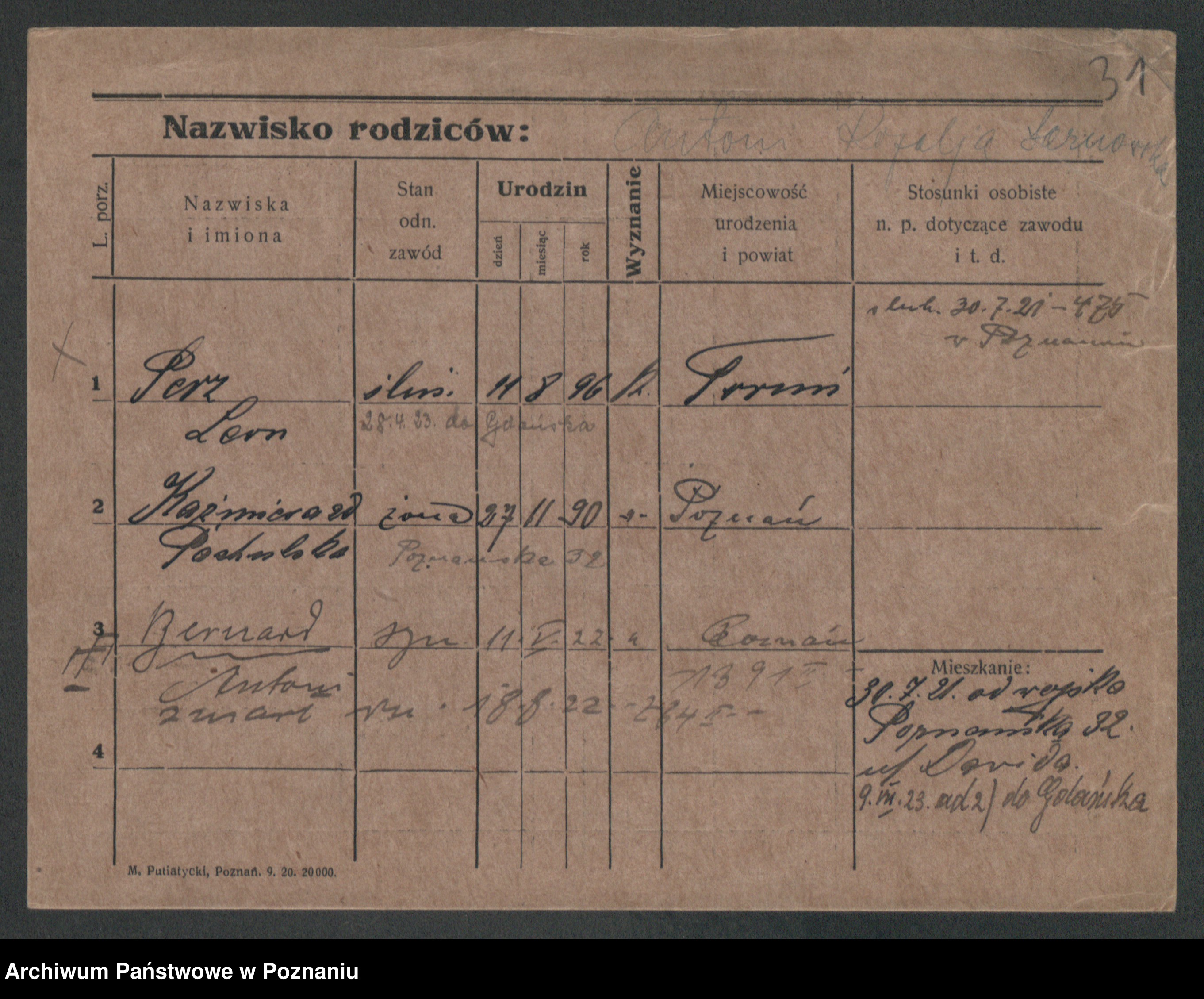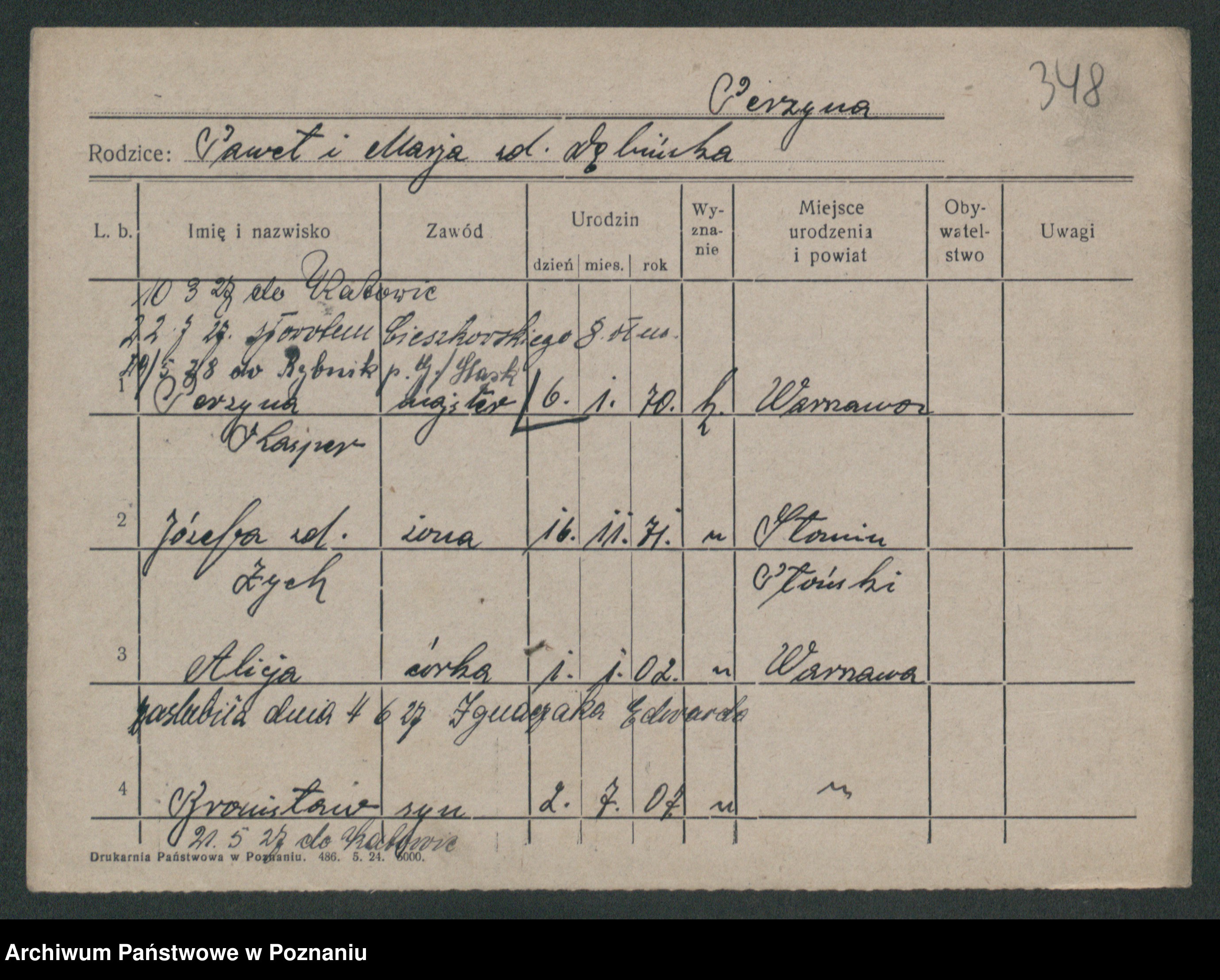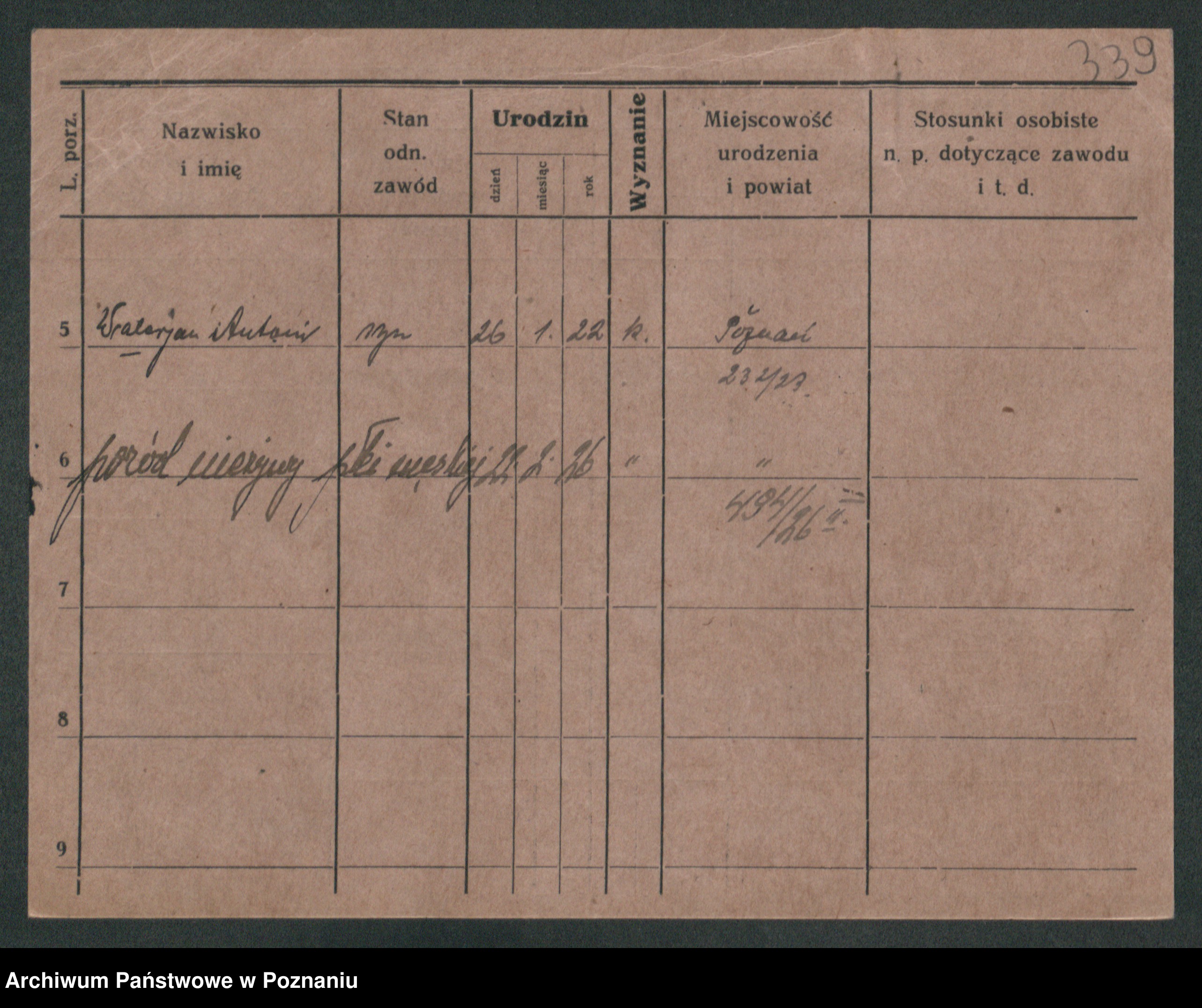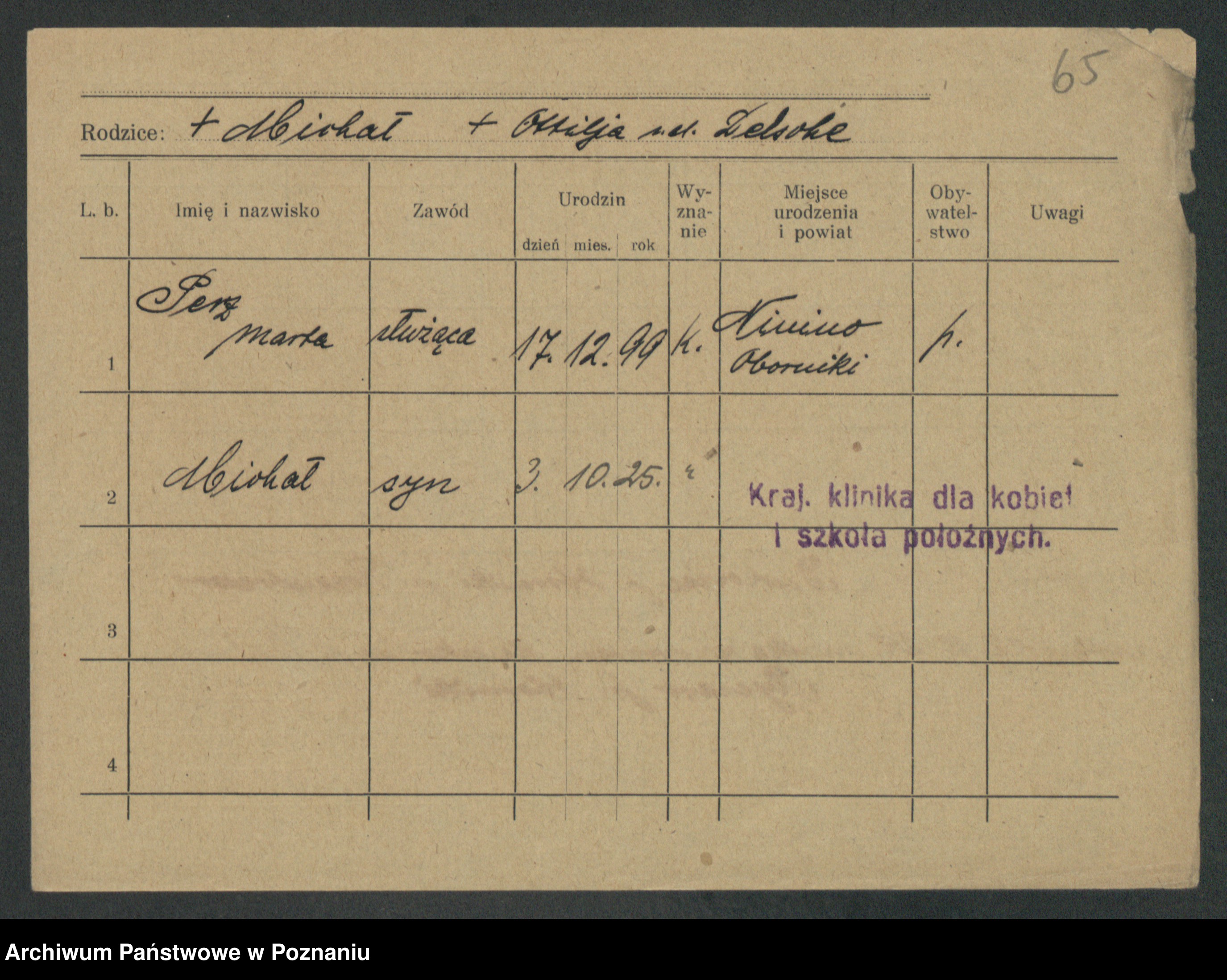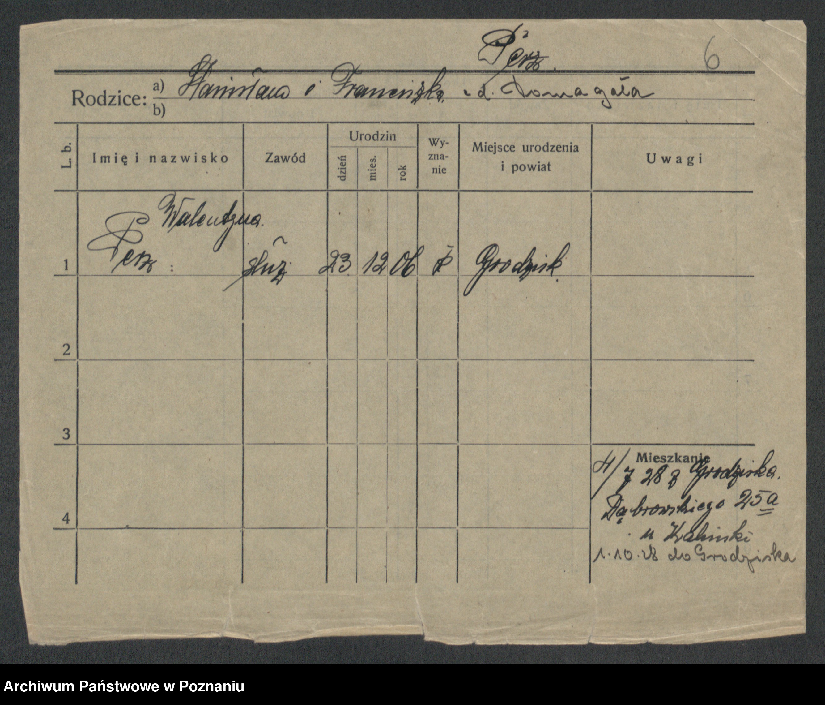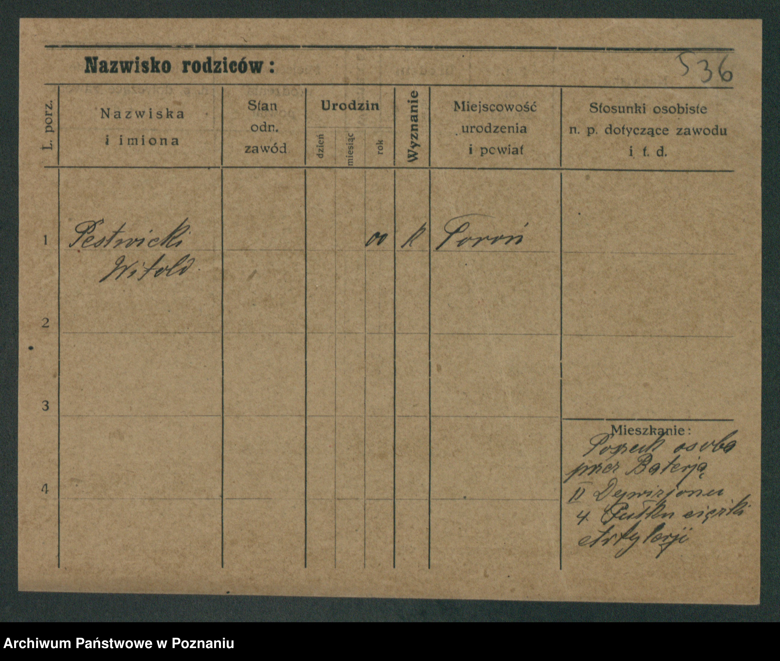 Podgląd karty osobowej dostępny jest po kliknięciu na nazwisko lub ikonkę karty. Można dokonywać powiększenia (ikony na górze) lub przechodzić między kolejnymi skanami (strzałki po bokach).
