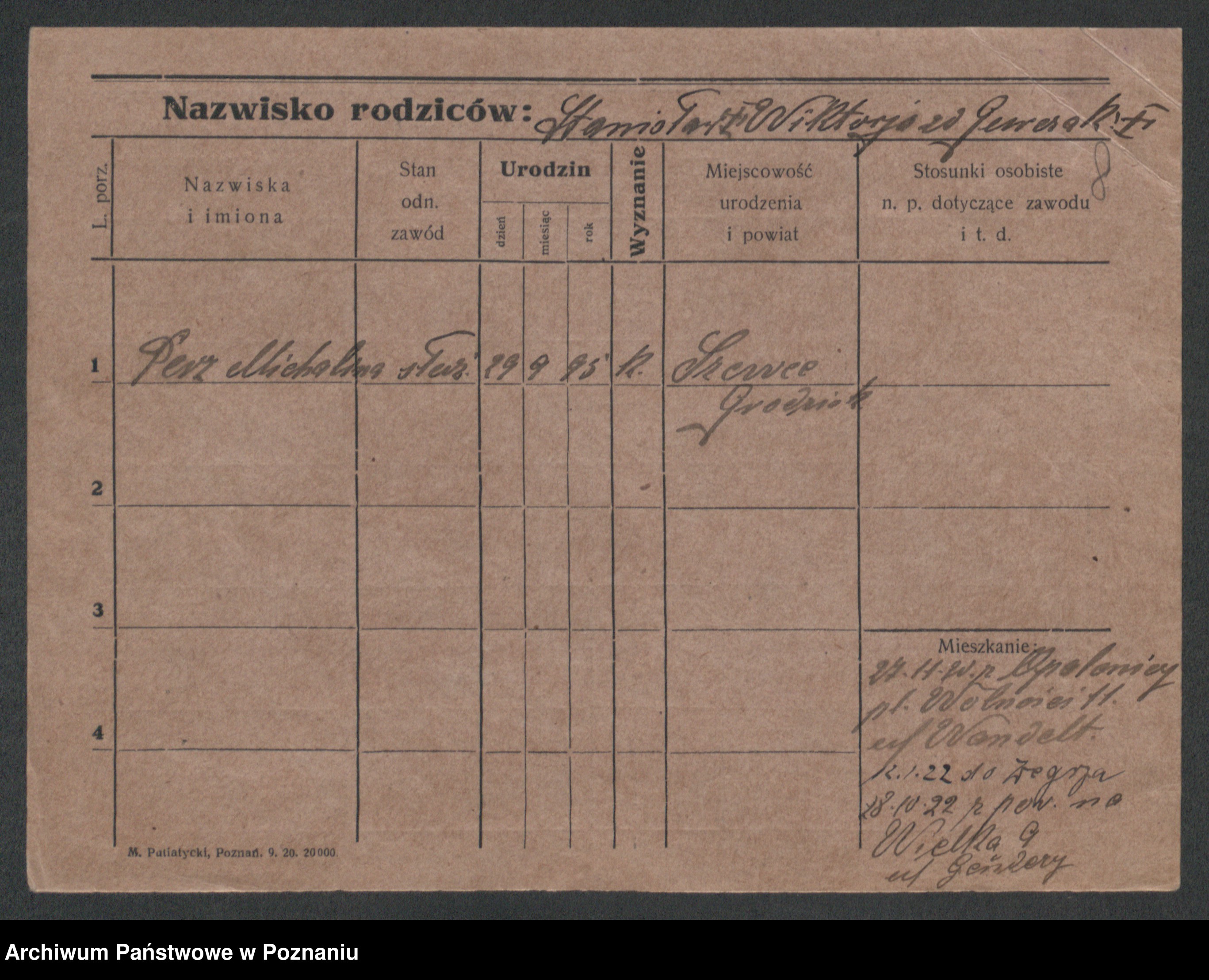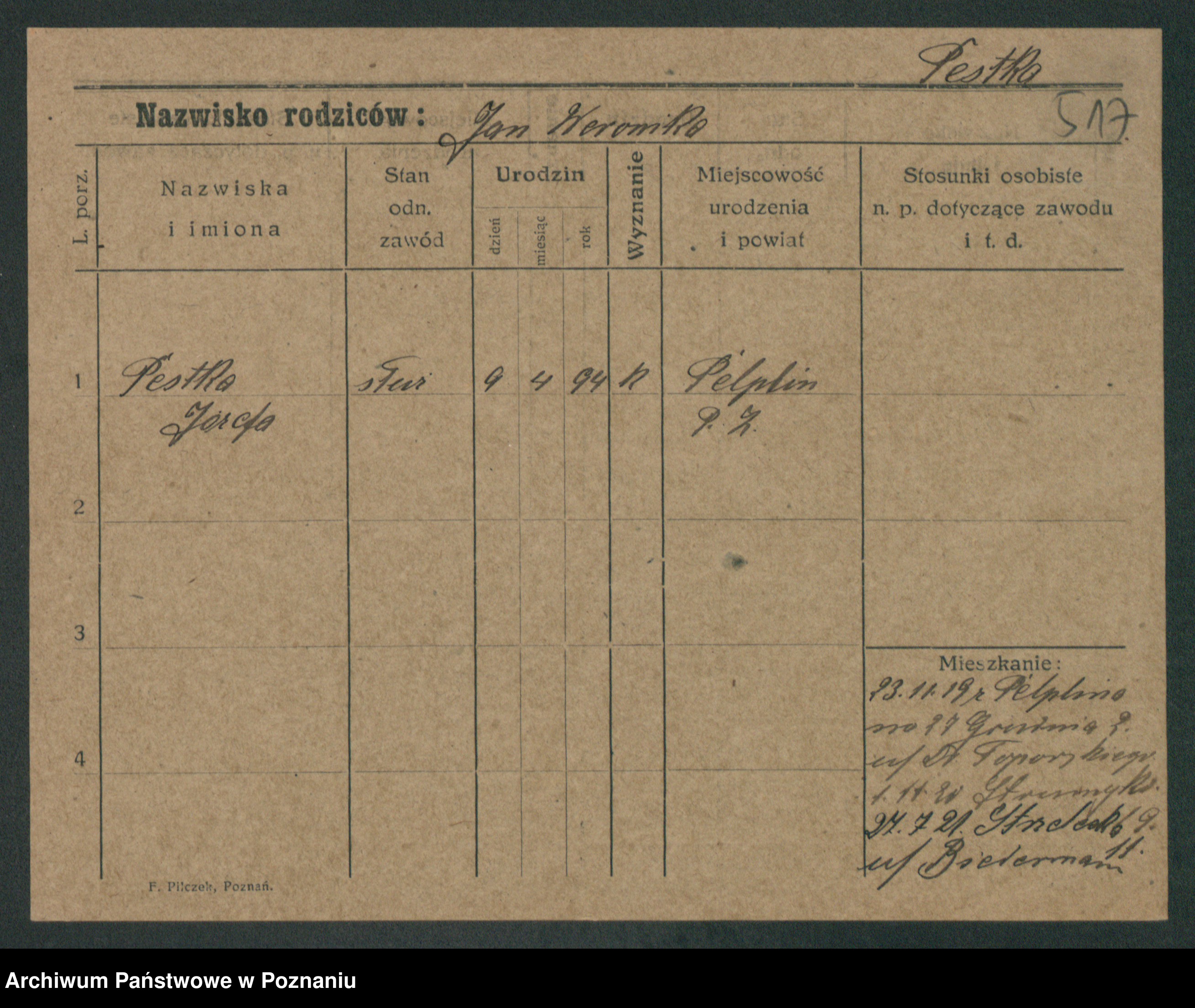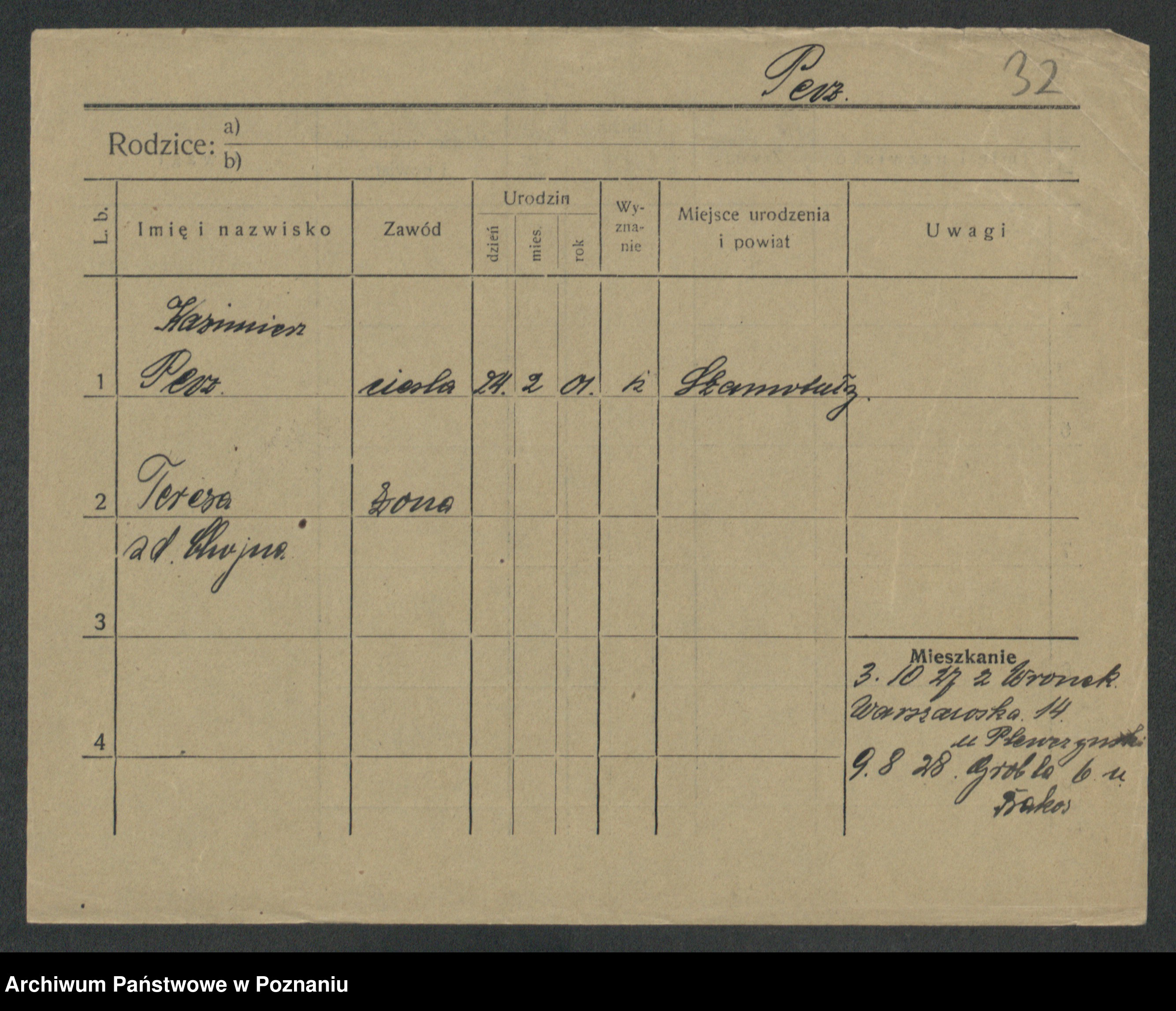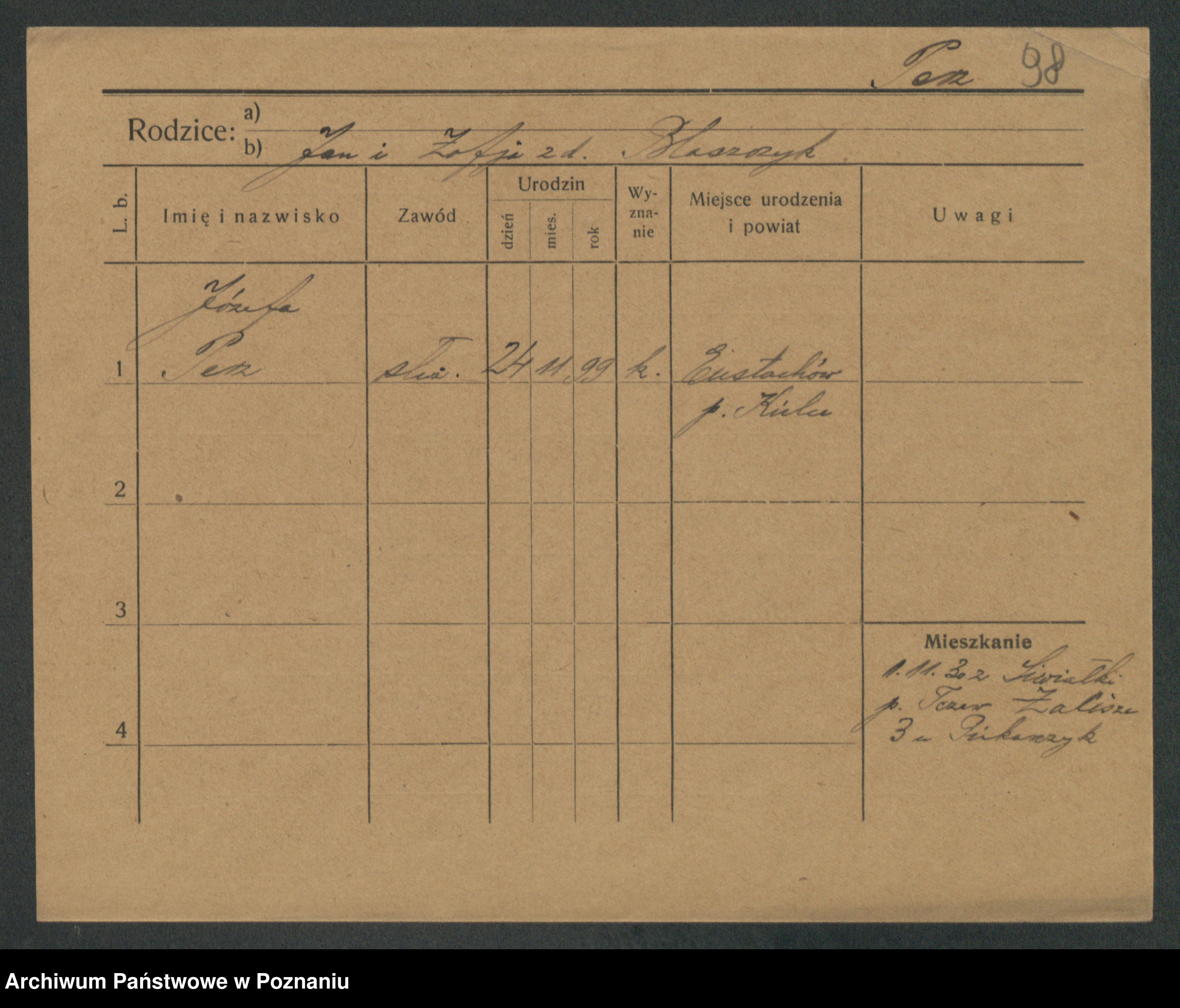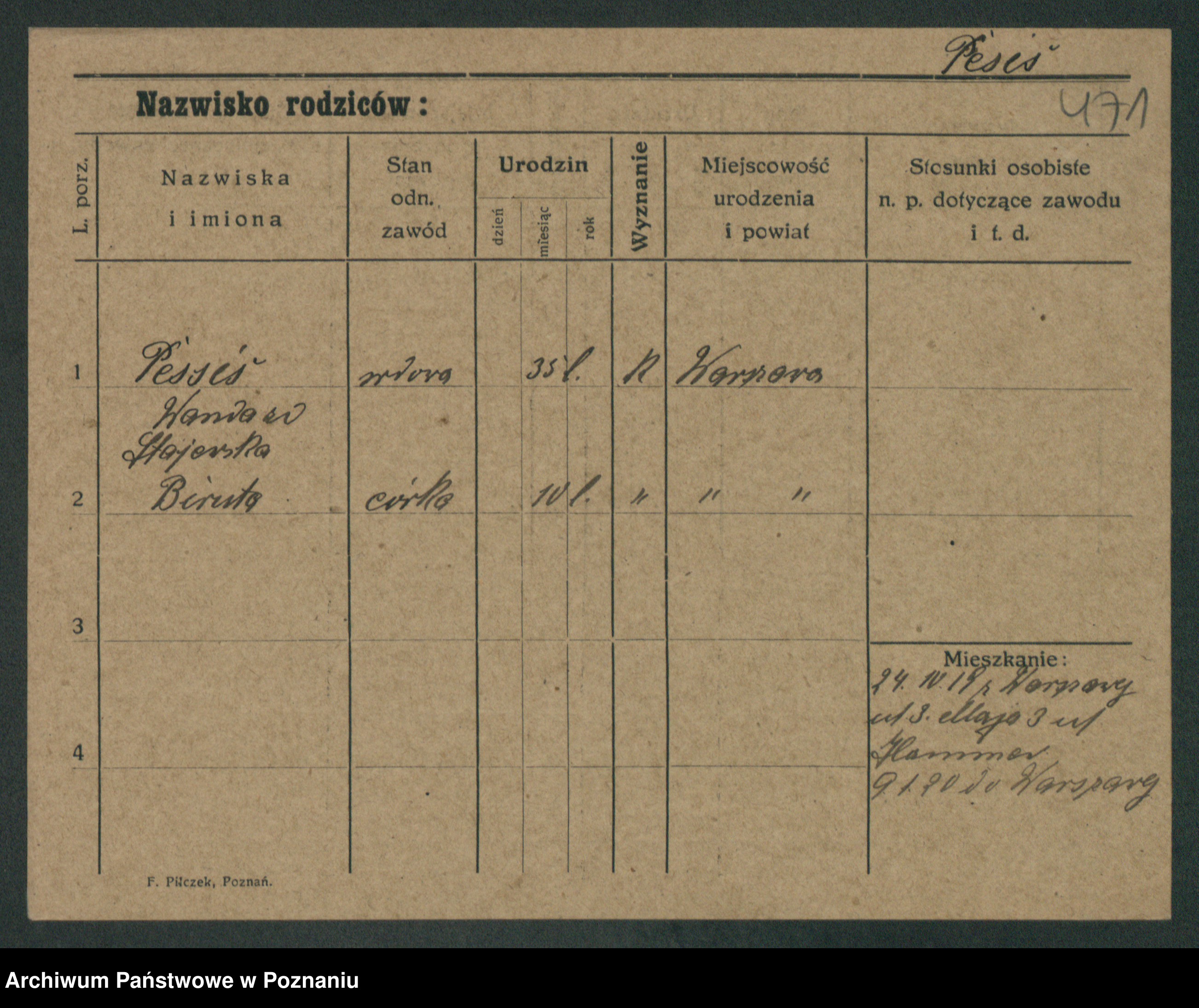 Podgląd karty osobowej dostępny jest po kliknięciu na nazwisko lub ikonkę karty. Można dokonywać powiększenia (ikony na górze) lub przechodzić między kolejnymi skanami (strzałki po bokach).