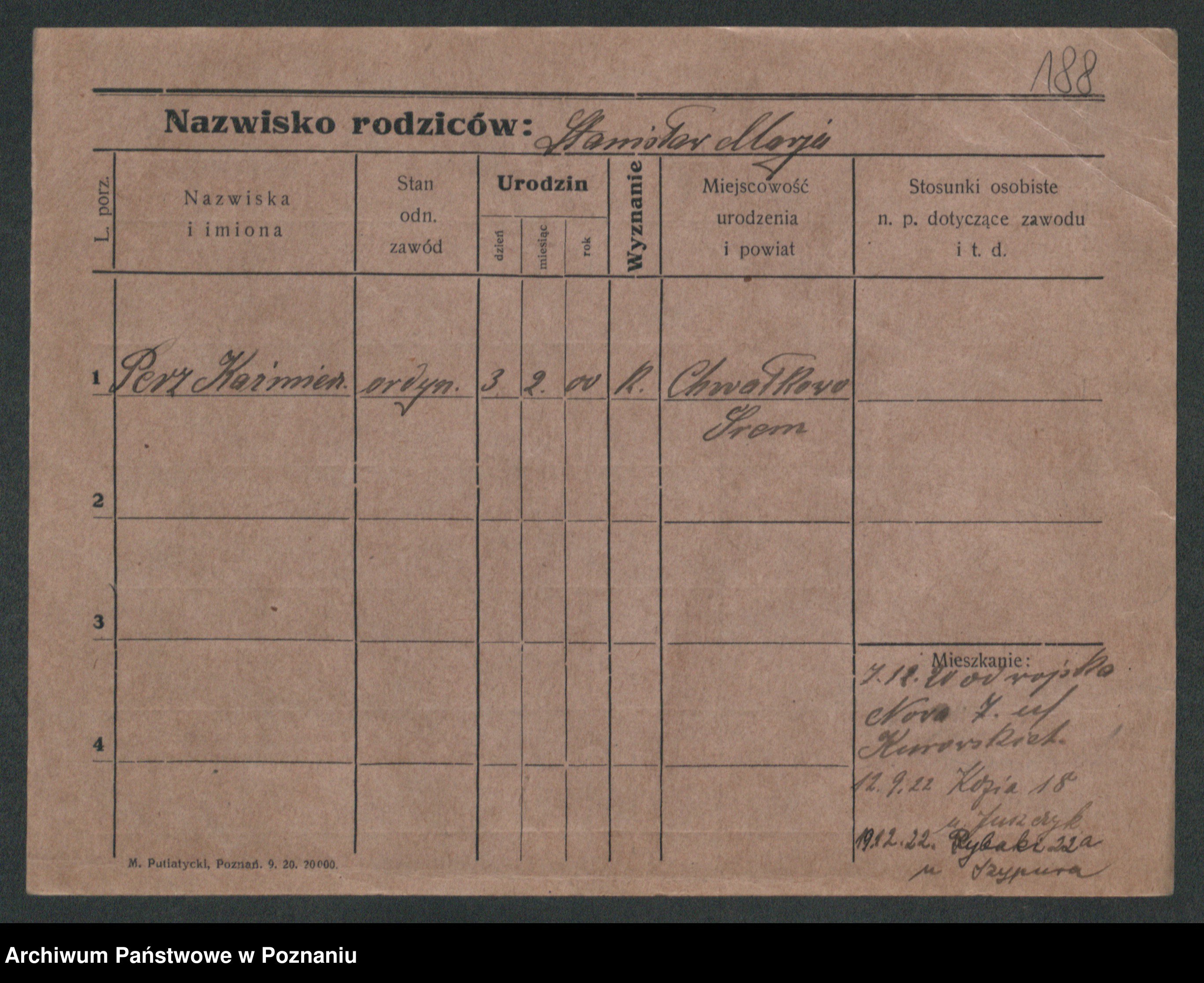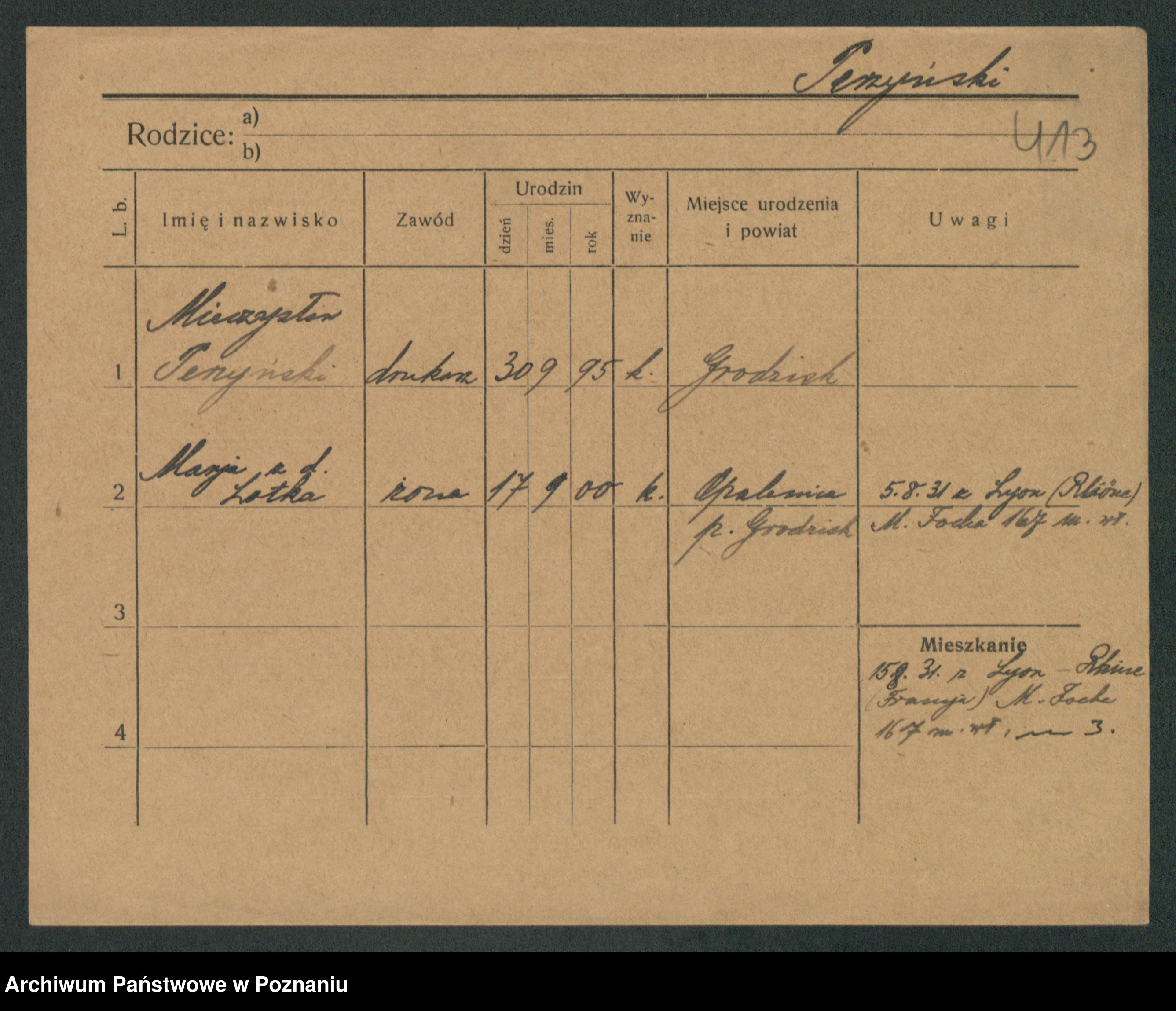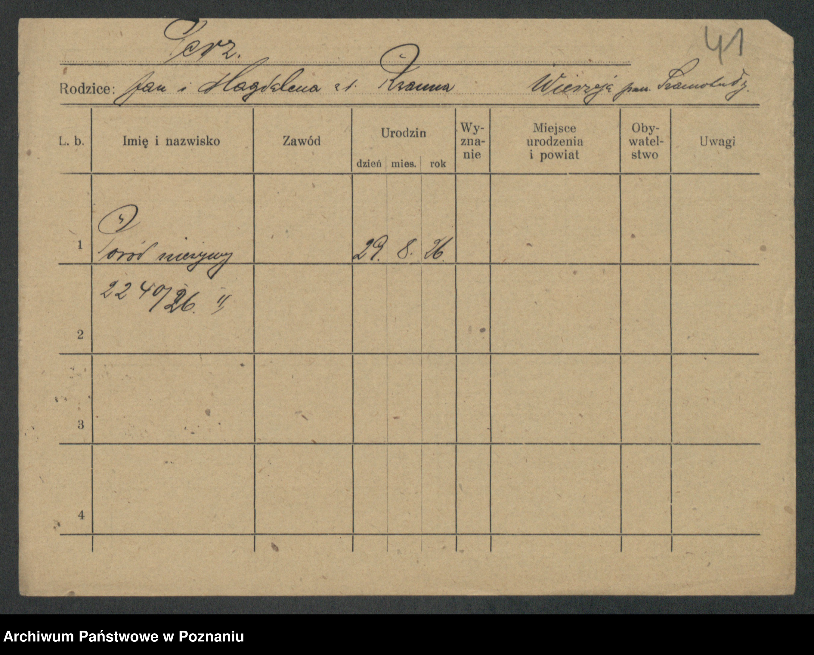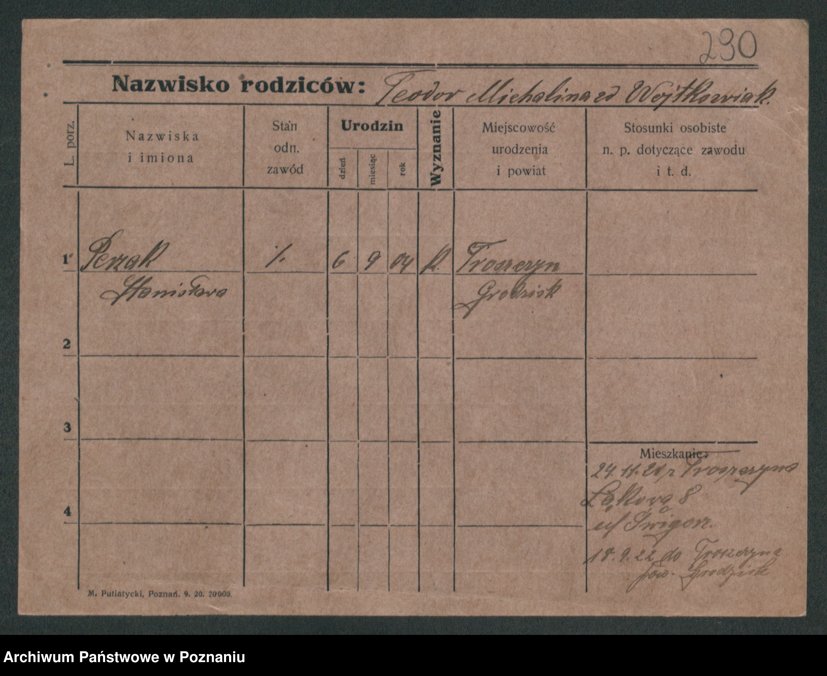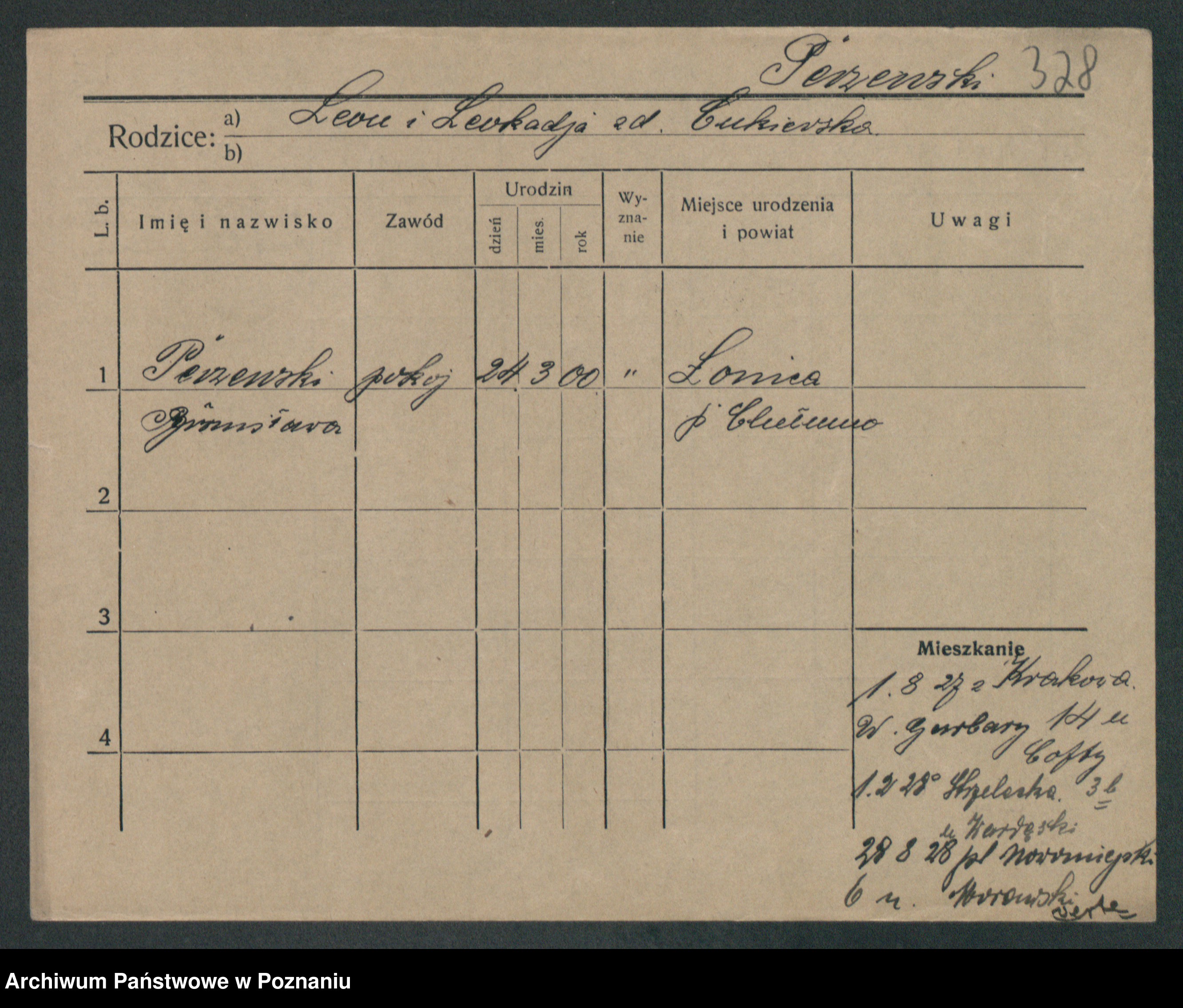Podgląd karty osobowej dostępny jest po kliknięciu na nazwisko lub ikonkę karty. Można dokonywać powiększenia (ikony na górze) lub przechodzić między kolejnymi skanami (strzałki po bokach).