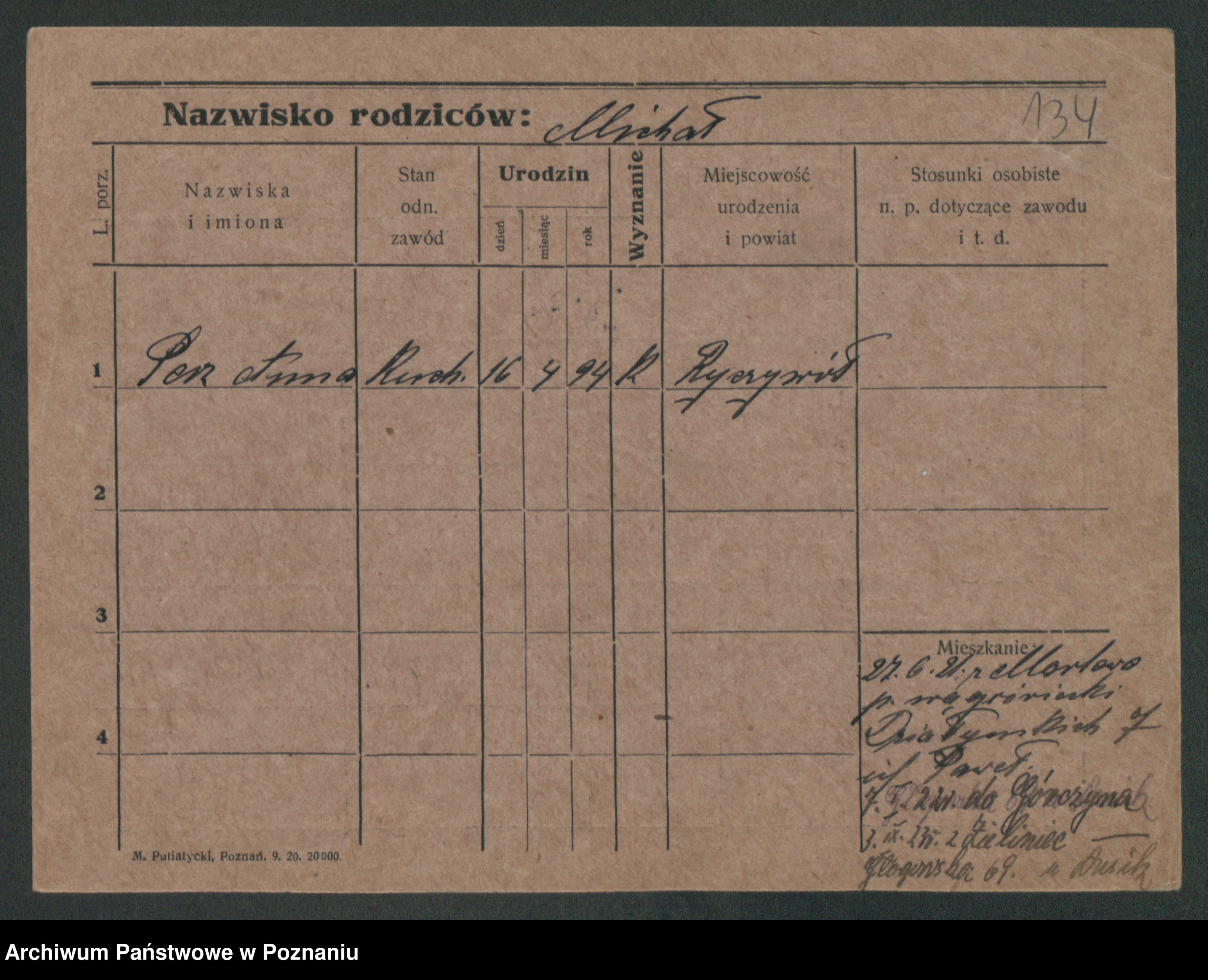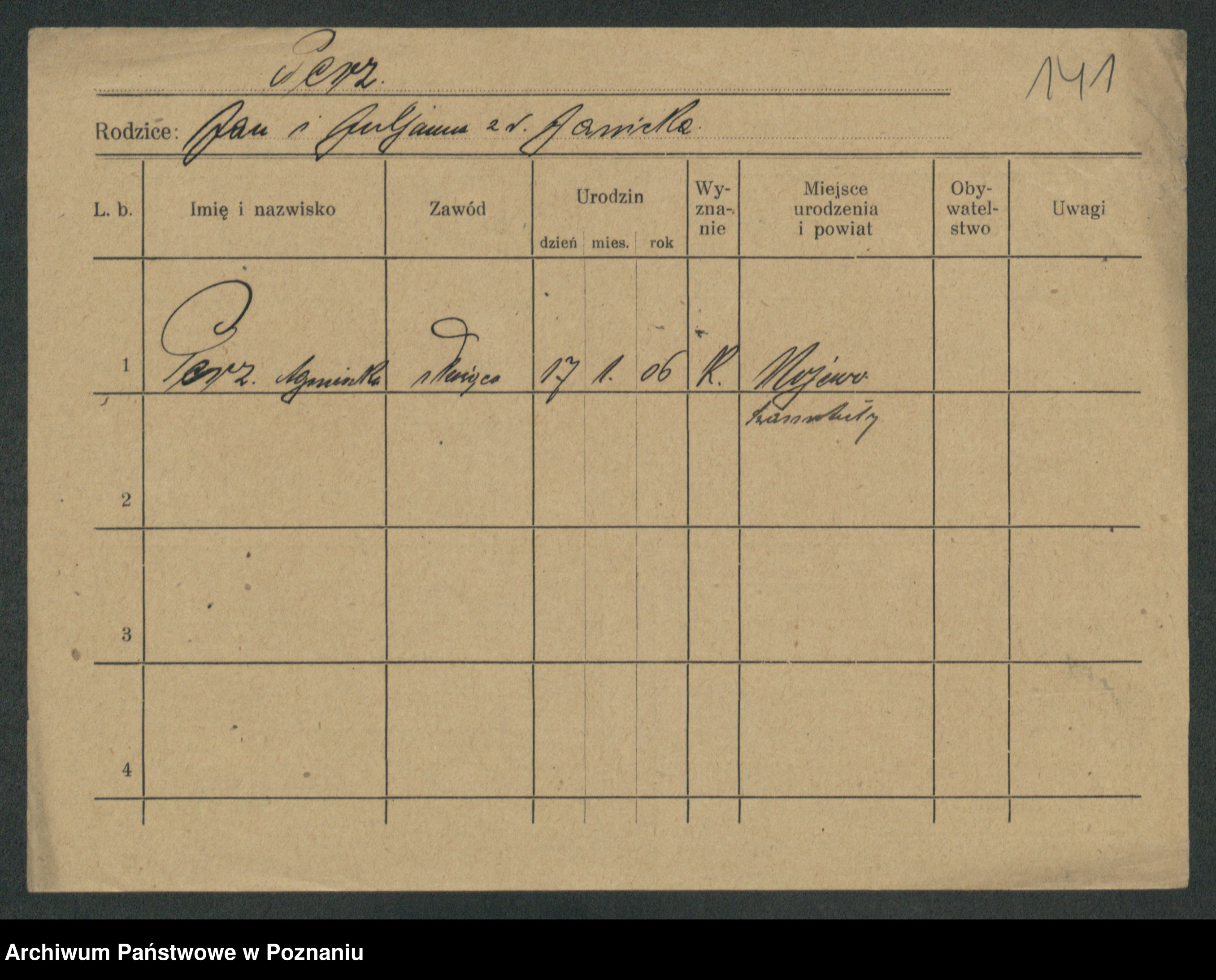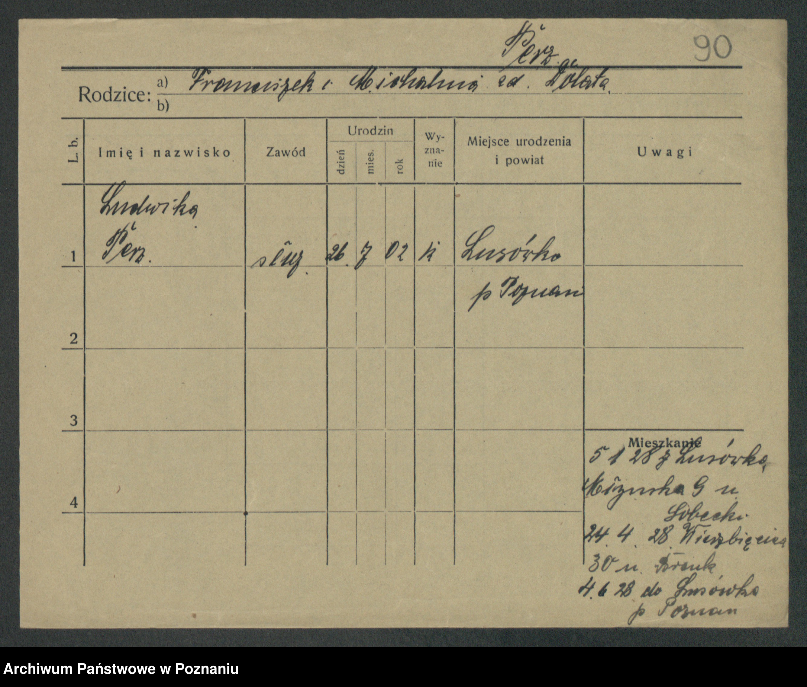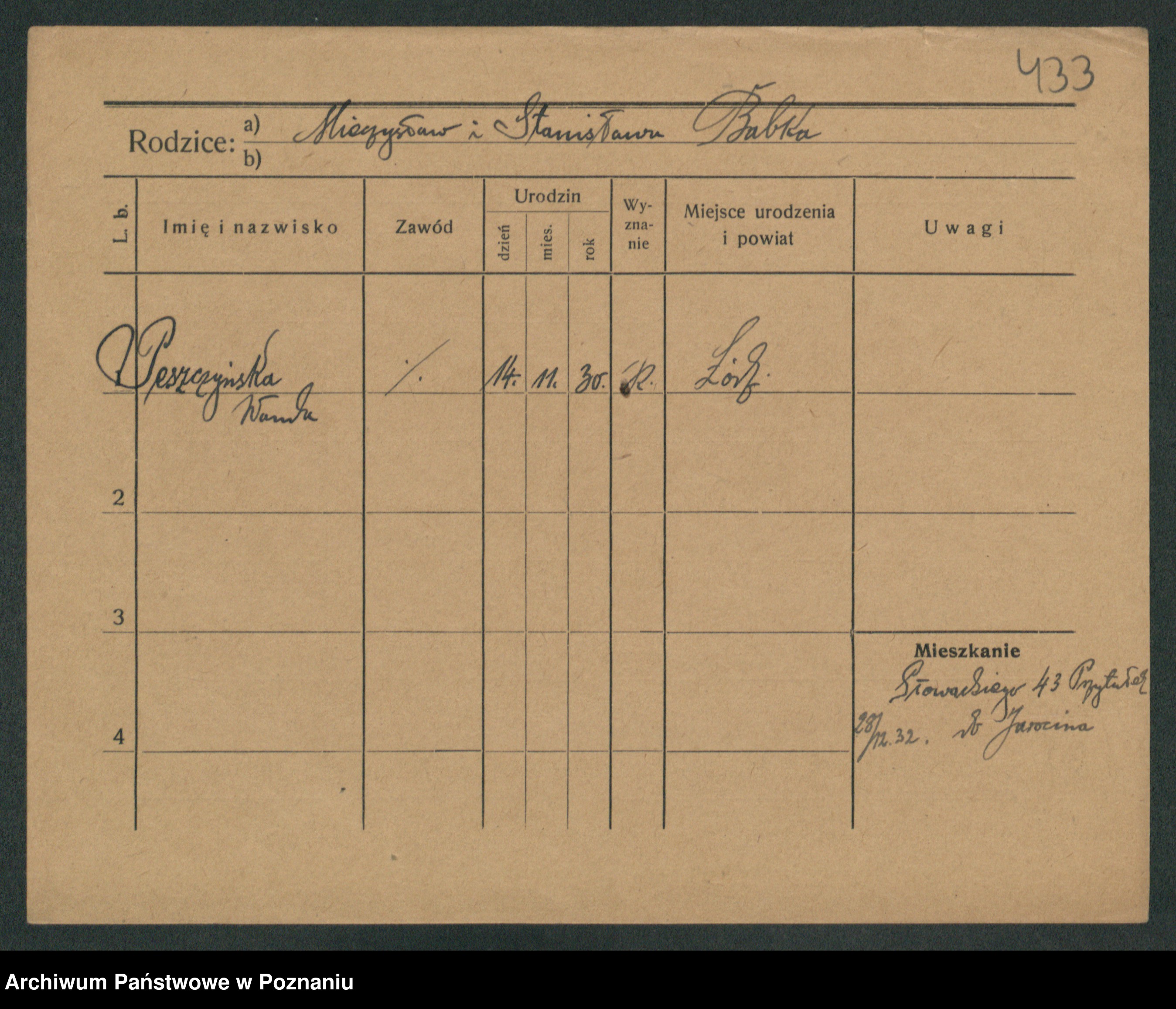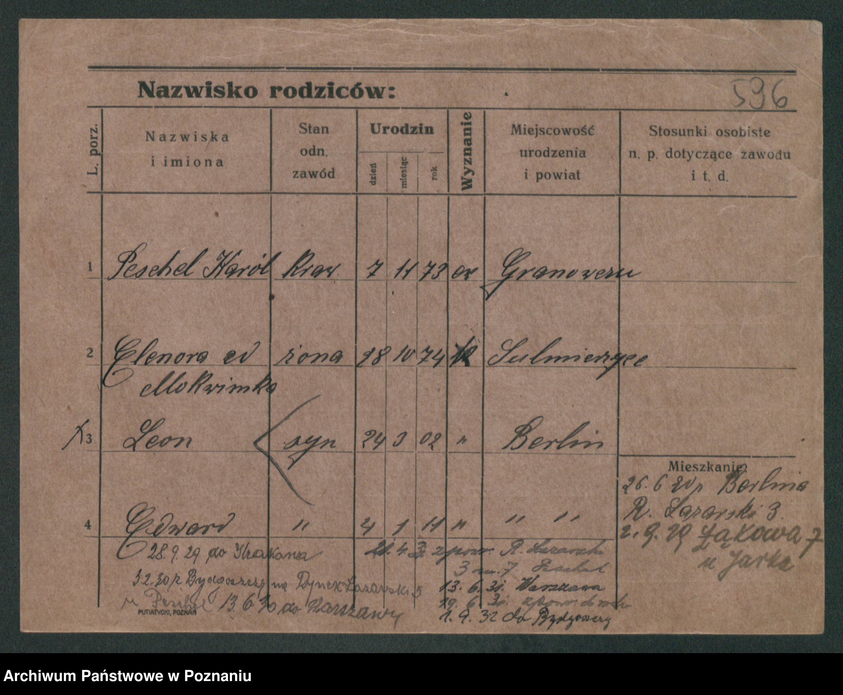 Podgląd karty osobowej dostępny jest po kliknięciu na nazwisko lub ikonkę karty. Można dokonywać powiększenia (ikony na górze) lub przechodzić między kolejnymi skanami (strzałki po bokach).