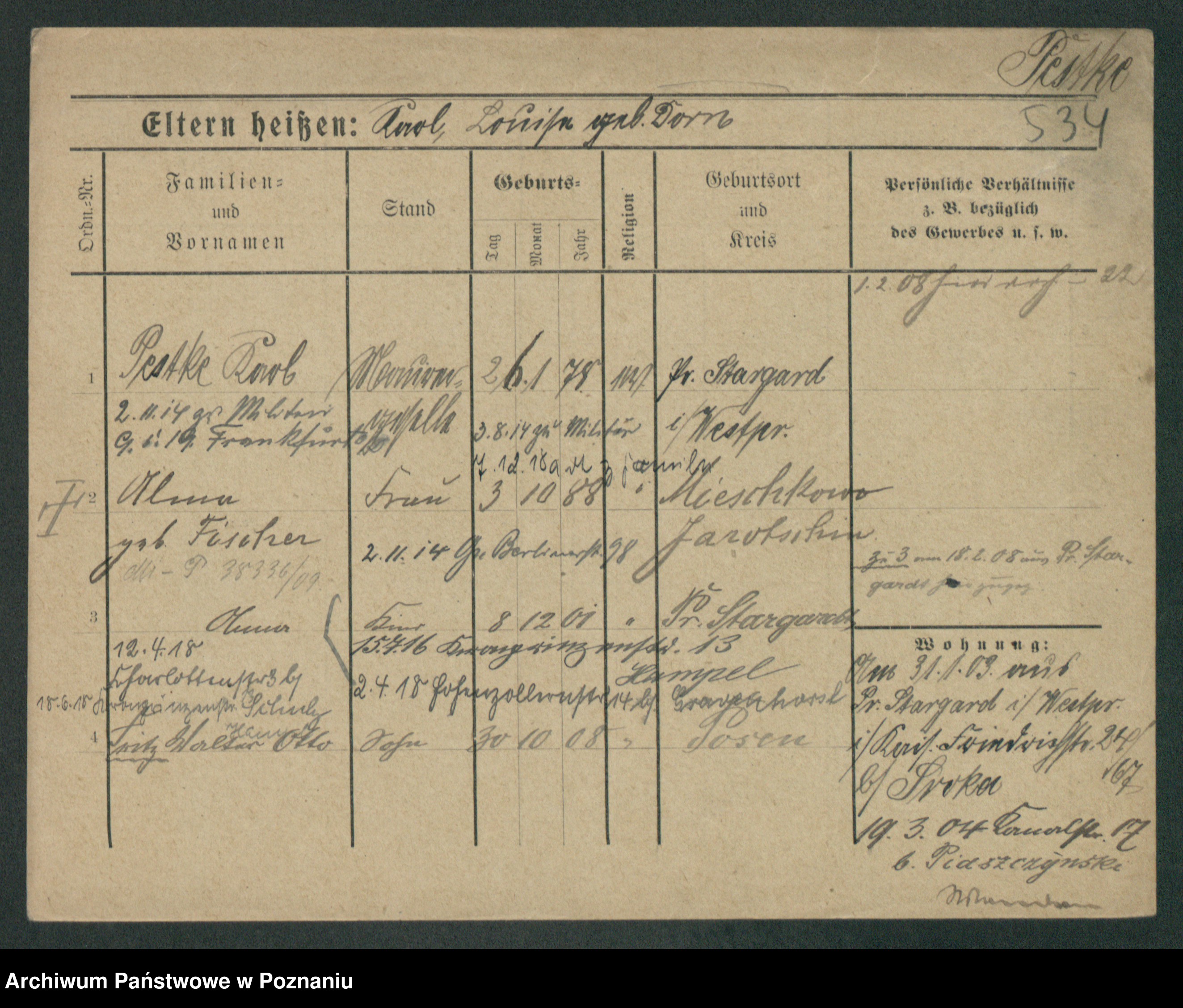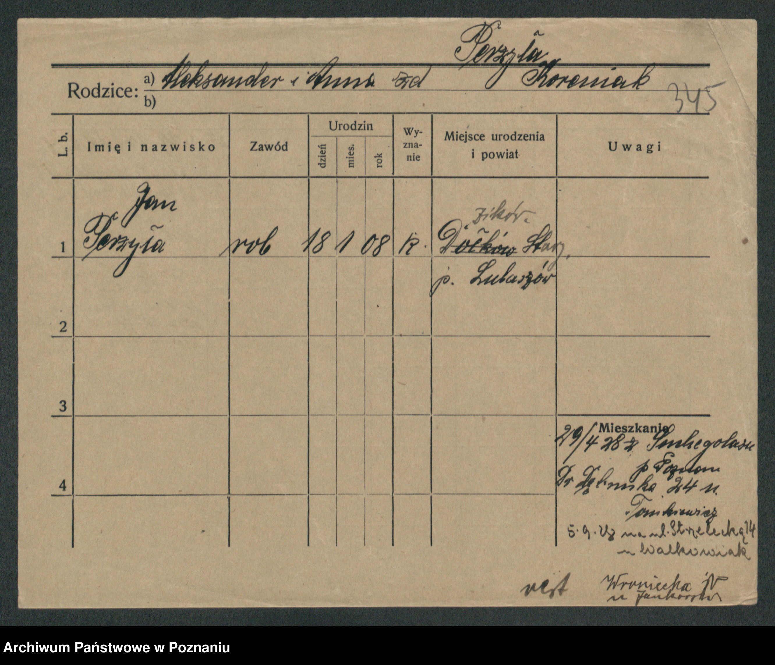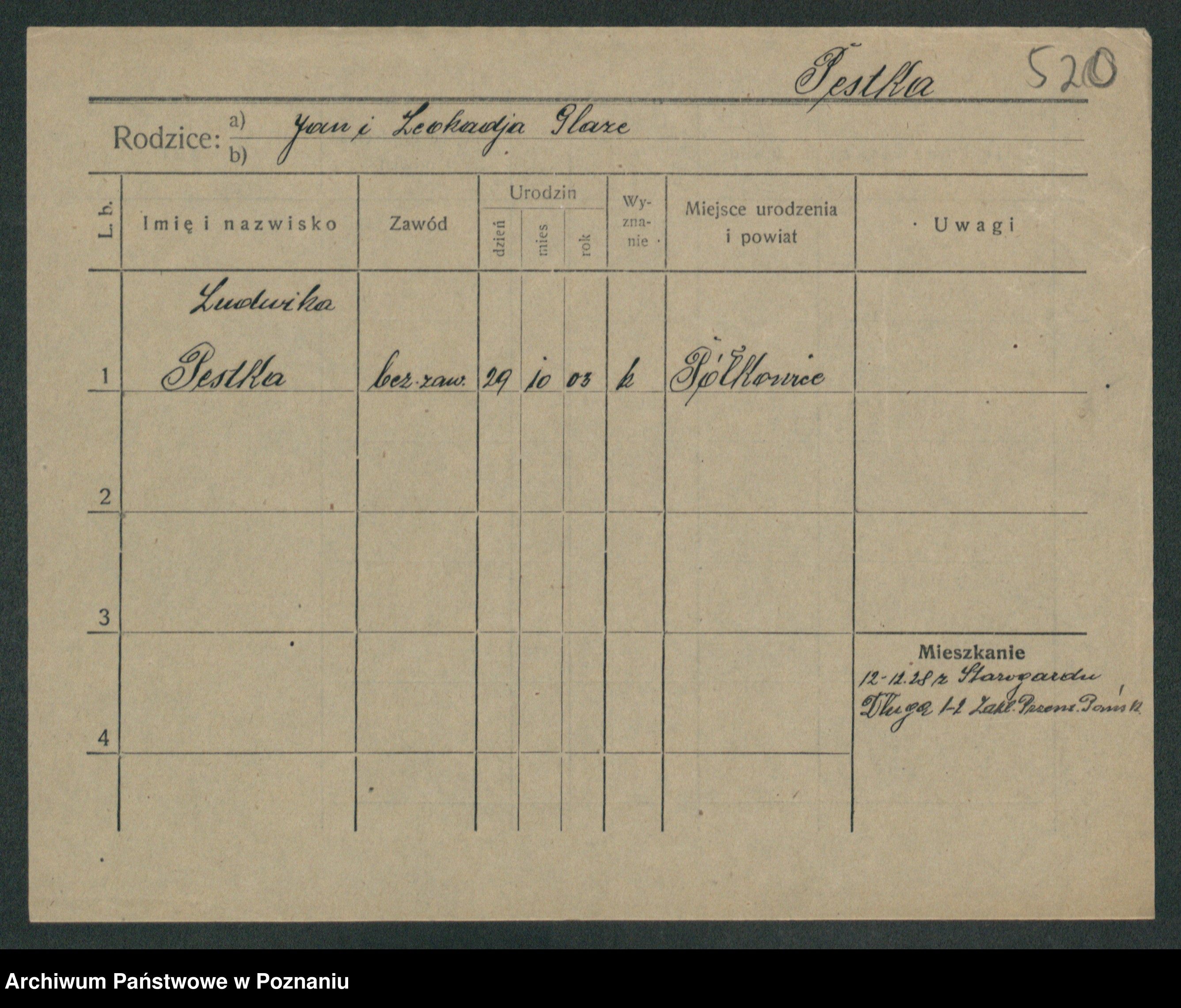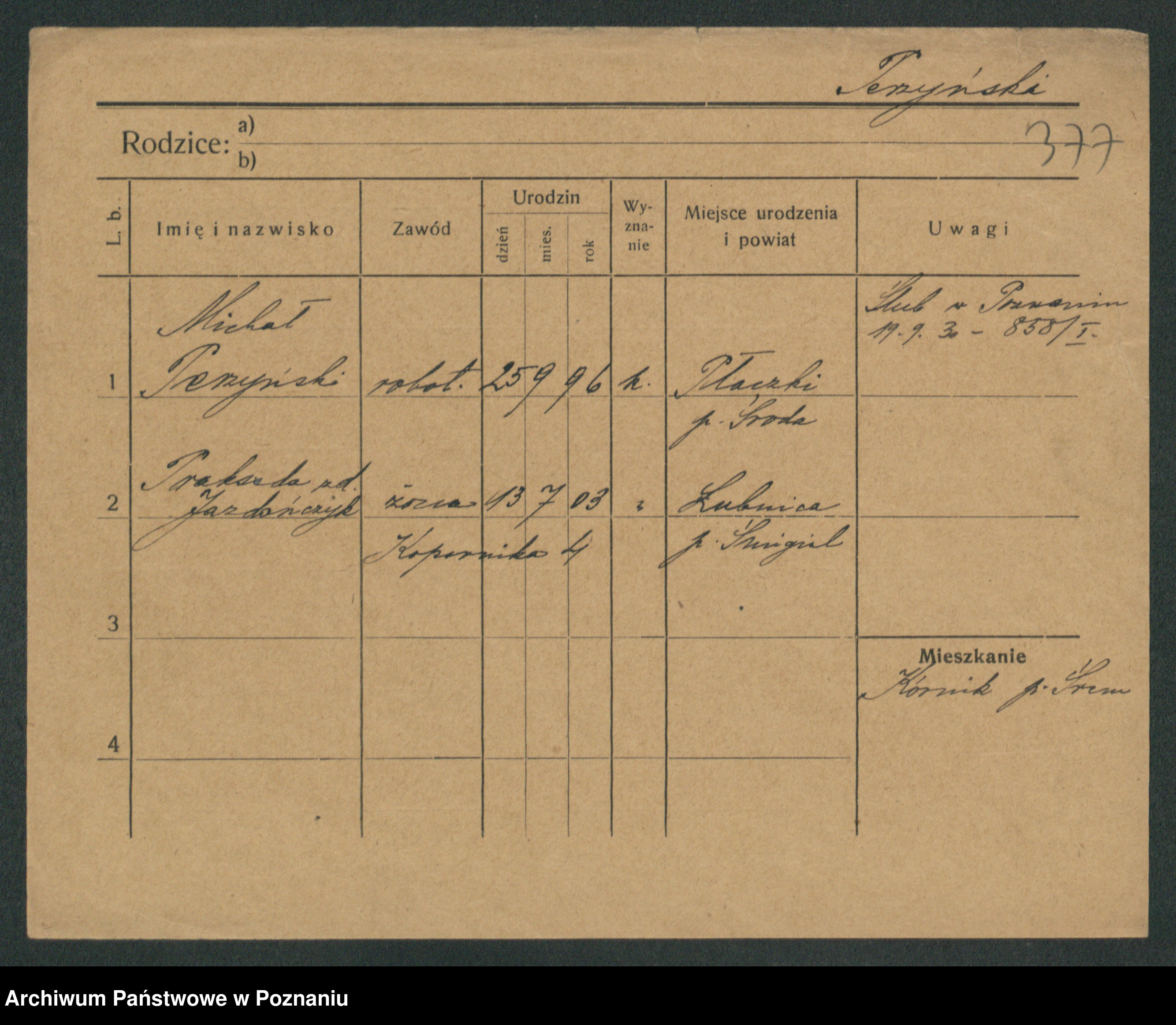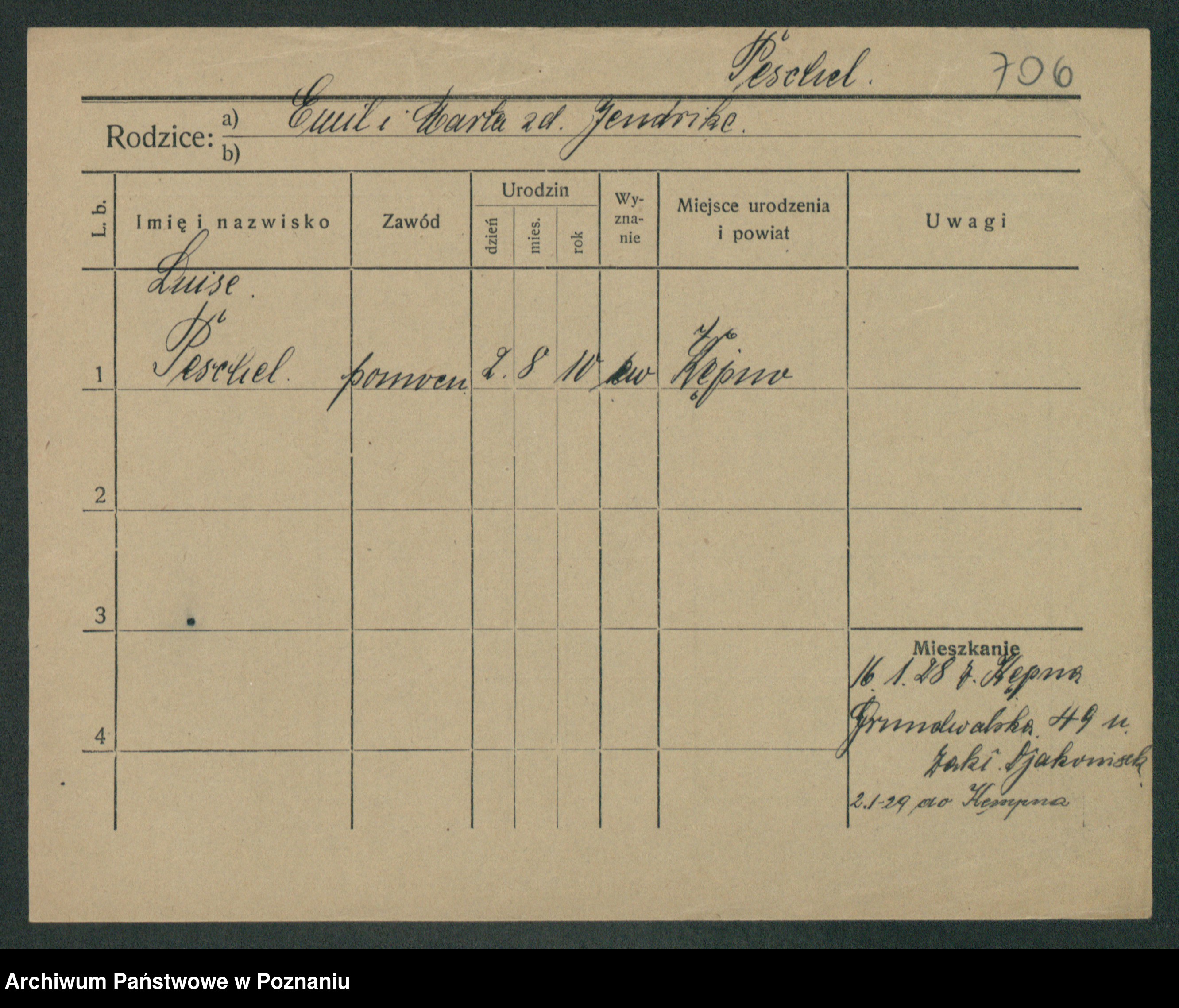 Podgląd karty osobowej dostępny jest po kliknięciu na nazwisko lub ikonkę karty. Można dokonywać powiększenia (ikony na górze) lub przechodzić między kolejnymi skanami (strzałki po bokach).