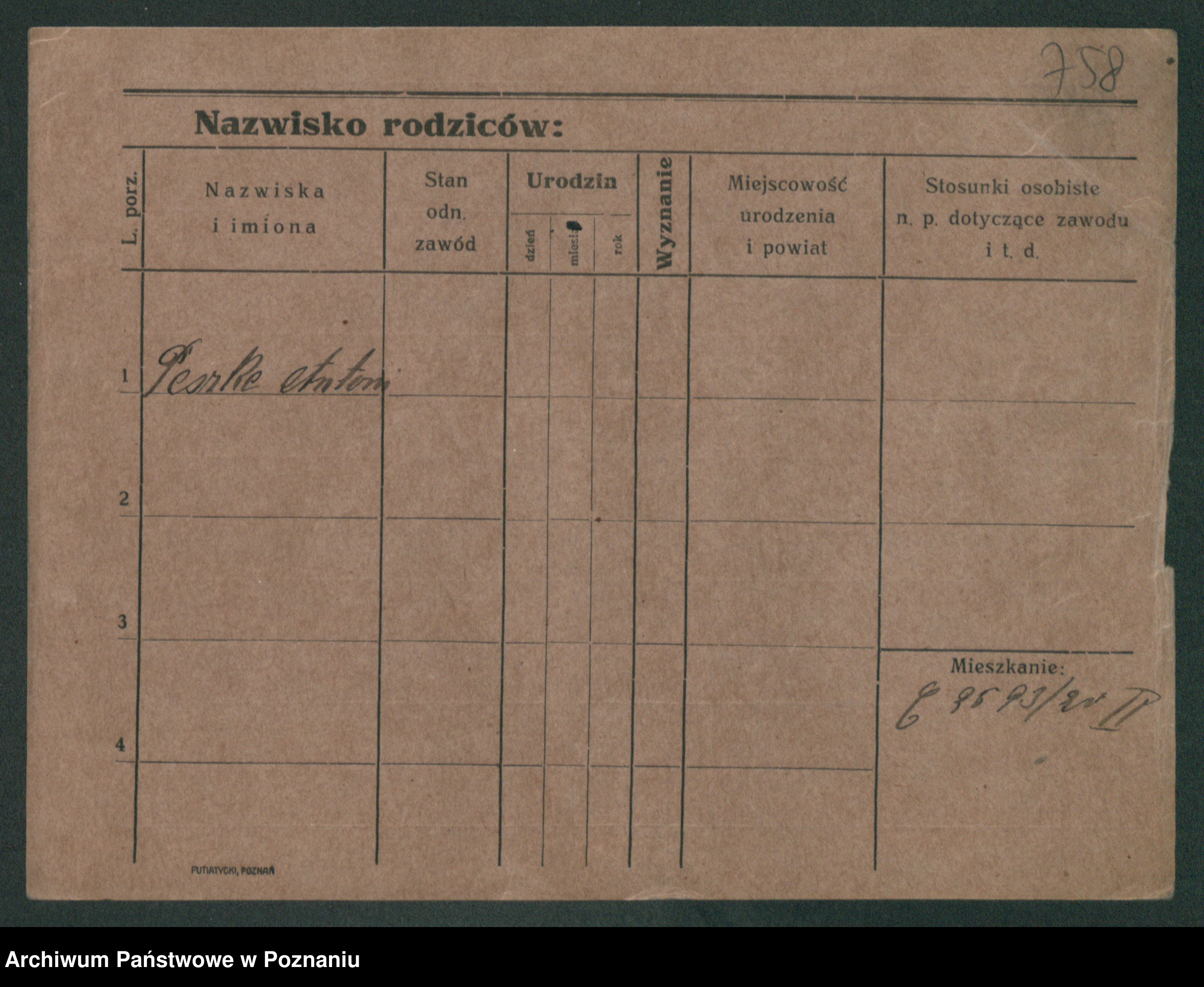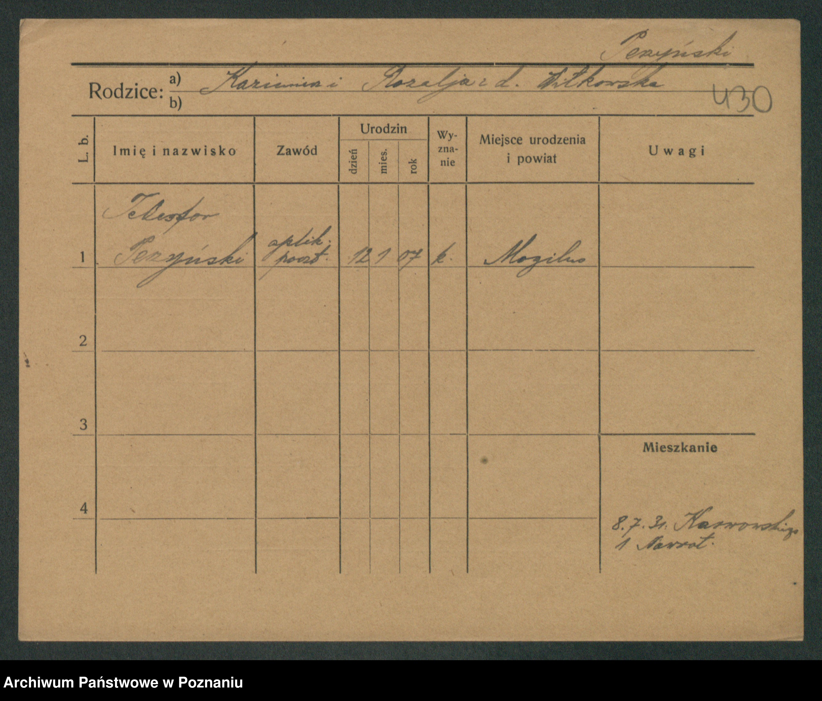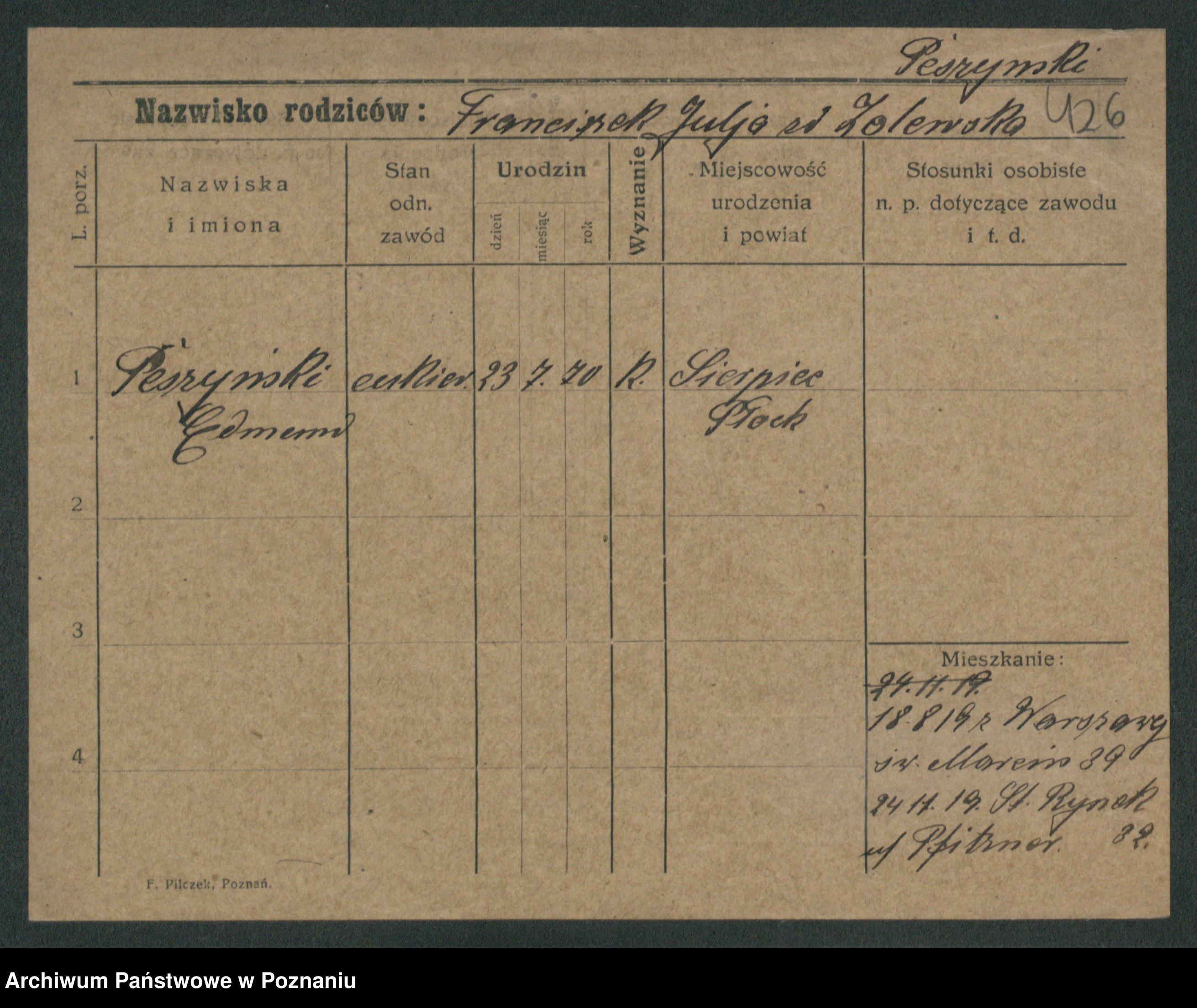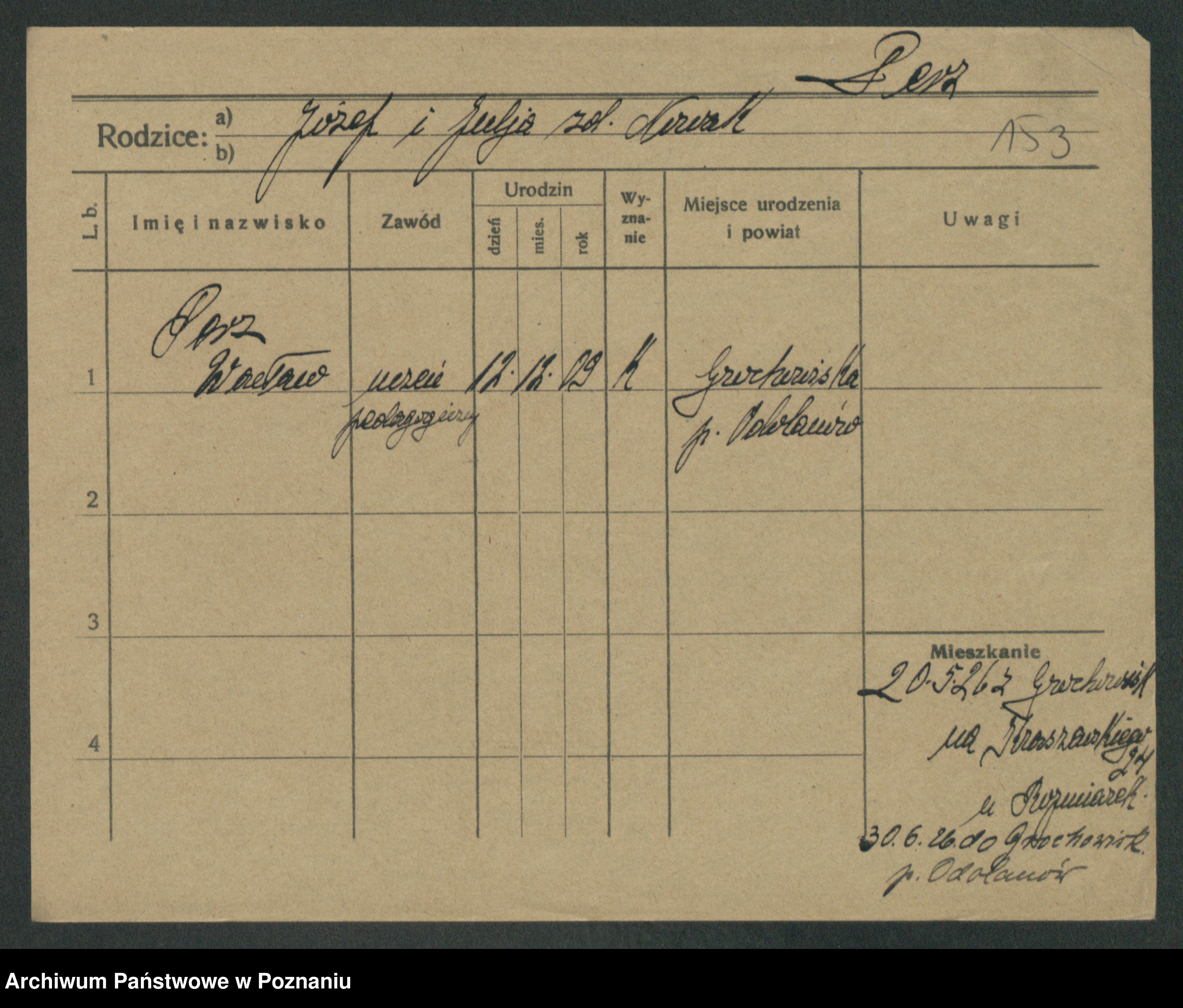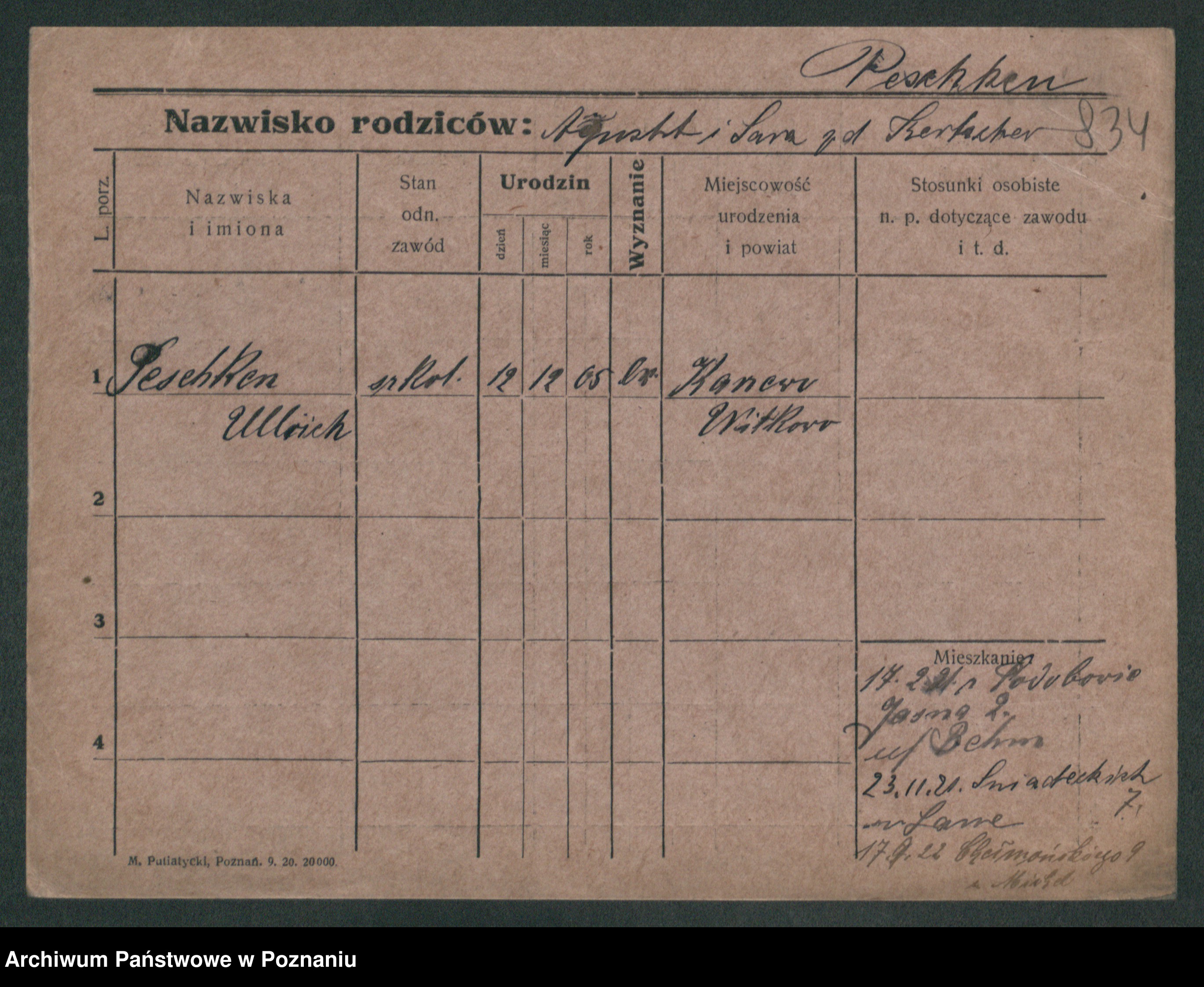Podgląd karty osobowej dostępny jest po kliknięciu na nazwisko lub ikonkę karty. Można dokonywać powiększenia (ikony na górze) lub przechodzić między kolejnymi skanami (strzałki po bokach).