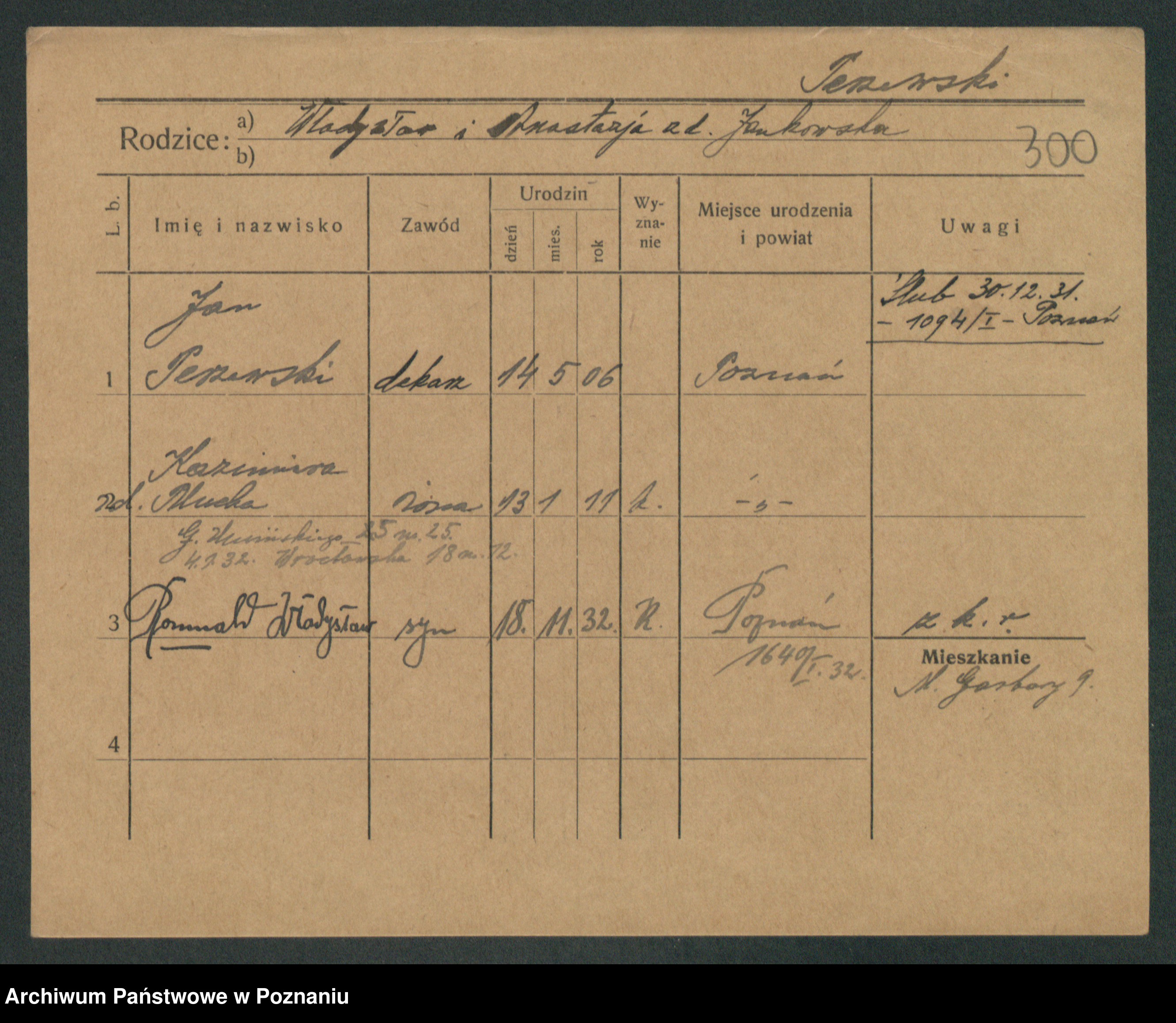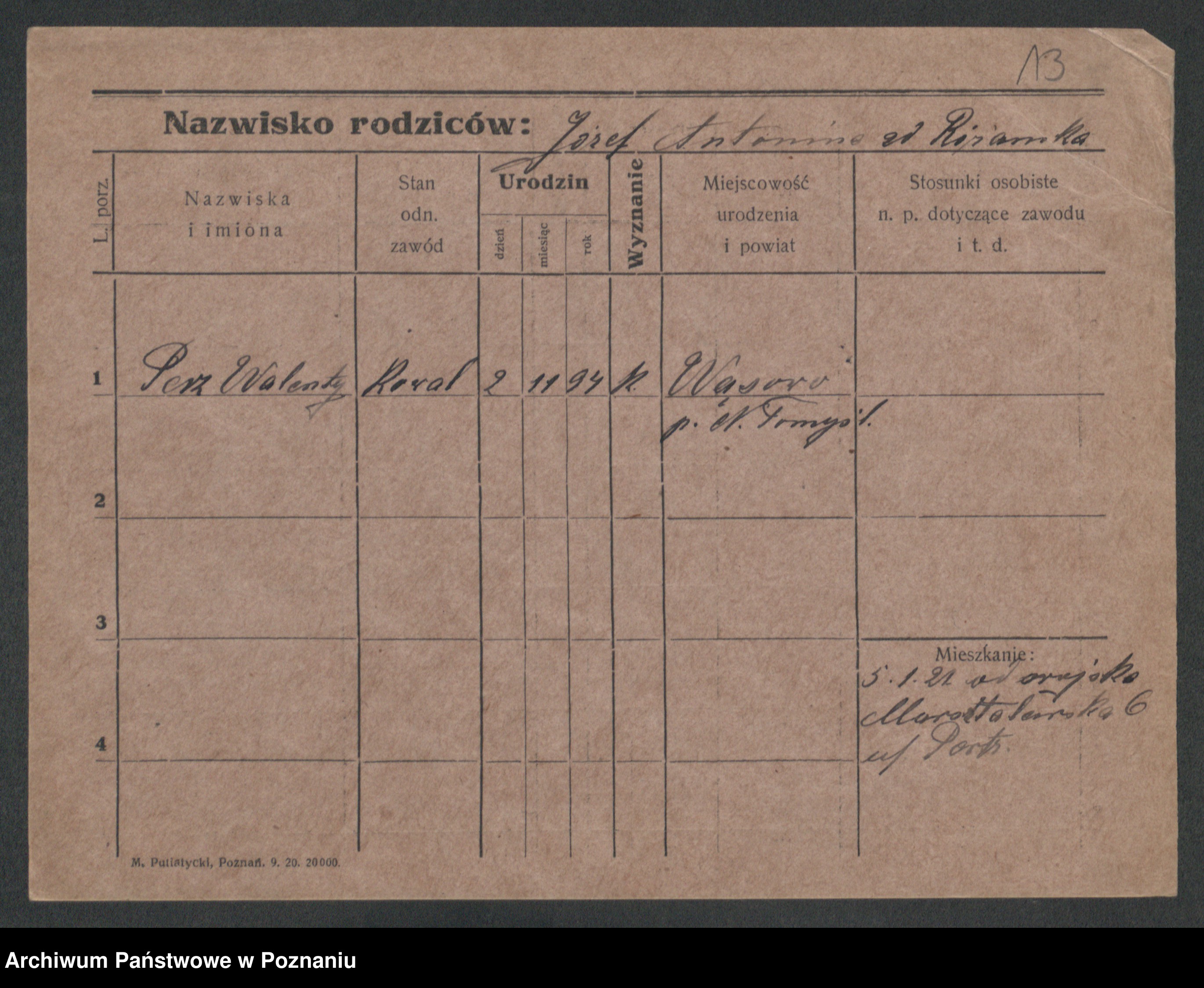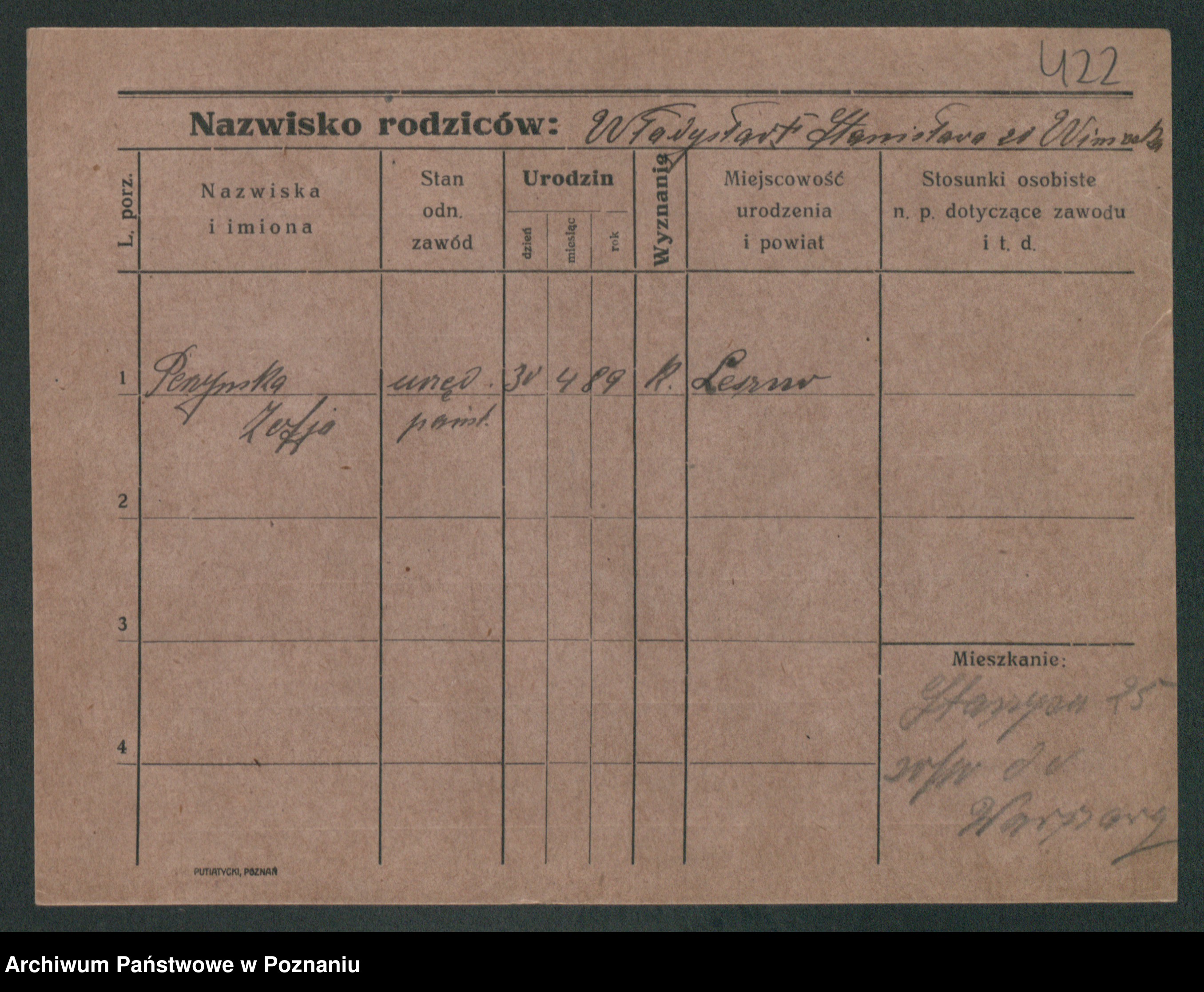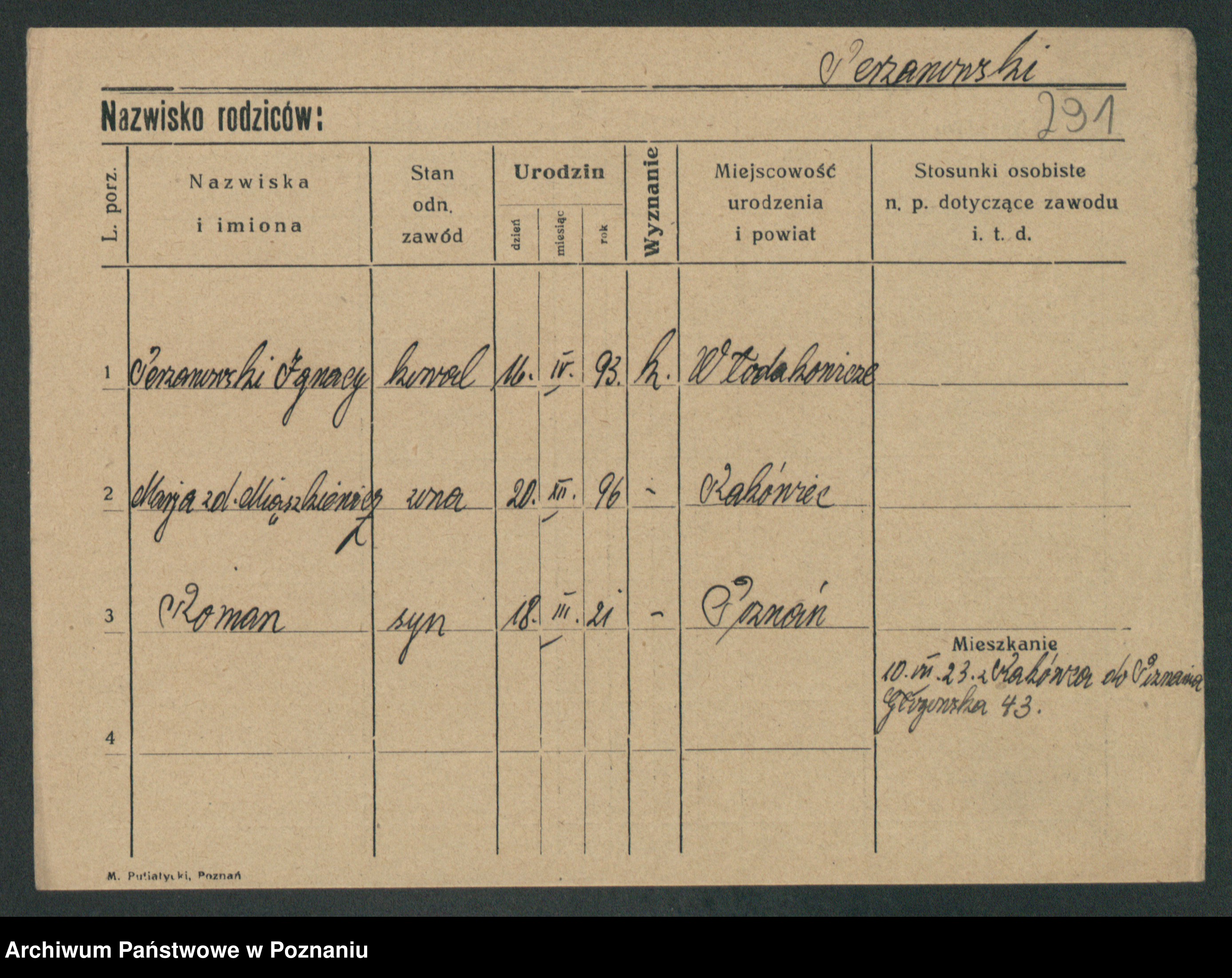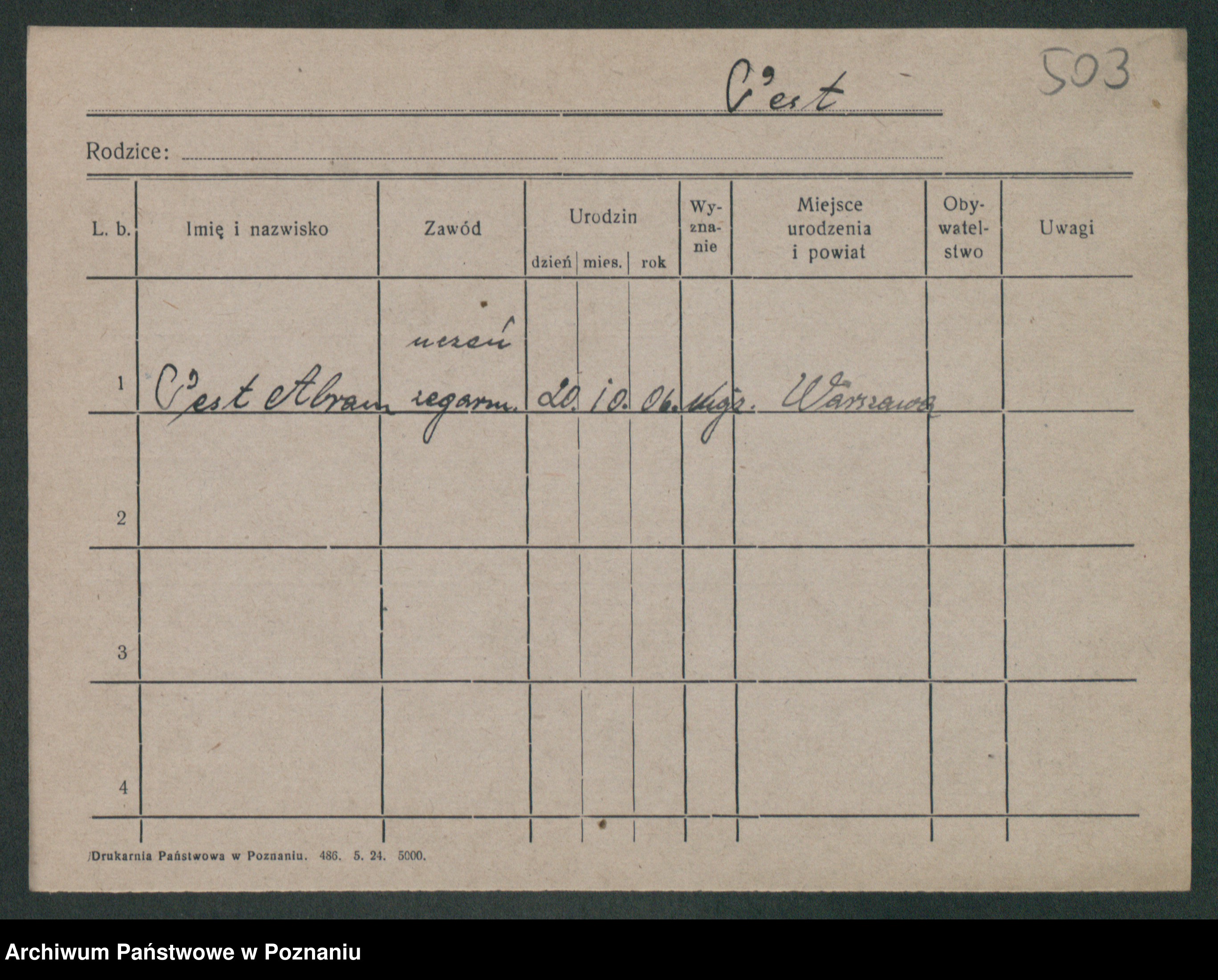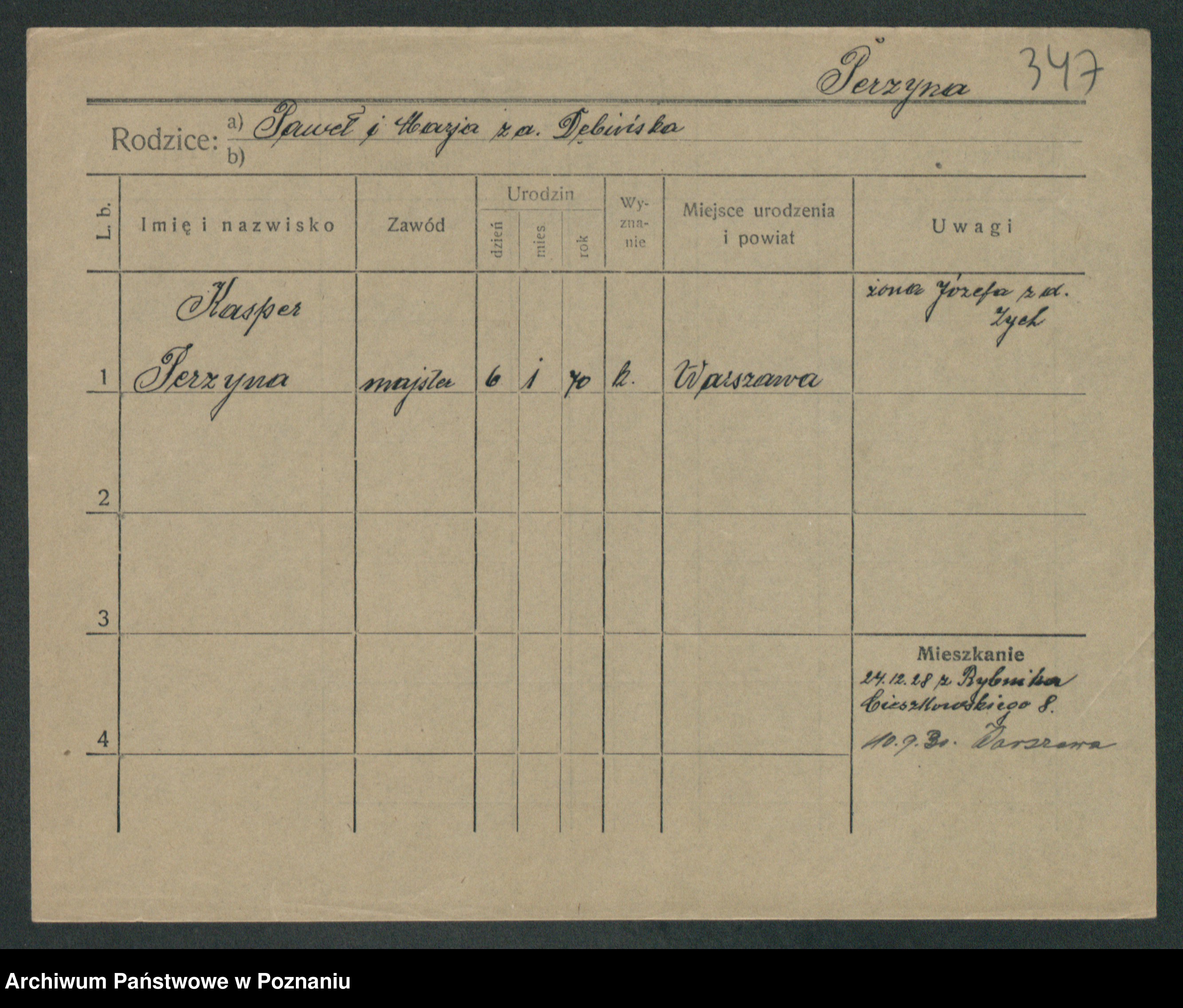 Podgląd karty osobowej dostępny jest po kliknięciu na nazwisko lub ikonkę karty. Można dokonywać powiększenia (ikony na górze) lub przechodzić między kolejnymi skanami (strzałki po bokach).