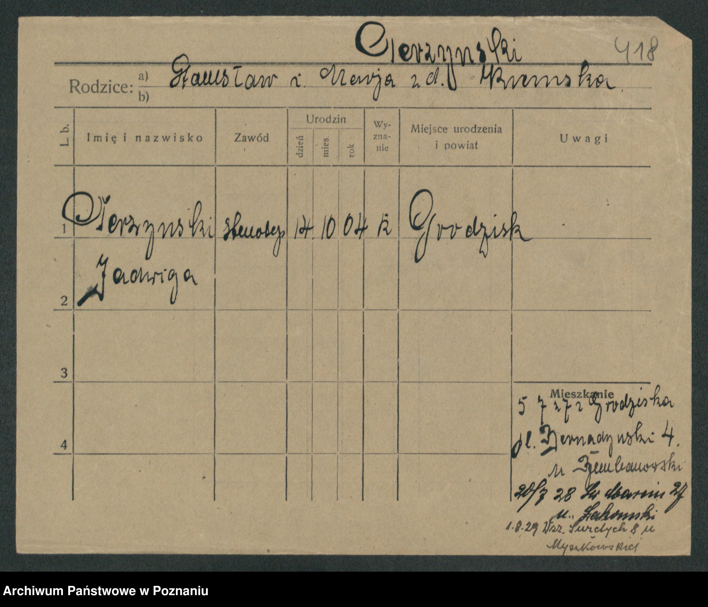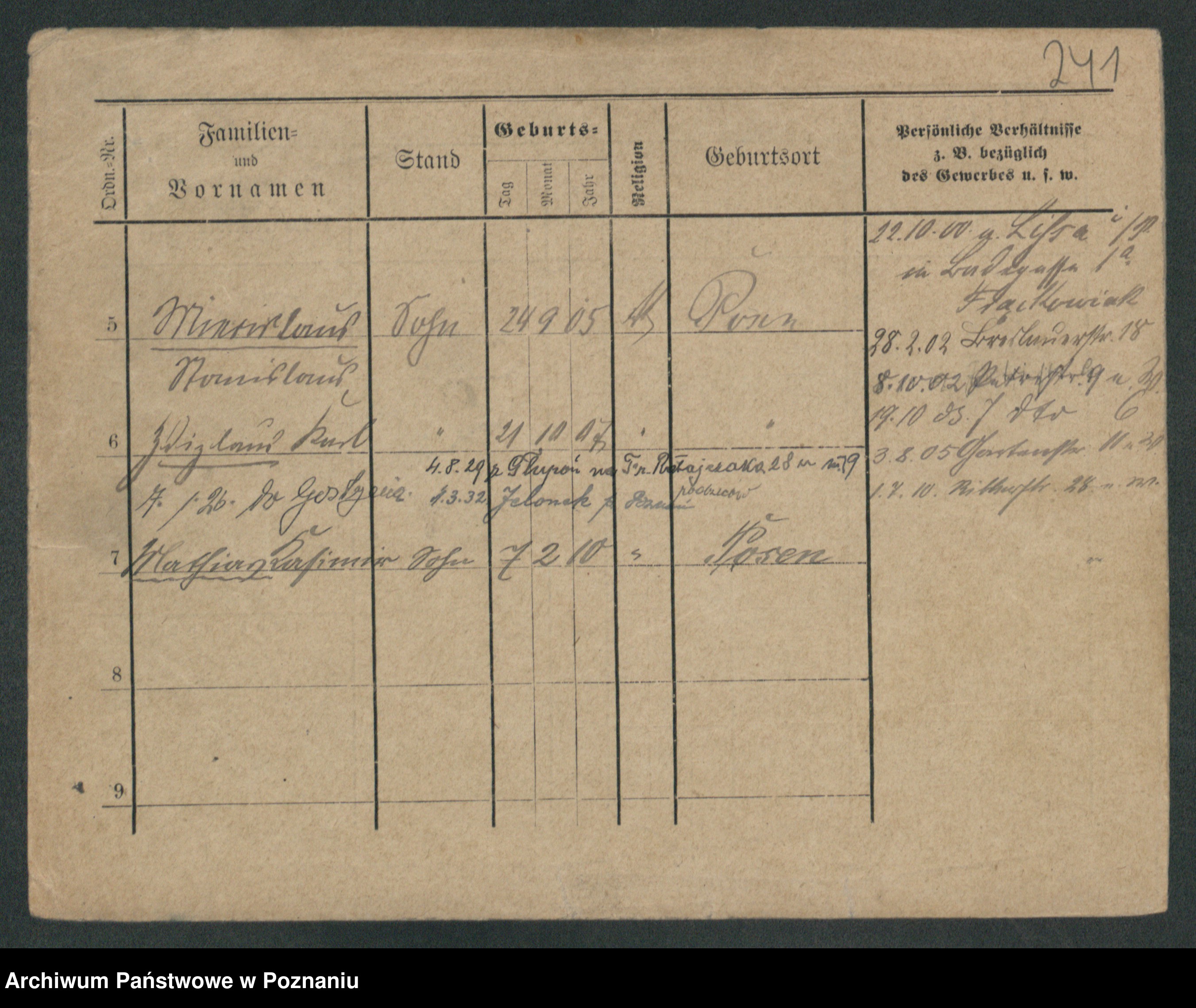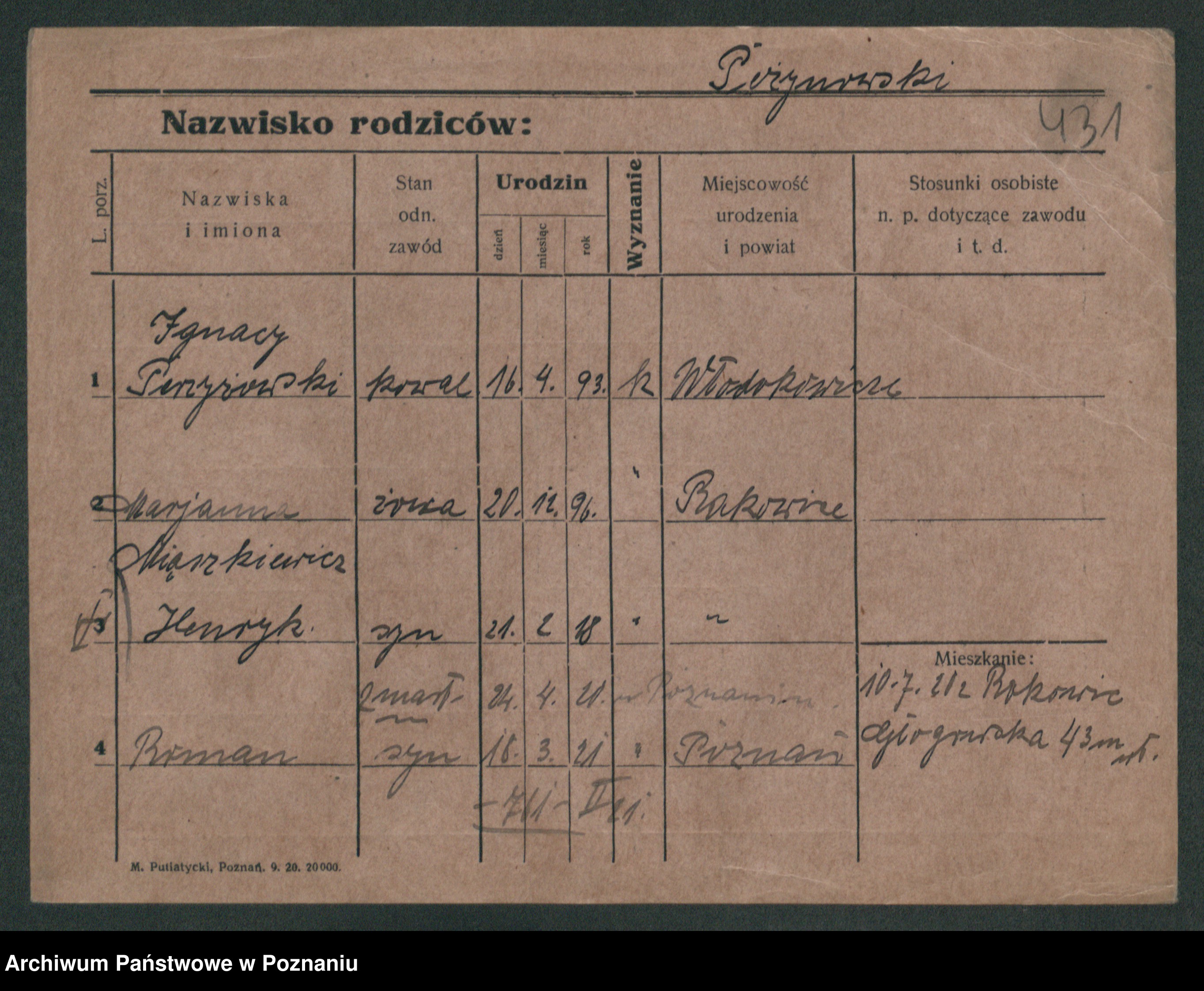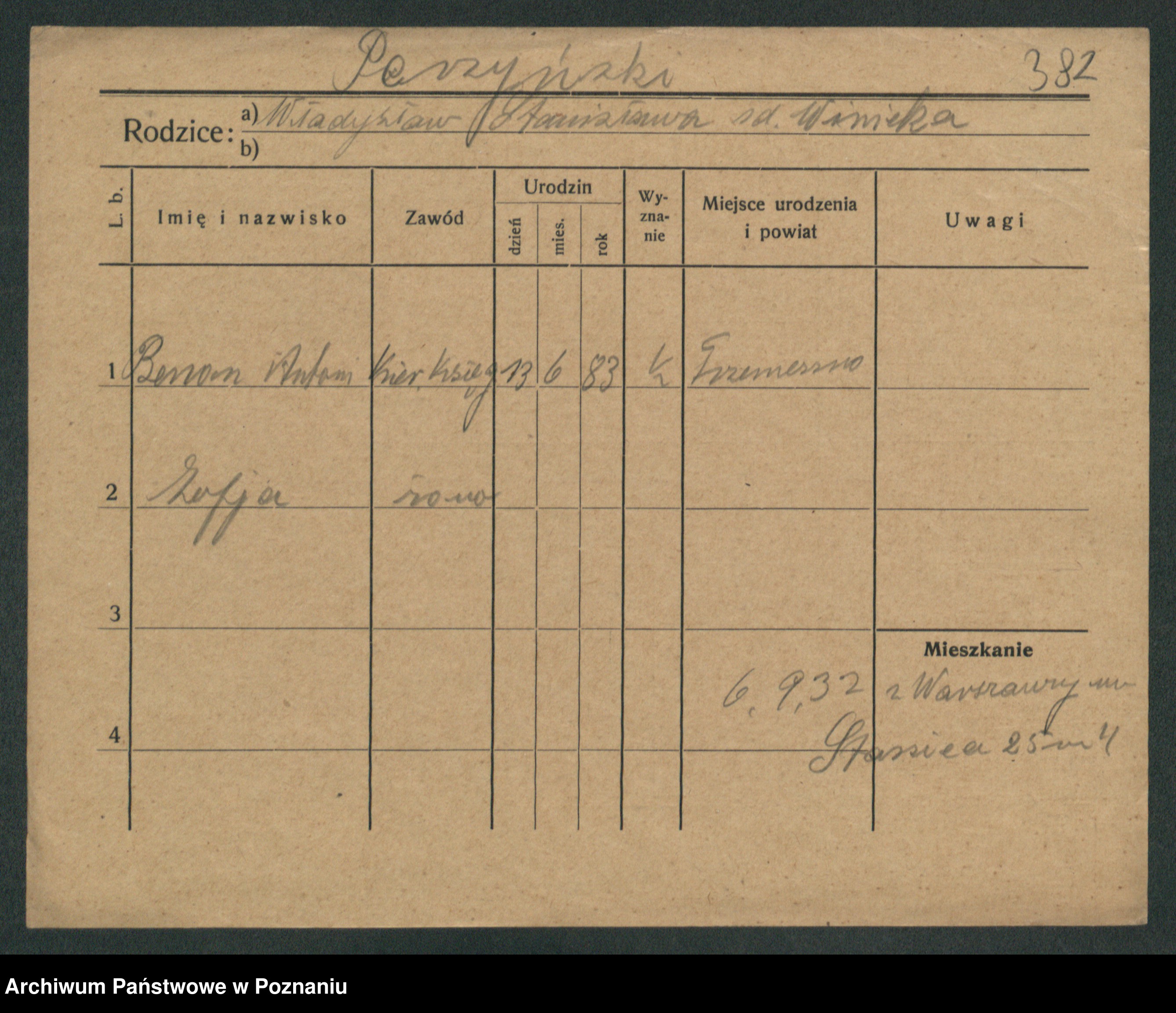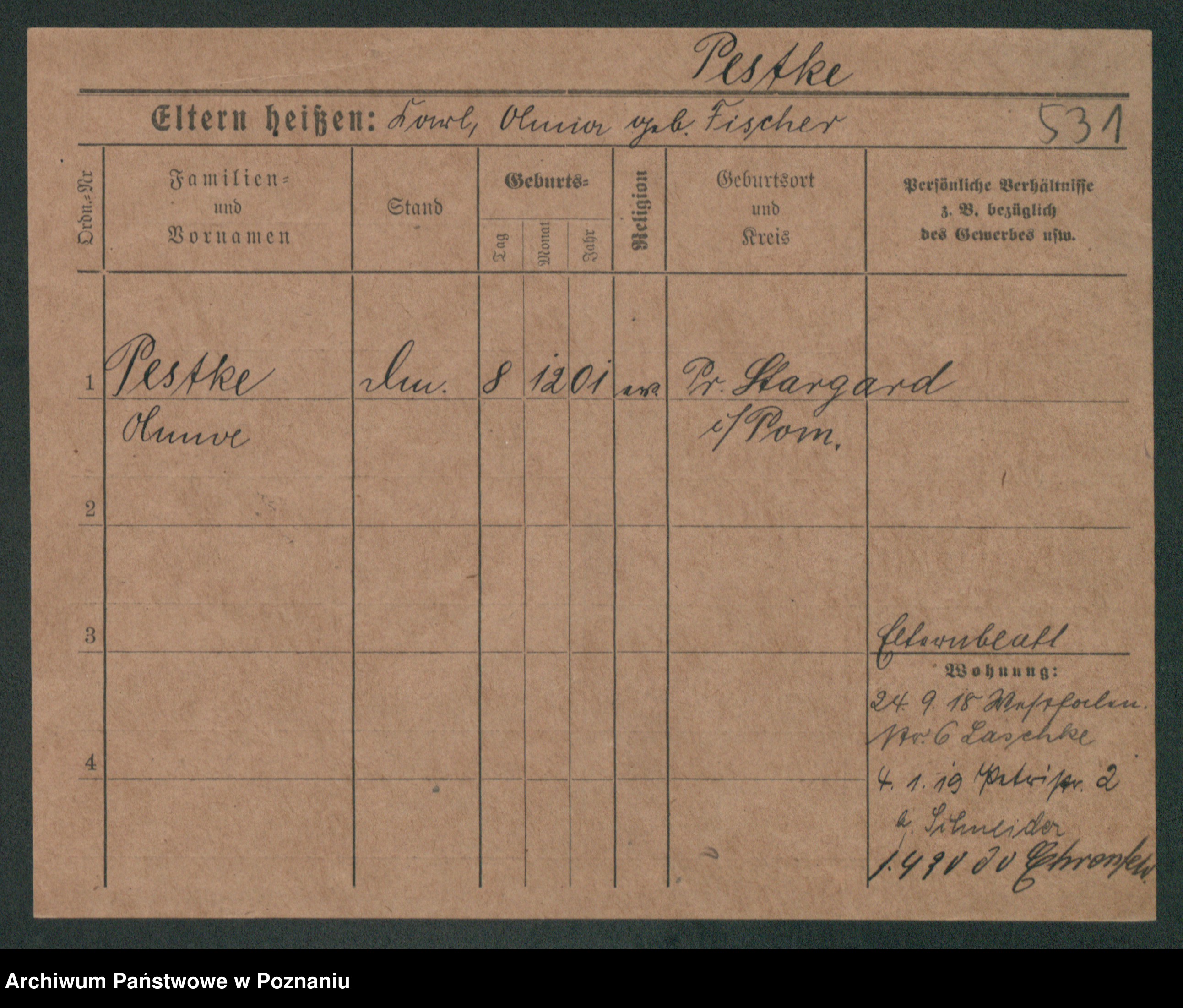 Podgląd karty osobowej dostępny jest po kliknięciu na nazwisko lub ikonkę karty. Można dokonywać powiększenia (ikony na górze) lub przechodzić między kolejnymi skanami (strzałki po bokach).