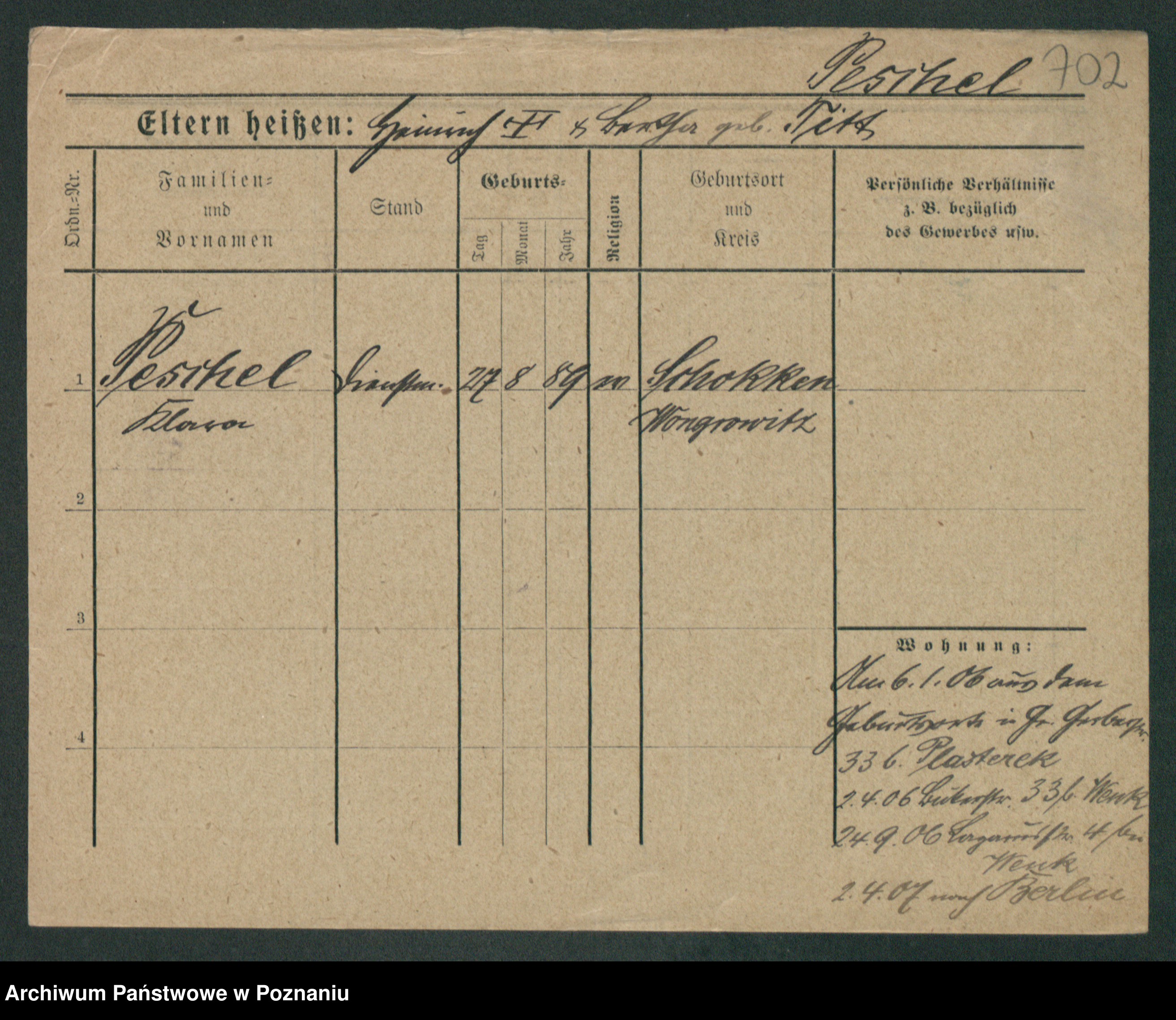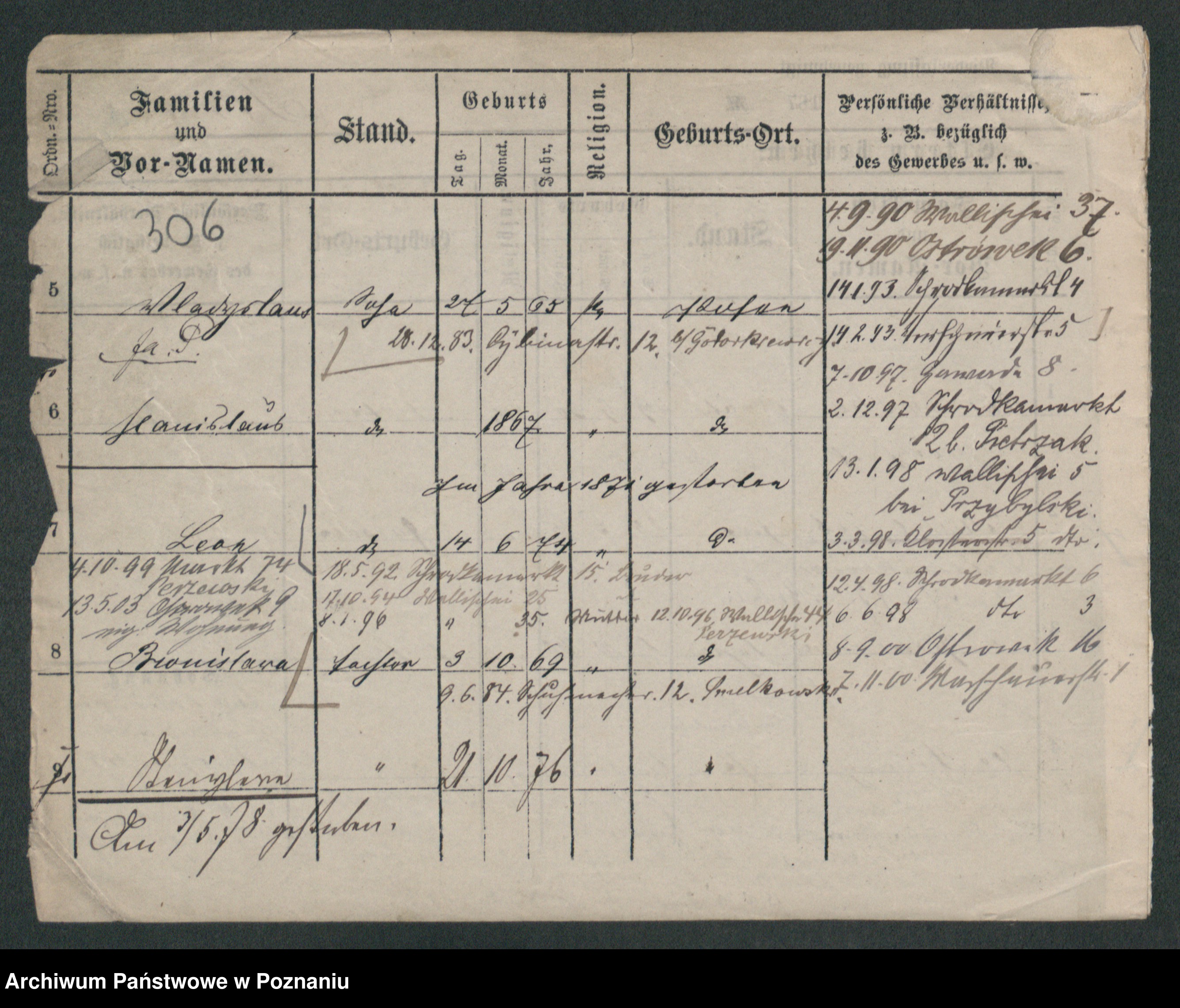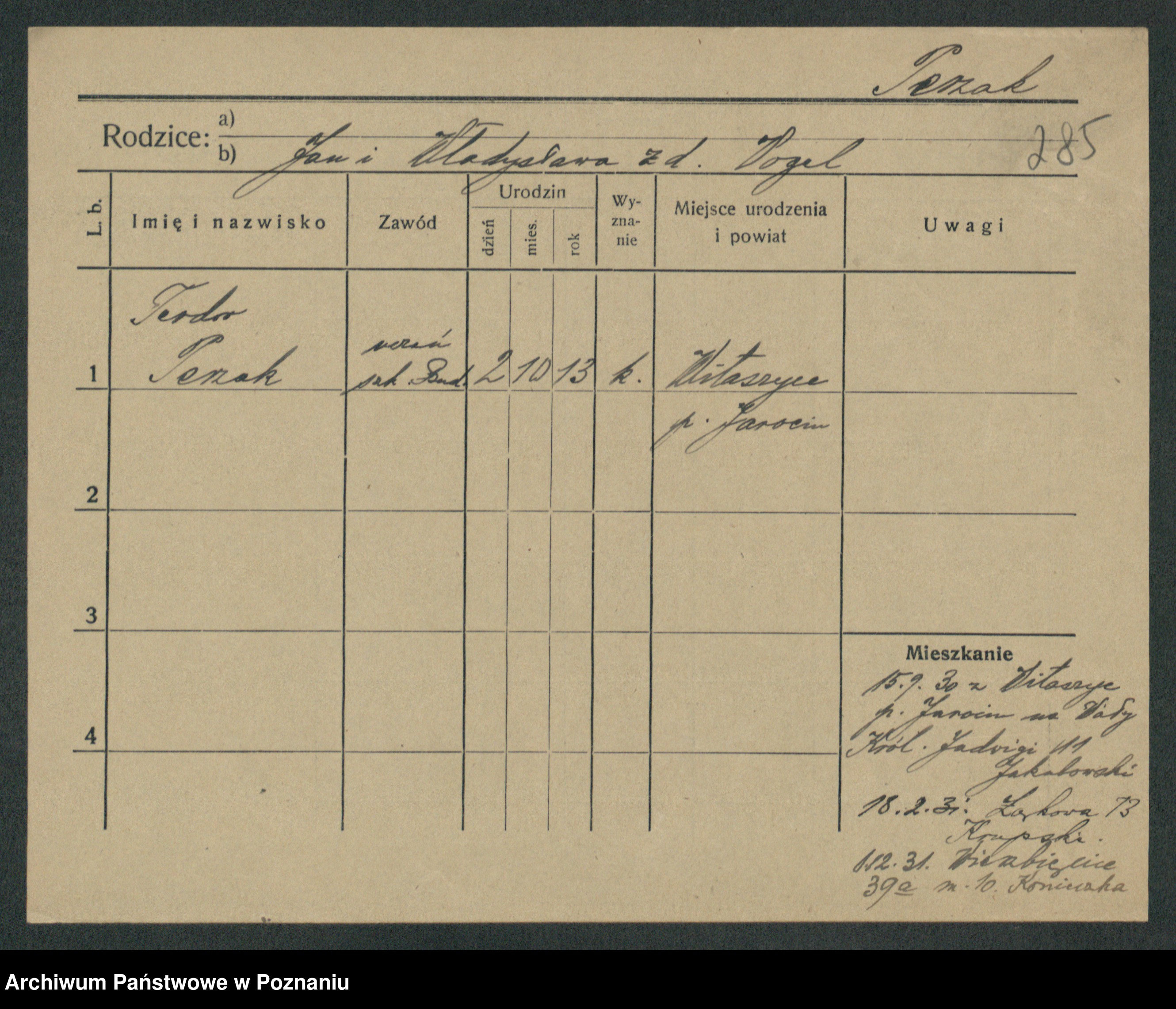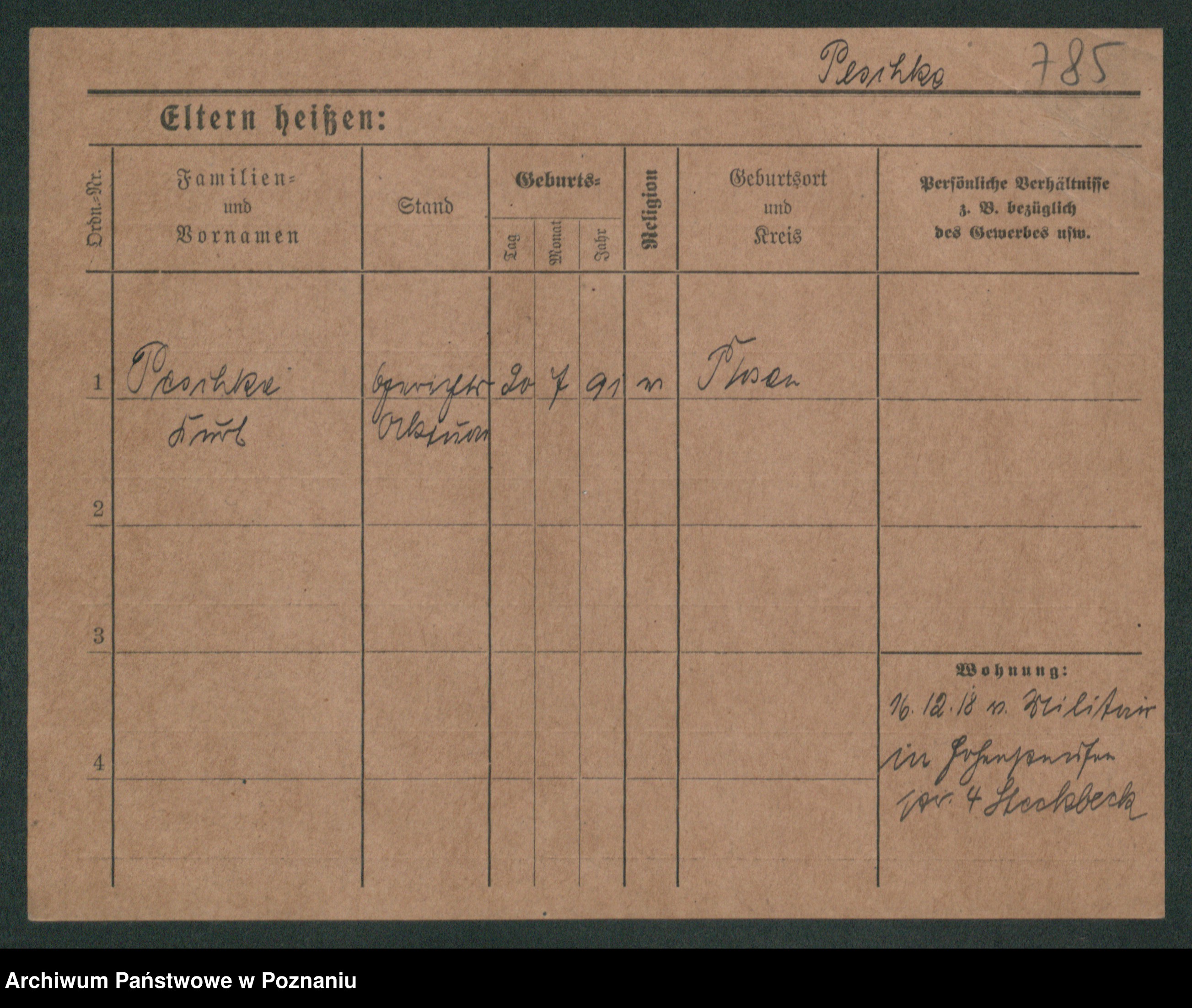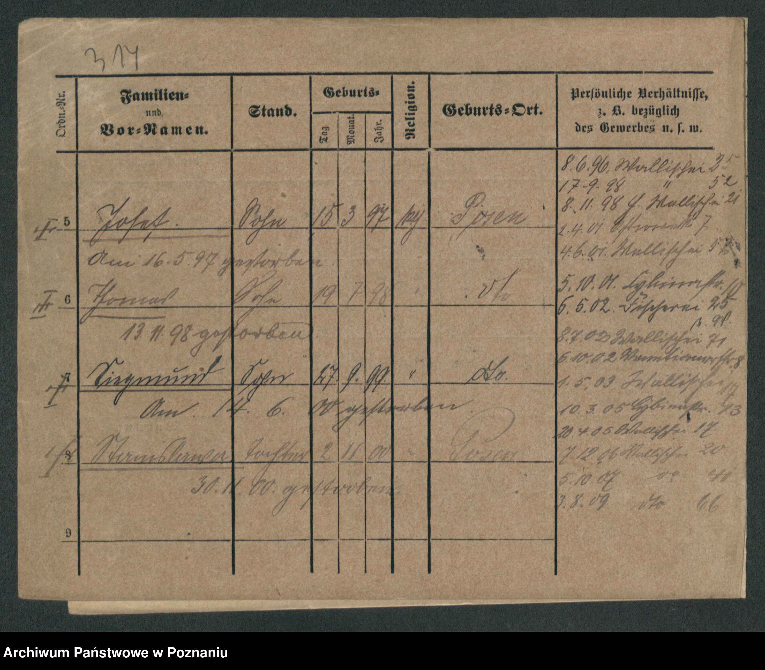 Podgląd karty osobowej dostępny jest po kliknięciu na nazwisko lub ikonkę karty. Można dokonywać powiększenia (ikony na górze) lub przechodzić między kolejnymi skanami (strzałki po bokach).