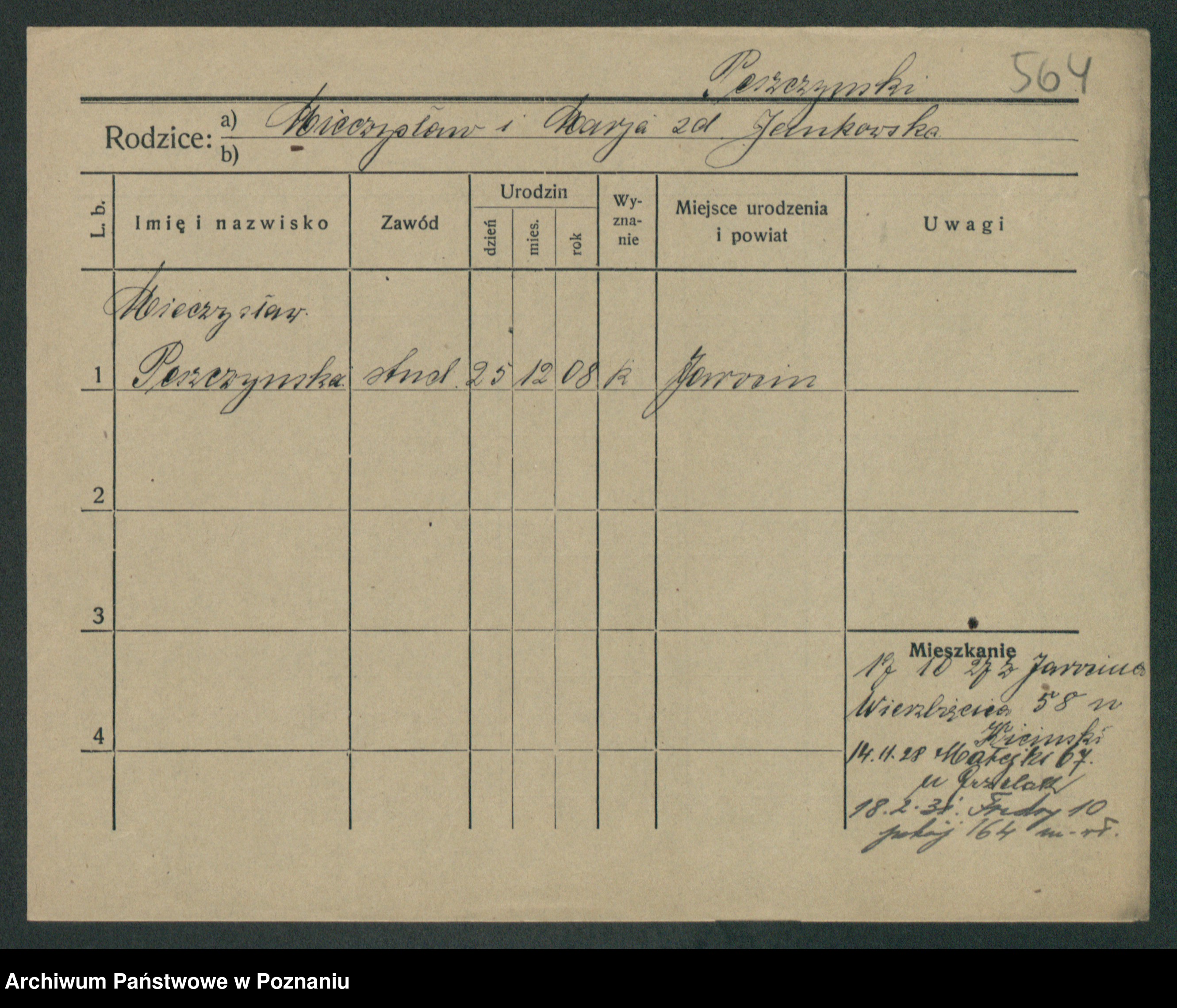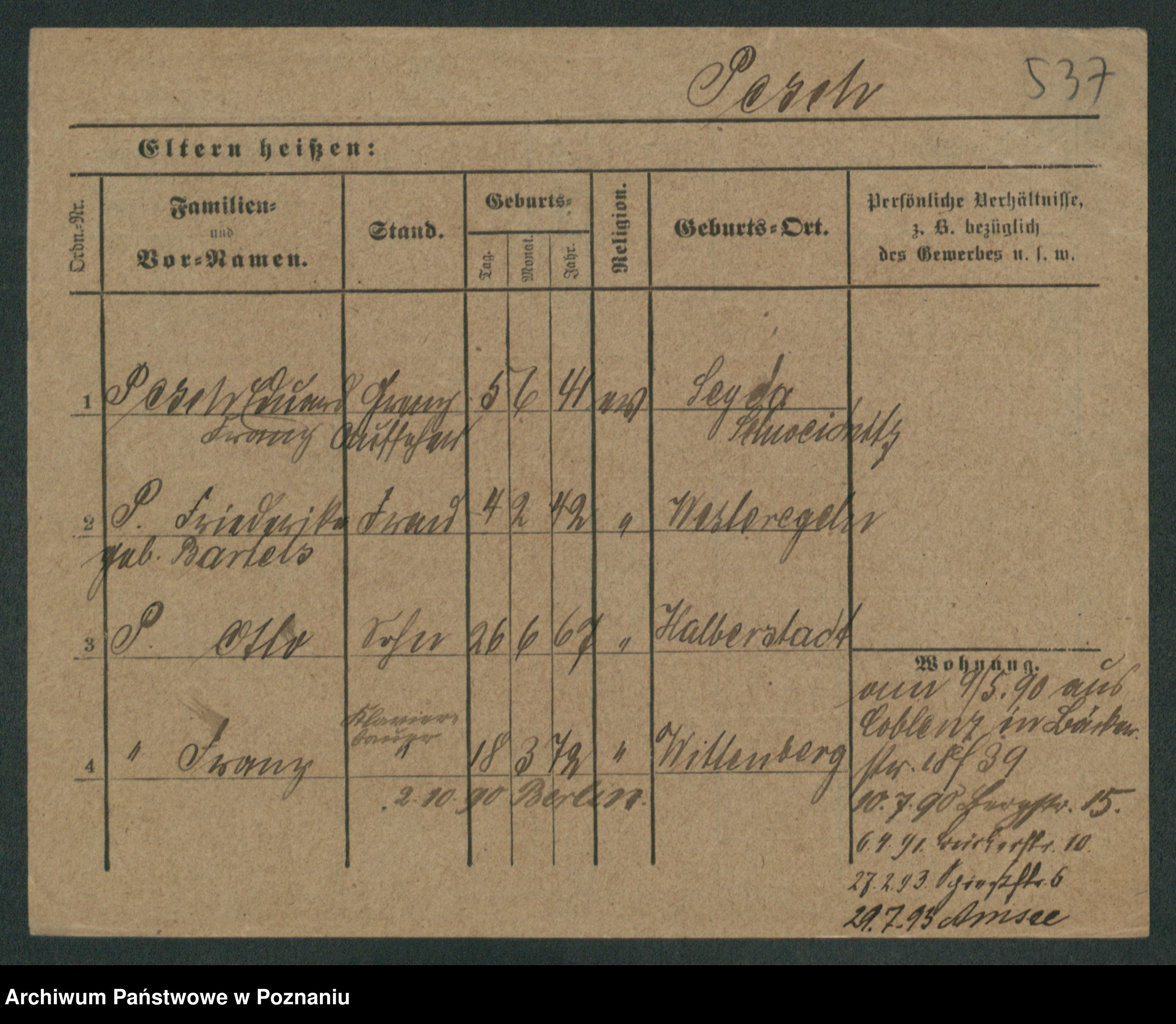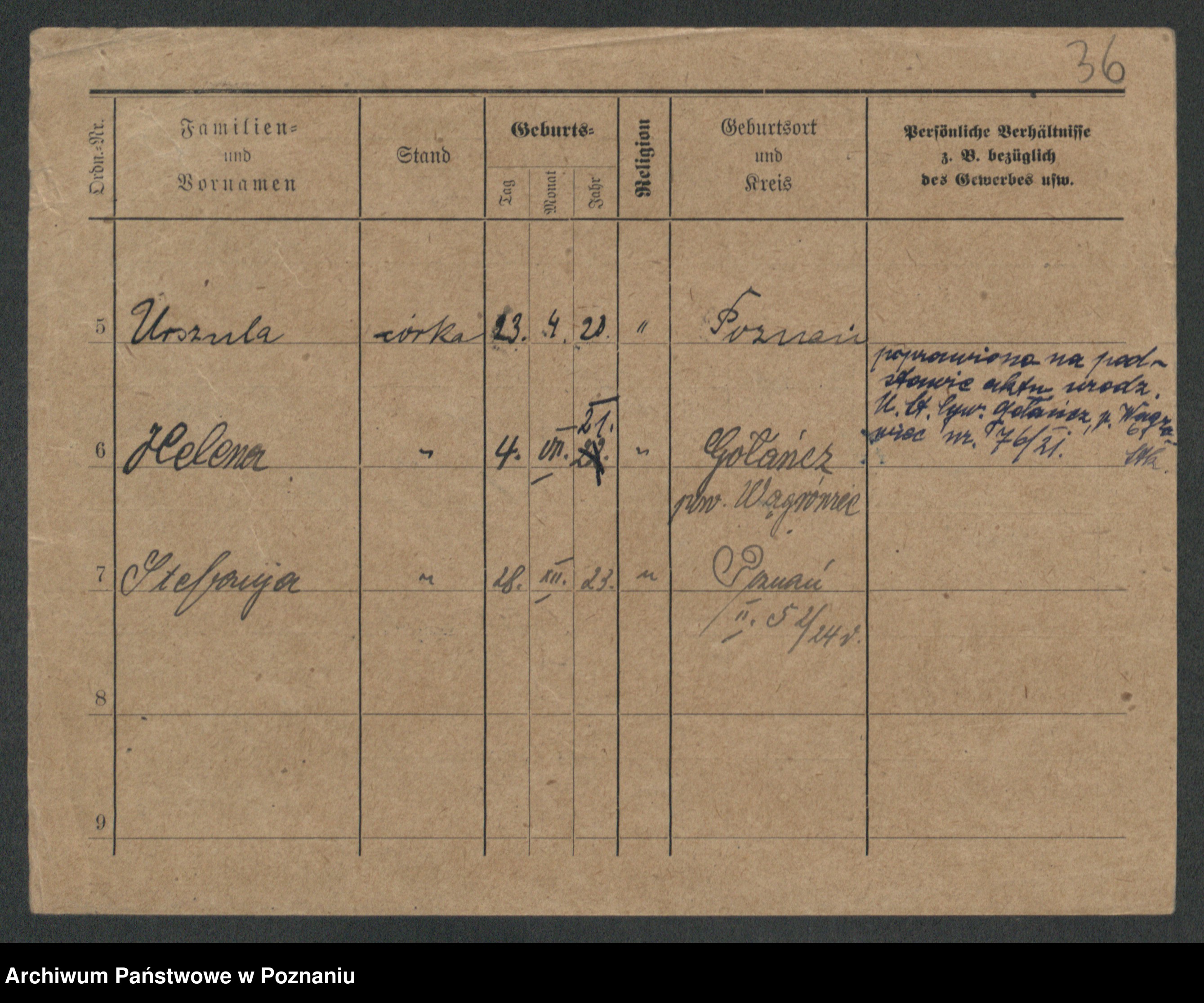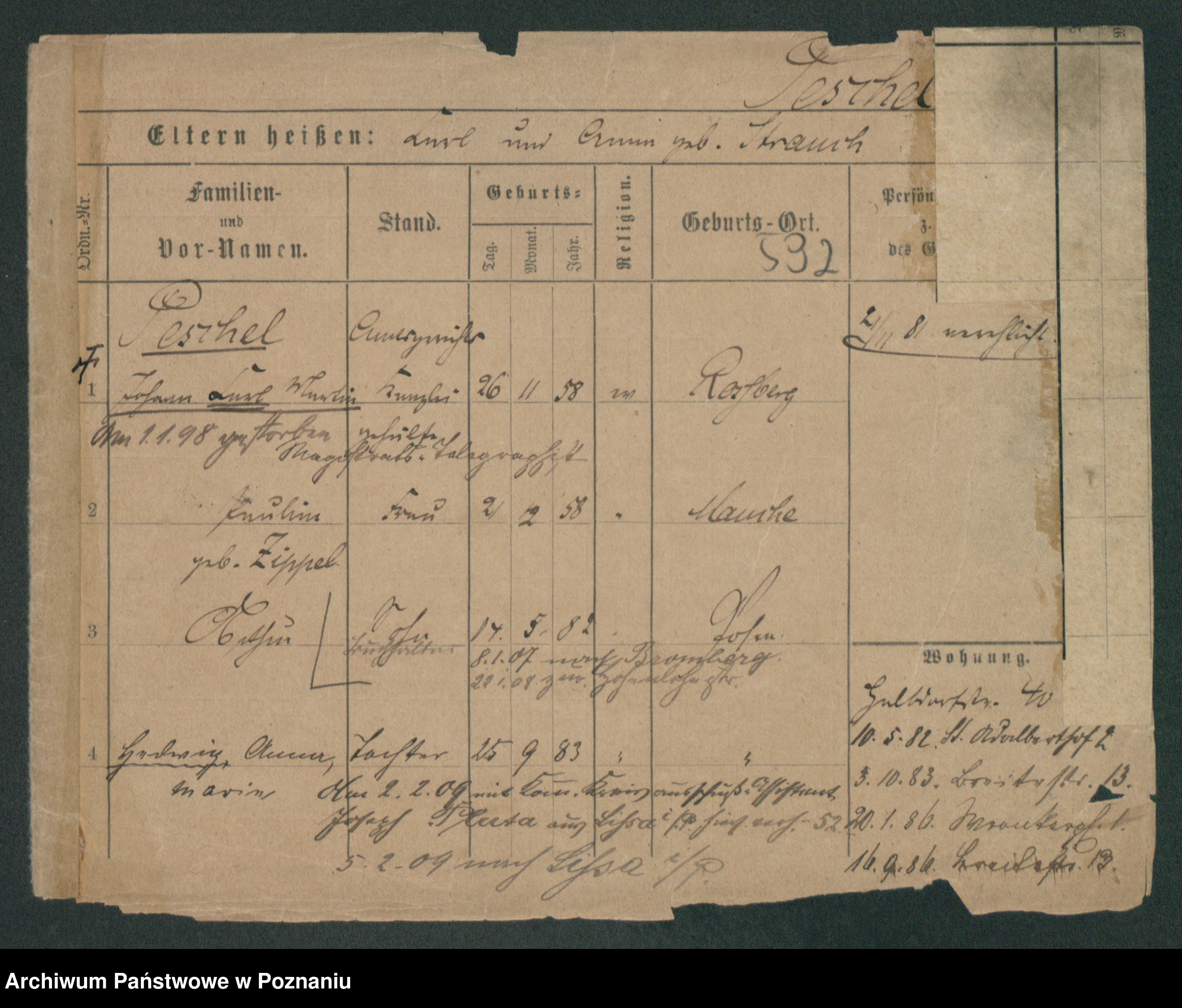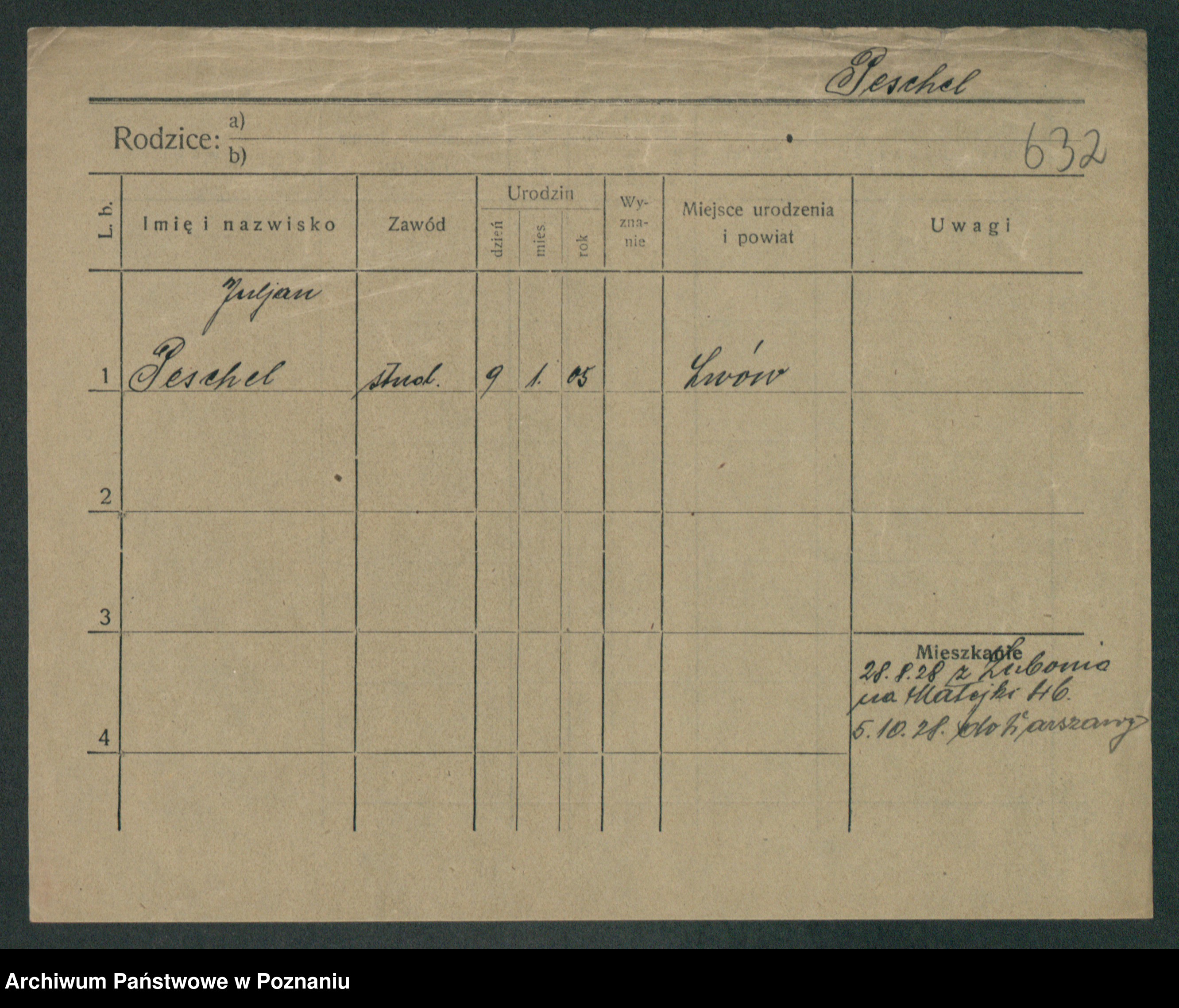 Podgląd karty osobowej dostępny jest po kliknięciu na nazwisko lub ikonkę karty. Można dokonywać powiększenia (ikony na górze) lub przechodzić między kolejnymi skanami (strzałki po bokach).