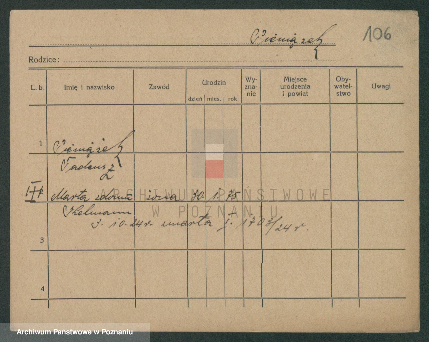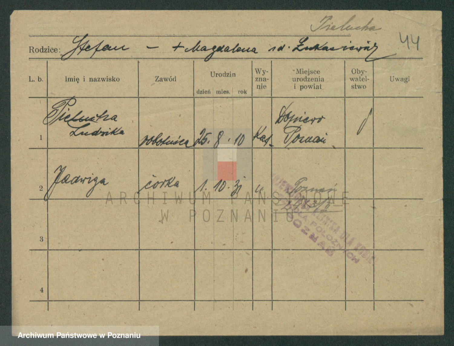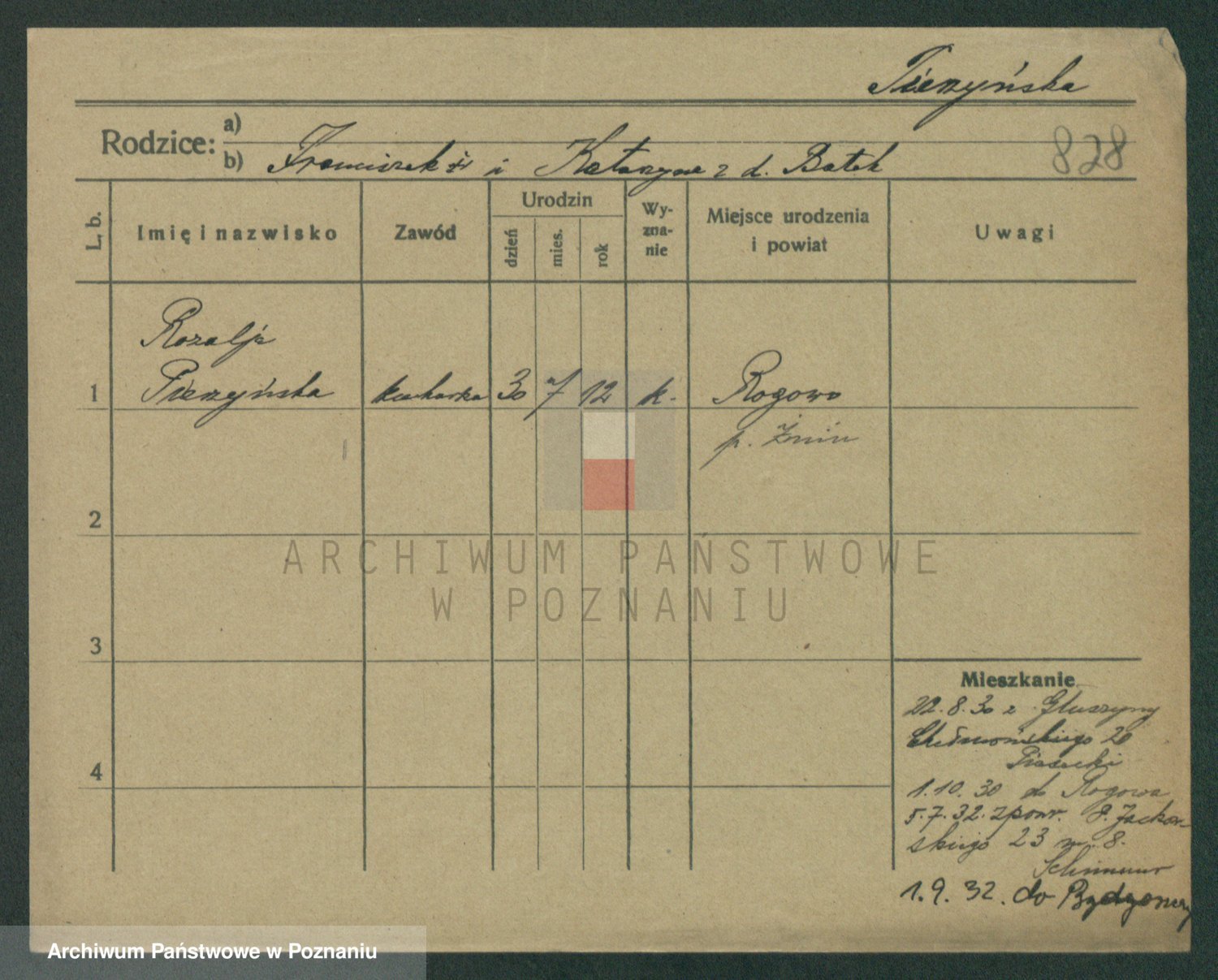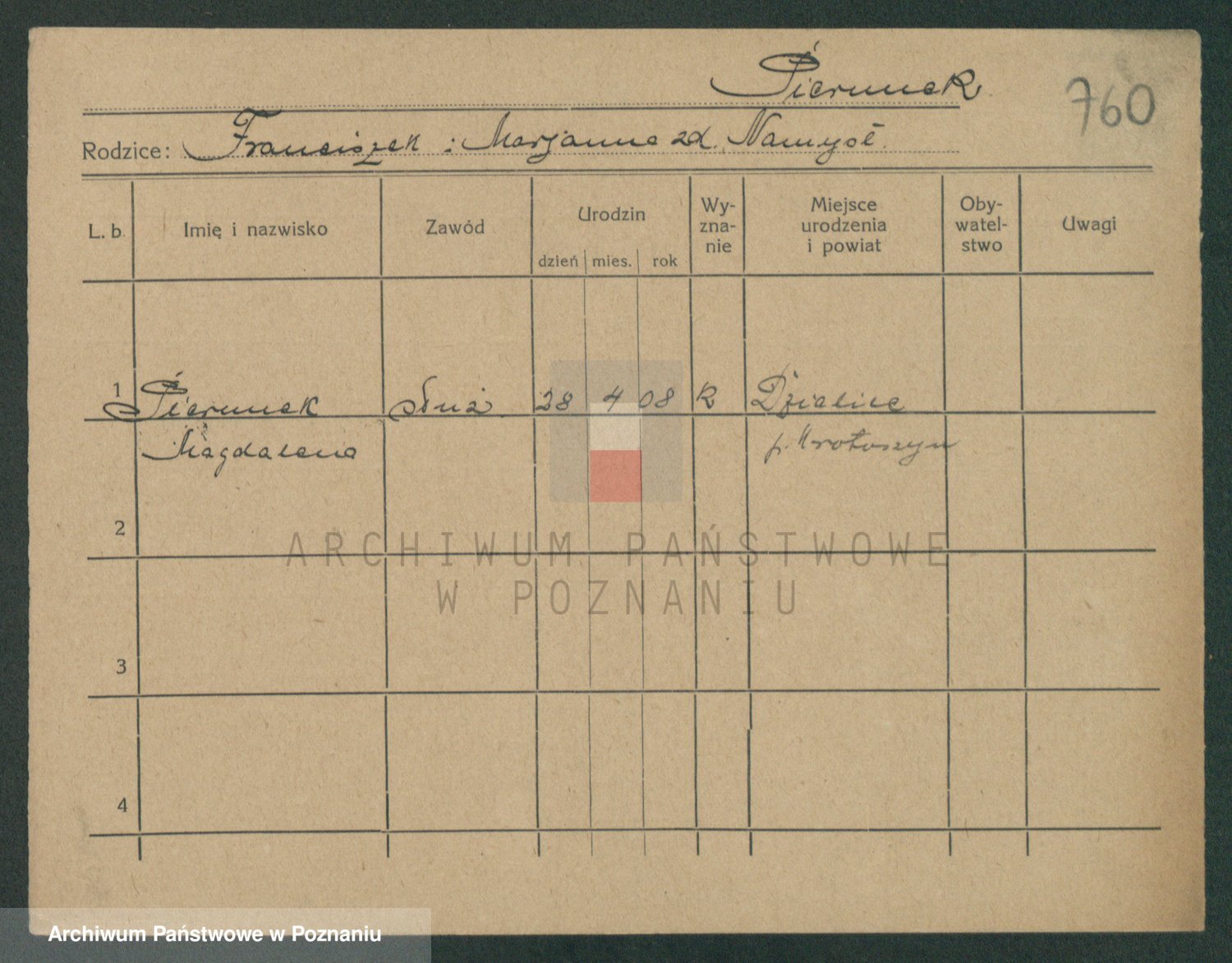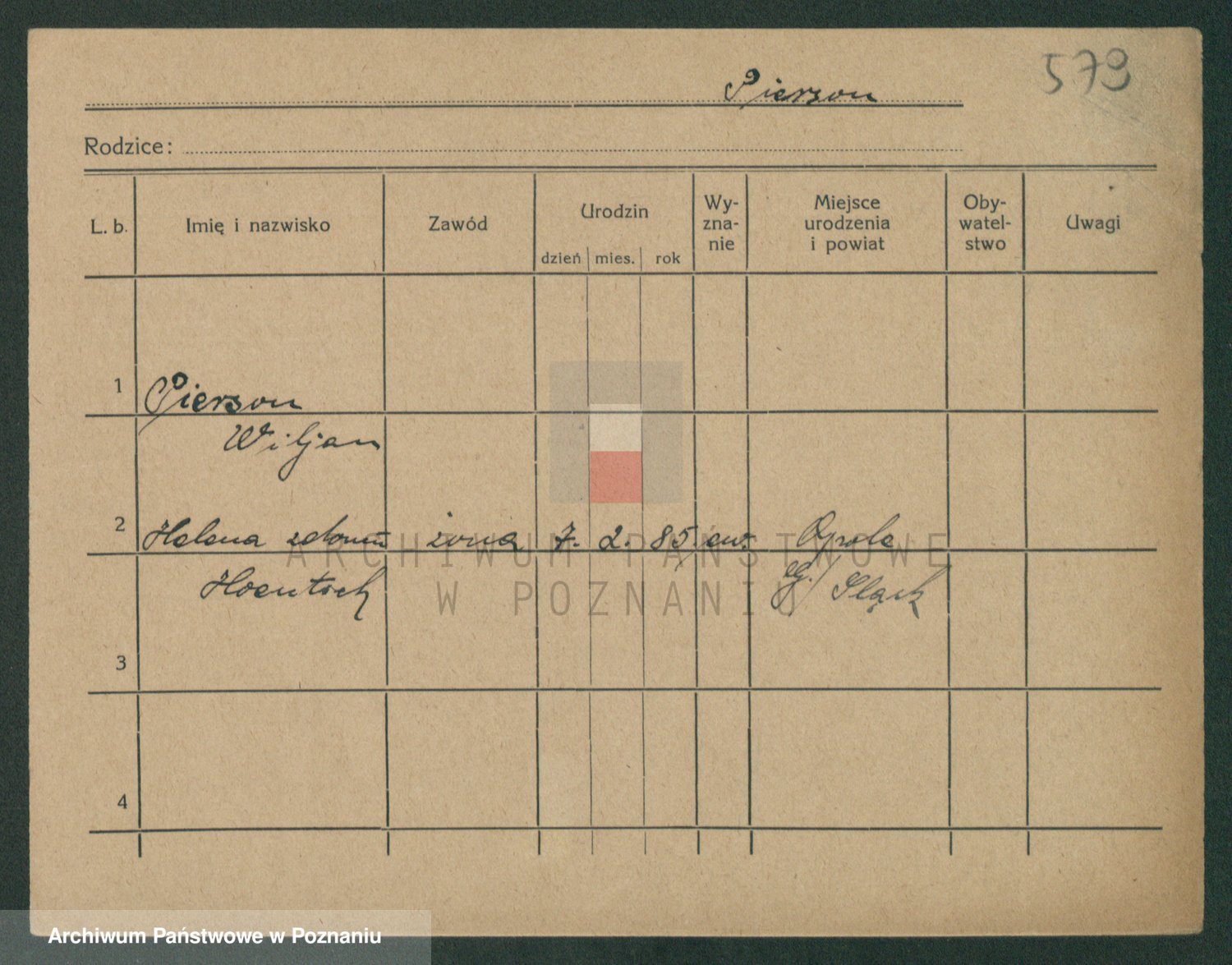 Podgląd karty osobowej dostępny jest po kliknięciu na nazwisko lub ikonkę karty. Można dokonywać powiększenia (ikony na górze) lub przechodzić między kolejnymi skanami (strzałki po bokach).