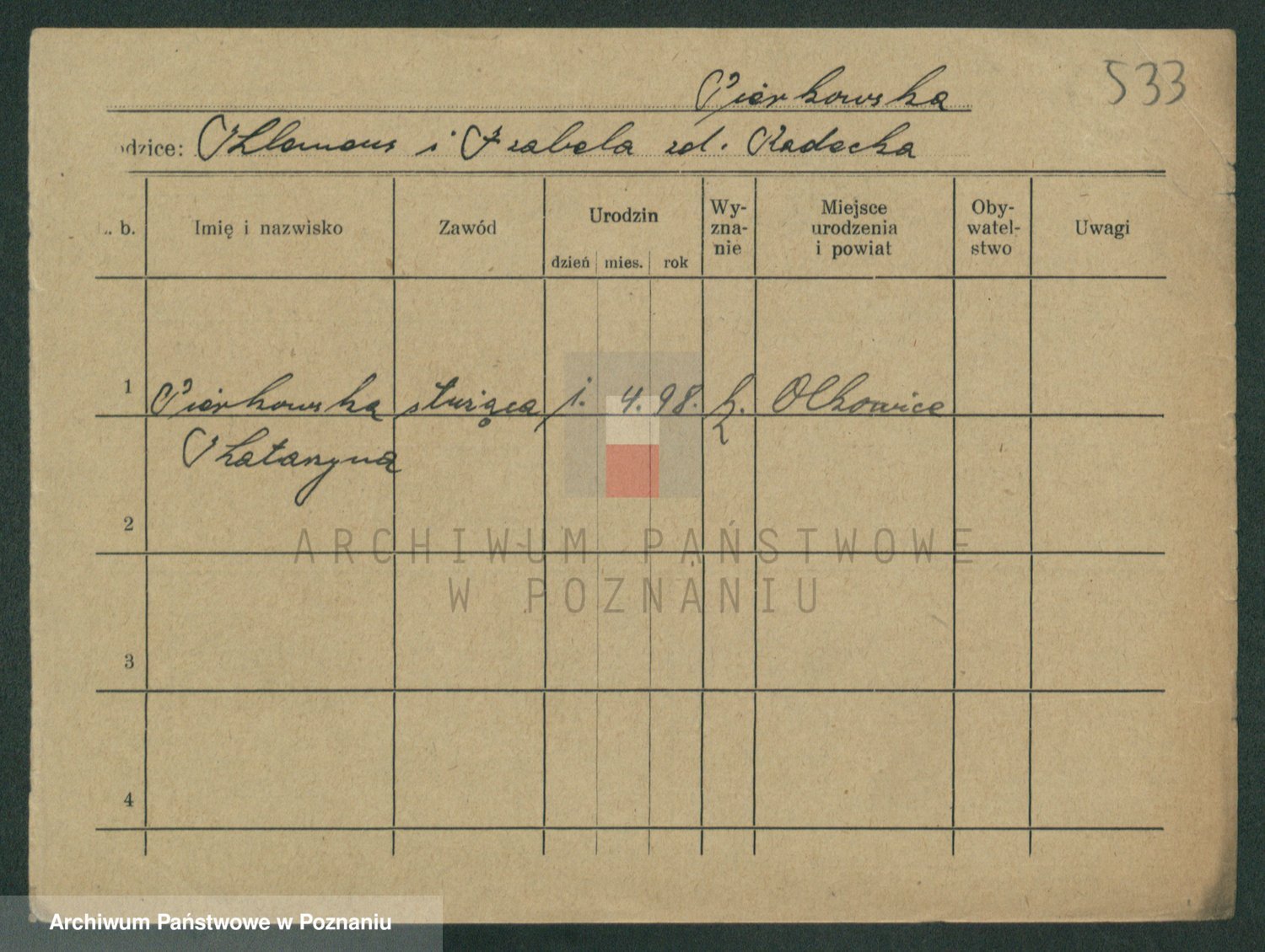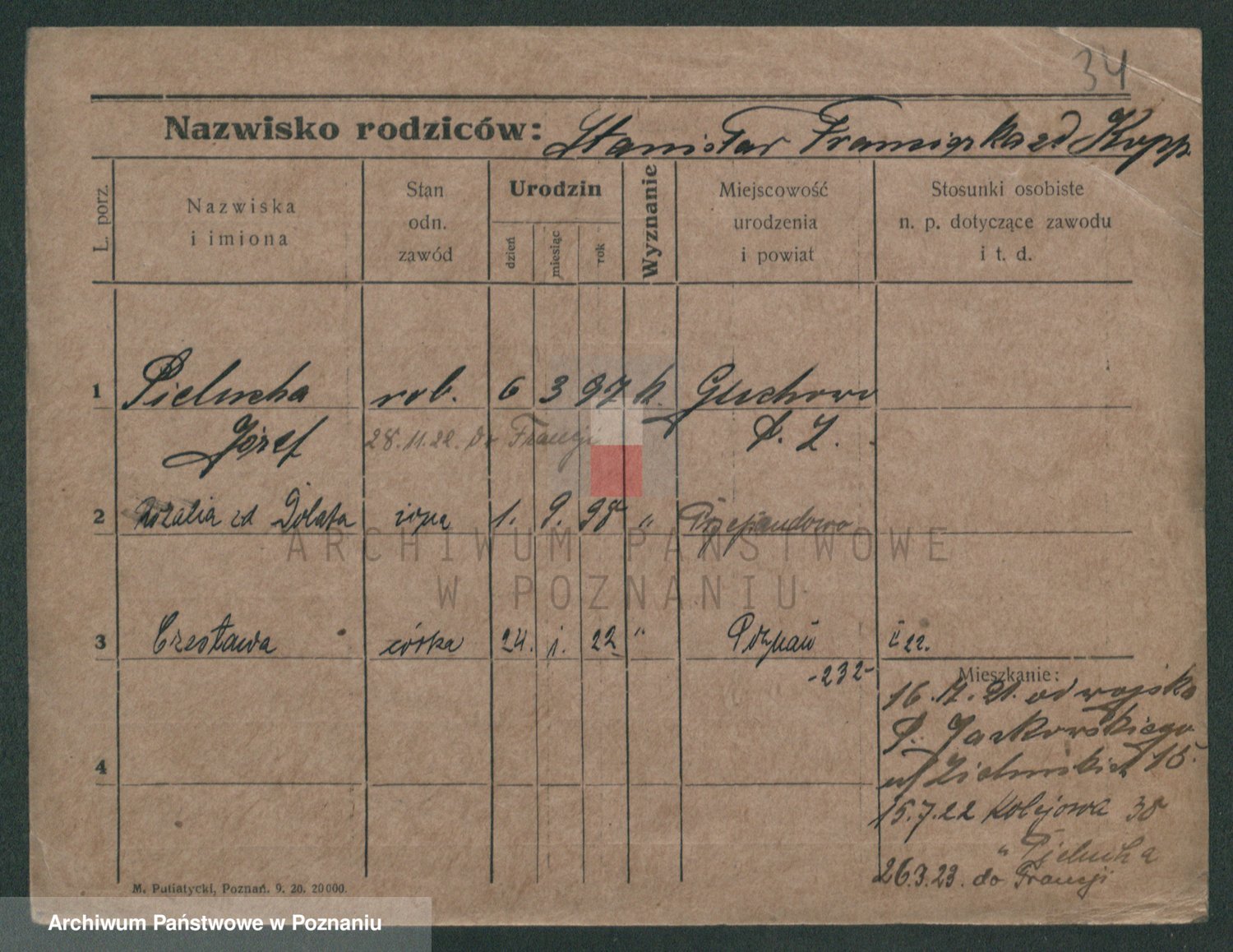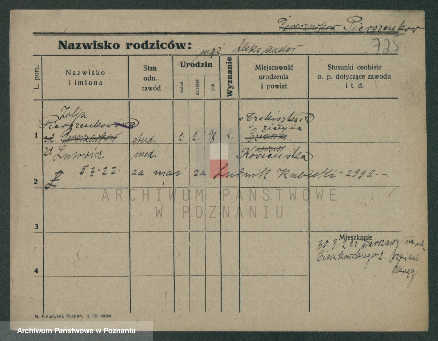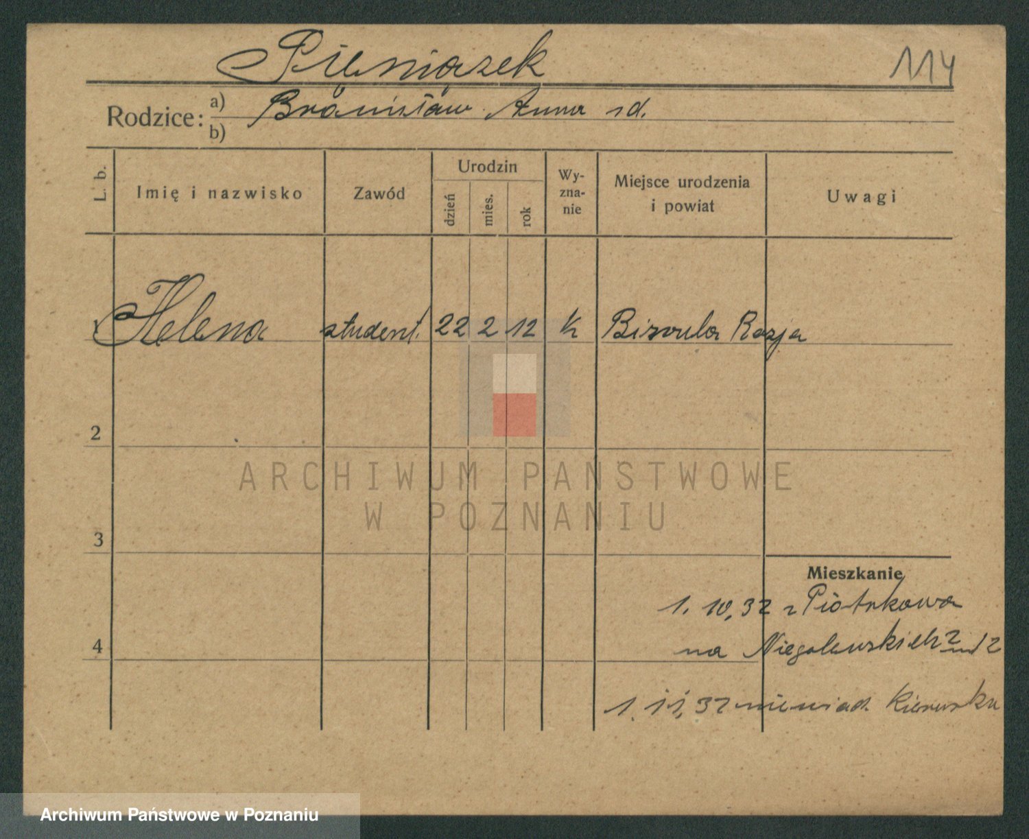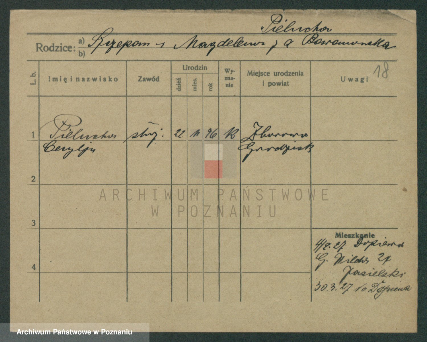 Podgląd karty osobowej dostępny jest po kliknięciu na nazwisko lub ikonkę karty. Można dokonywać powiększenia (ikony na górze) lub przechodzić między kolejnymi skanami (strzałki po bokach).