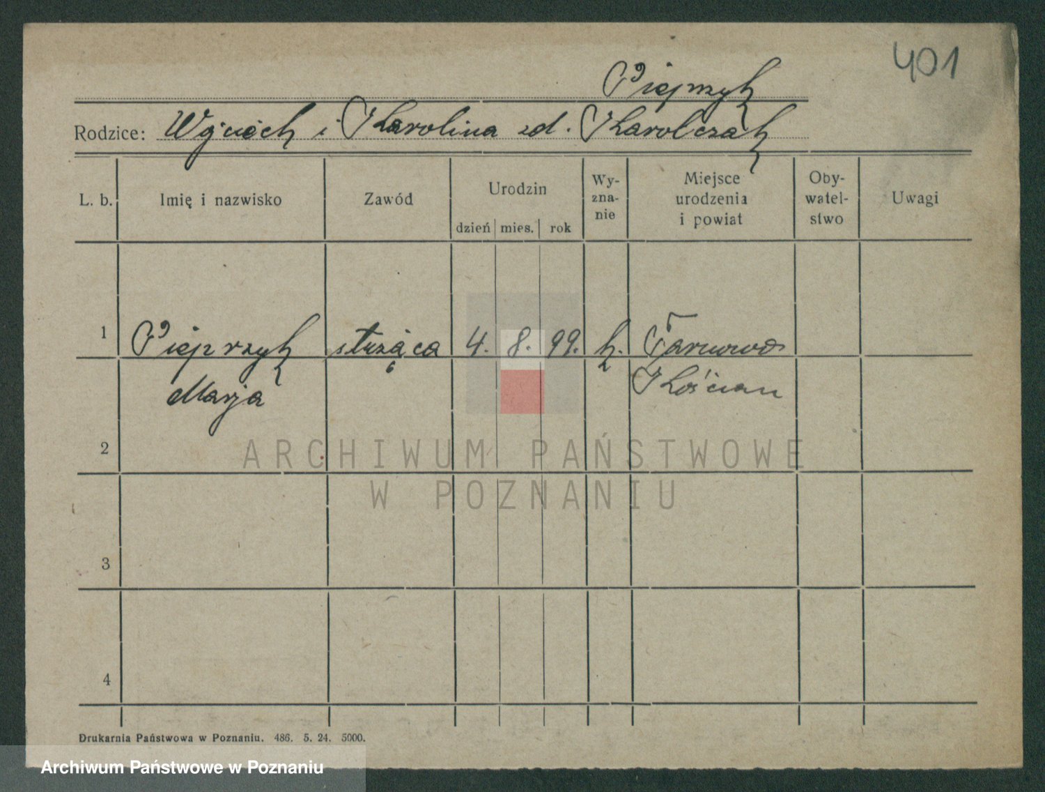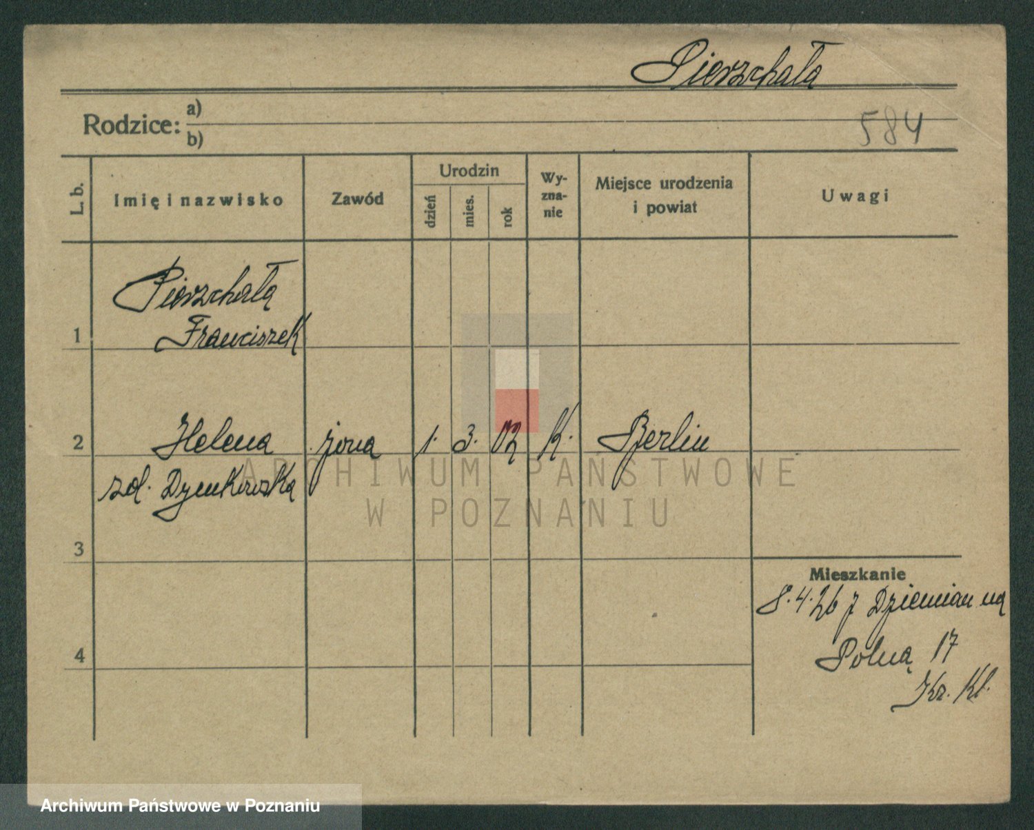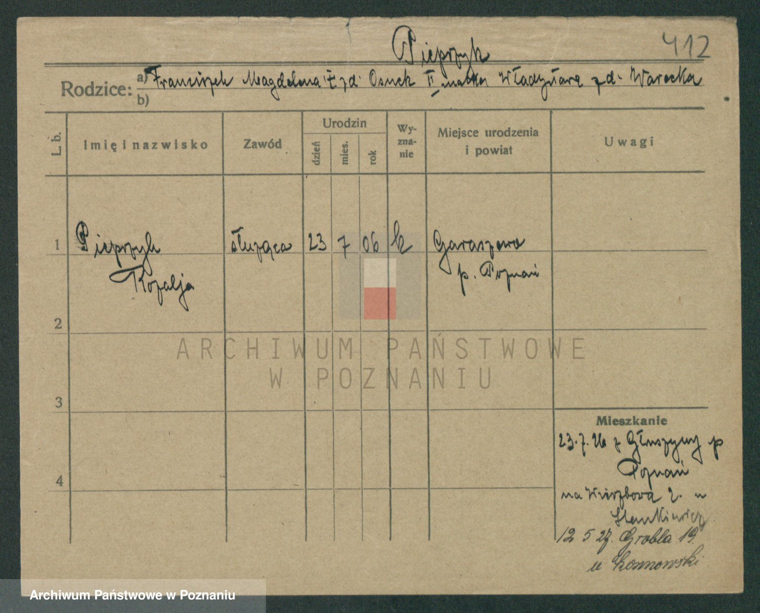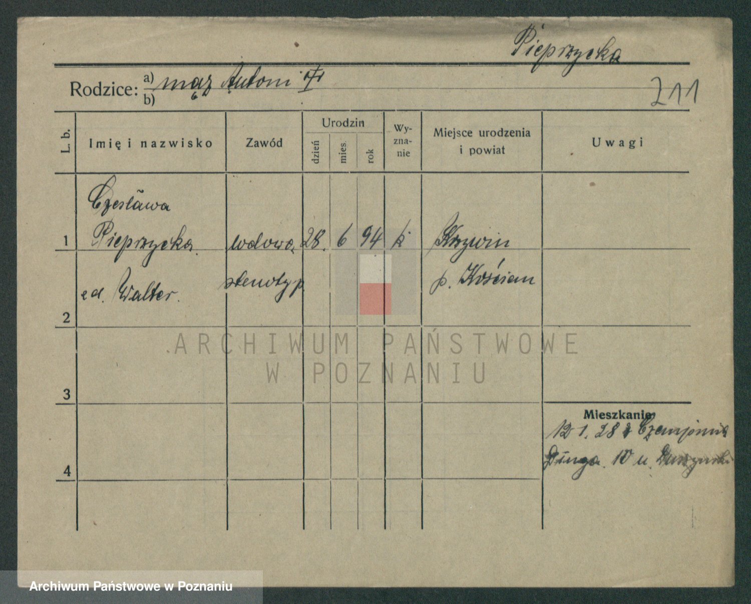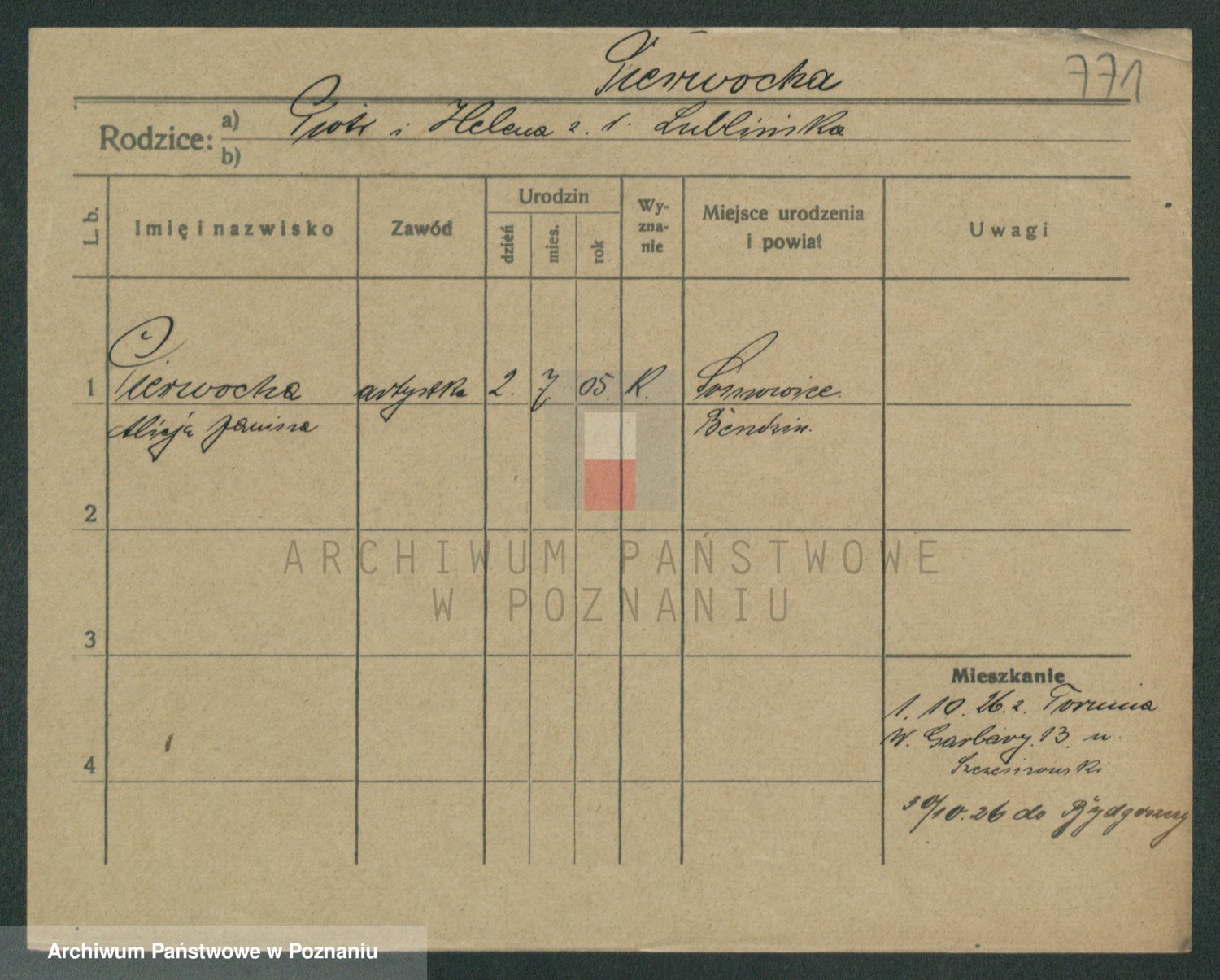 Podgląd karty osobowej dostępny jest po kliknięciu na nazwisko lub ikonkę karty. Można dokonywać powiększenia (ikony na górze) lub przechodzić między kolejnymi skanami (strzałki po bokach).