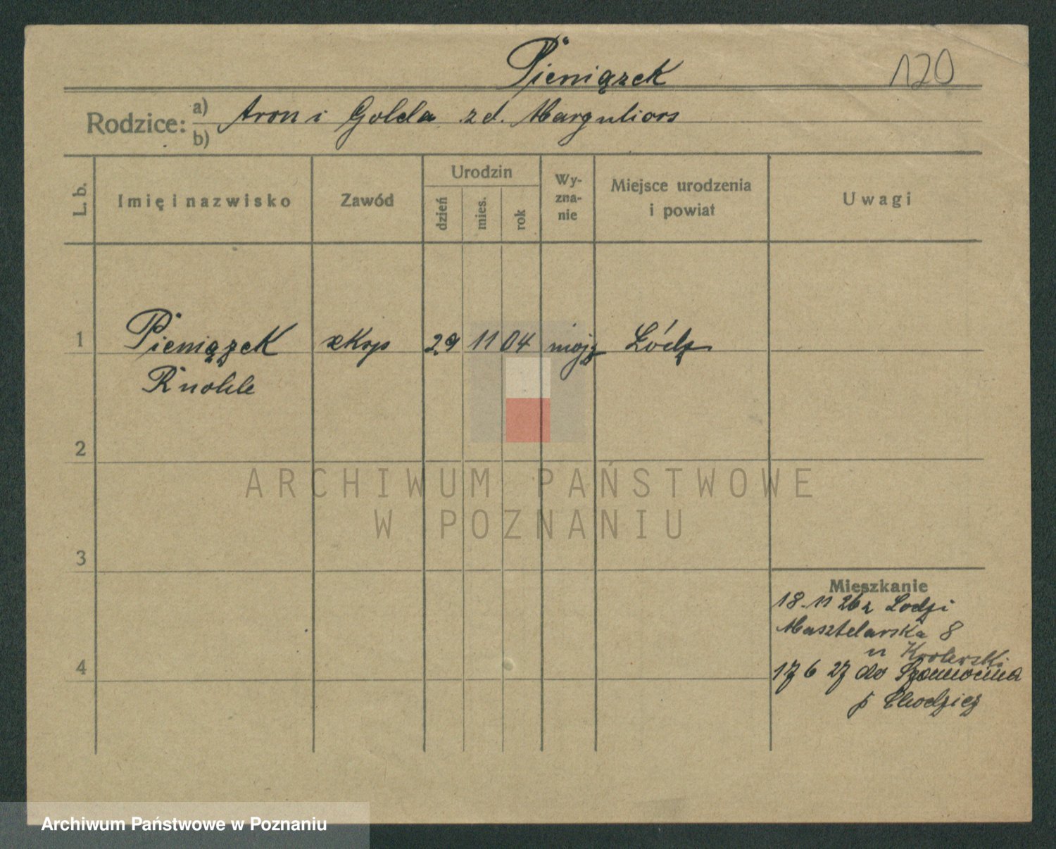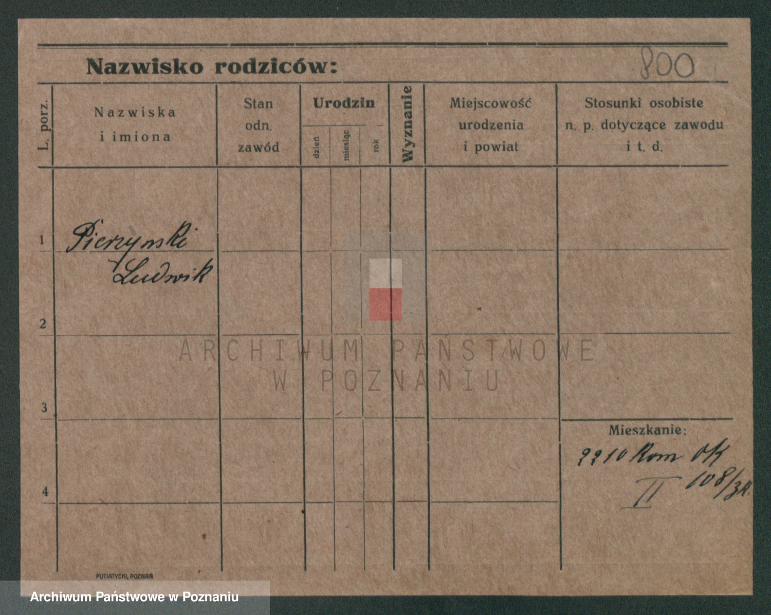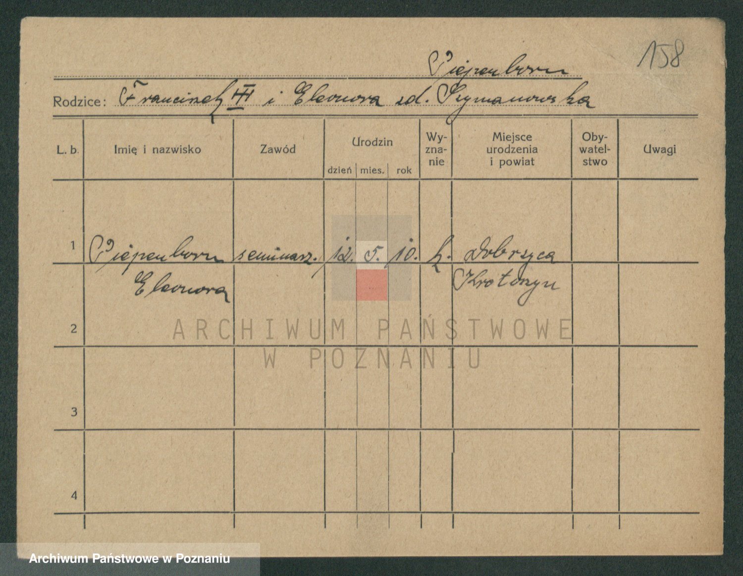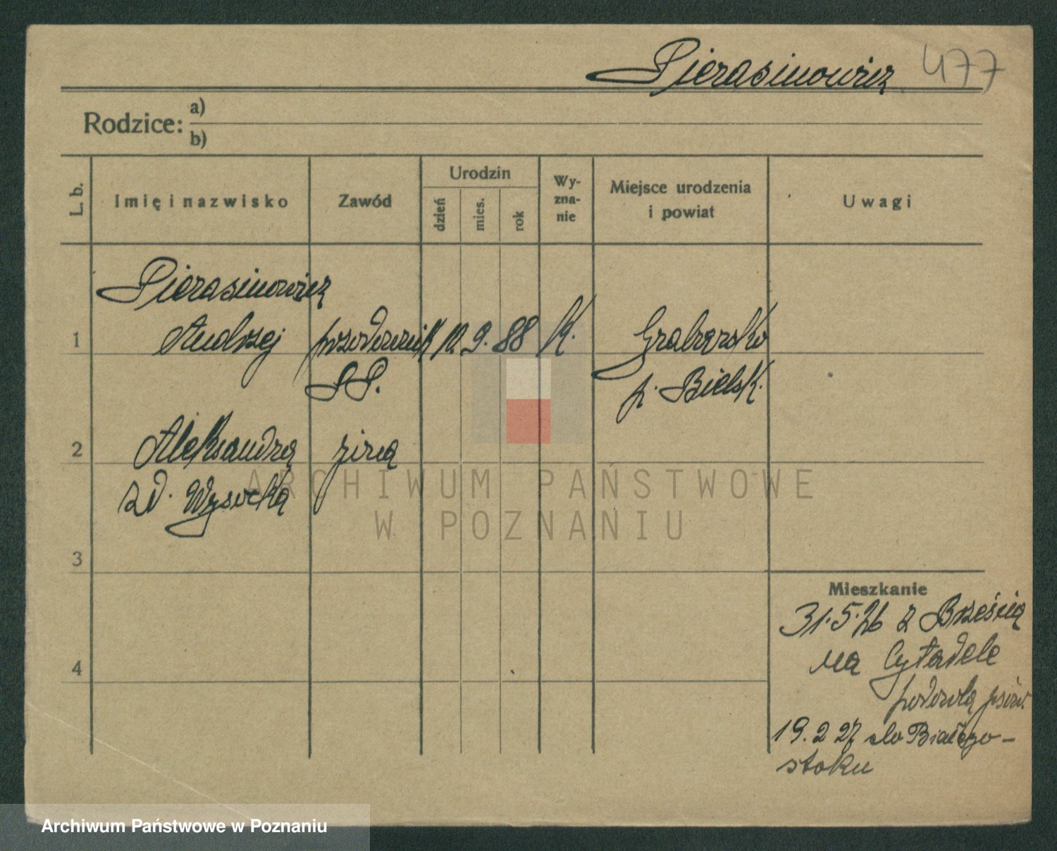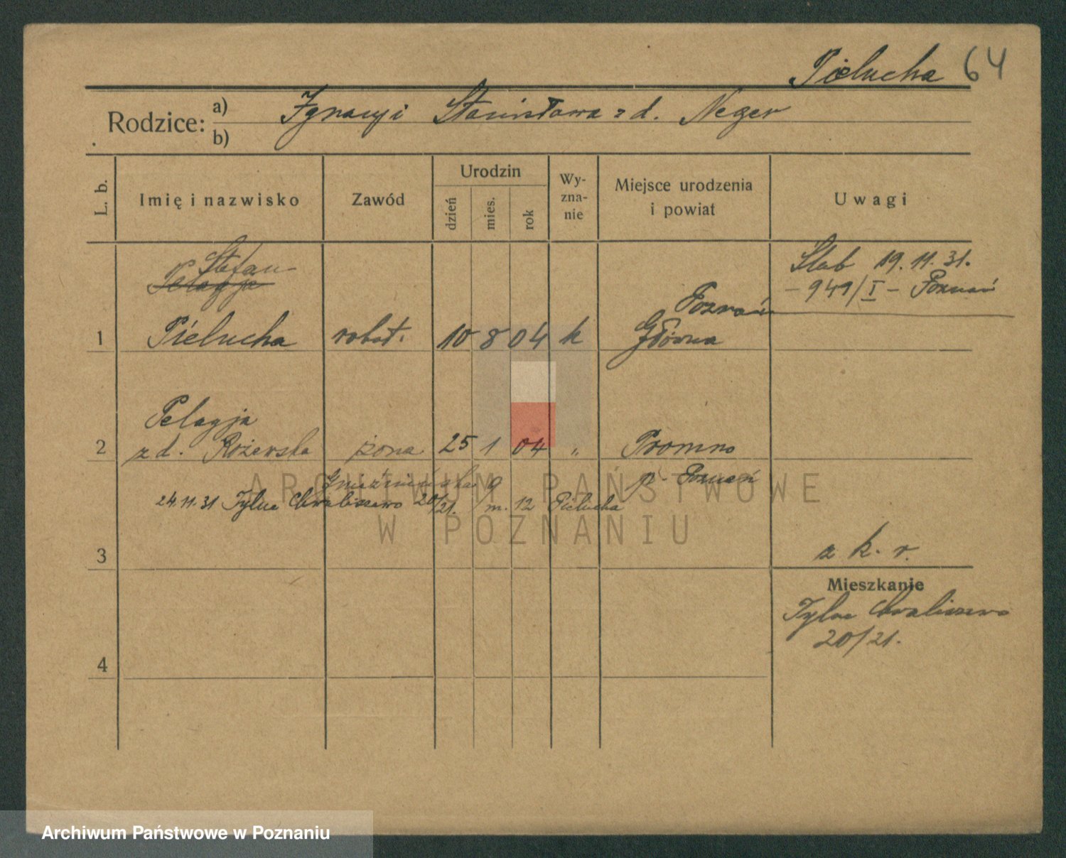 Podgląd karty osobowej dostępny jest po kliknięciu na nazwisko lub ikonkę karty. Można dokonywać powiększenia (ikony na górze) lub przechodzić między kolejnymi skanami (strzałki po bokach).