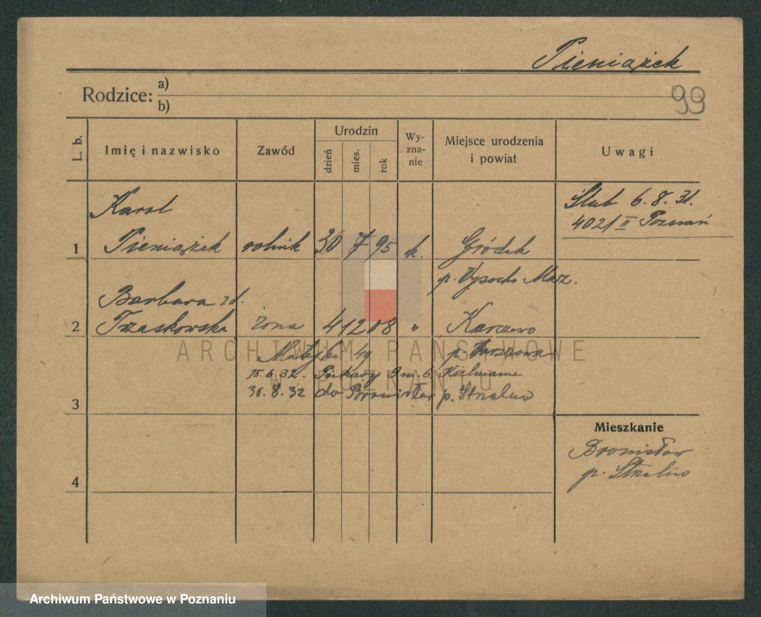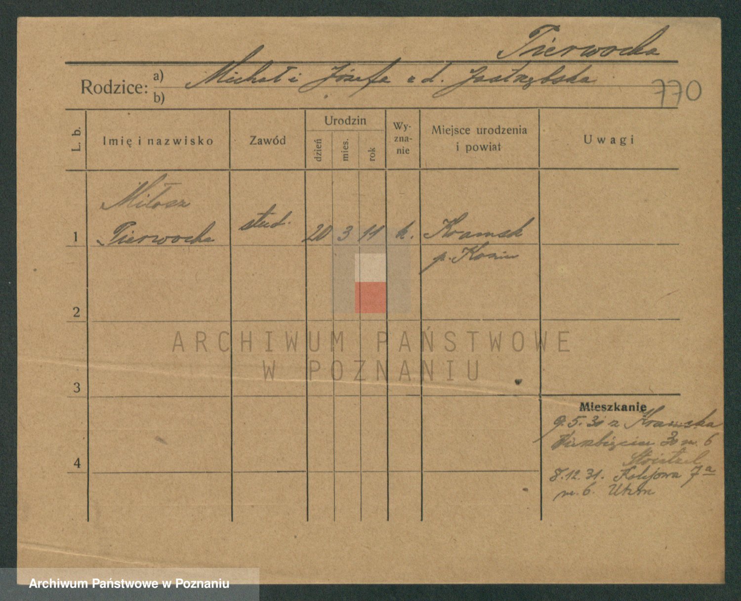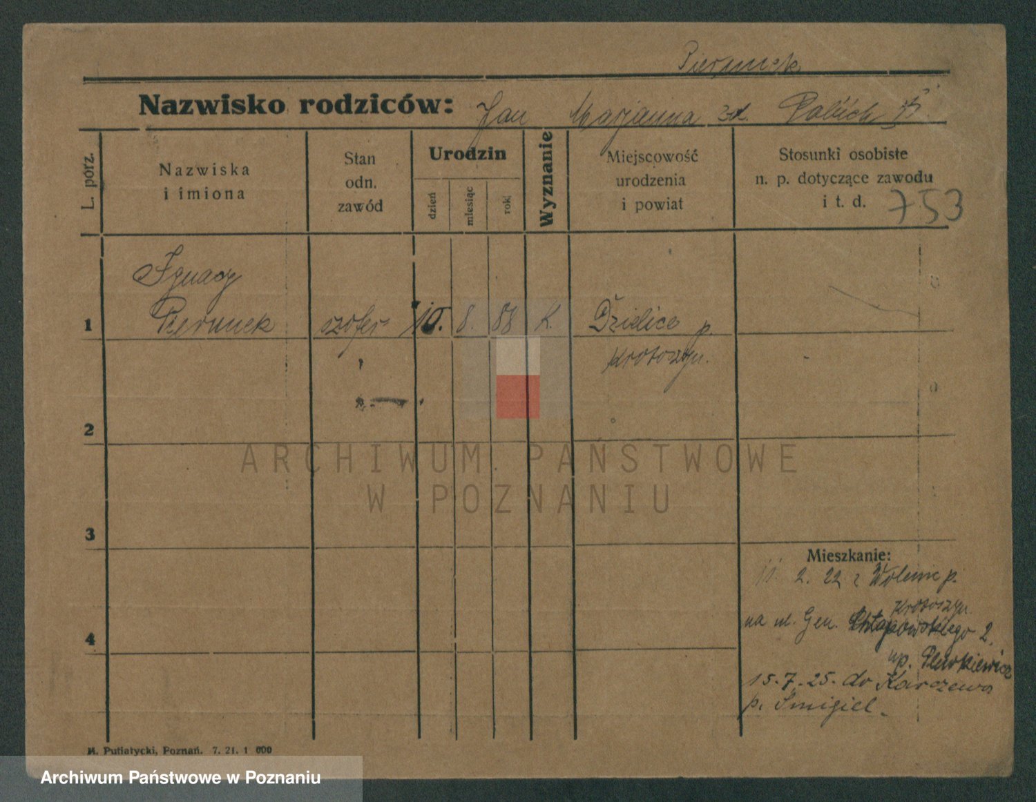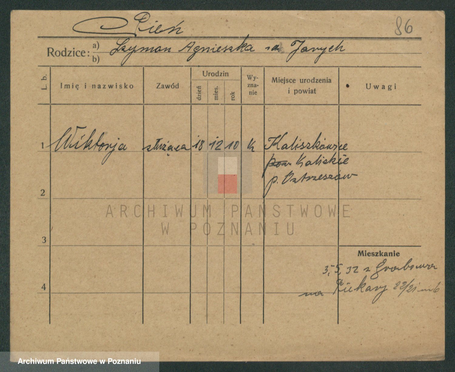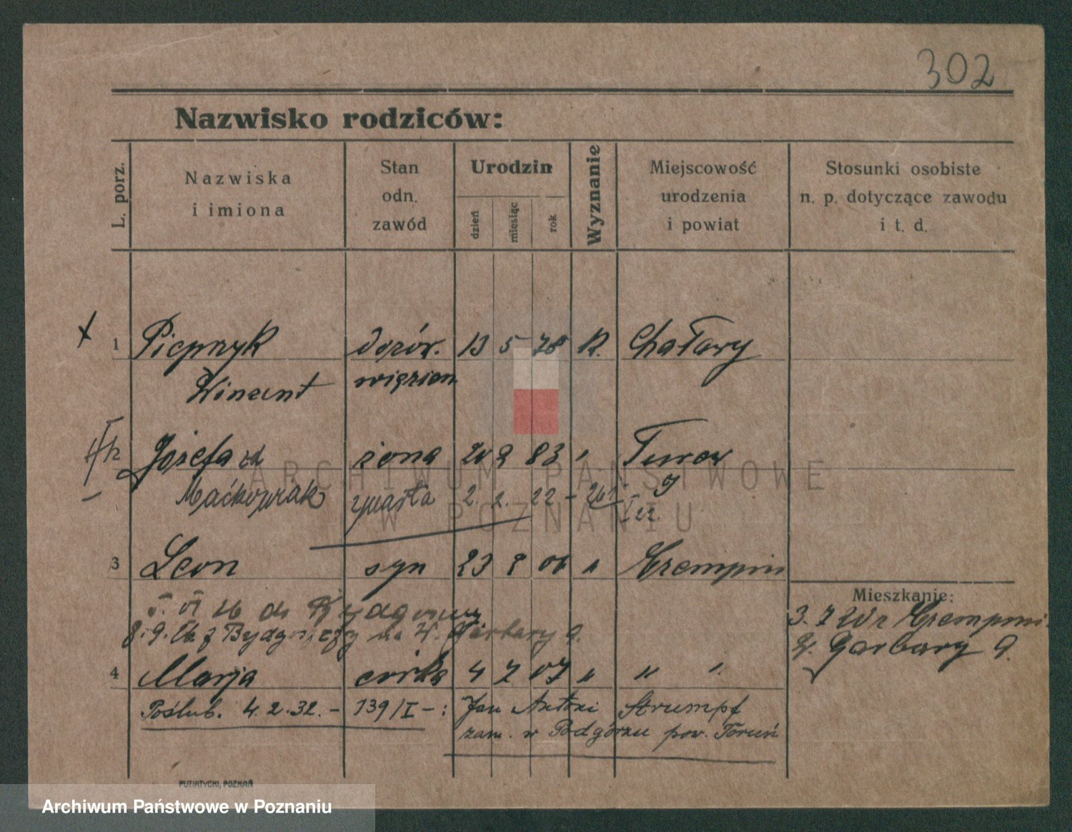 Podgląd karty osobowej dostępny jest po kliknięciu na nazwisko lub ikonkę karty. Można dokonywać powiększenia (ikony na górze) lub przechodzić między kolejnymi skanami (strzałki po bokach).