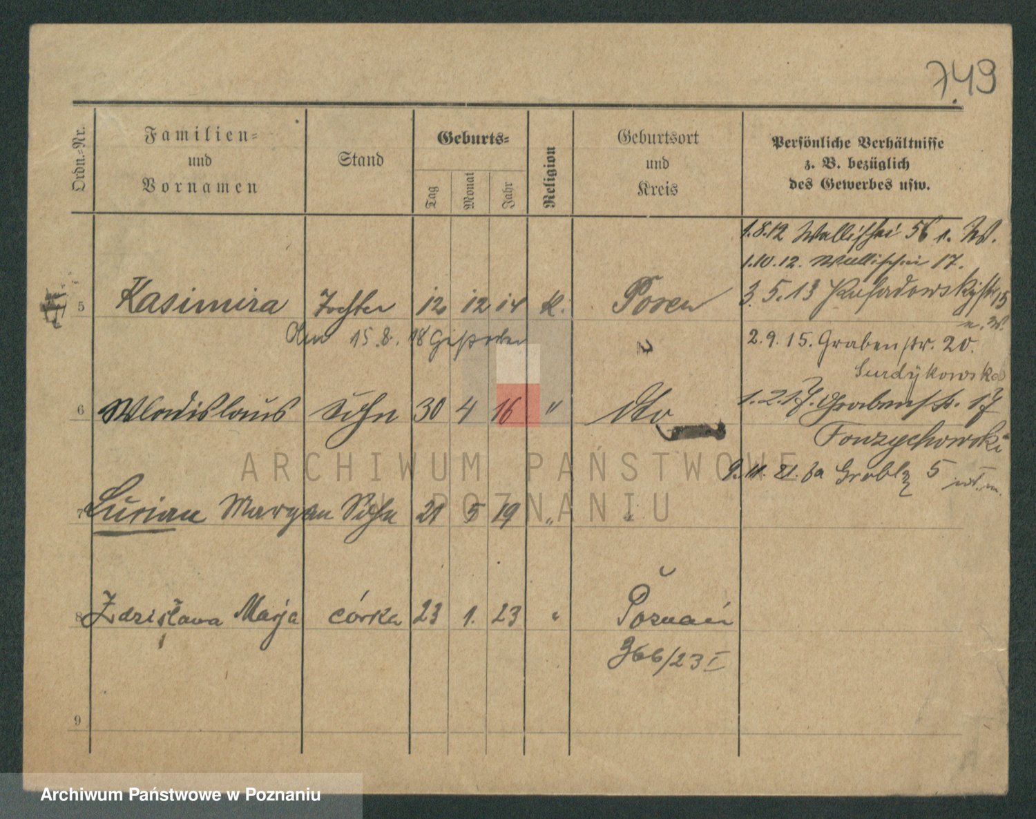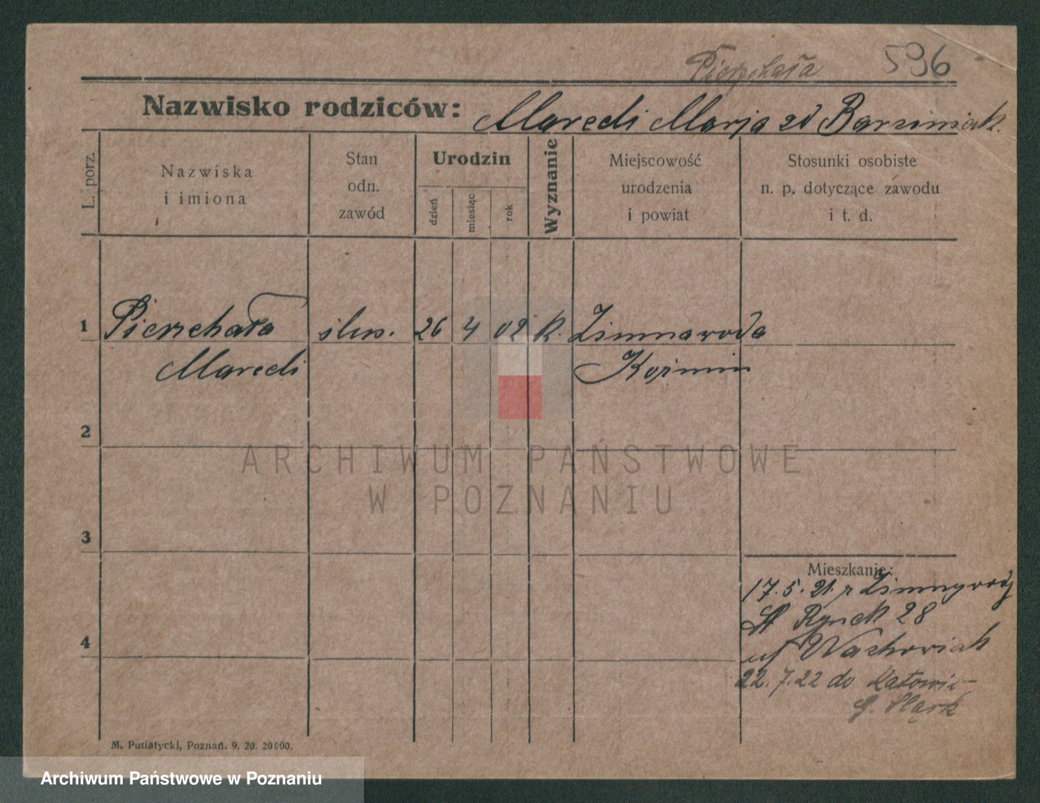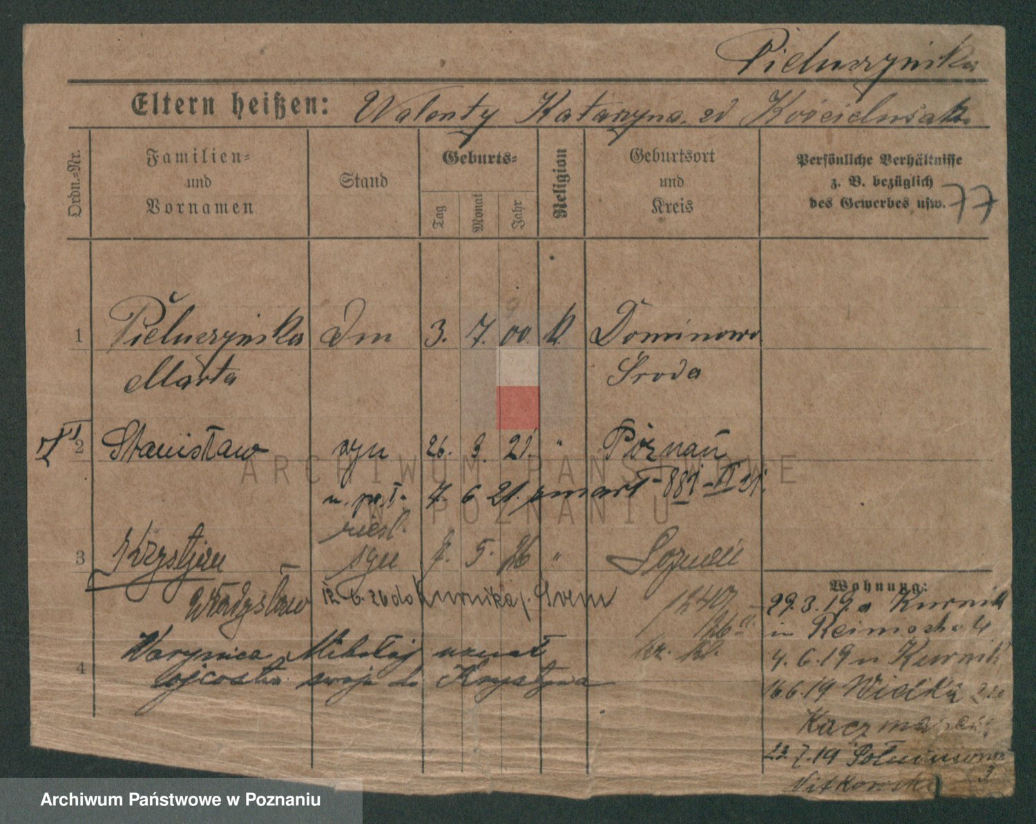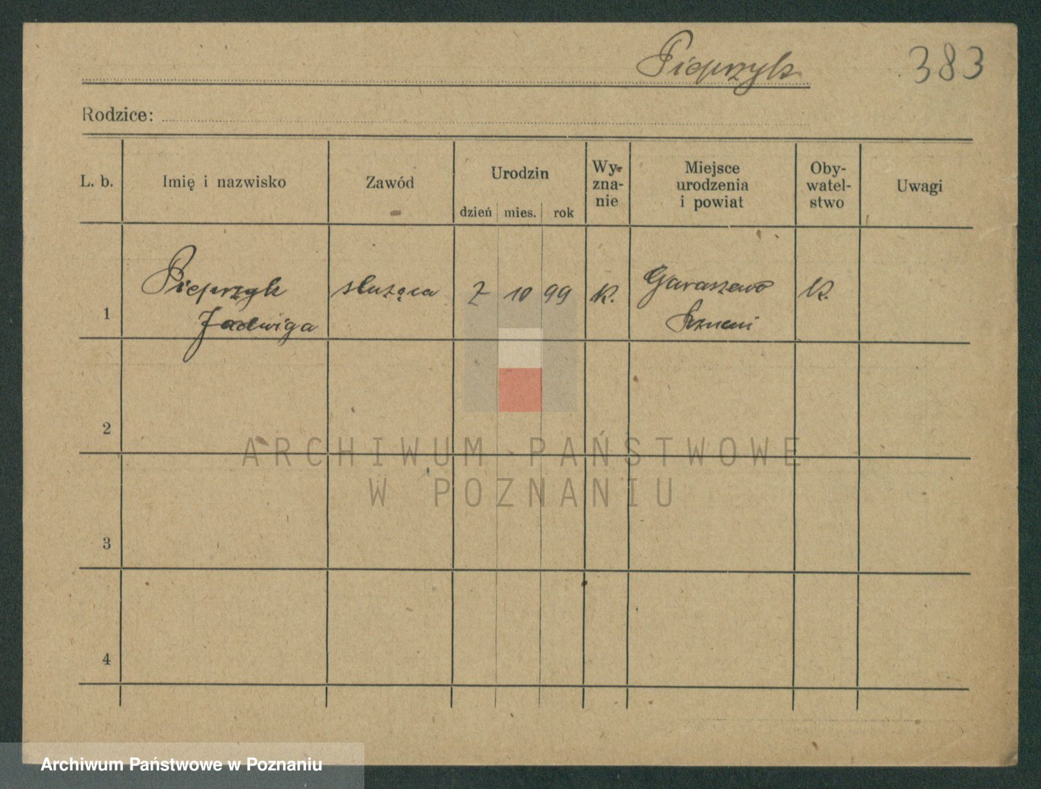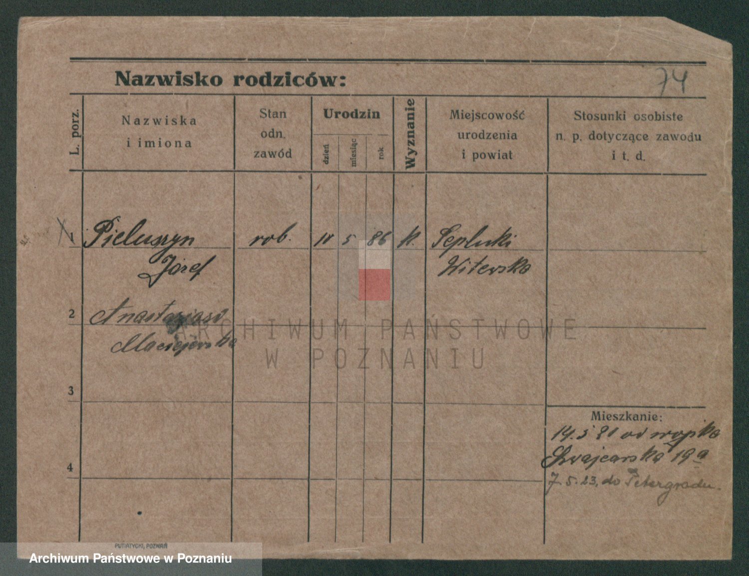 Podgląd karty osobowej dostępny jest po kliknięciu na nazwisko lub ikonkę karty. Można dokonywać powiększenia (ikony na górze) lub przechodzić między kolejnymi skanami (strzałki po bokach).
