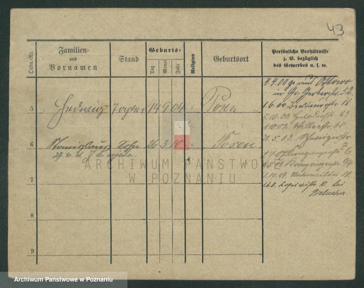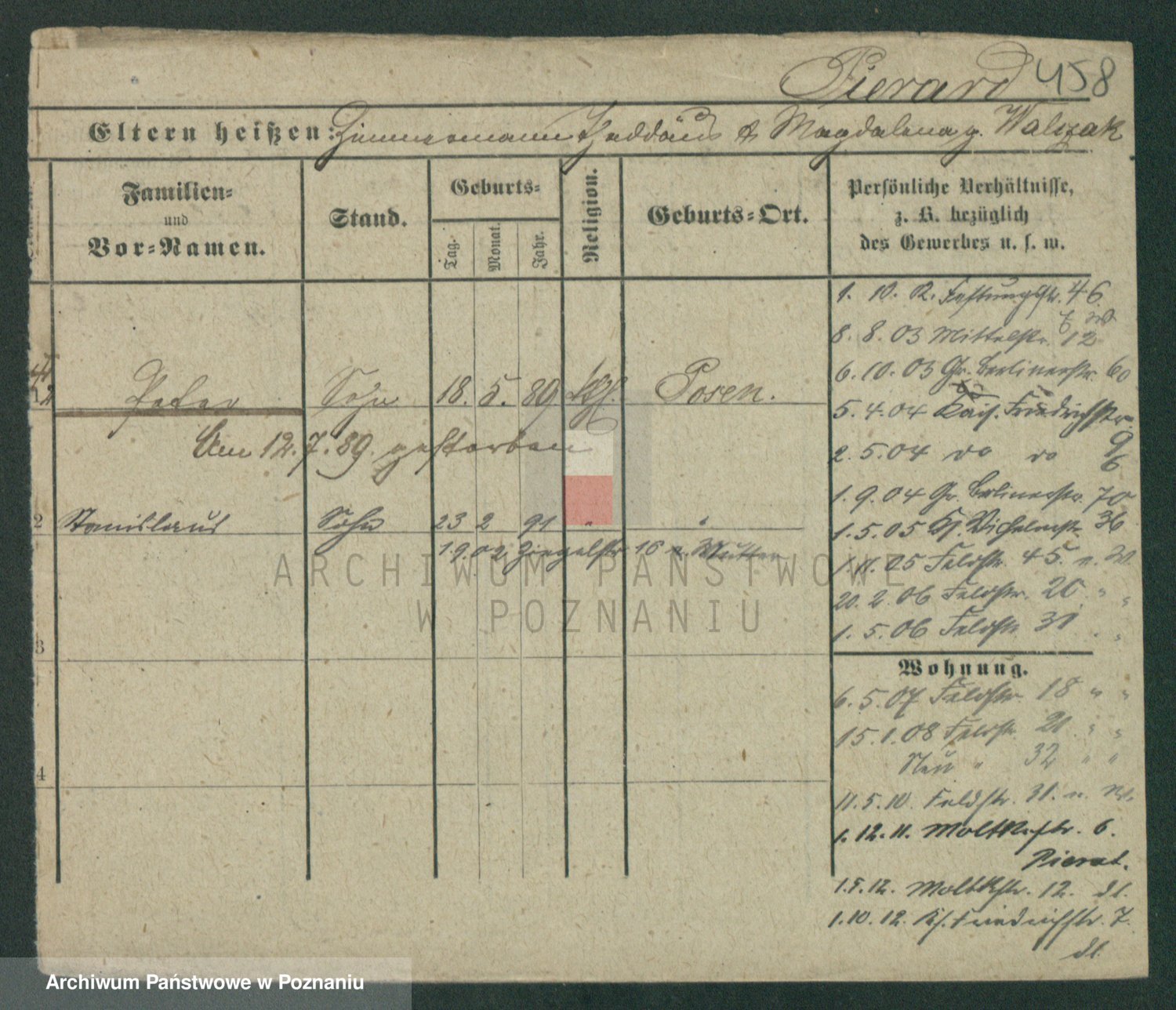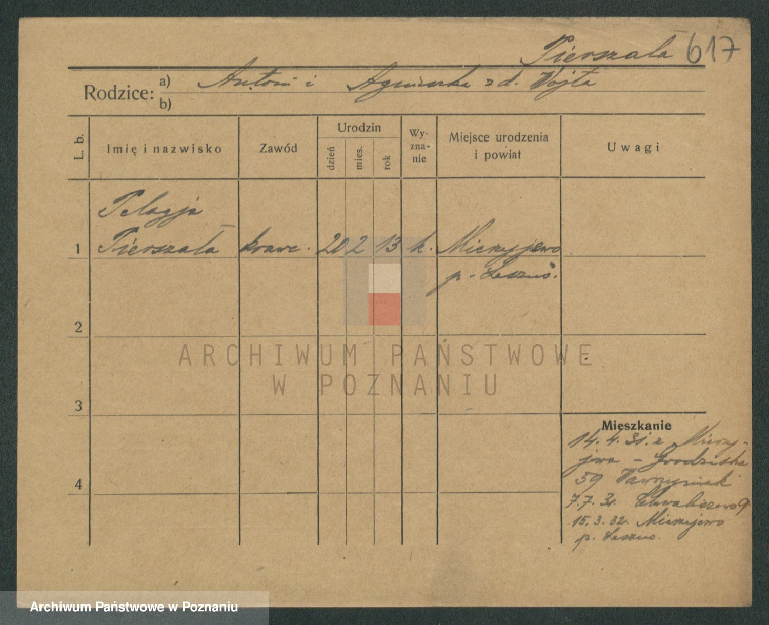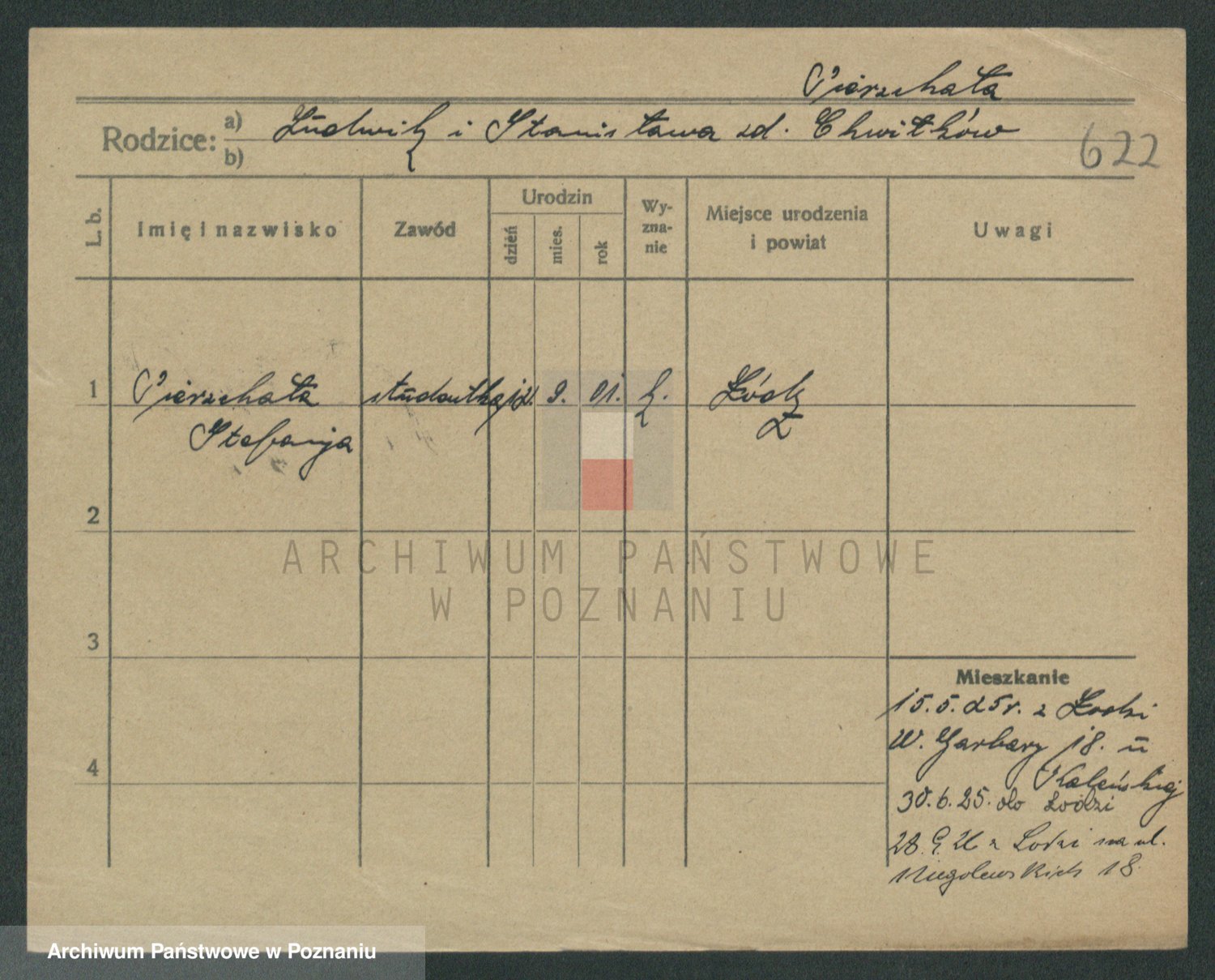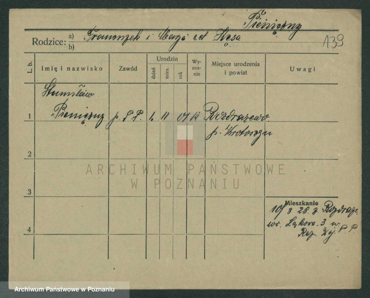 Podgląd karty osobowej dostępny jest po kliknięciu na nazwisko lub ikonkę karty. Można dokonywać powiększenia (ikony na górze) lub przechodzić między kolejnymi skanami (strzałki po bokach).