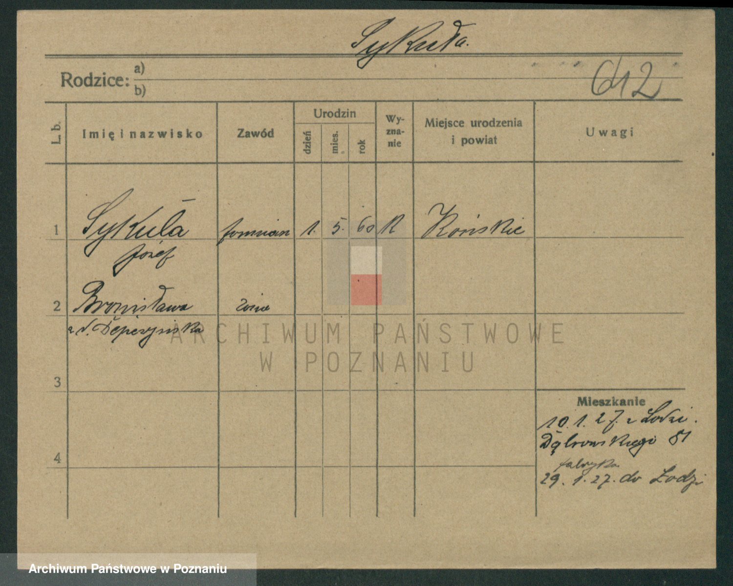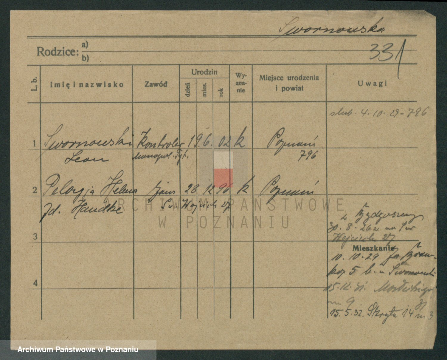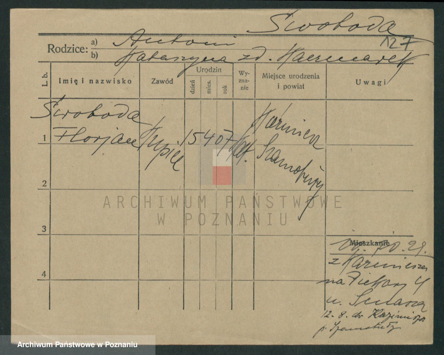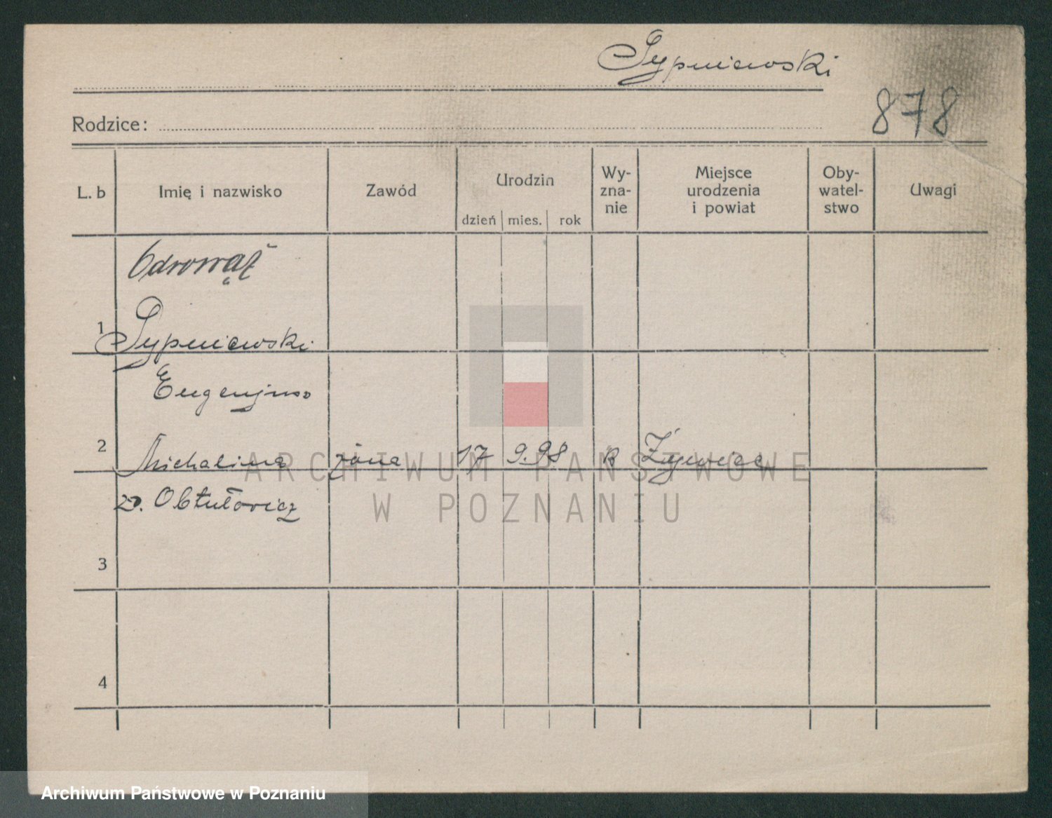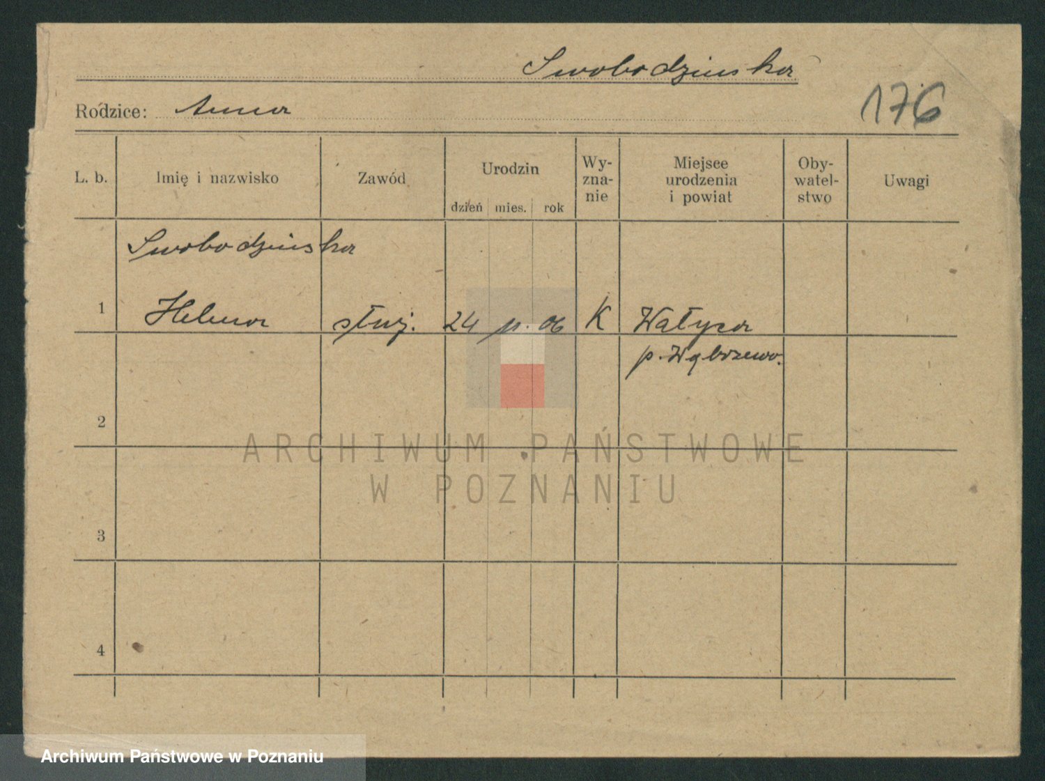 Podgląd karty osobowej dostępny jest po kliknięciu na nazwisko lub ikonkę karty. Można dokonywać powiększenia (ikony na górze) lub przechodzić między kolejnymi skanami (strzałki po bokach).