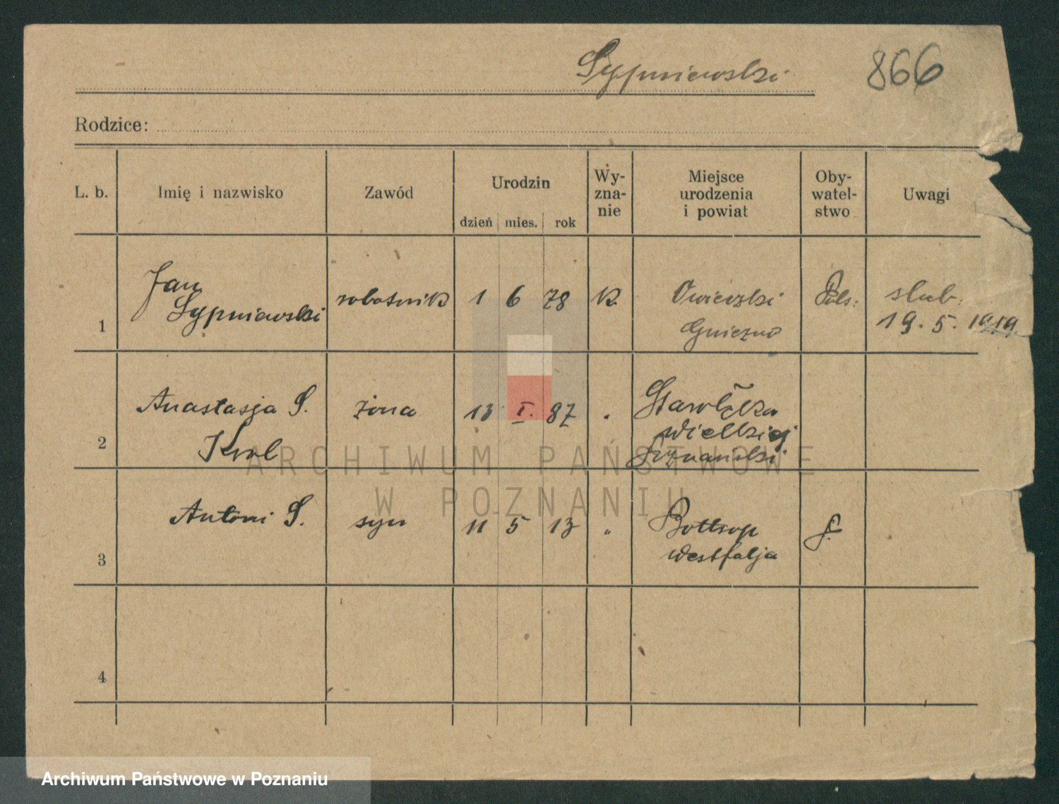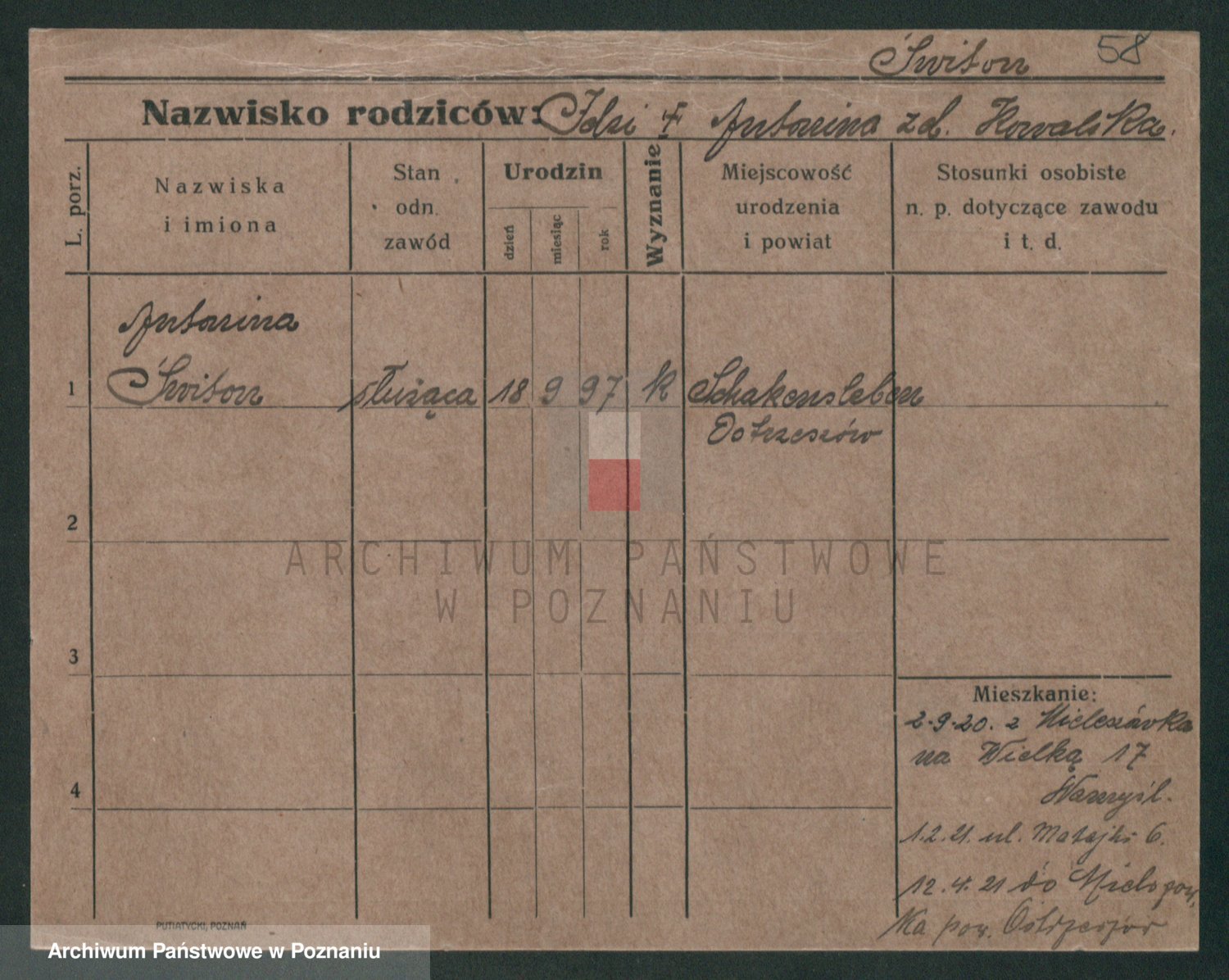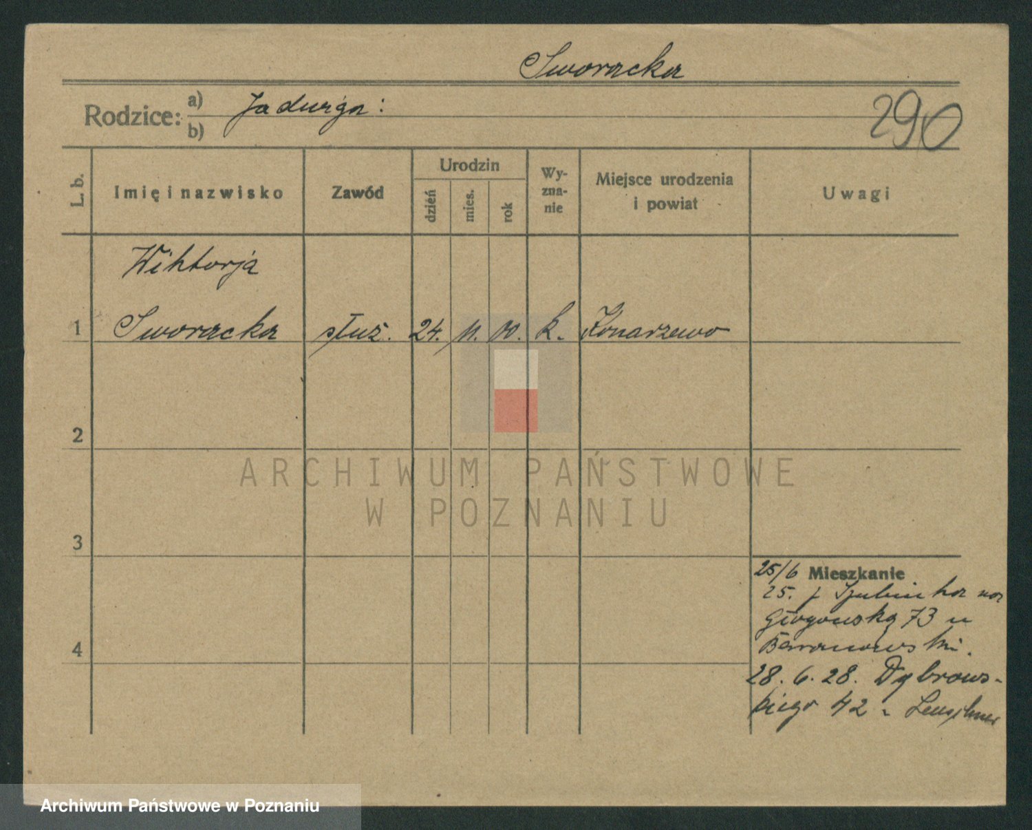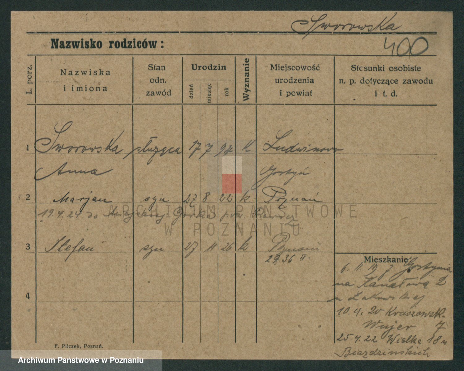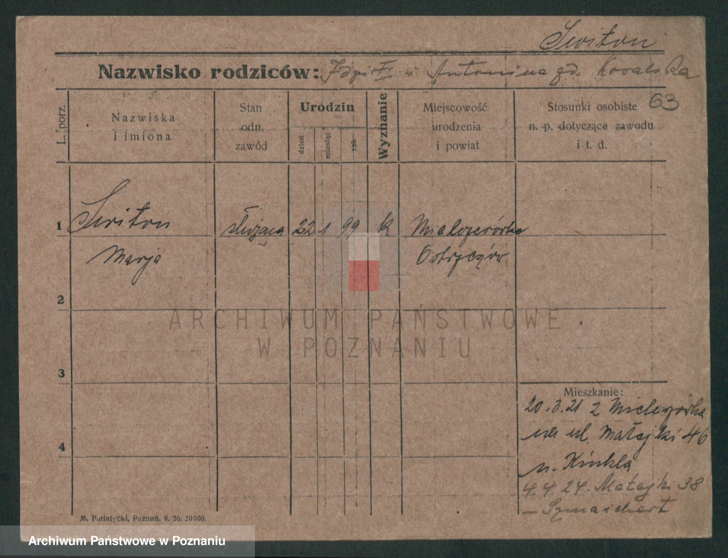 Podgląd karty osobowej dostępny jest po kliknięciu na nazwisko lub ikonkę karty. Można dokonywać powiększenia (ikony na górze) lub przechodzić między kolejnymi skanami (strzałki po bokach).
