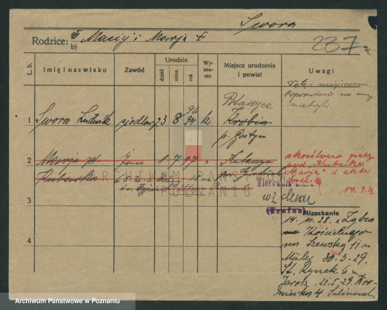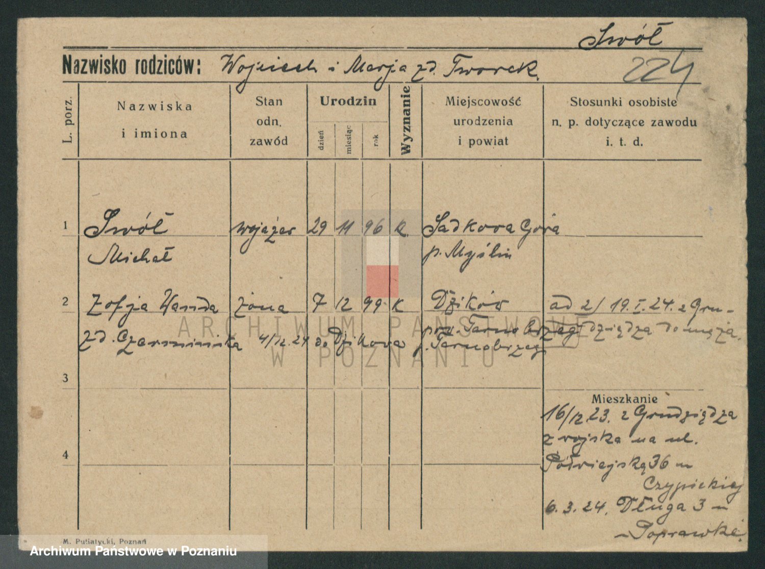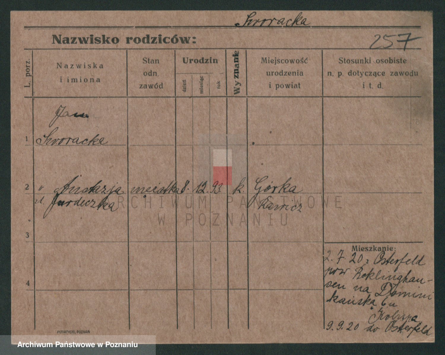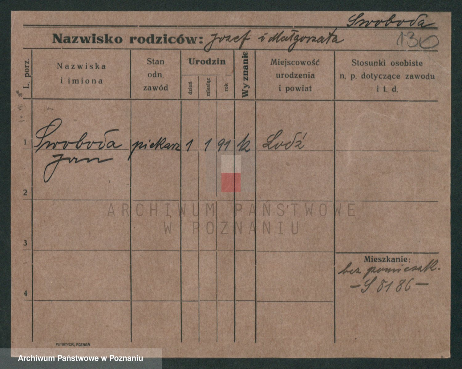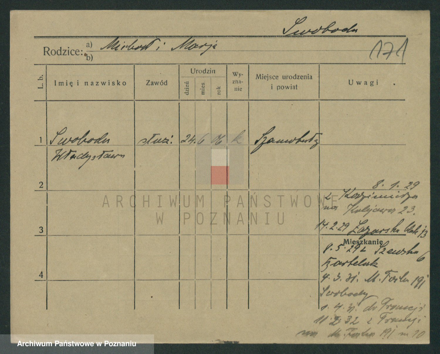 Podgląd karty osobowej dostępny jest po kliknięciu na nazwisko lub ikonkę karty. Można dokonywać powiększenia (ikony na górze) lub przechodzić między kolejnymi skanami (strzałki po bokach).