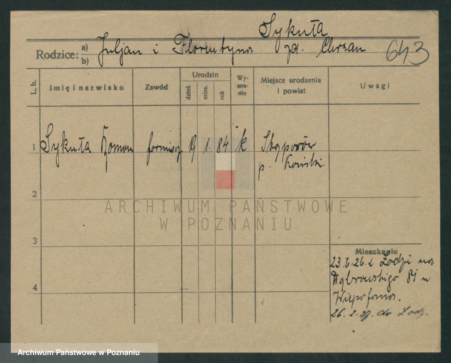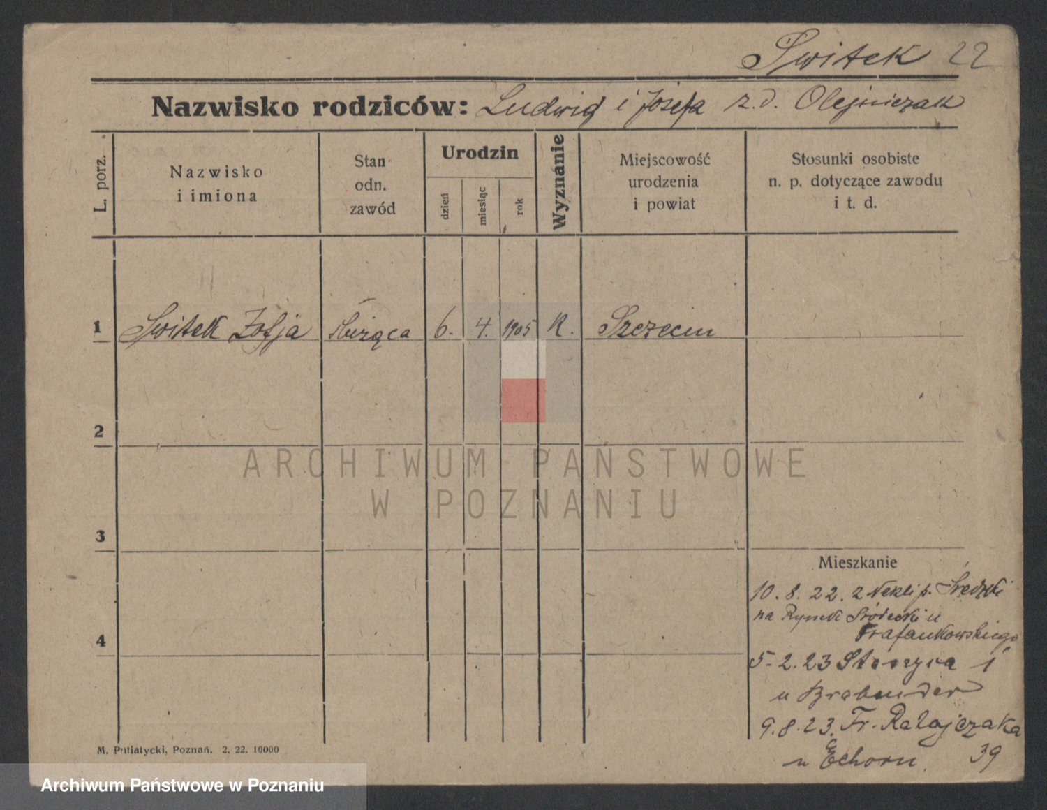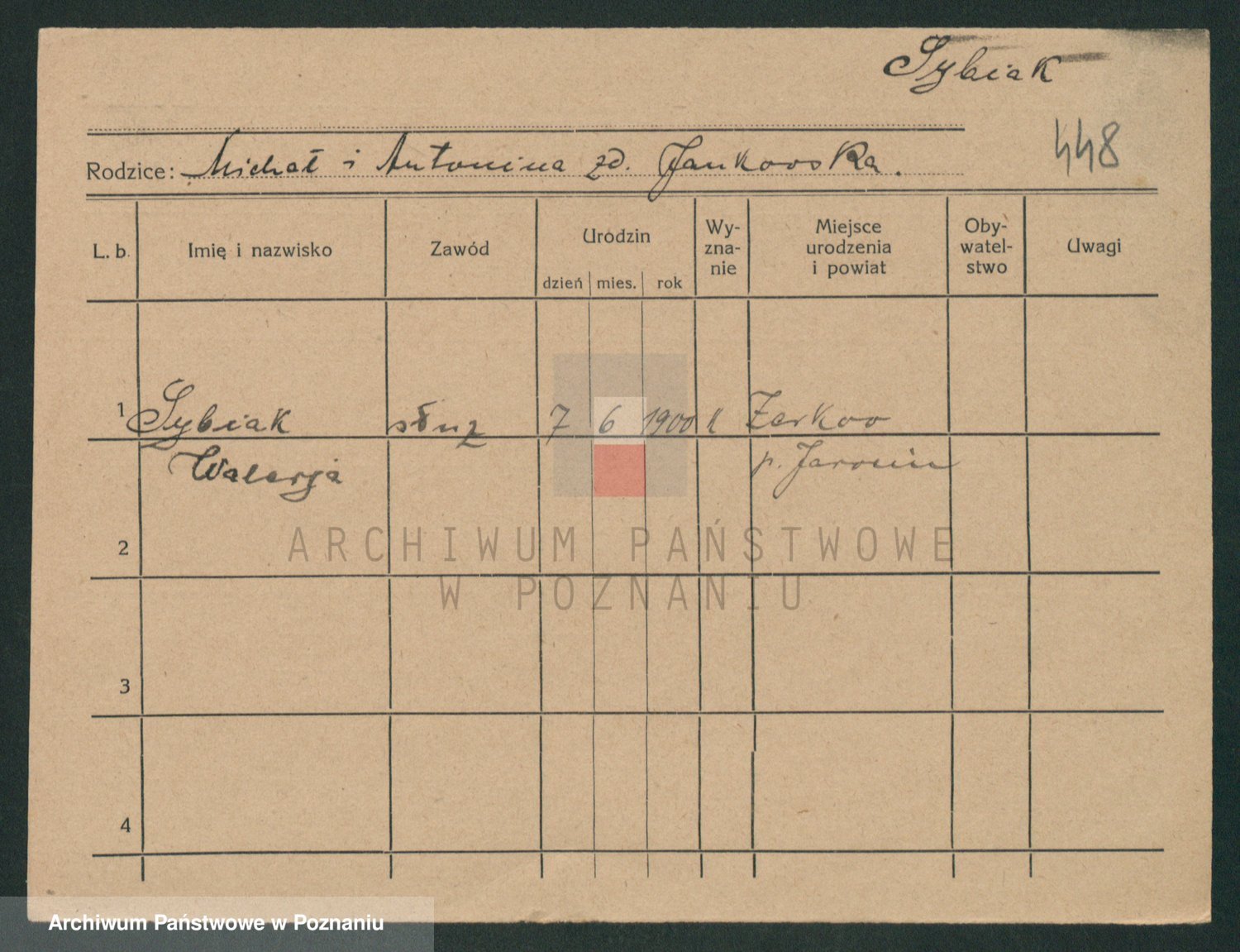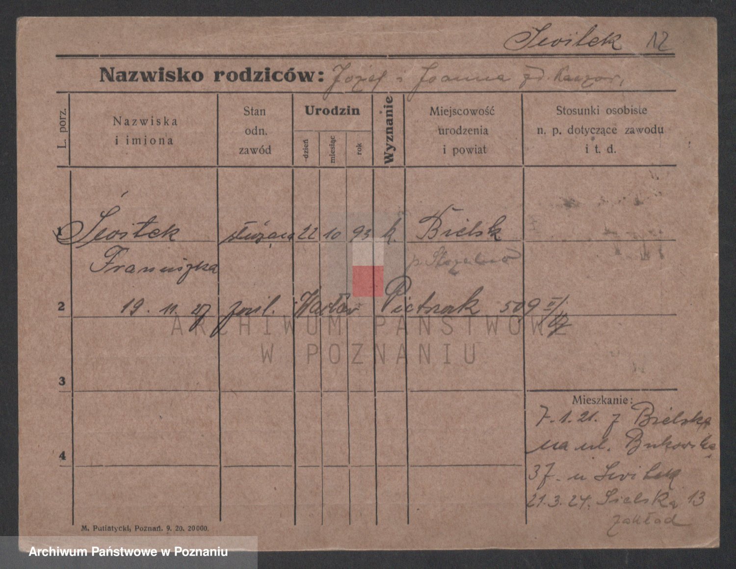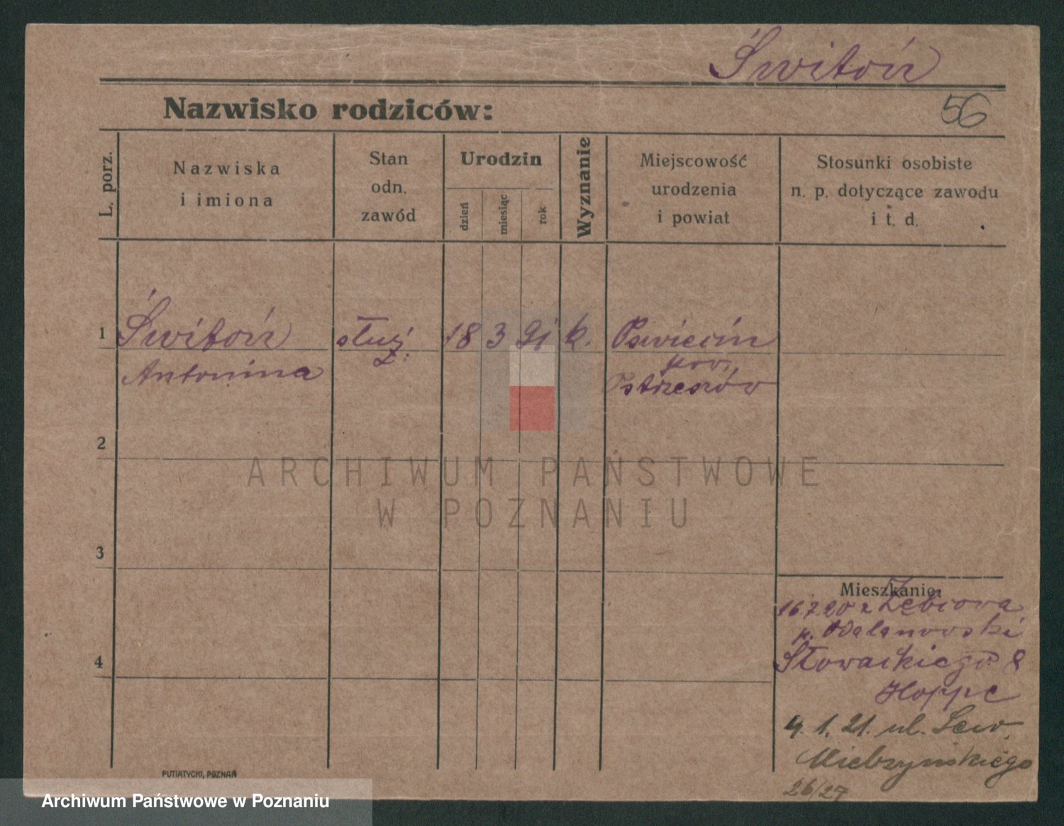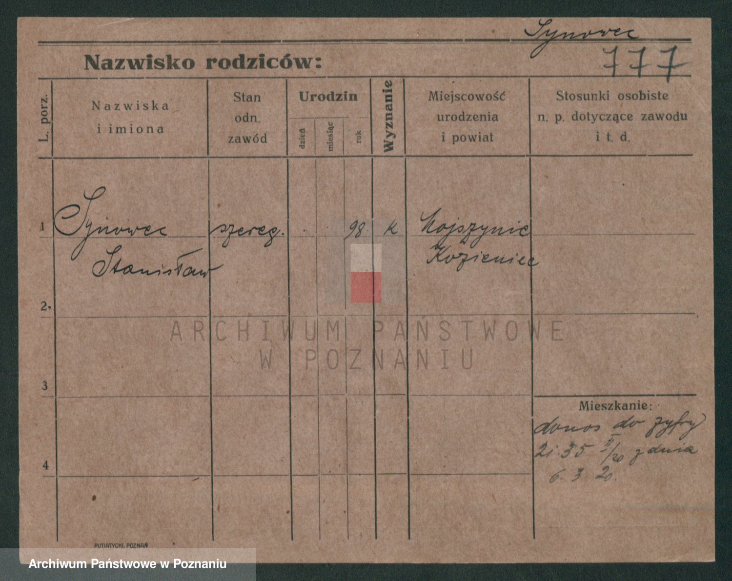 Podgląd karty osobowej dostępny jest po kliknięciu na nazwisko lub ikonkę karty. Można dokonywać powiększenia (ikony na górze) lub przechodzić między kolejnymi skanami (strzałki po bokach).