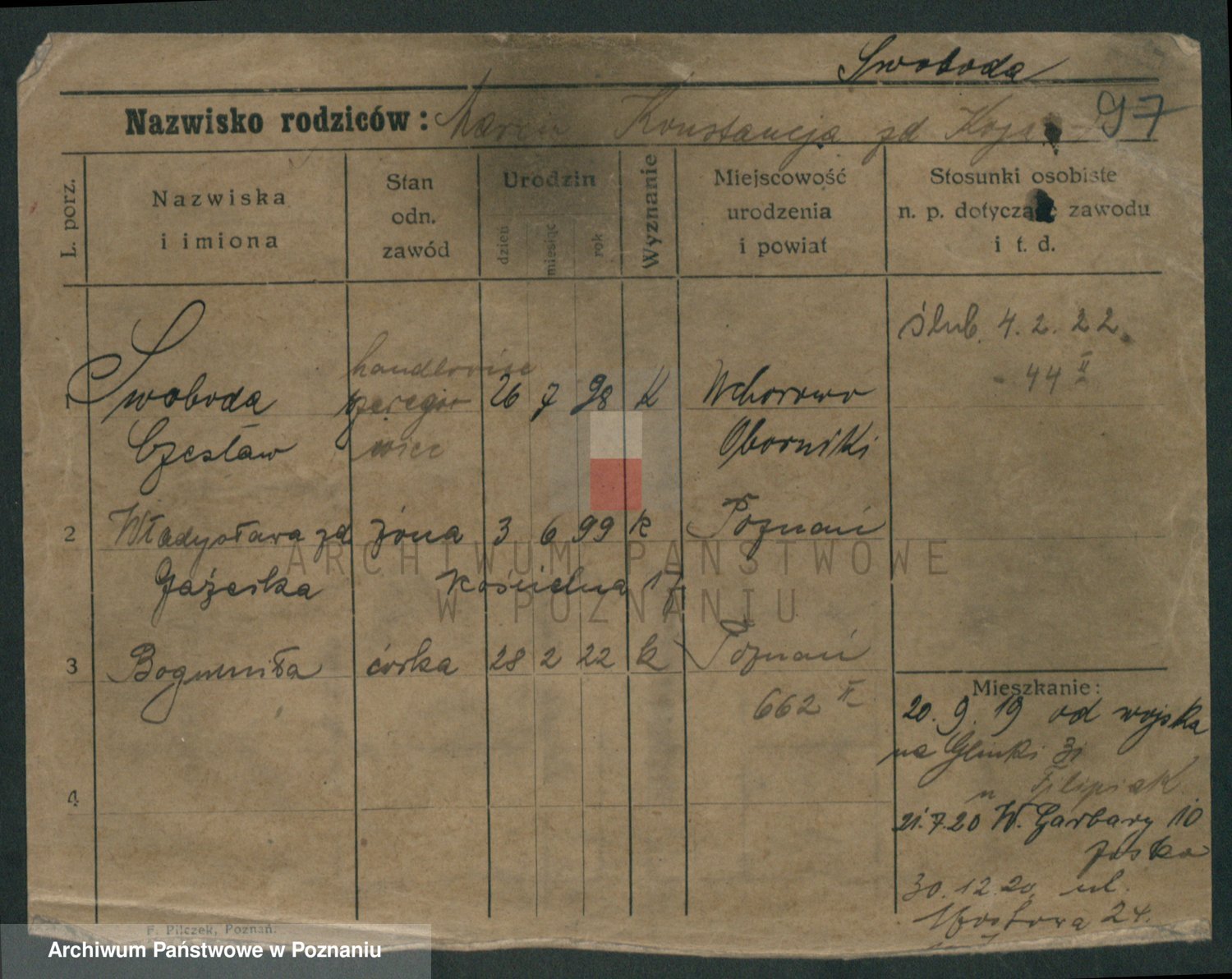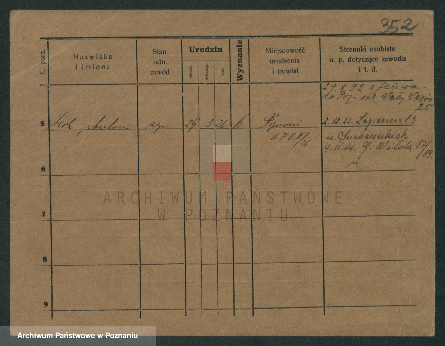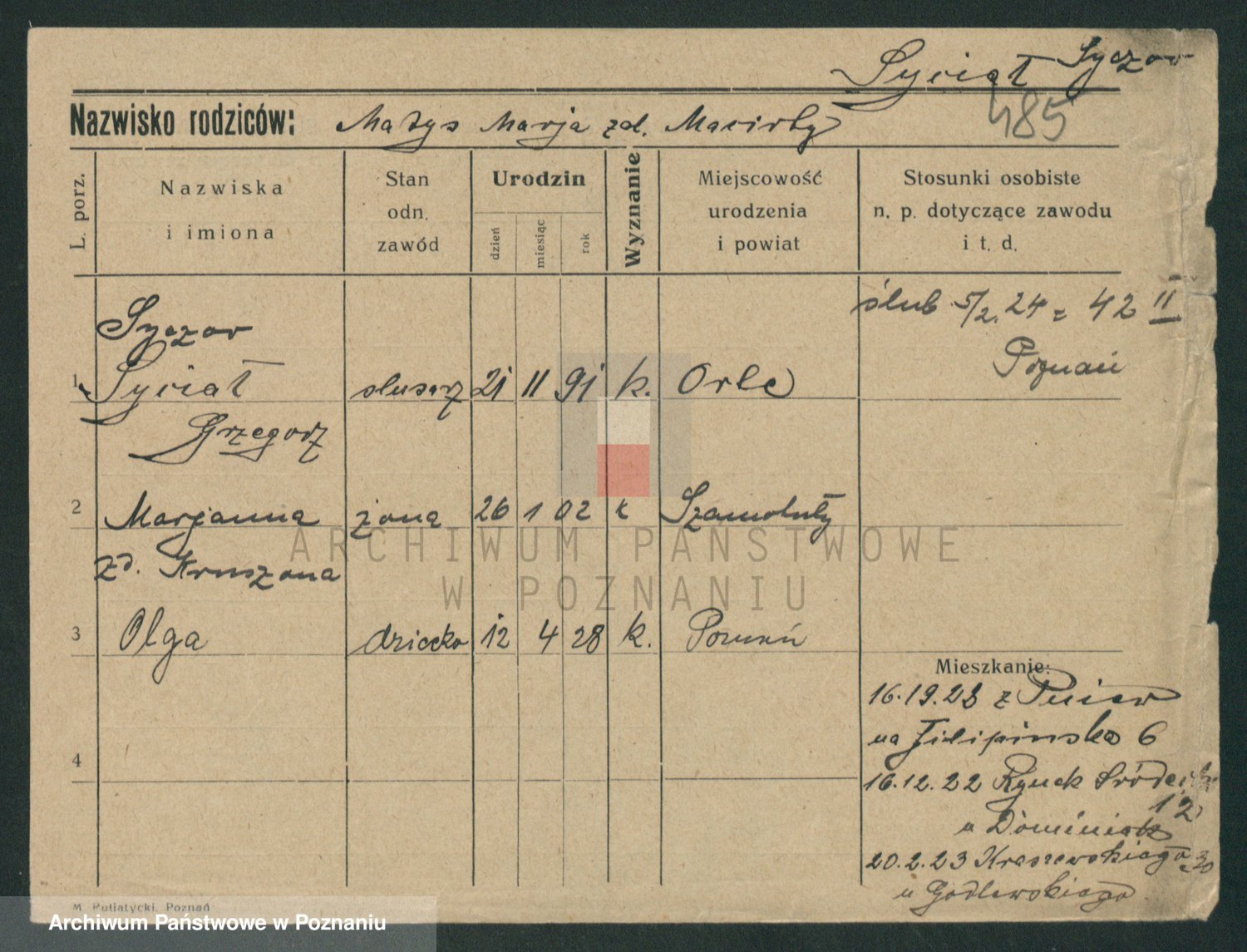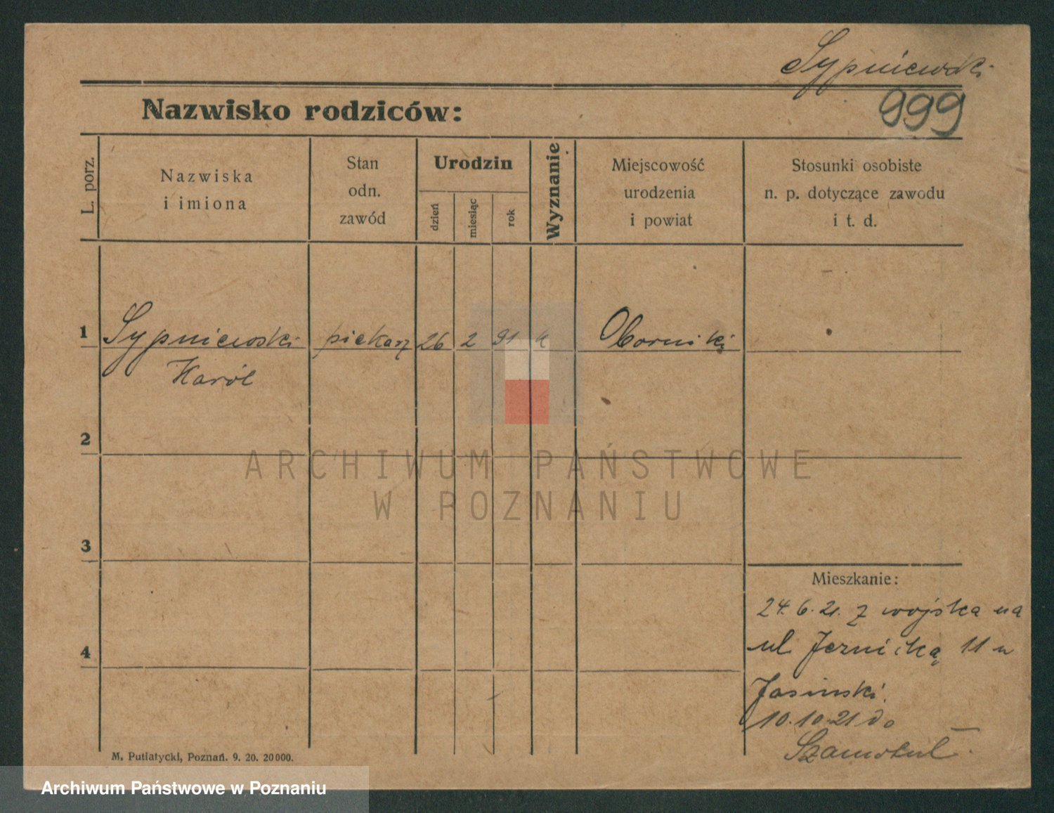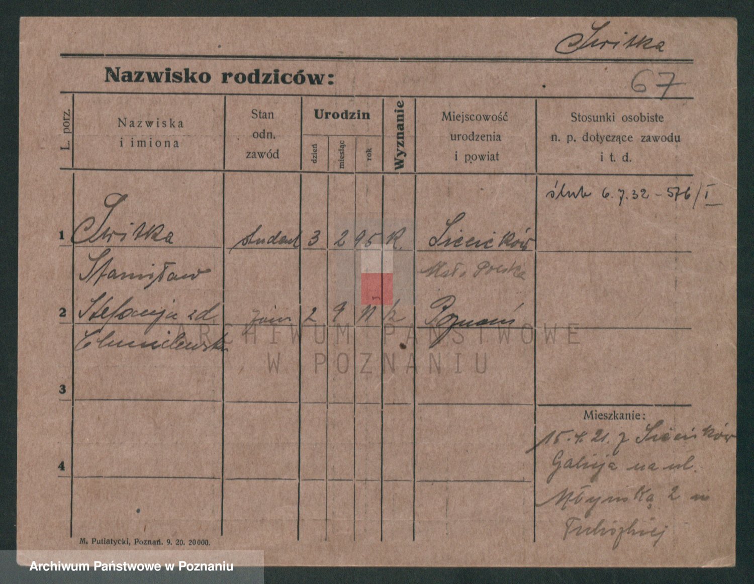 Podgląd karty osobowej dostępny jest po kliknięciu na nazwisko lub ikonkę karty. Można dokonywać powiększenia (ikony na górze) lub przechodzić między kolejnymi skanami (strzałki po bokach).
